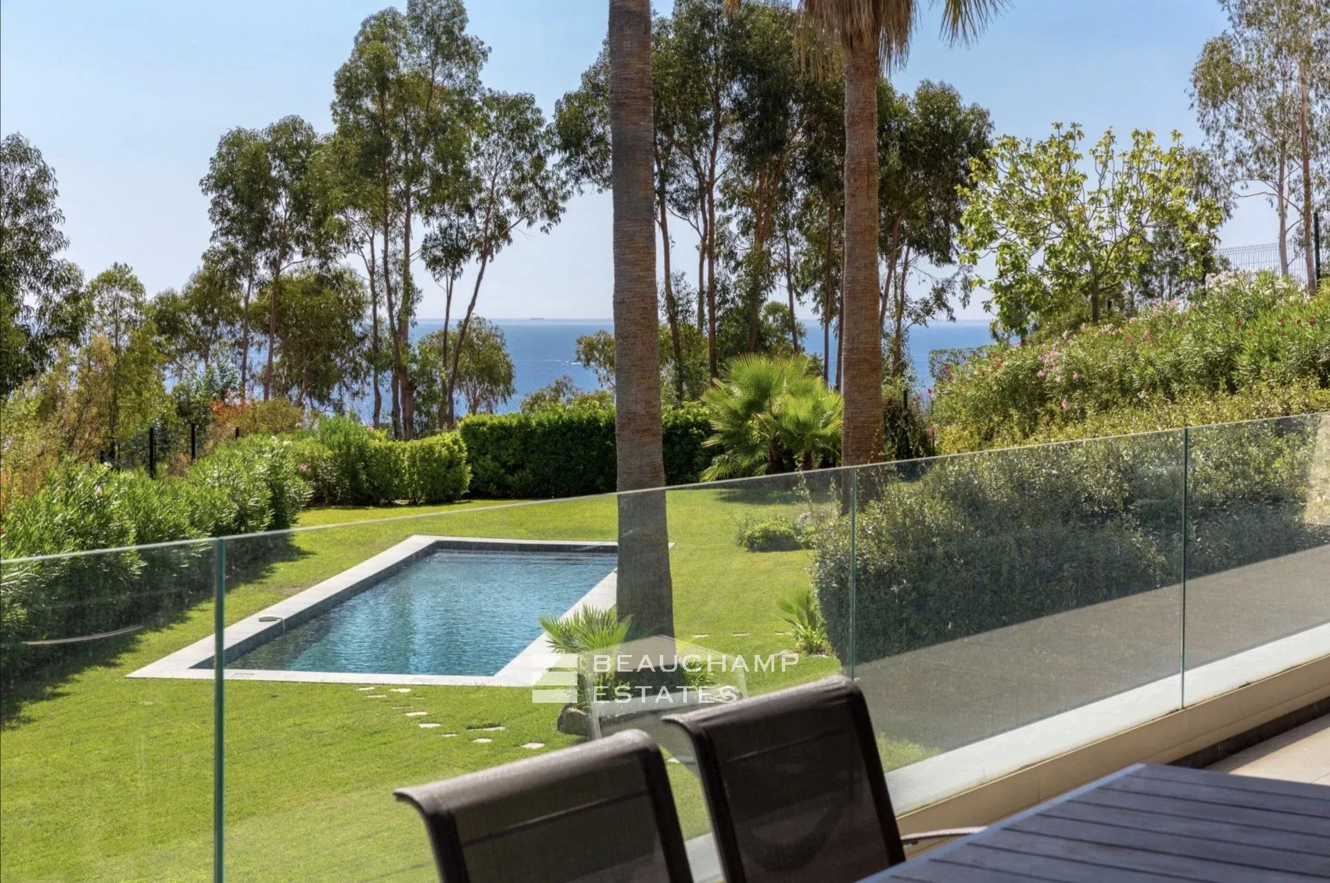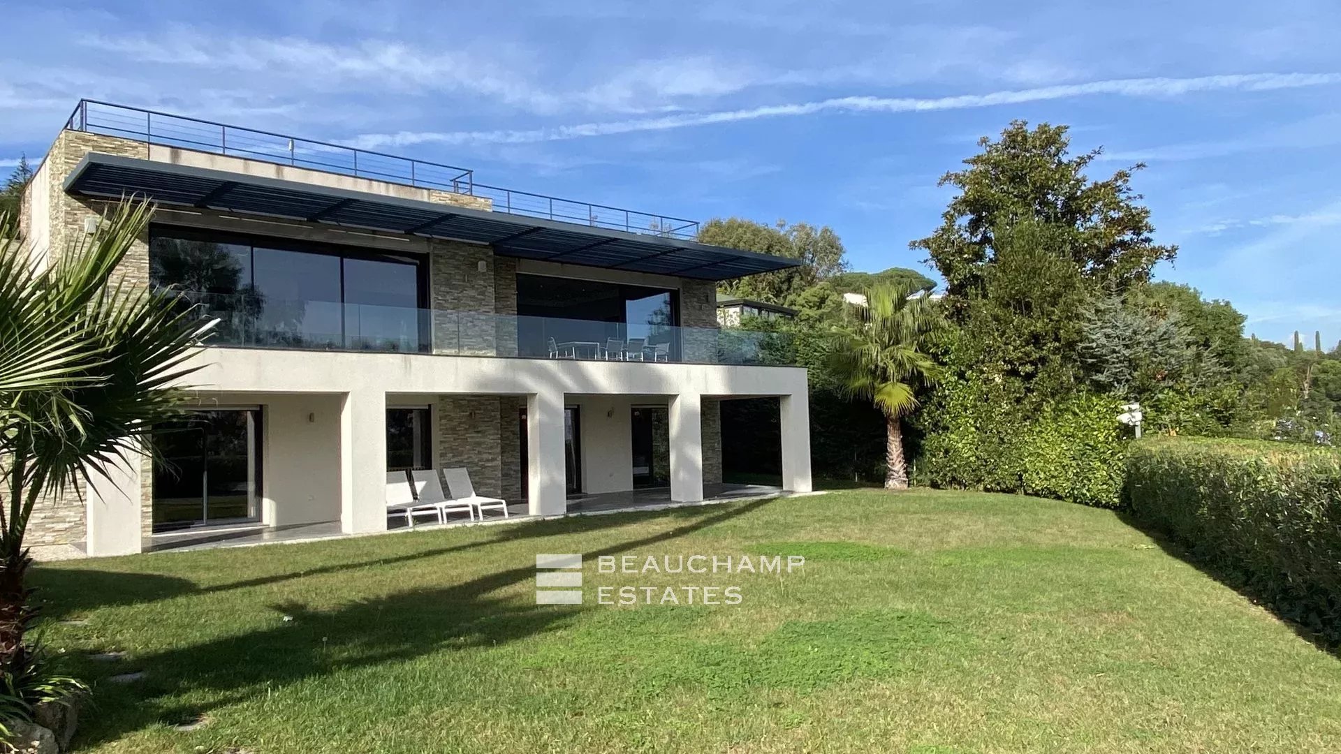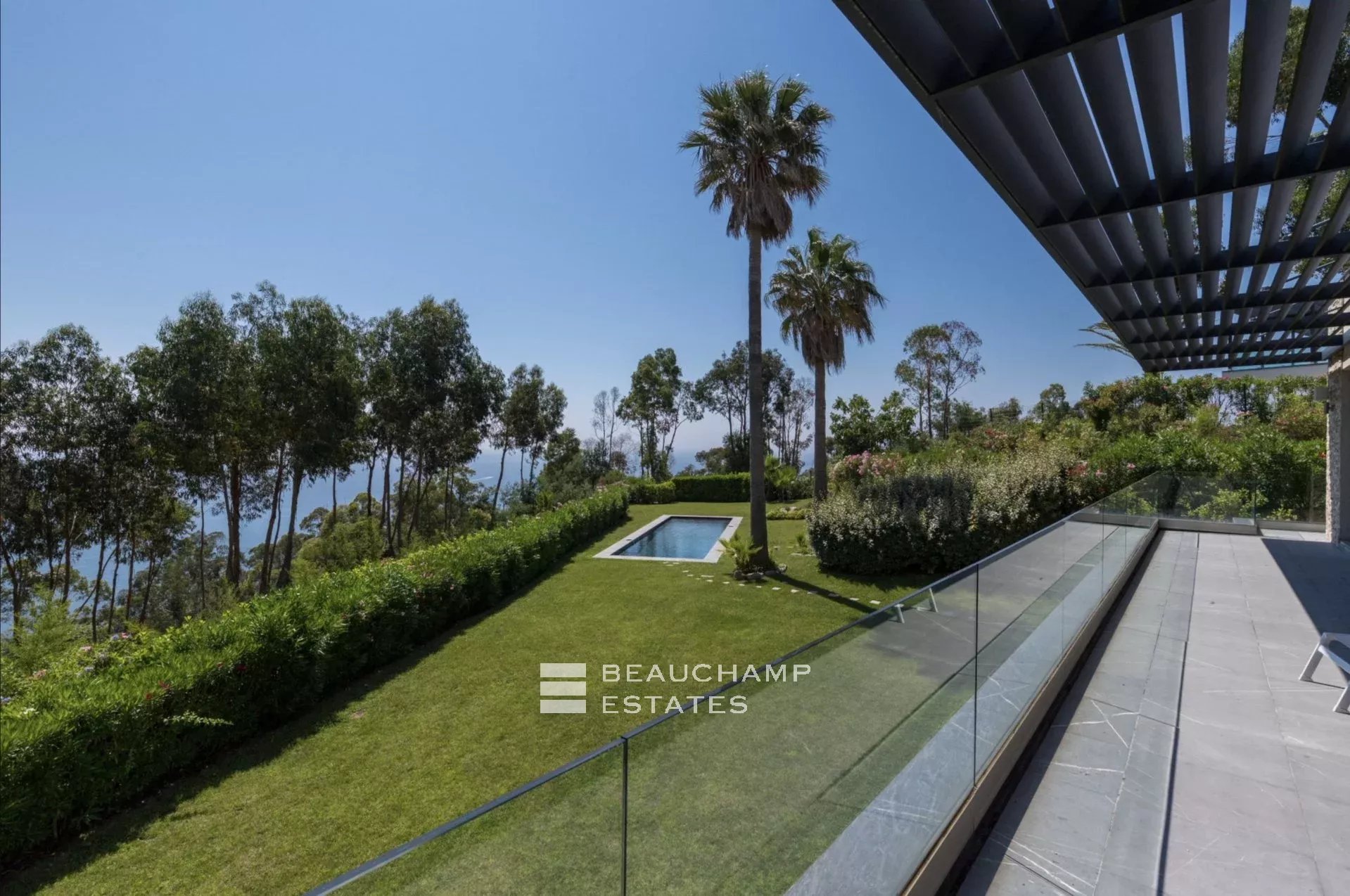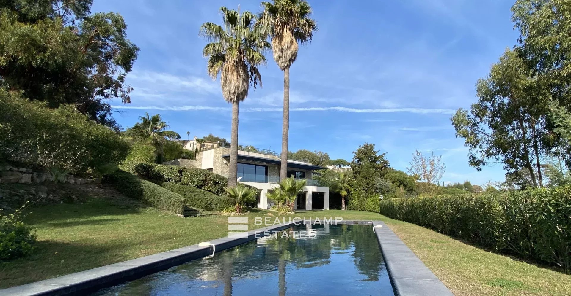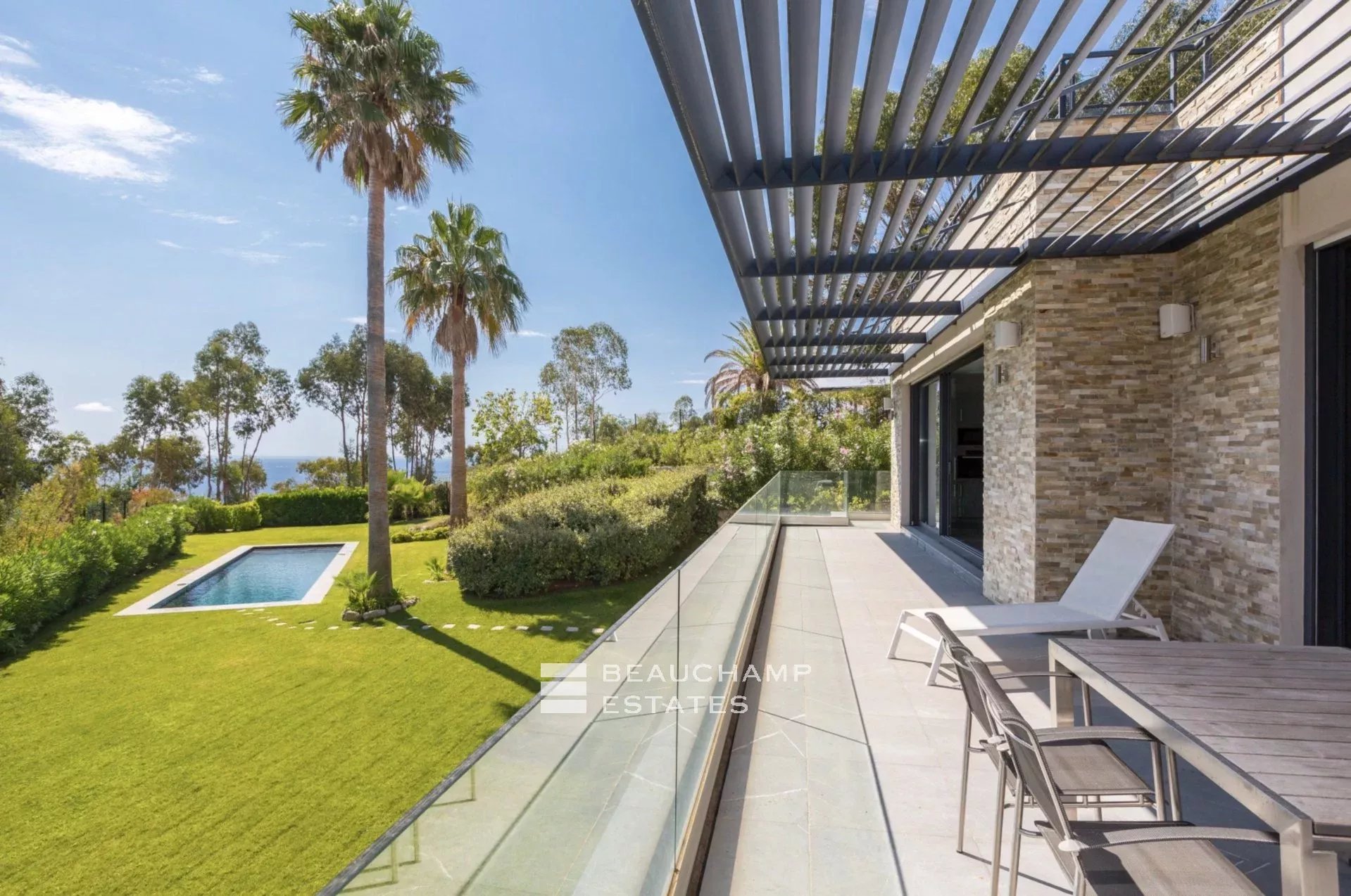 This sumptuous contemporary villa offers a panoramic sea view up to Cap d'Antibes while being nestled in a verdant setting. It benefits from top-of-the-range materials and finishes. Carefully decorated in a modern and refined style, the villa is composed as follows: