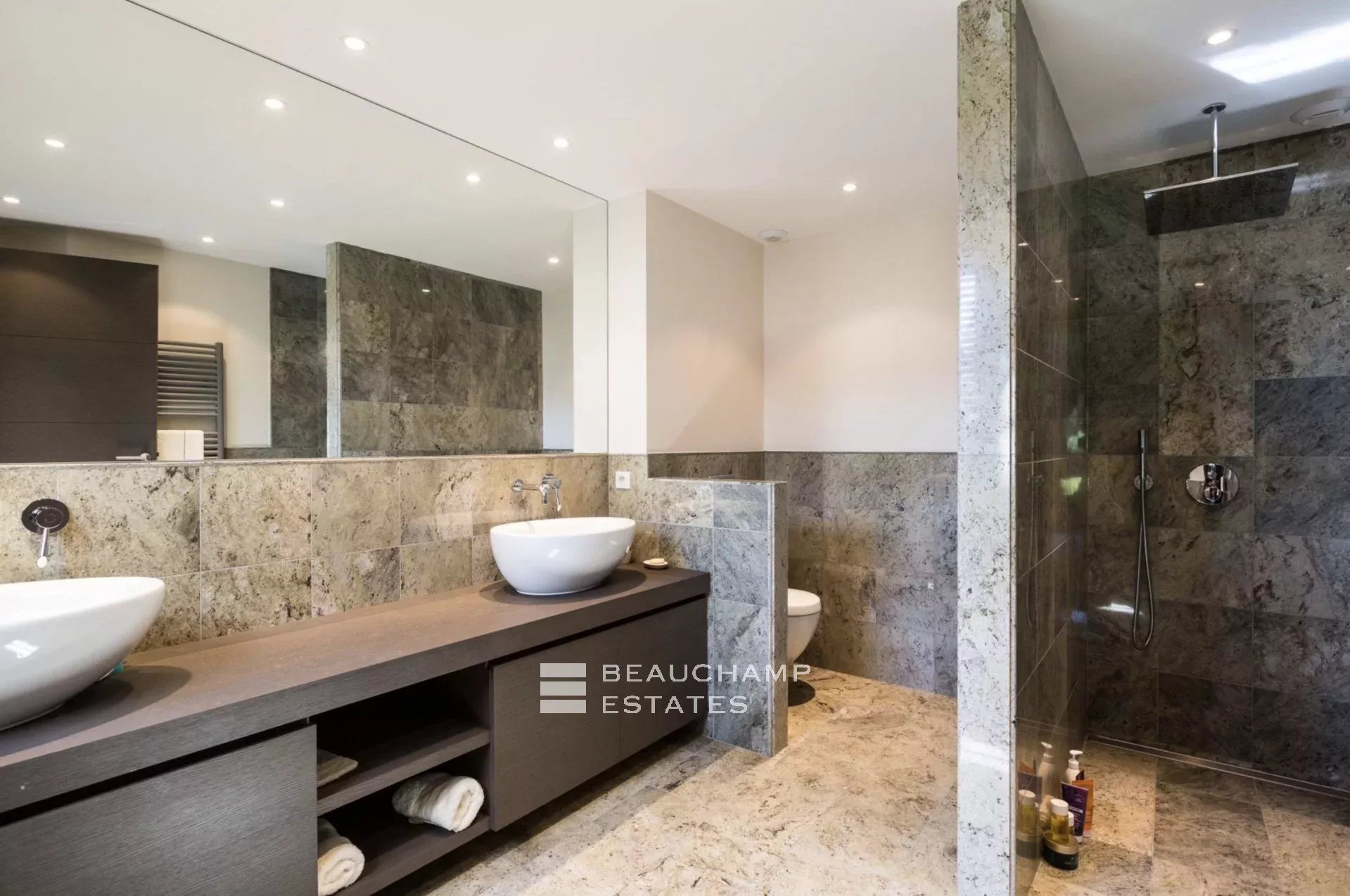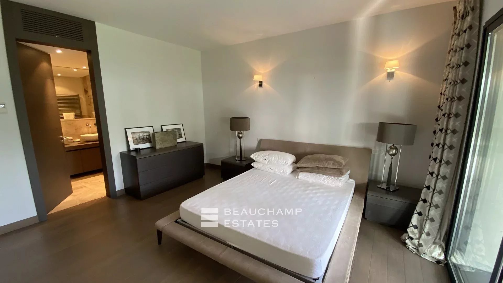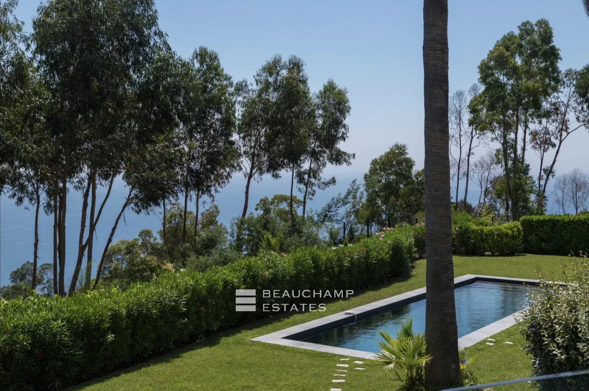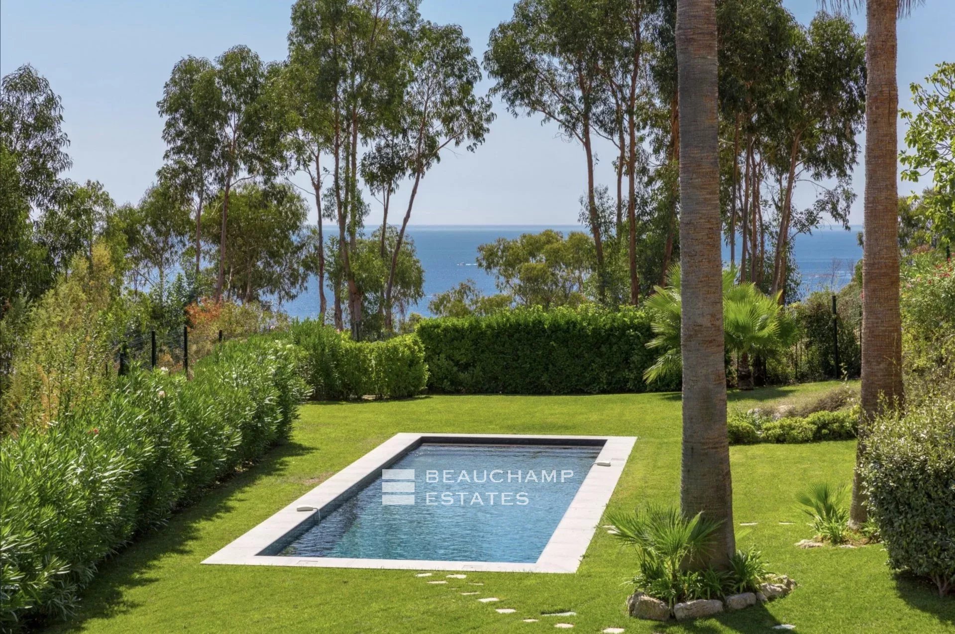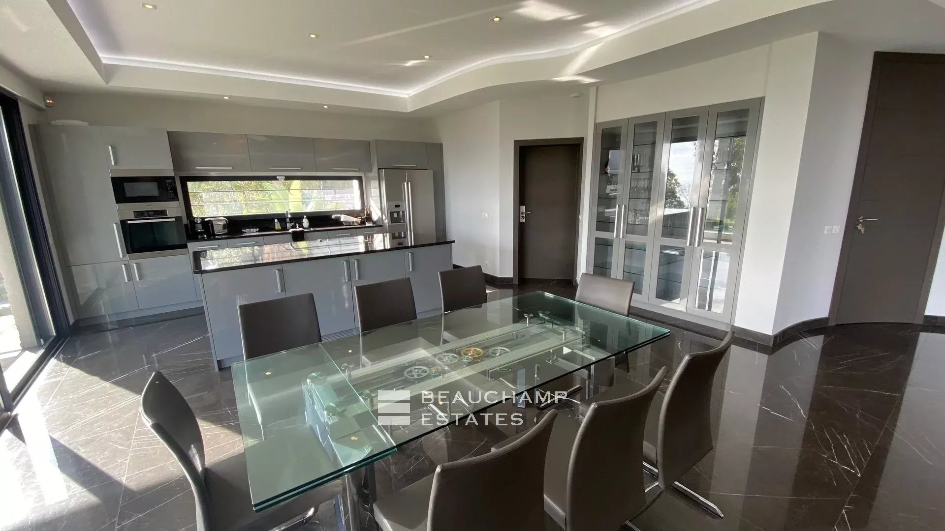 This sumptuous contemporary villa offers a panoramic sea view up to Cap d'Antibes while being nestled in a verdant setting. It benefits from top-of-the-range materials and finishes. Carefully decorated in a modern and refined style, the villa is composed as follows: