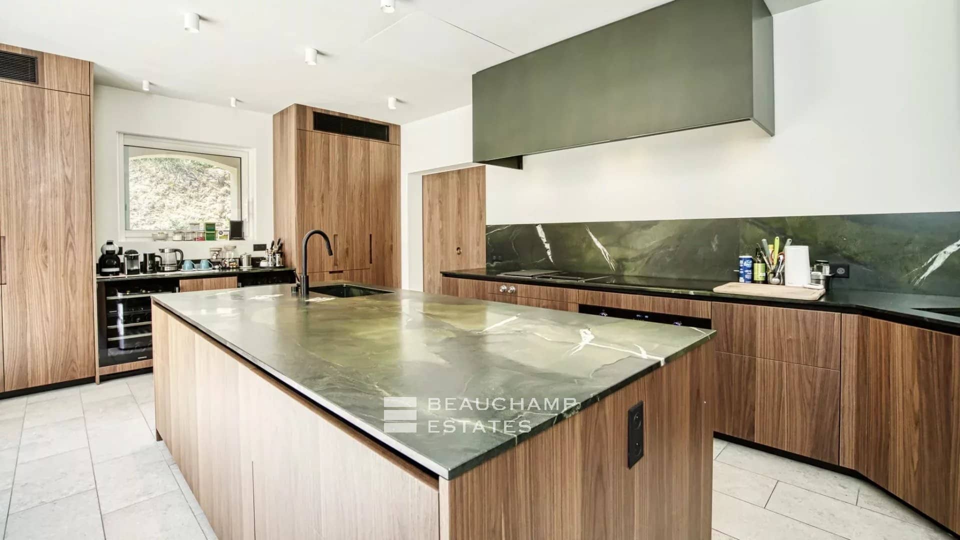 - Fully equipped kitchen and a second large, professional-grade restaurant-quality kitchen with direct access to the garage and to the entrance of the guest apartment located upstairs.