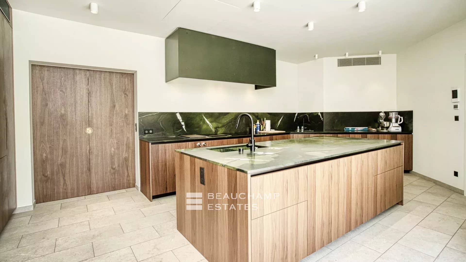 This ultra-luxury villa features expansive covered terraces facing south and east, as well as an inner terrace shaded by a wooden pergola. On the west side, a summer kitchen with dining area extends the living space and provides an ideal setting for entertaining.