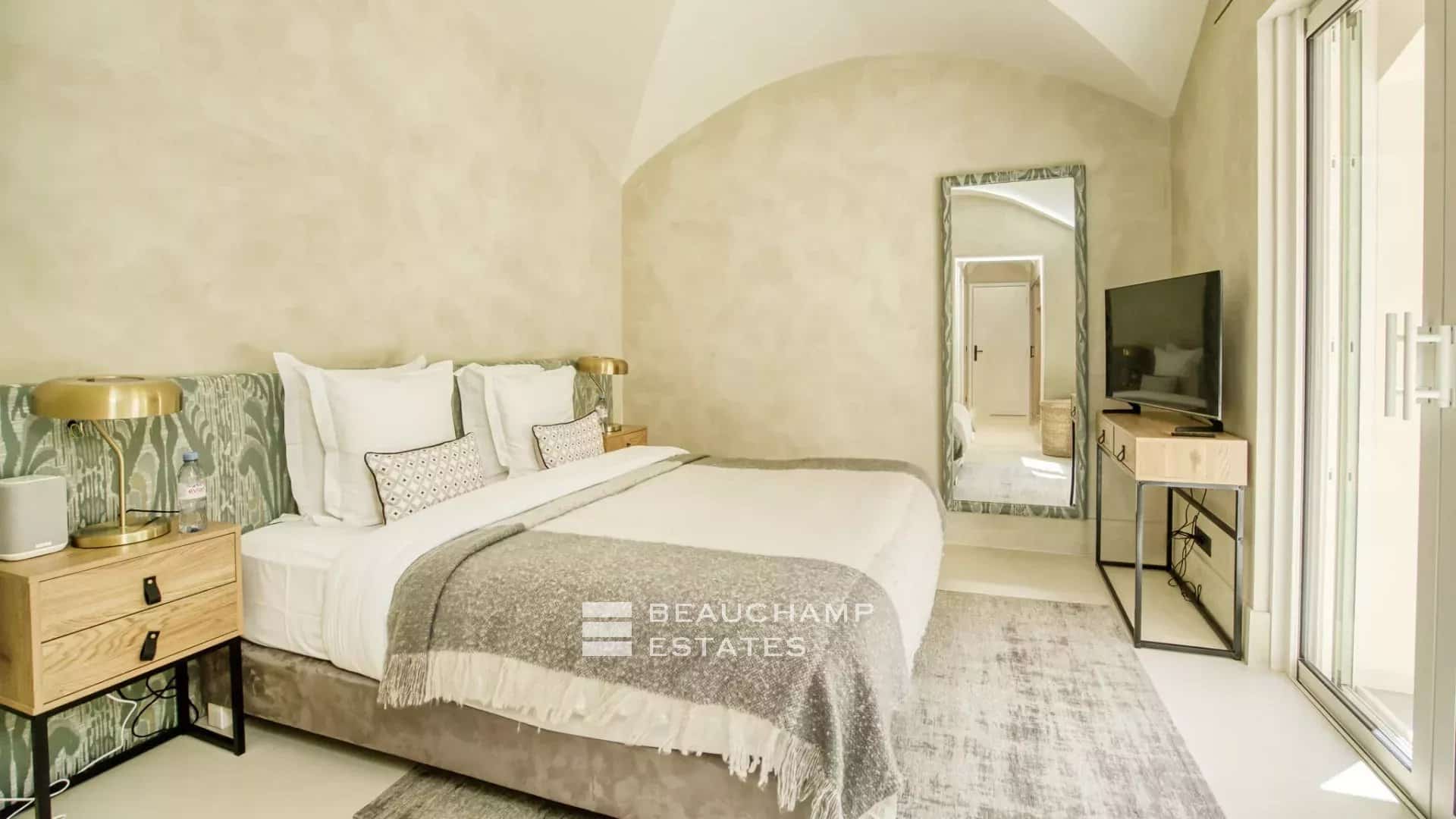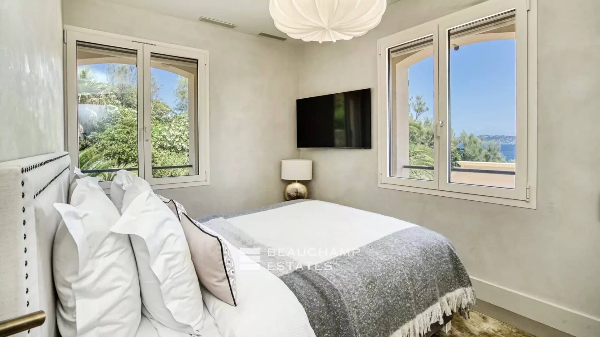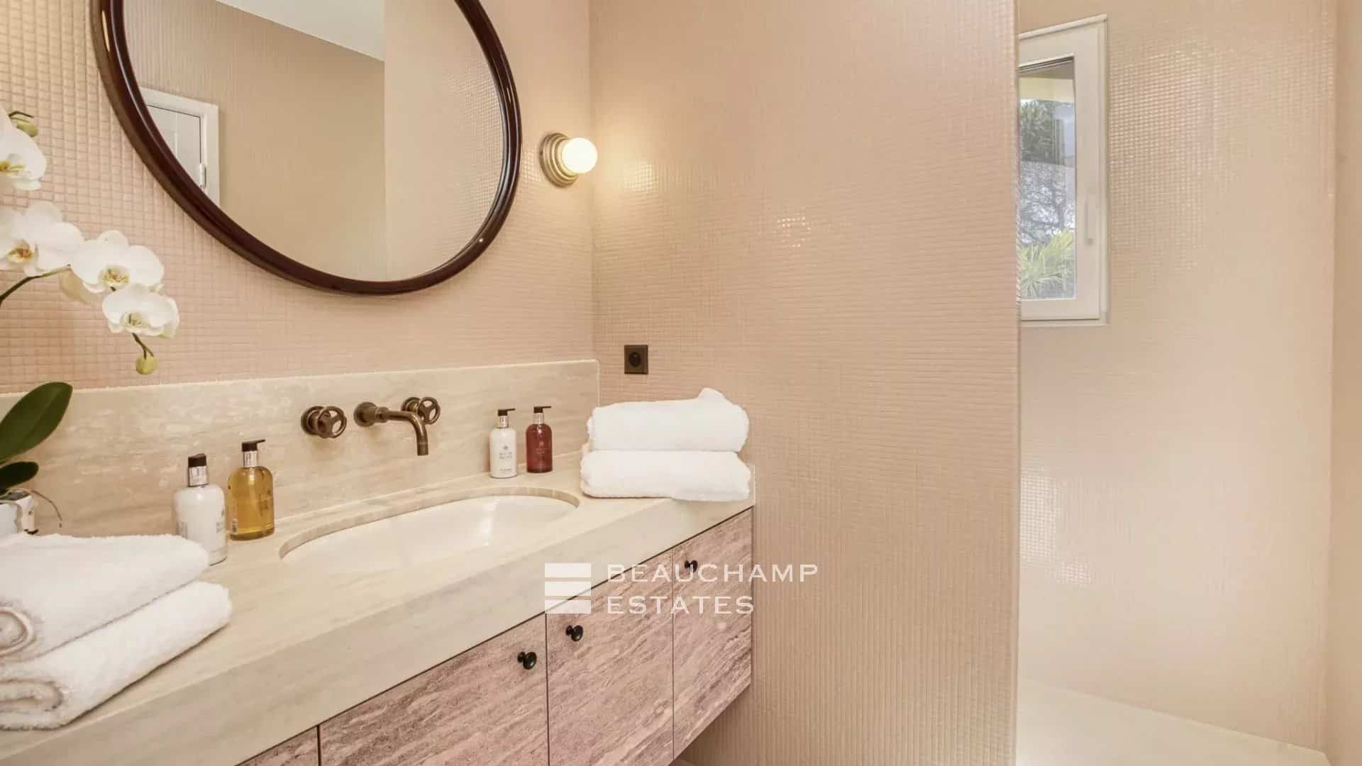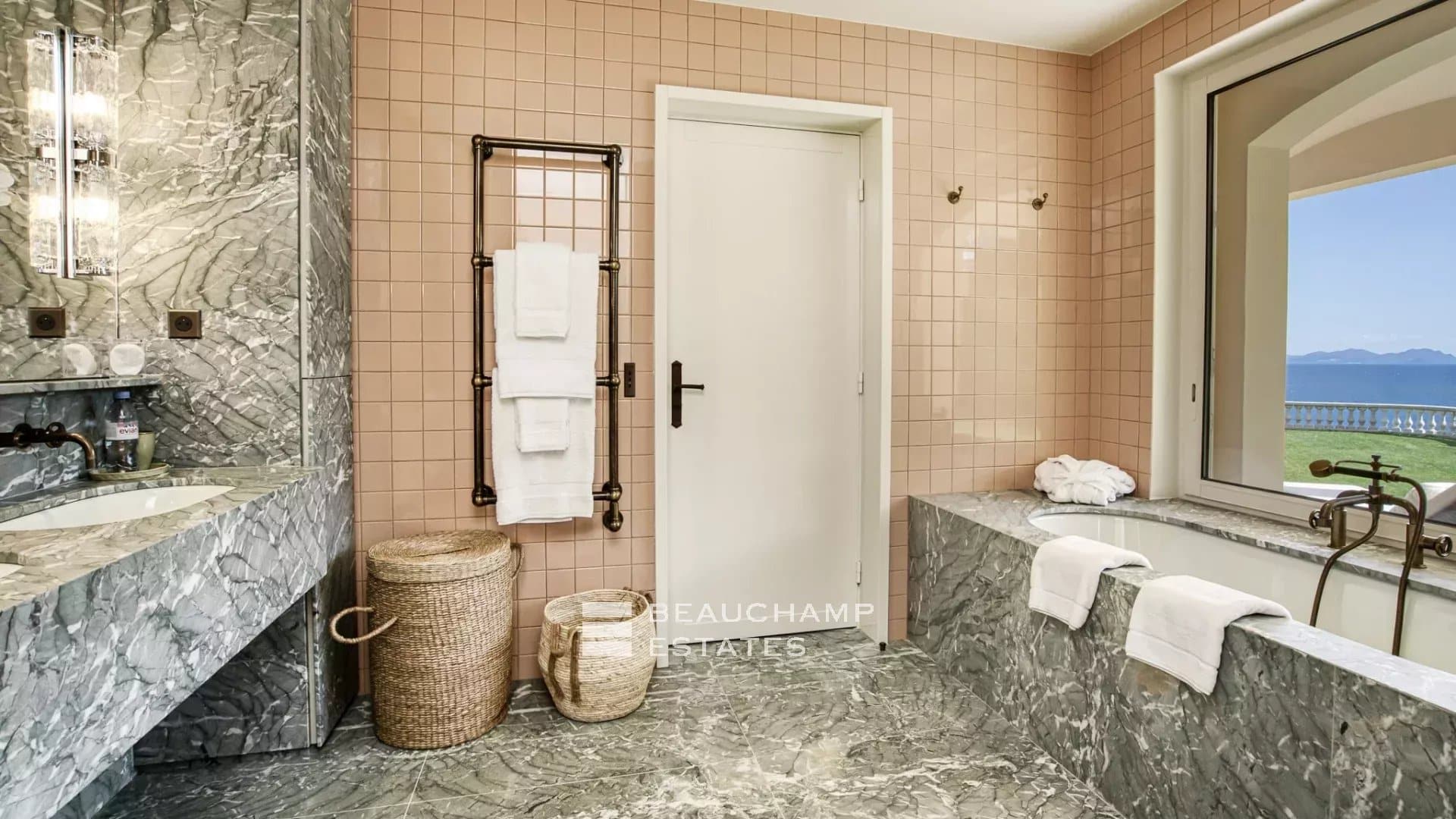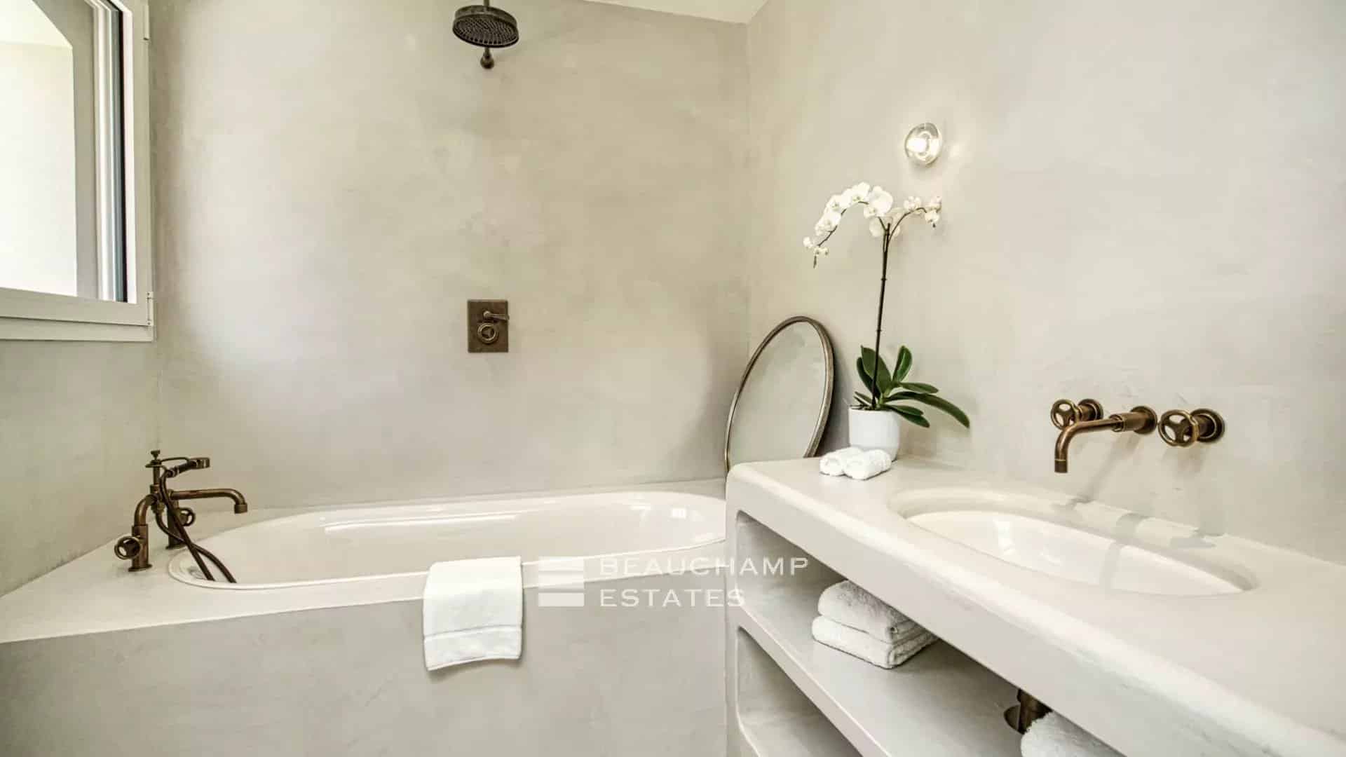 - Master suite comprising an entrance hall, dressing room, bedroom with two large openings overlooking the pool and sea, and a generous en-suite bathroom.
