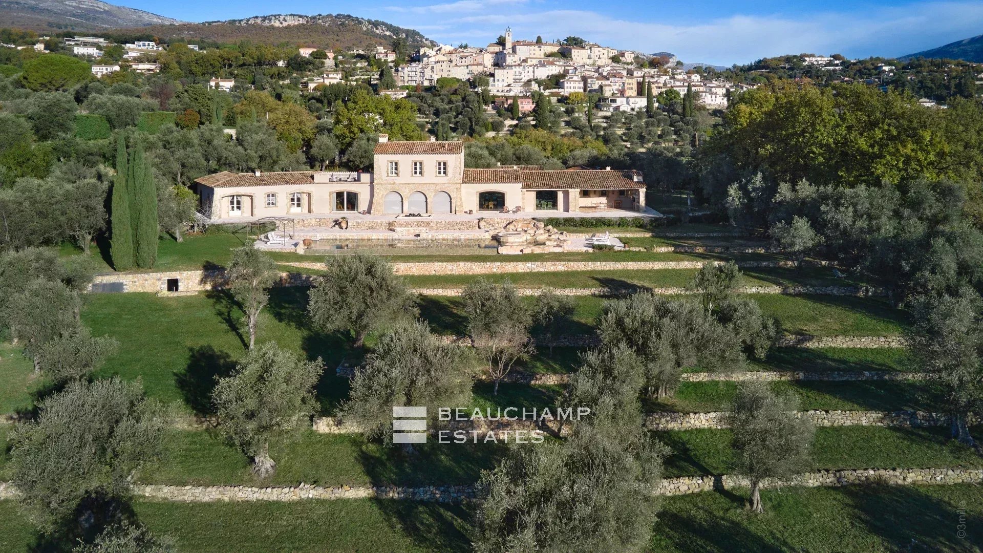 Located 25 minutes from Nice and Cannes airports, this prestigious south-facing stone bastide offers a unique setting. Set in 10,000 m² of fully walled grounds, richly landscaped with 150 mature olive trees, it boasts a 360-degree panoramic view, from the Bay of Nice to Mandelieu.