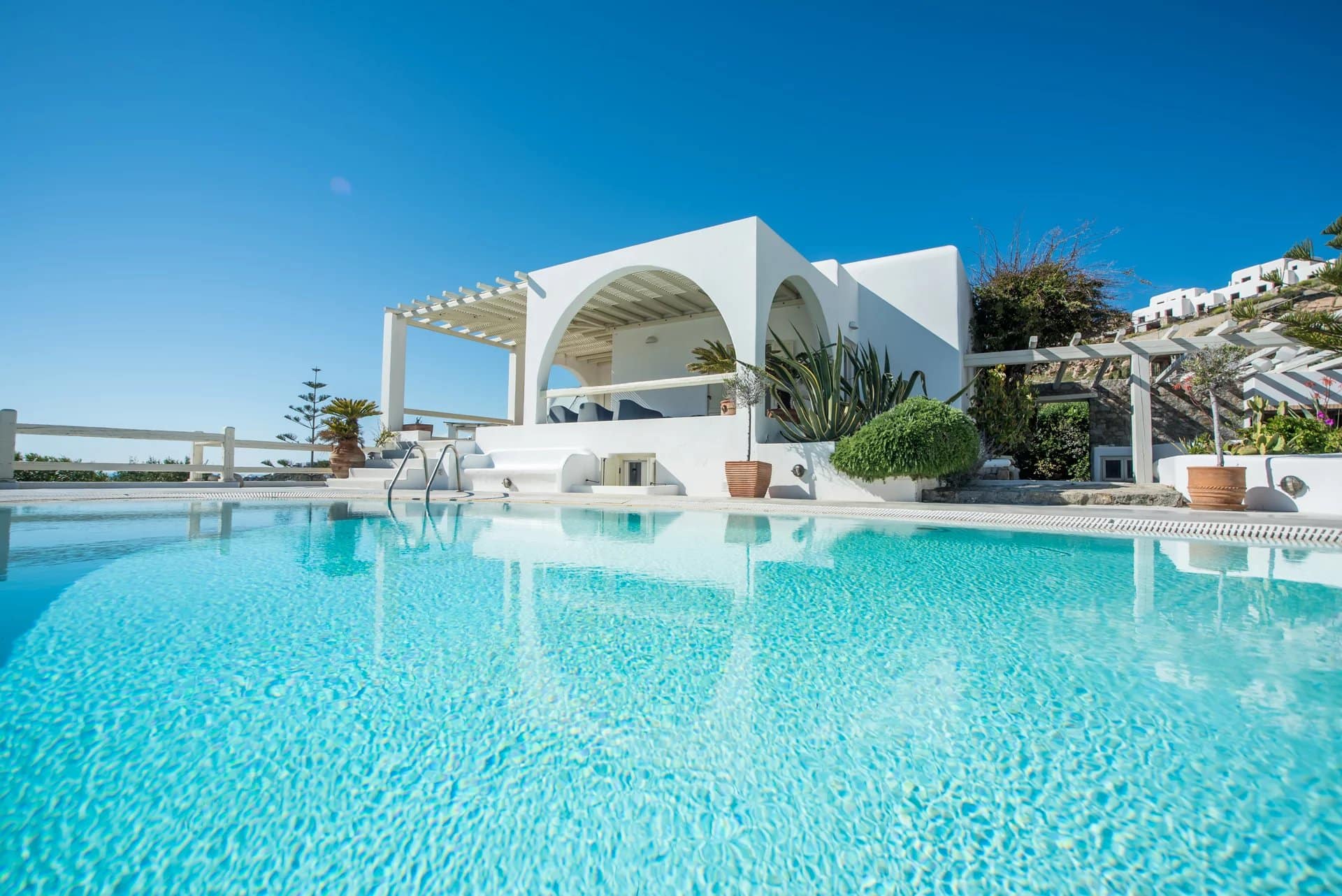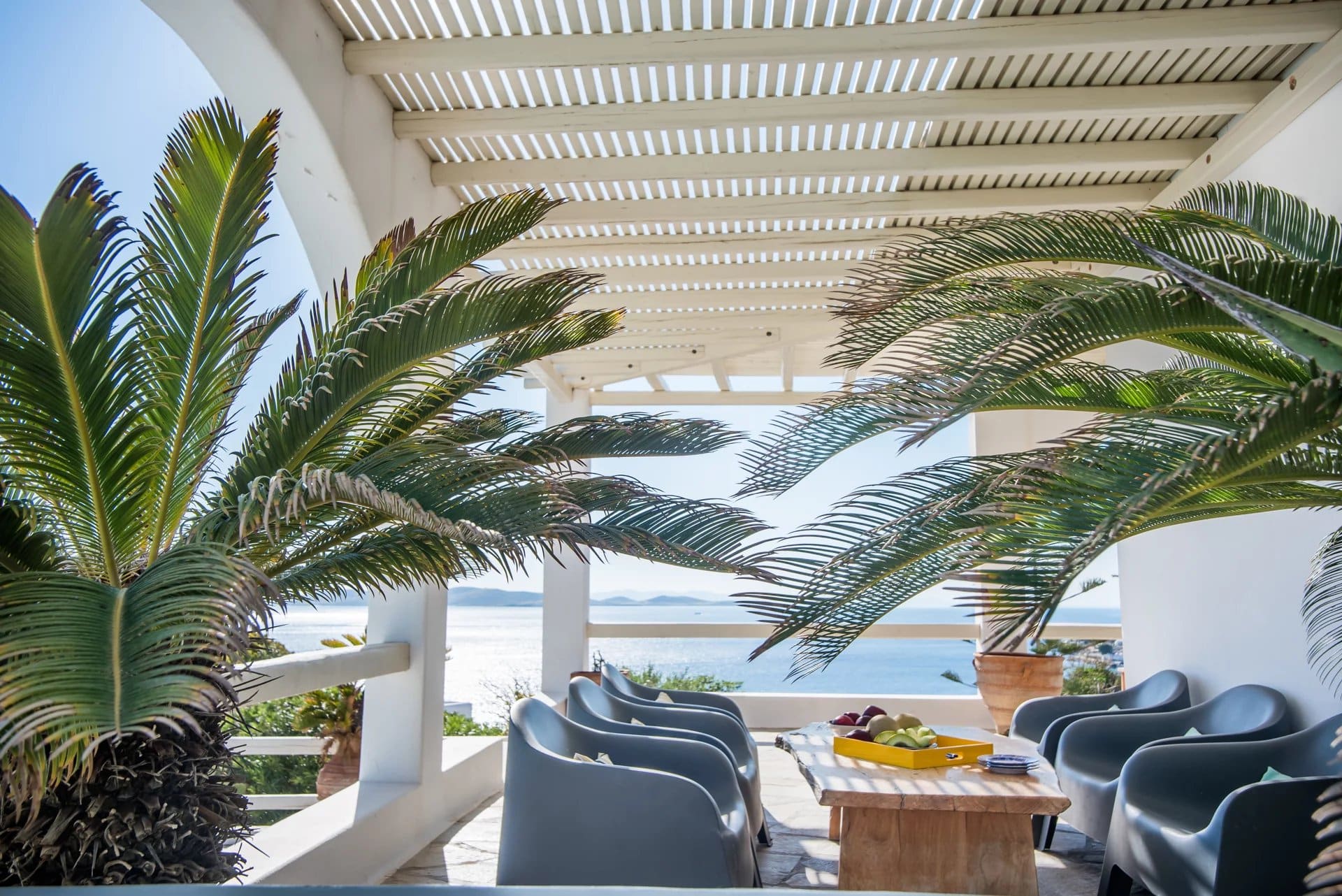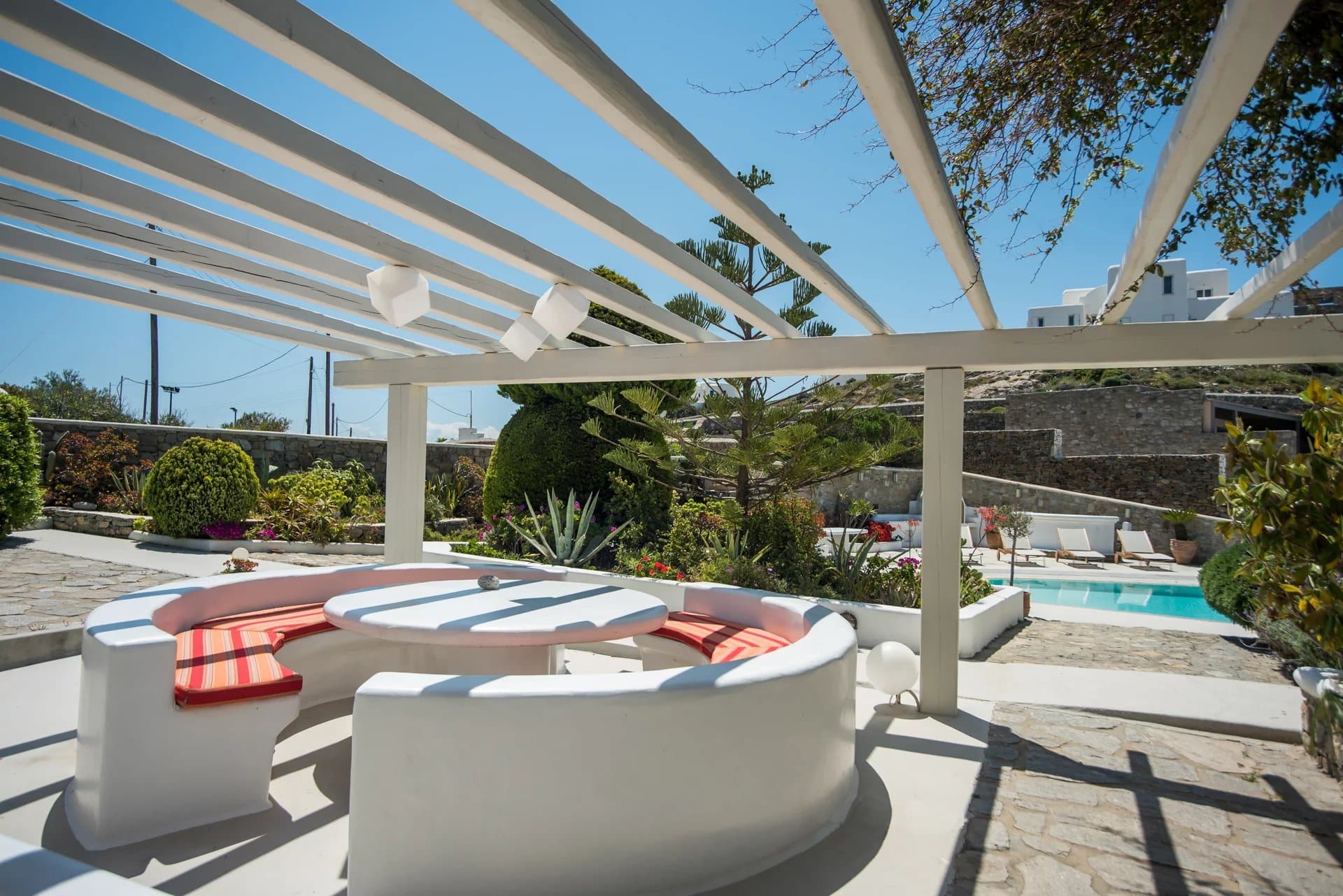 Outdoors, guests can indulge in the captivating sea views while lounging by the private swimming pool, equipped with sunbeds and surrounded by a terrace featuring a pergola-covered lounge area and built-in sofas. An alfresco dining area and outdoor barbecue provide opportunities for delightful meals under the sun or stars, while additional seating areas cater to the comfort of the bedrooms. An alfresco shower and onsite private parking further enhance the villa's appeal.