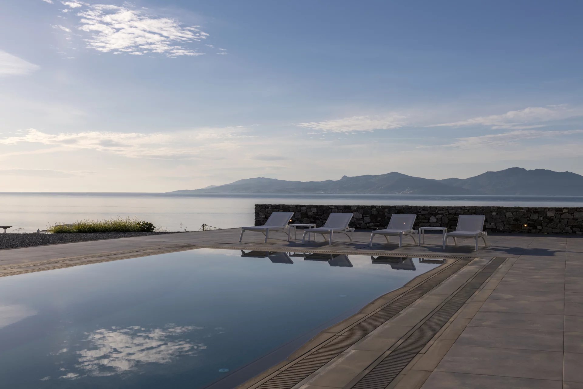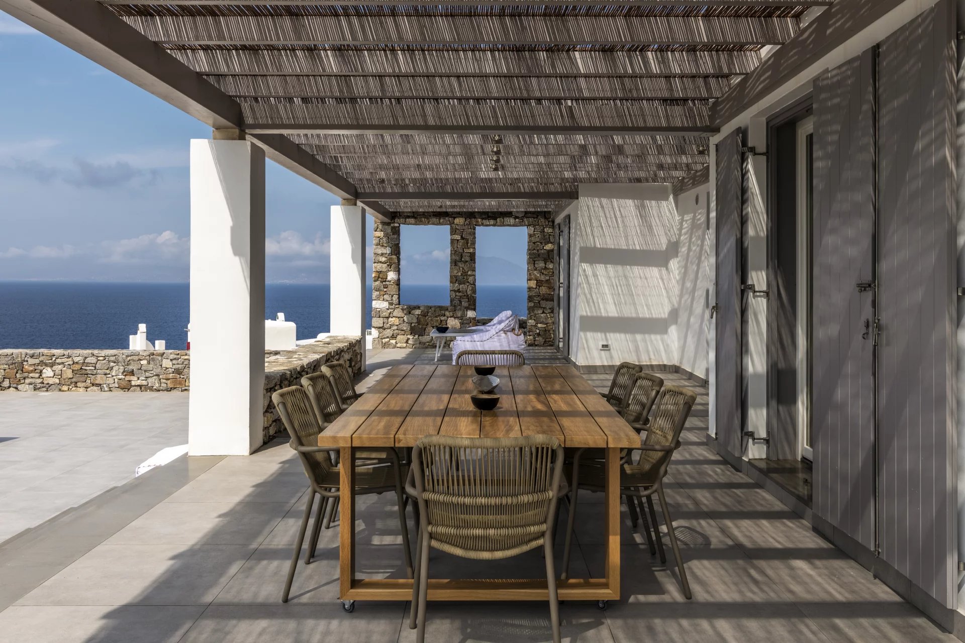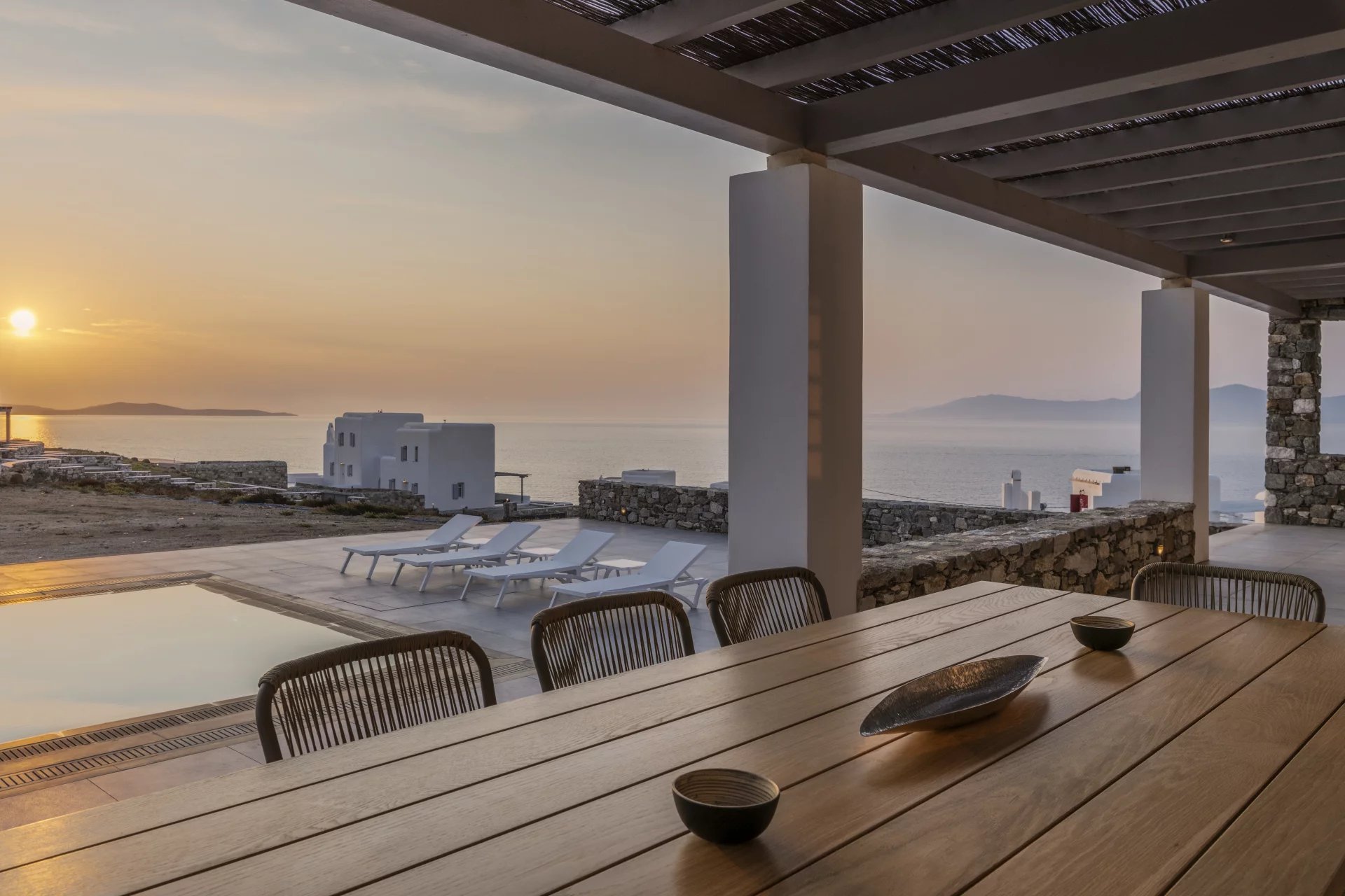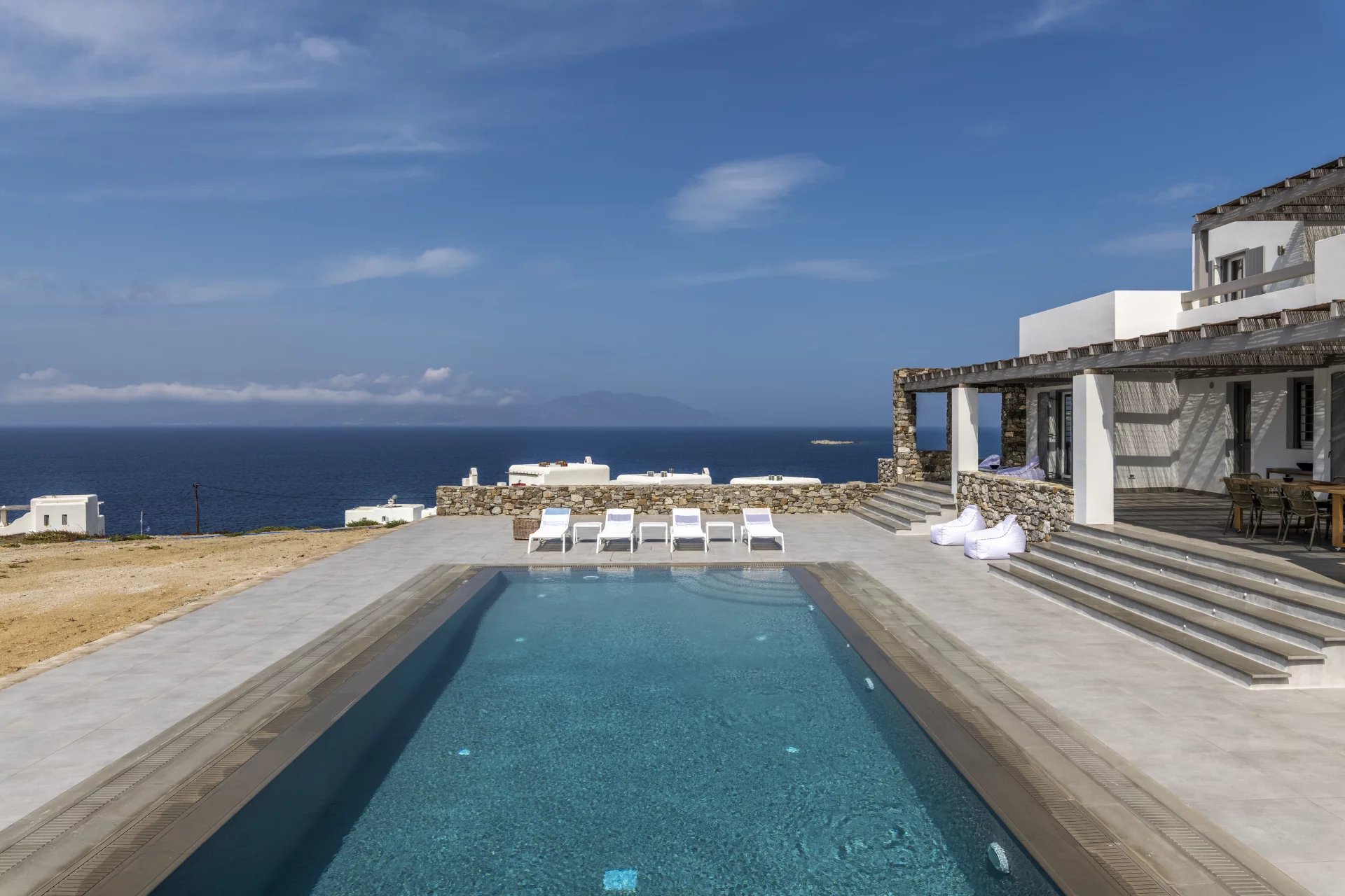 Outside, the villa's expansive outdoor space spans four acres, offering unobstructed 280-degree sea views and mesmerizing sunsets. A dining and sitting area under a pergola beckons for al fresco dining, while an infinity pool, lounge areas, sun beds, and an outdoor shower invite moments of tranquility and rejuvenation.