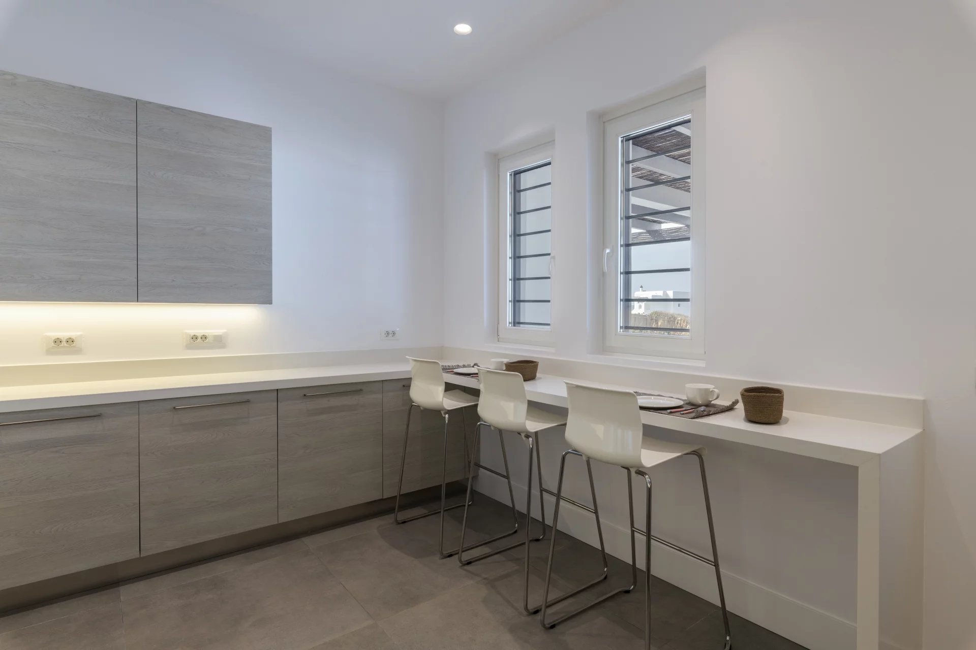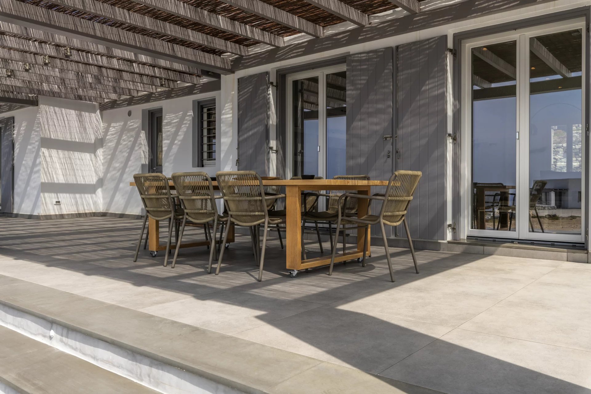 Ascend to the upper floor to discover two more double bedrooms, each with en-suite facilities and direct access to a spacious verandah. Here, a shaded pergola offers panoramic views of the coastline, providing an idyllic setting for relaxation and enjoyment.