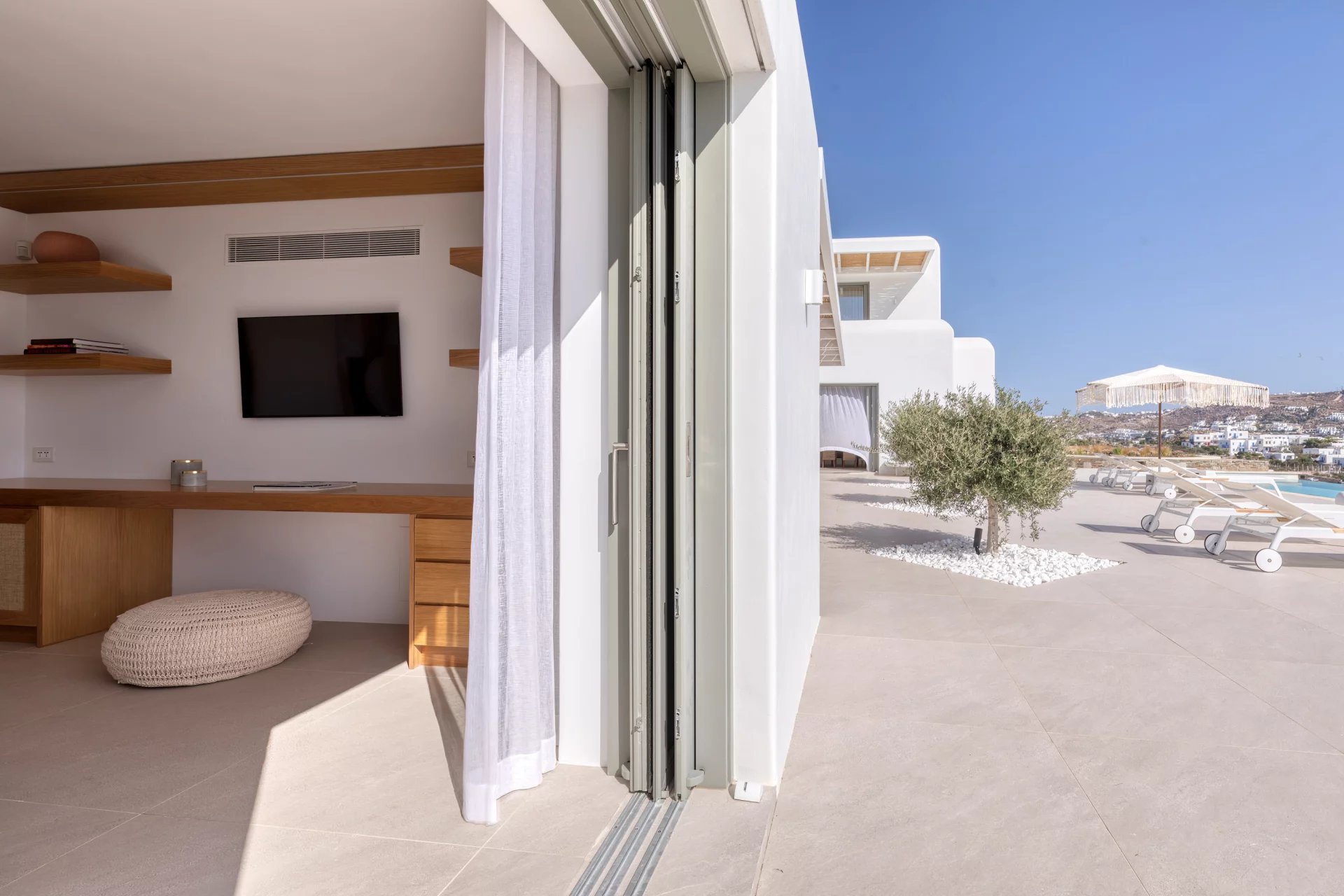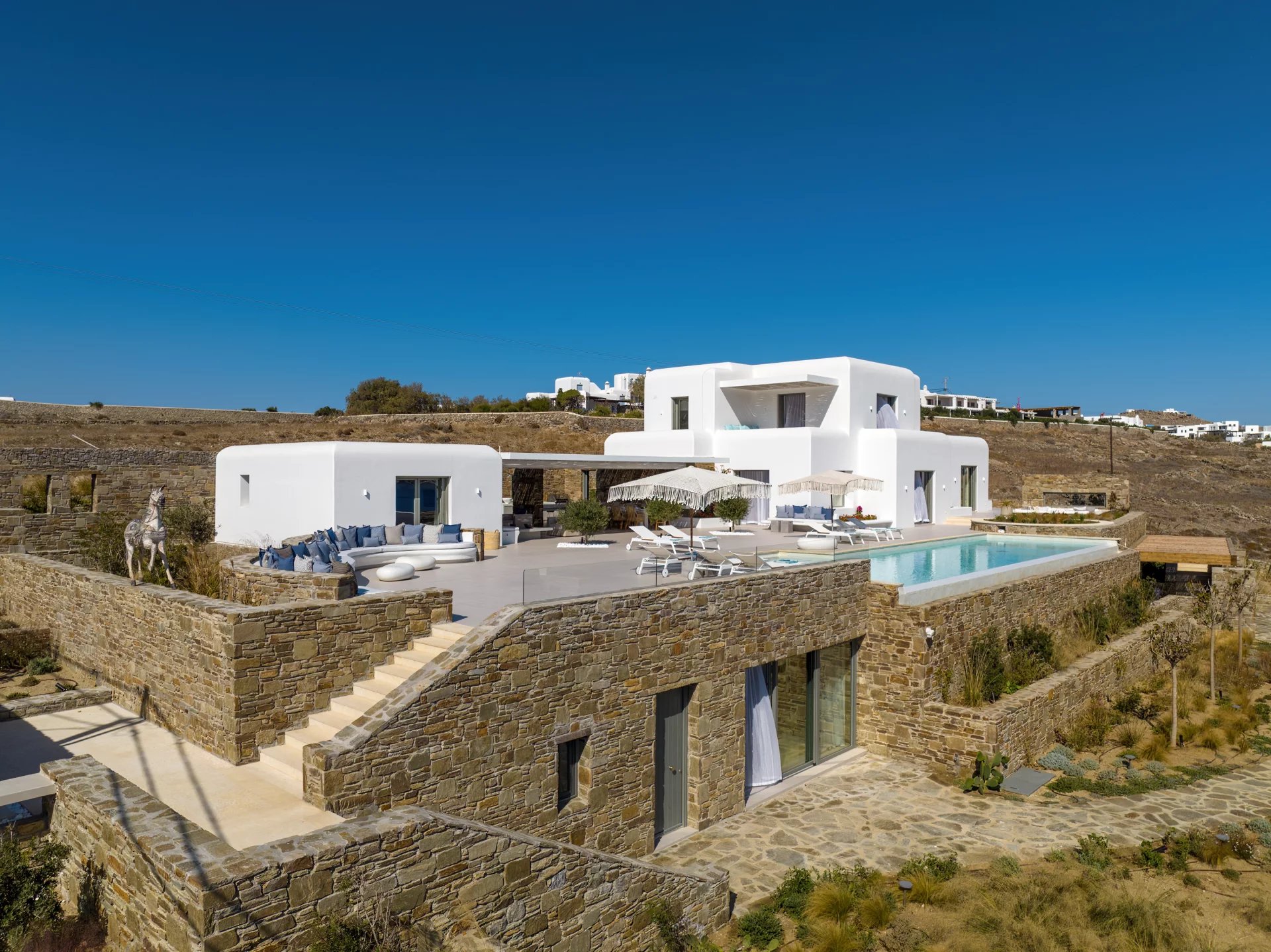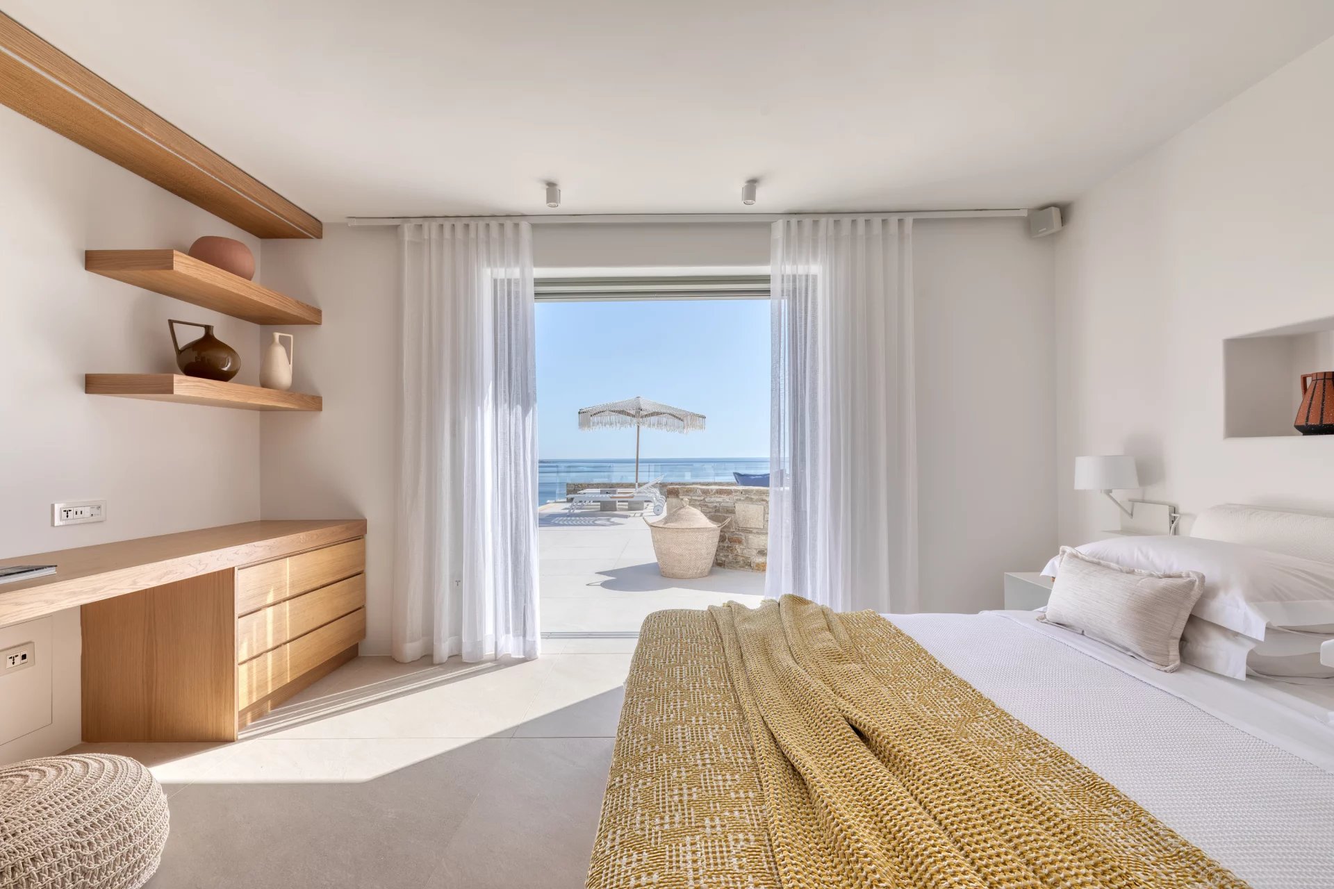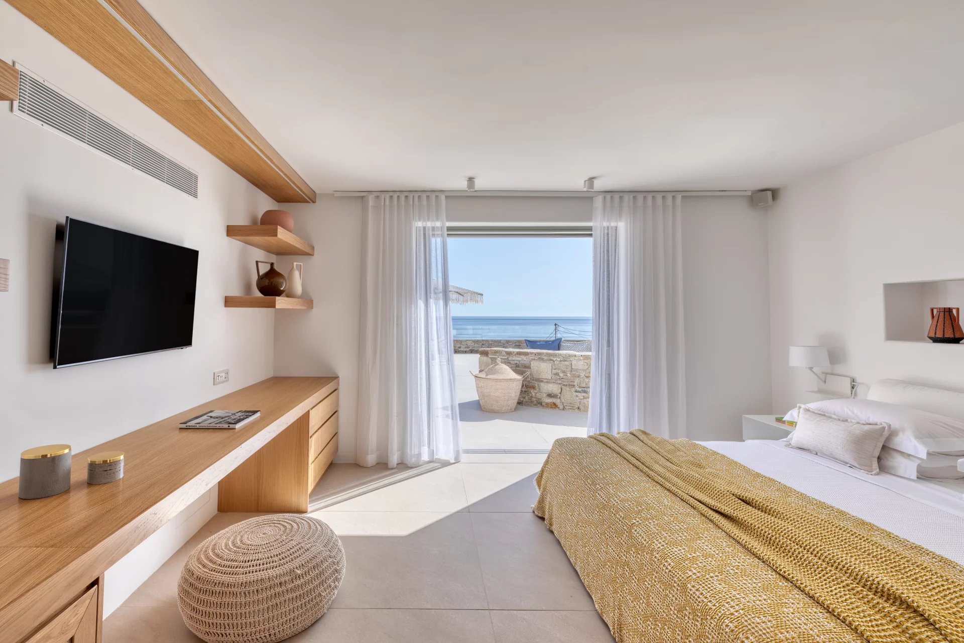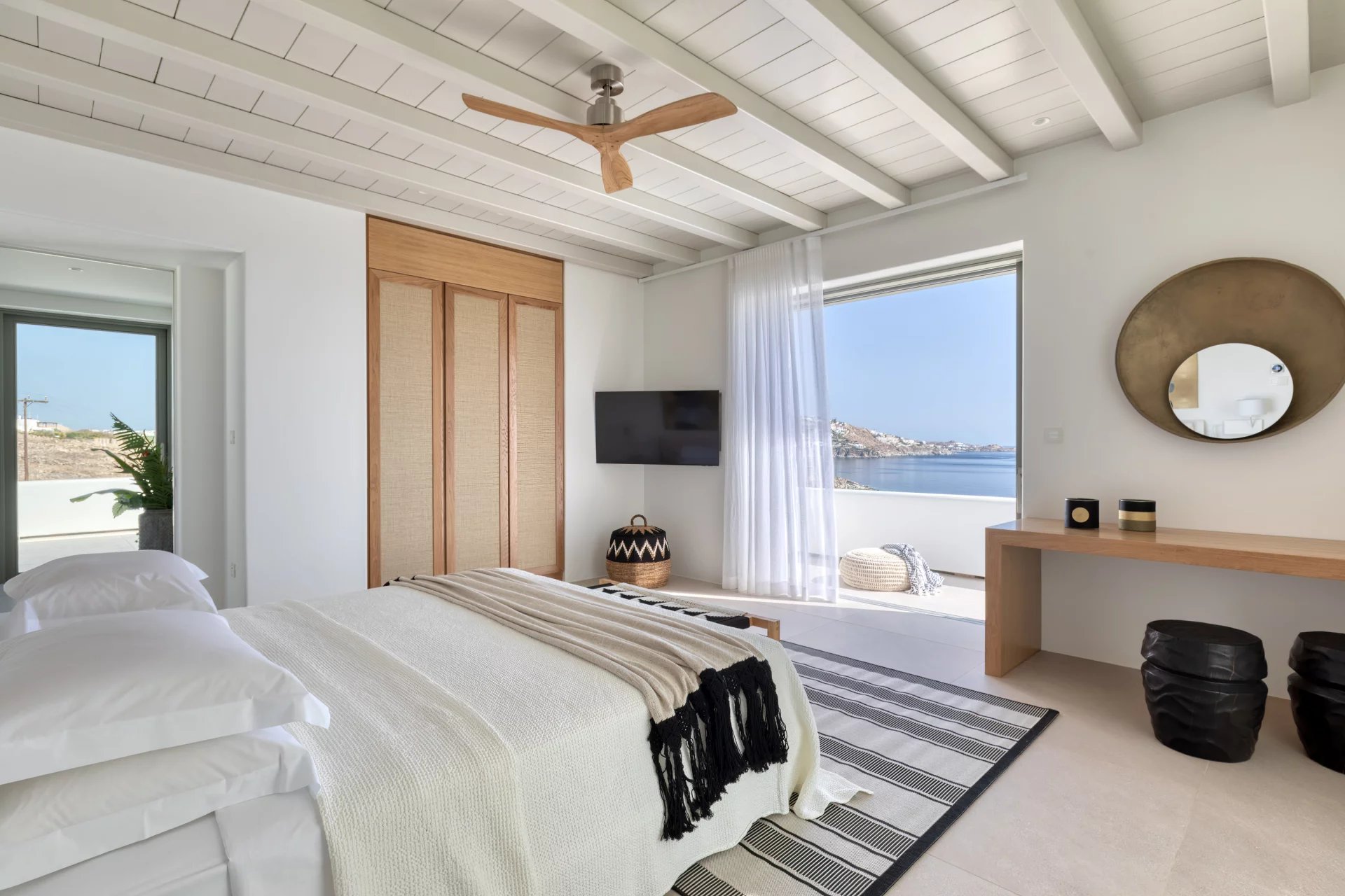 The upper level features a master bedroom with a king-size bed, A/C, a double shower, and sinks, along with access to a large private veranda and three balconies with stunning sea views. On the entrance level, you’ll find a fully equipped kitchen, open living spaces, and a dining area, along with a smart TV and A/C. This level also includes two double bedrooms, both with king-size beds, smart TVs, and en-suite bathrooms, offering access to outdoor lounges.