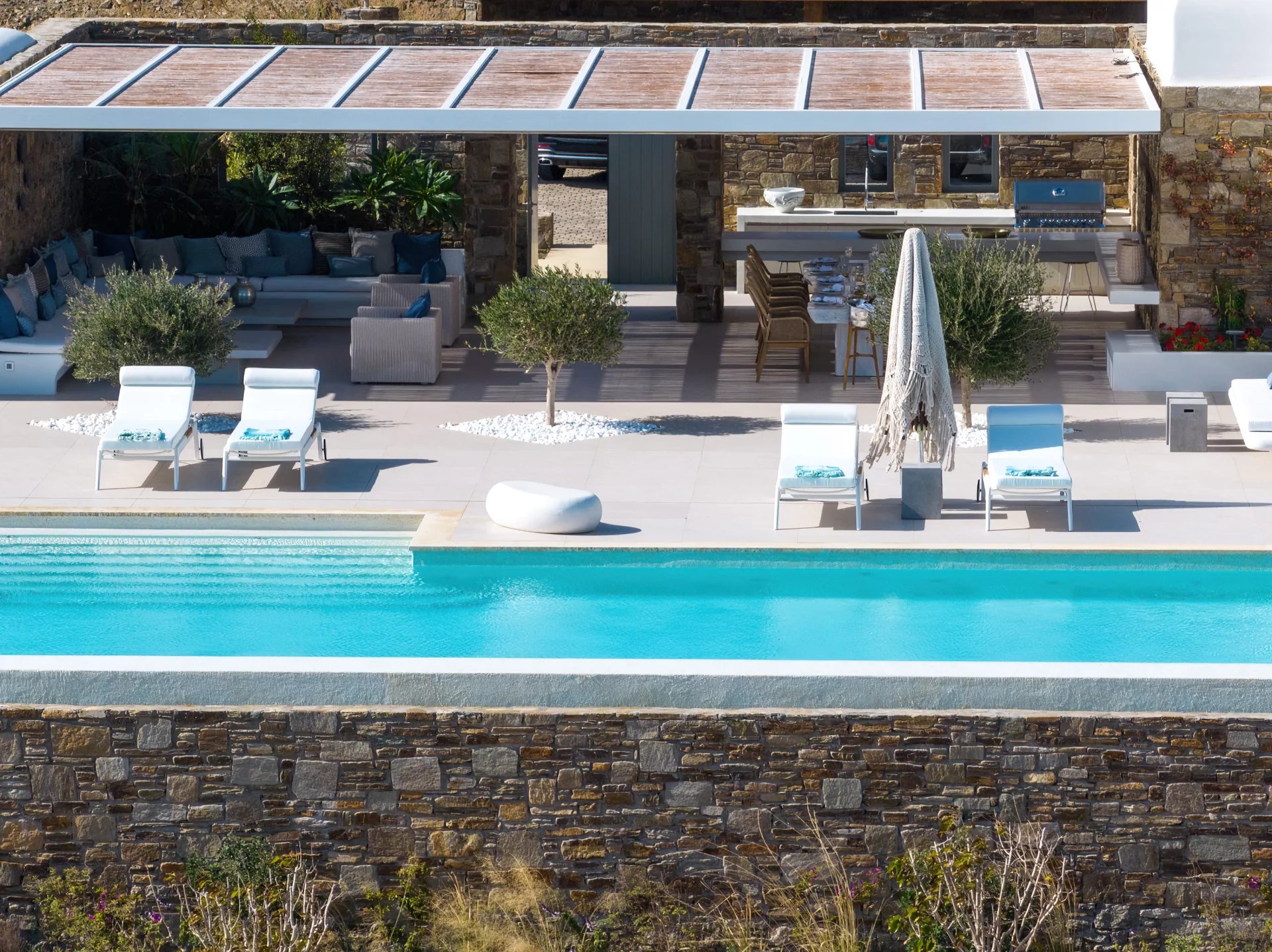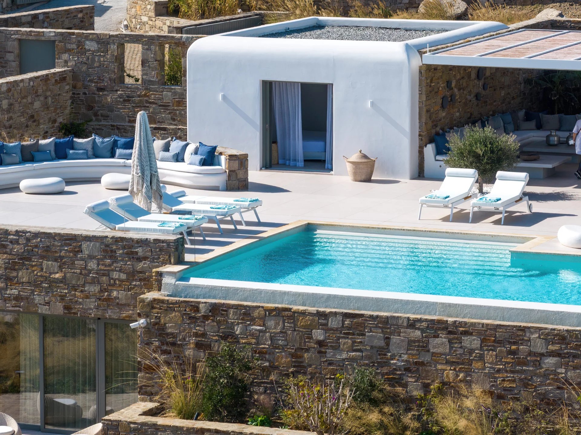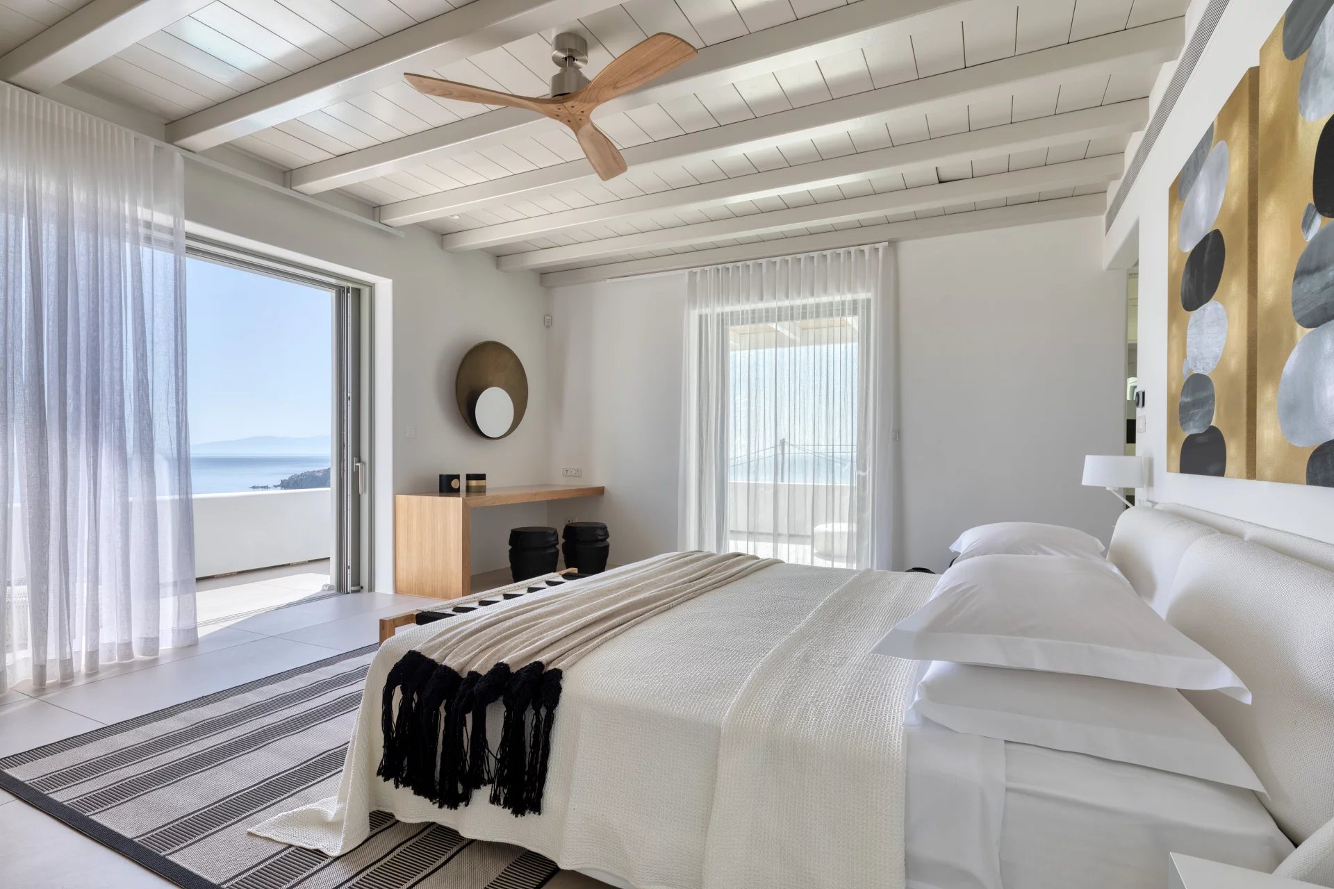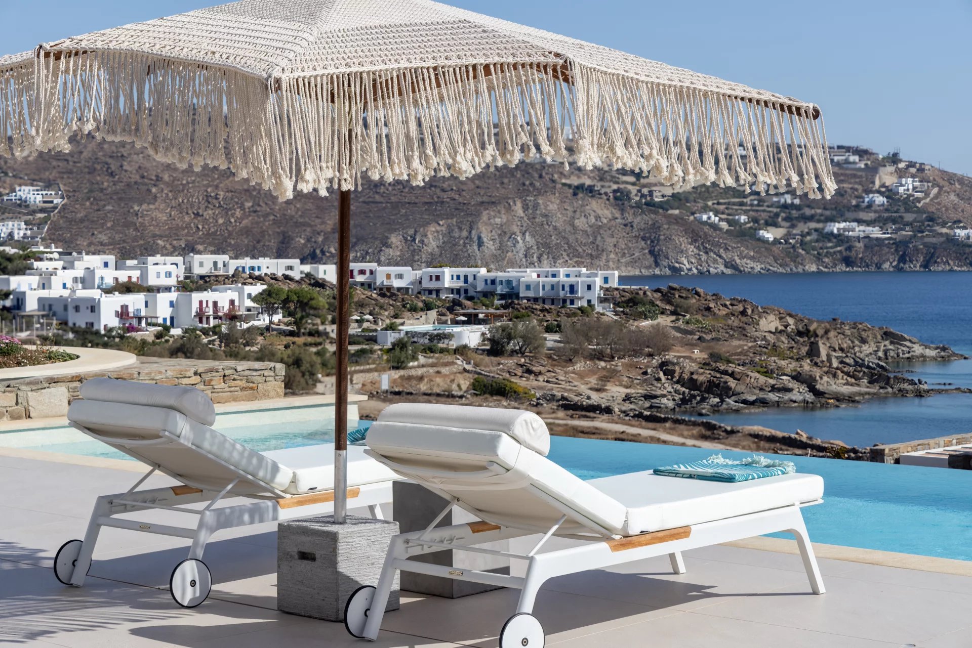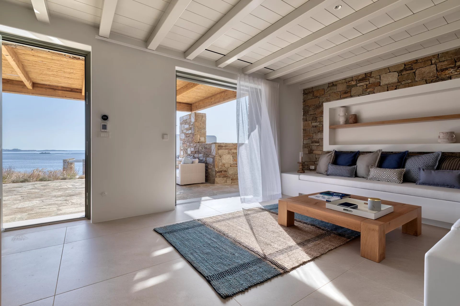 The upper level features a master bedroom with a king-size bed, A/C, a double shower, and sinks, along with access to a large private veranda and three balconies with stunning sea views. On the entrance level, you’ll find a fully equipped kitchen, open living spaces, and a dining area, along with a smart TV and A/C. This level also includes two double bedrooms, both with king-size beds, smart TVs, and en-suite bathrooms, offering access to outdoor lounges.