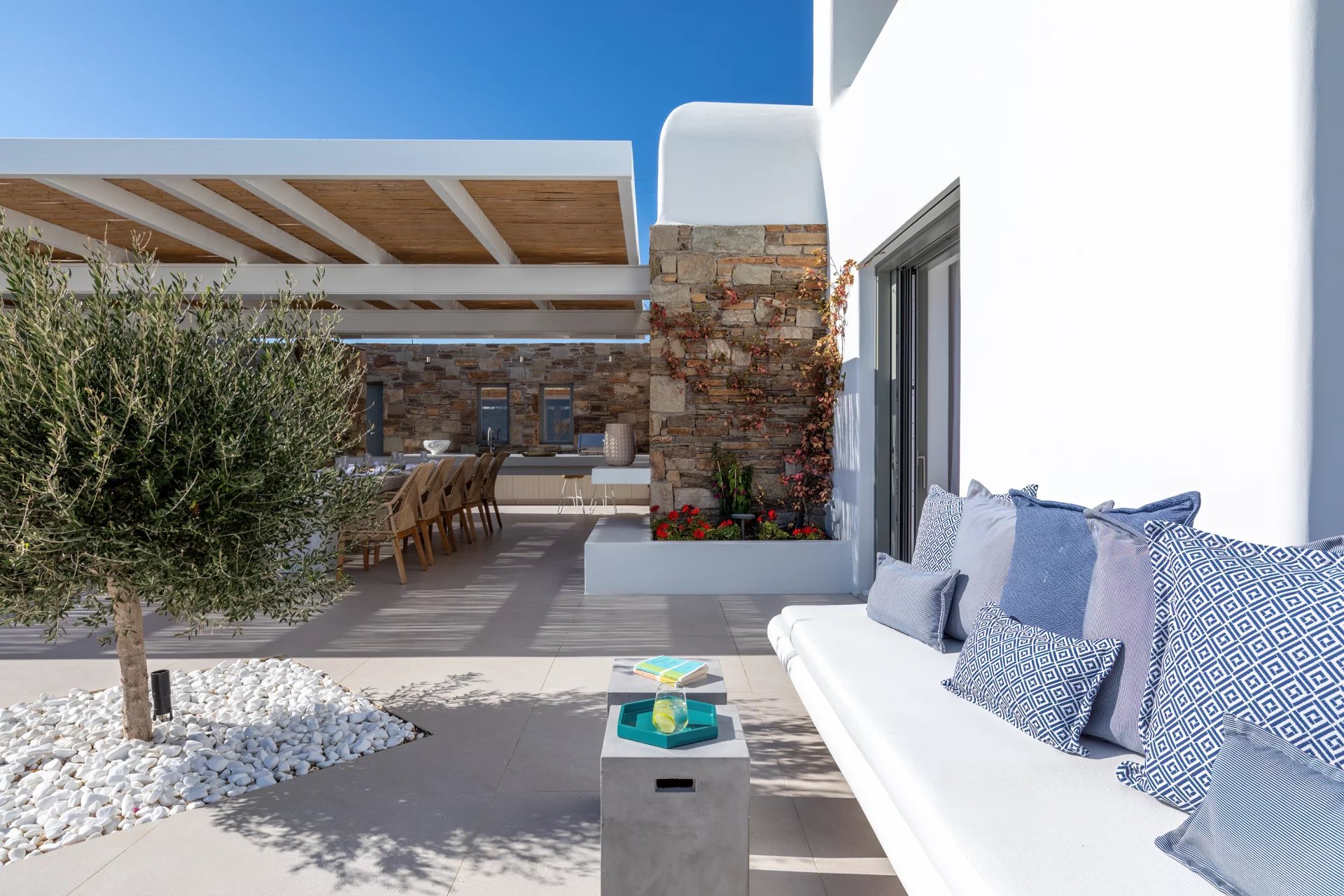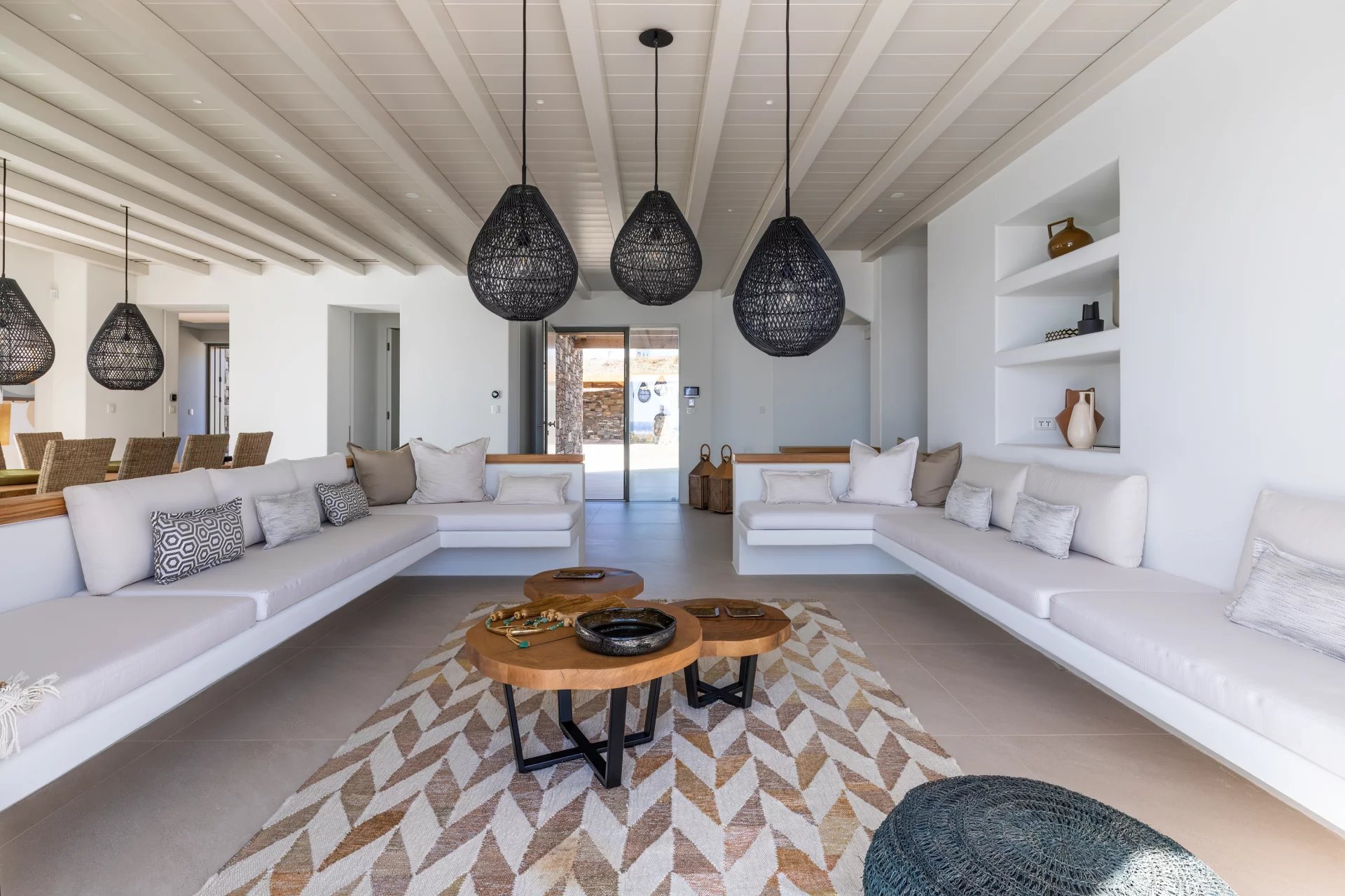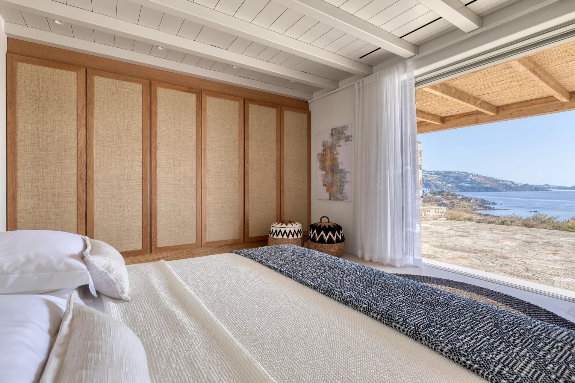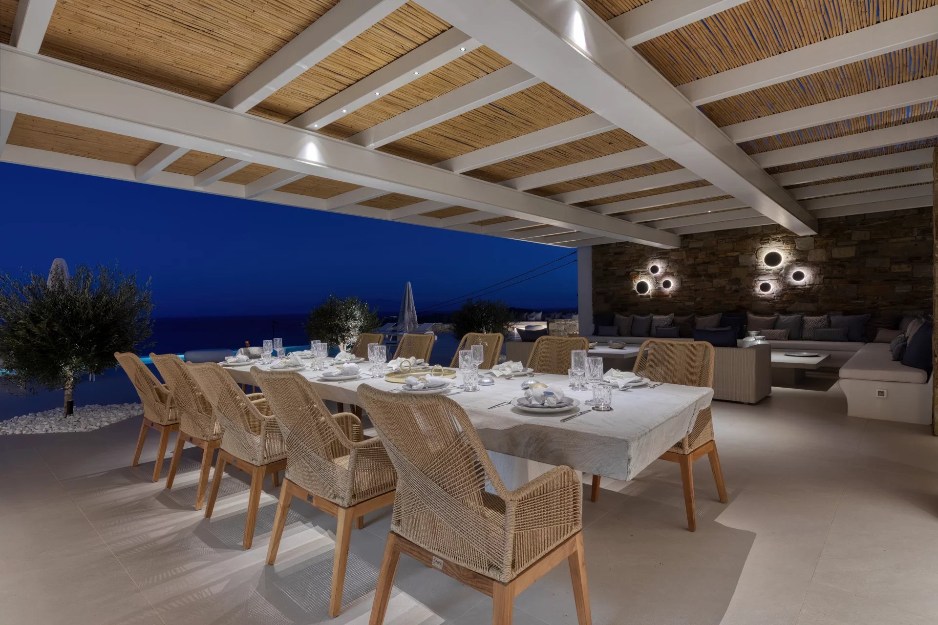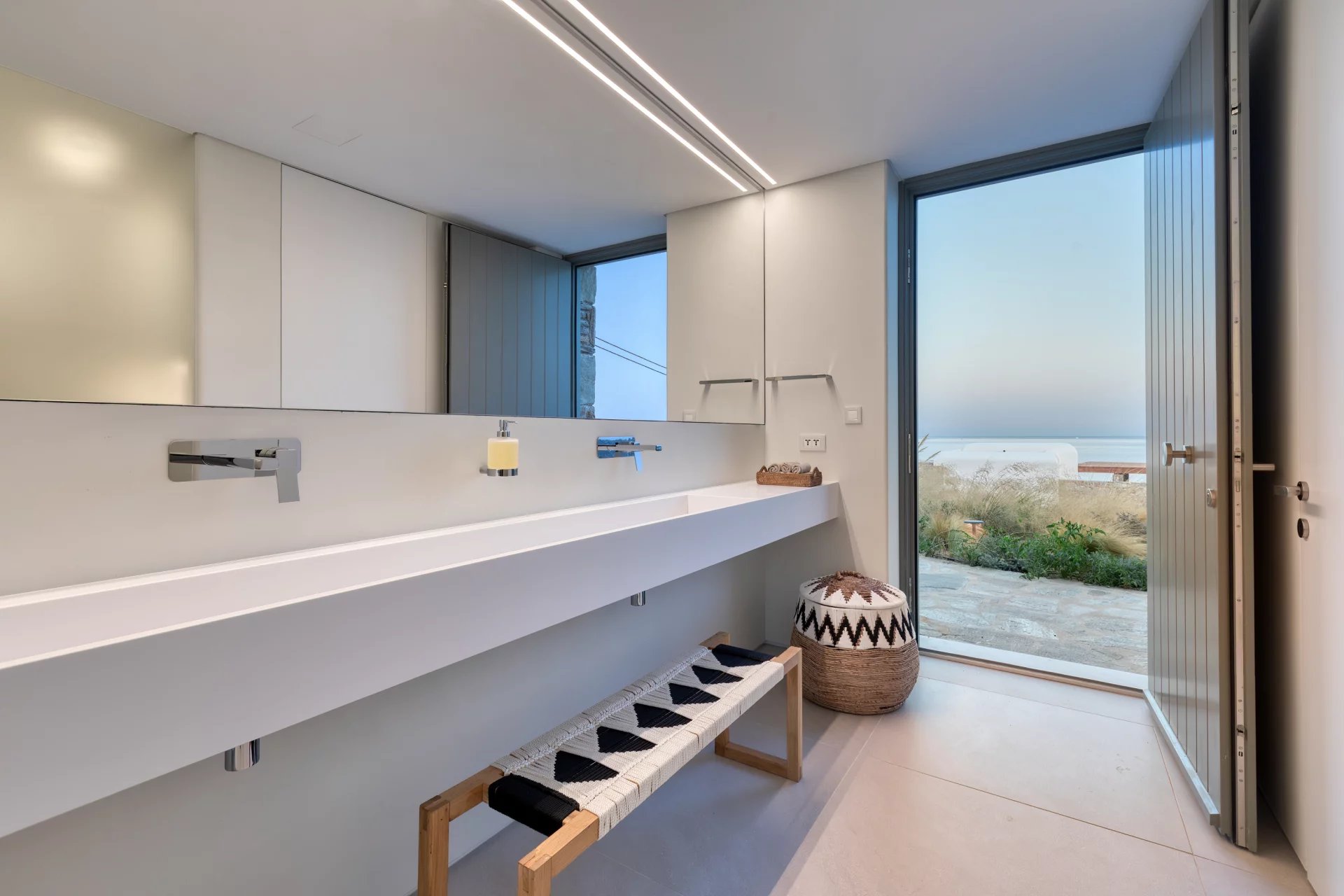 The upper level features a master bedroom with a king-size bed, A/C, a double shower, and sinks, along with access to a large private veranda and three balconies with stunning sea views. On the entrance level, you’ll find a fully equipped kitchen, open living spaces, and a dining area, along with a smart TV and A/C. This level also includes two double bedrooms, both with king-size beds, smart TVs, and en-suite bathrooms, offering access to outdoor lounges.