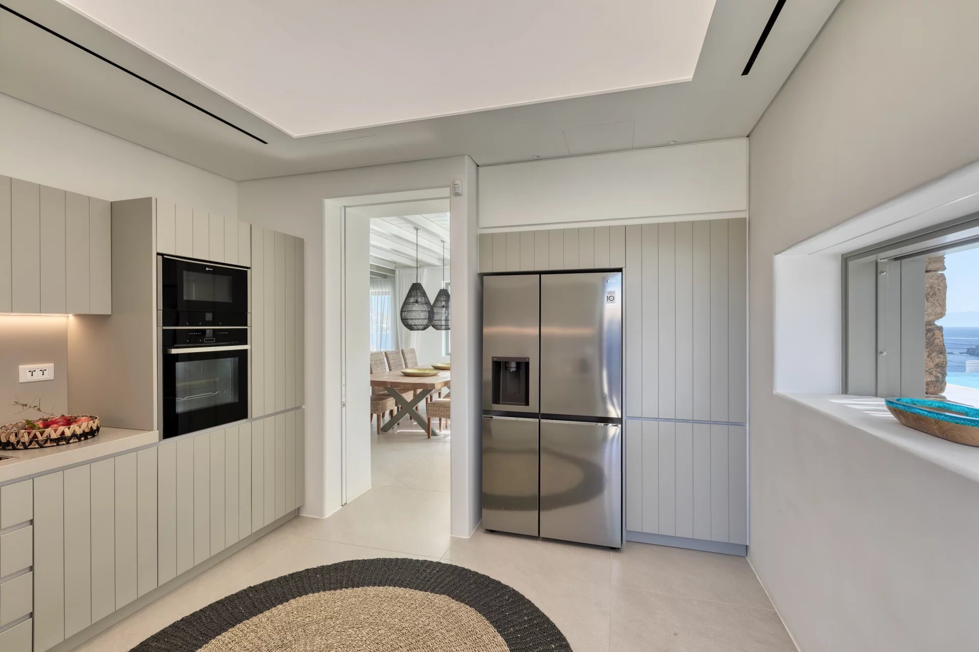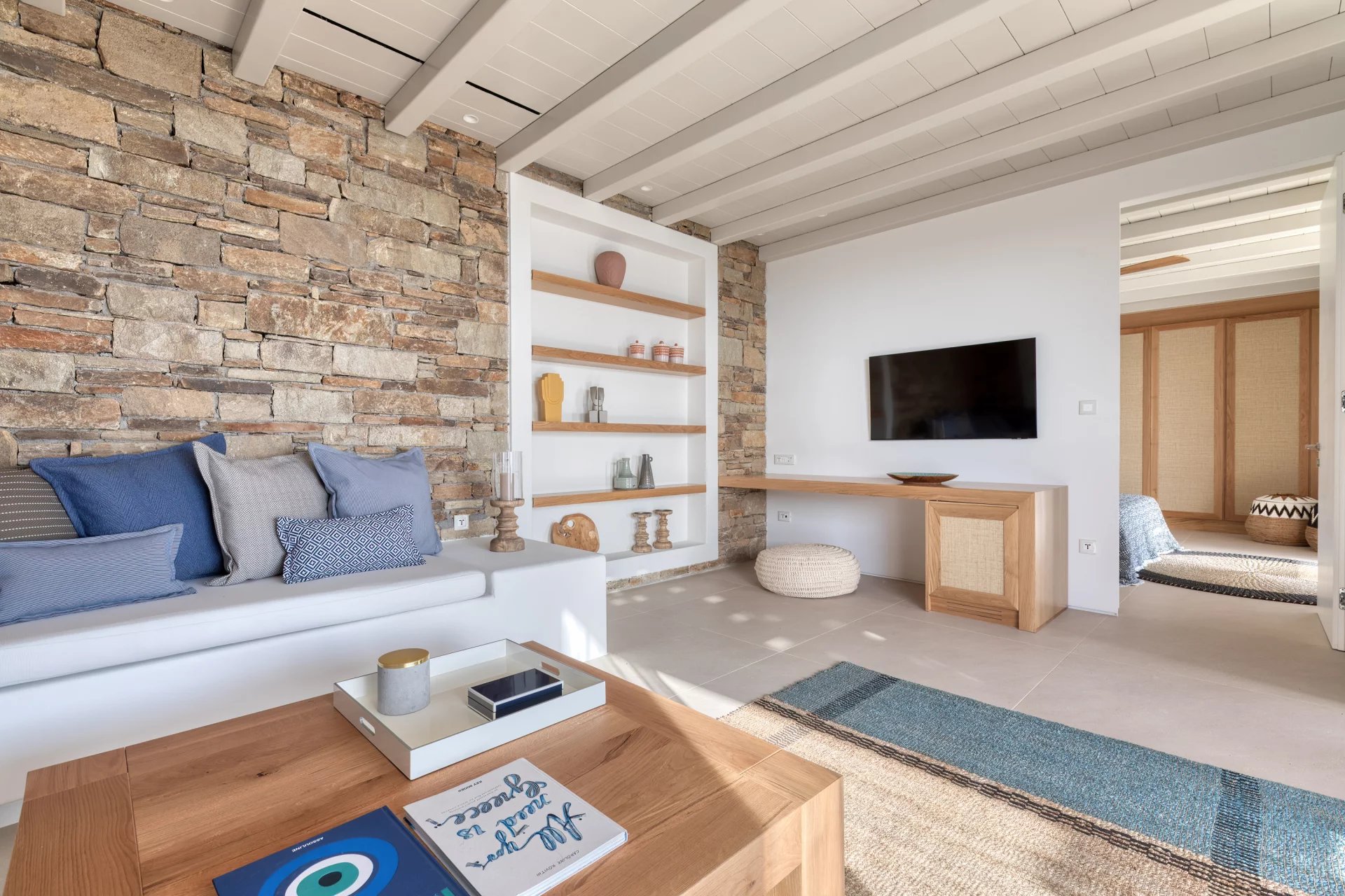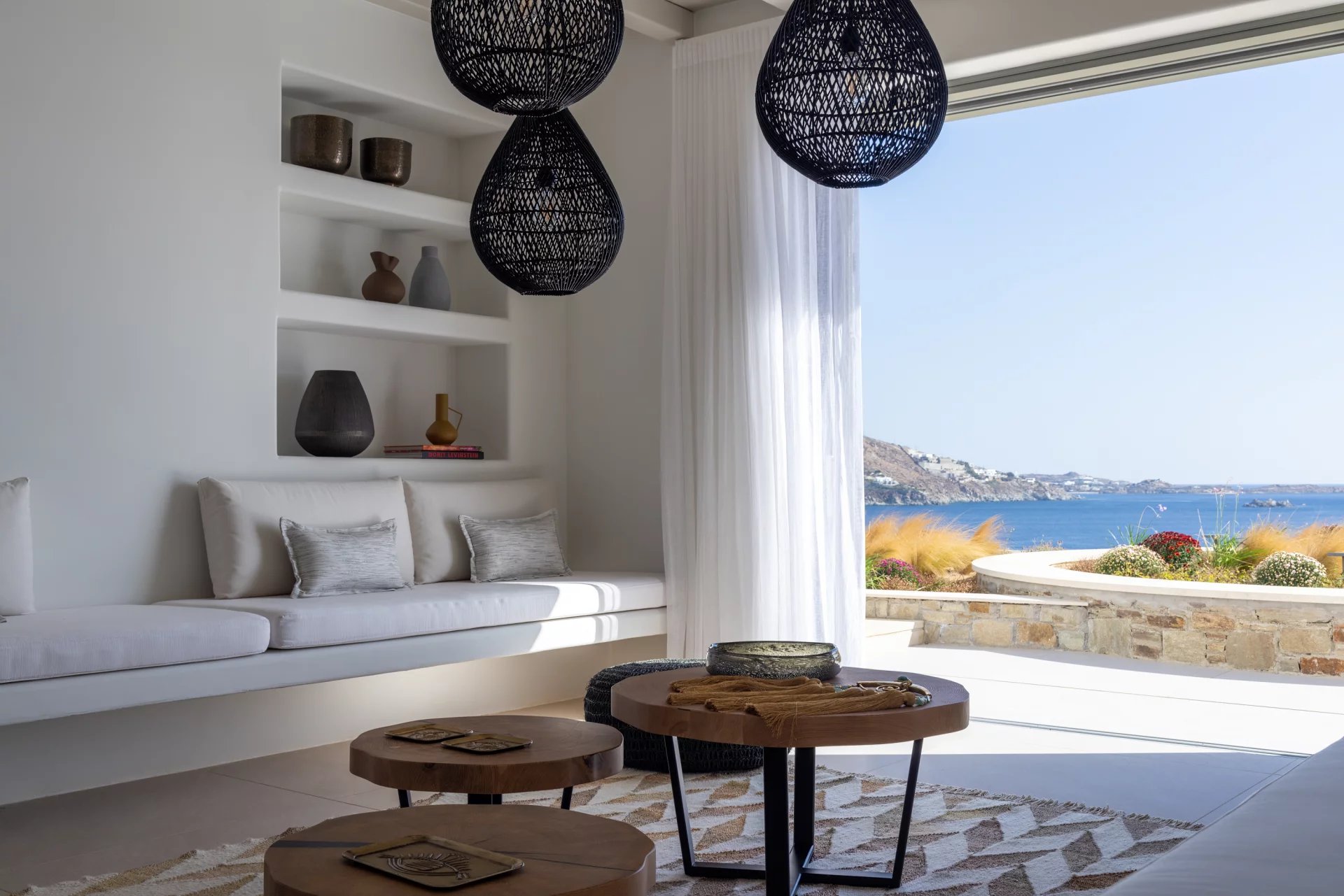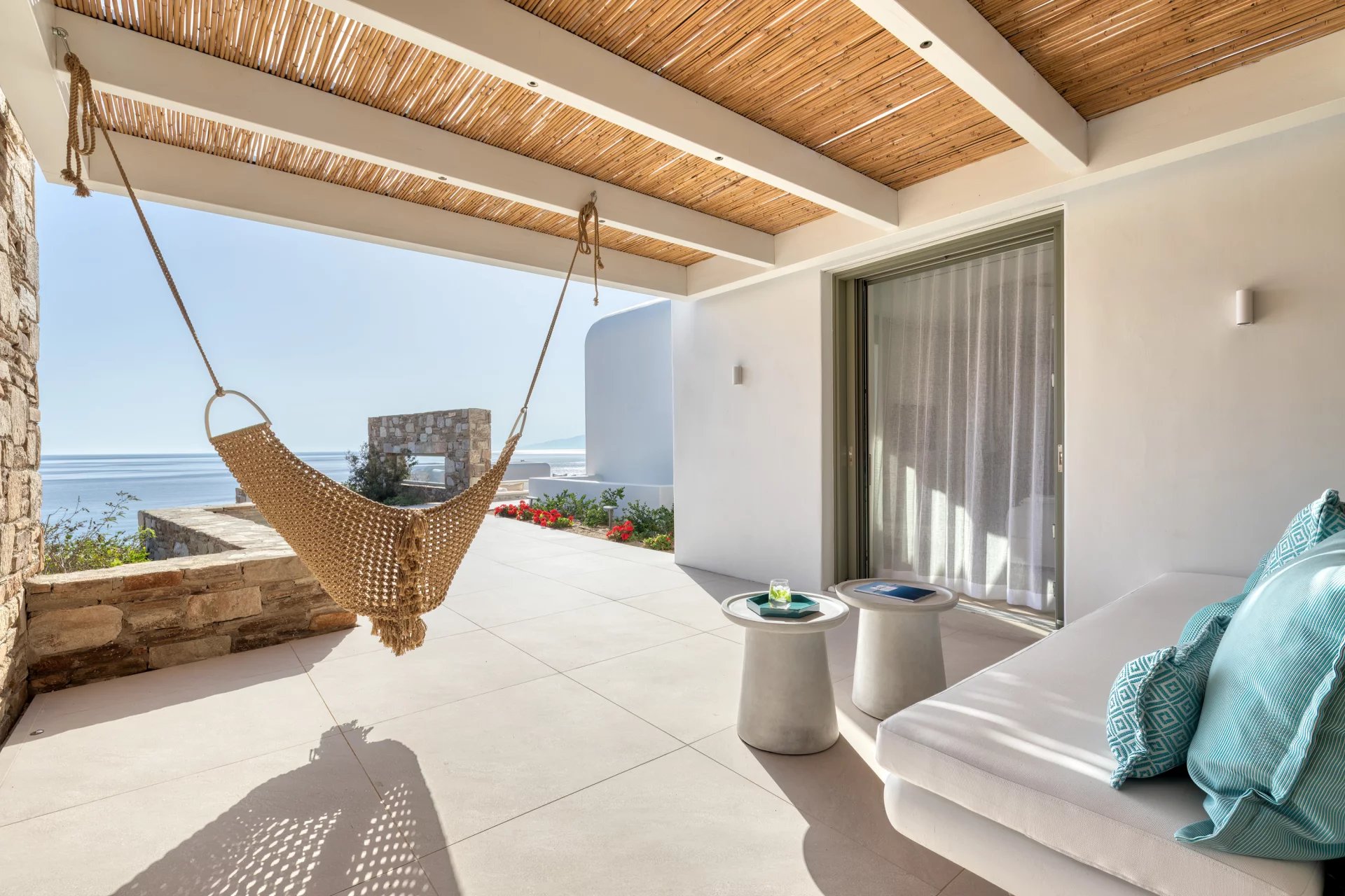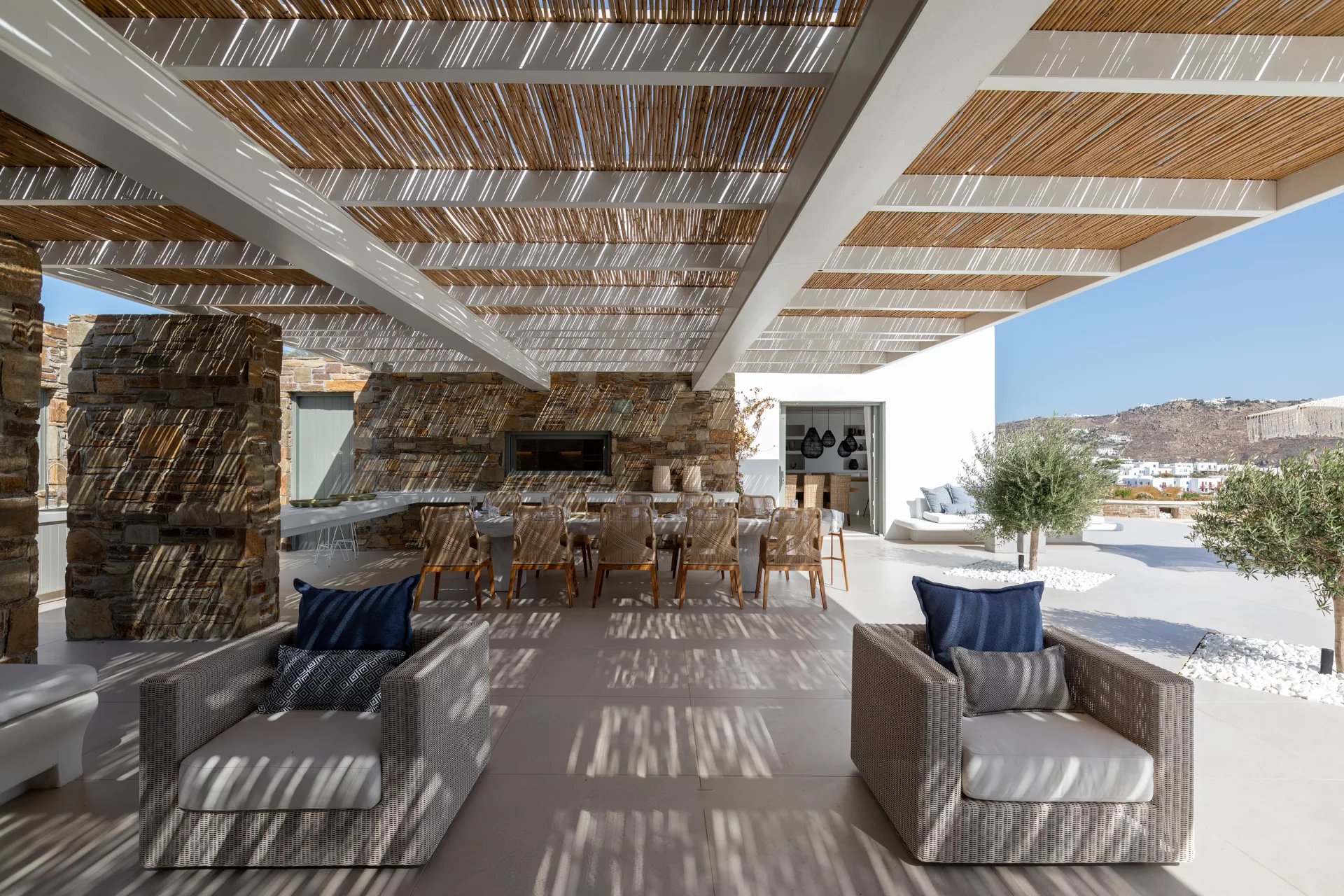 The upper level features a master bedroom with a king-size bed, A/C, a double shower, and sinks, along with access to a large private veranda and three balconies with stunning sea views. On the entrance level, you’ll find a fully equipped kitchen, open living spaces, and a dining area, along with a smart TV and A/C. This level also includes two double bedrooms, both with king-size beds, smart TVs, and en-suite bathrooms, offering access to outdoor lounges.