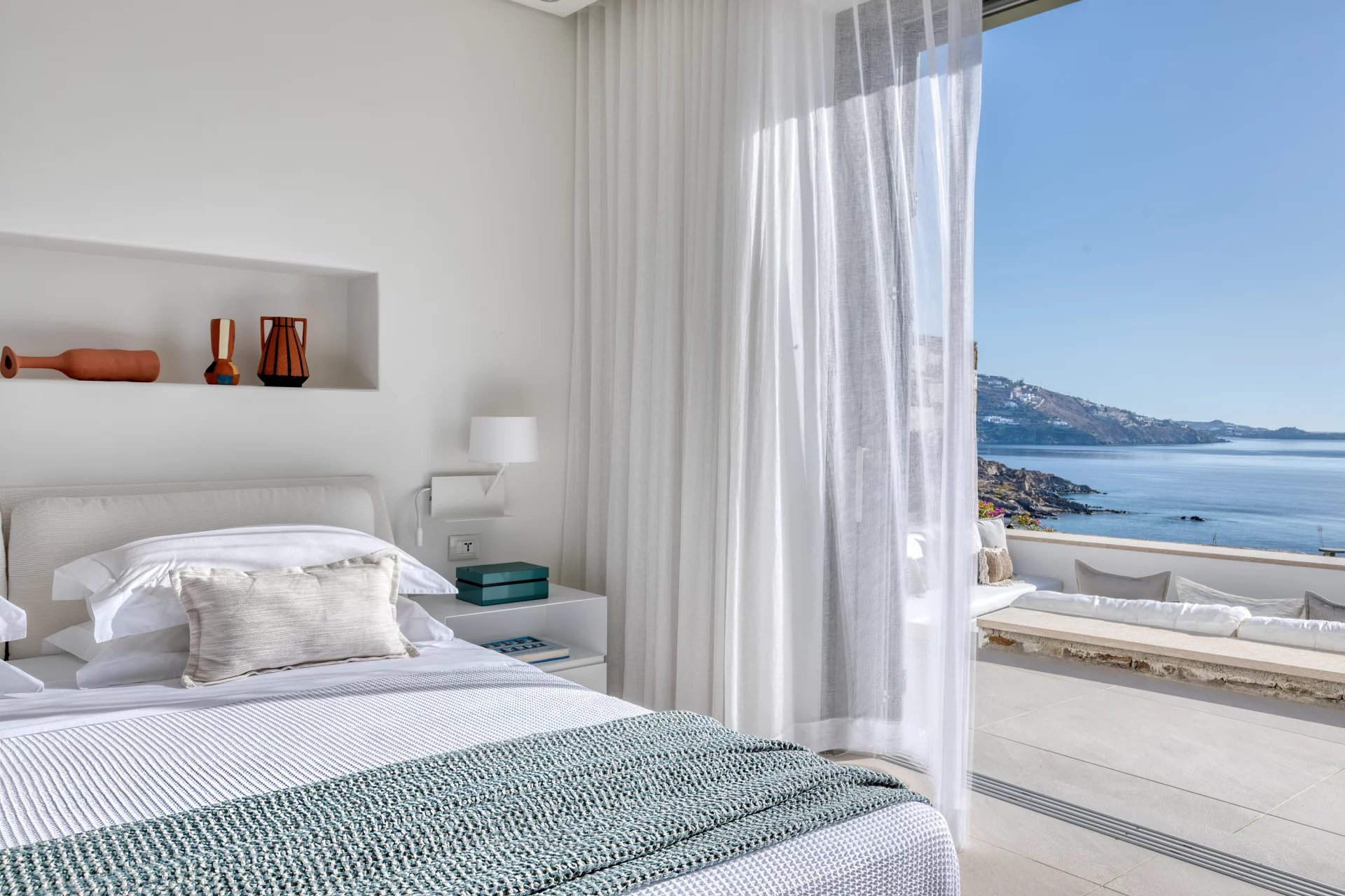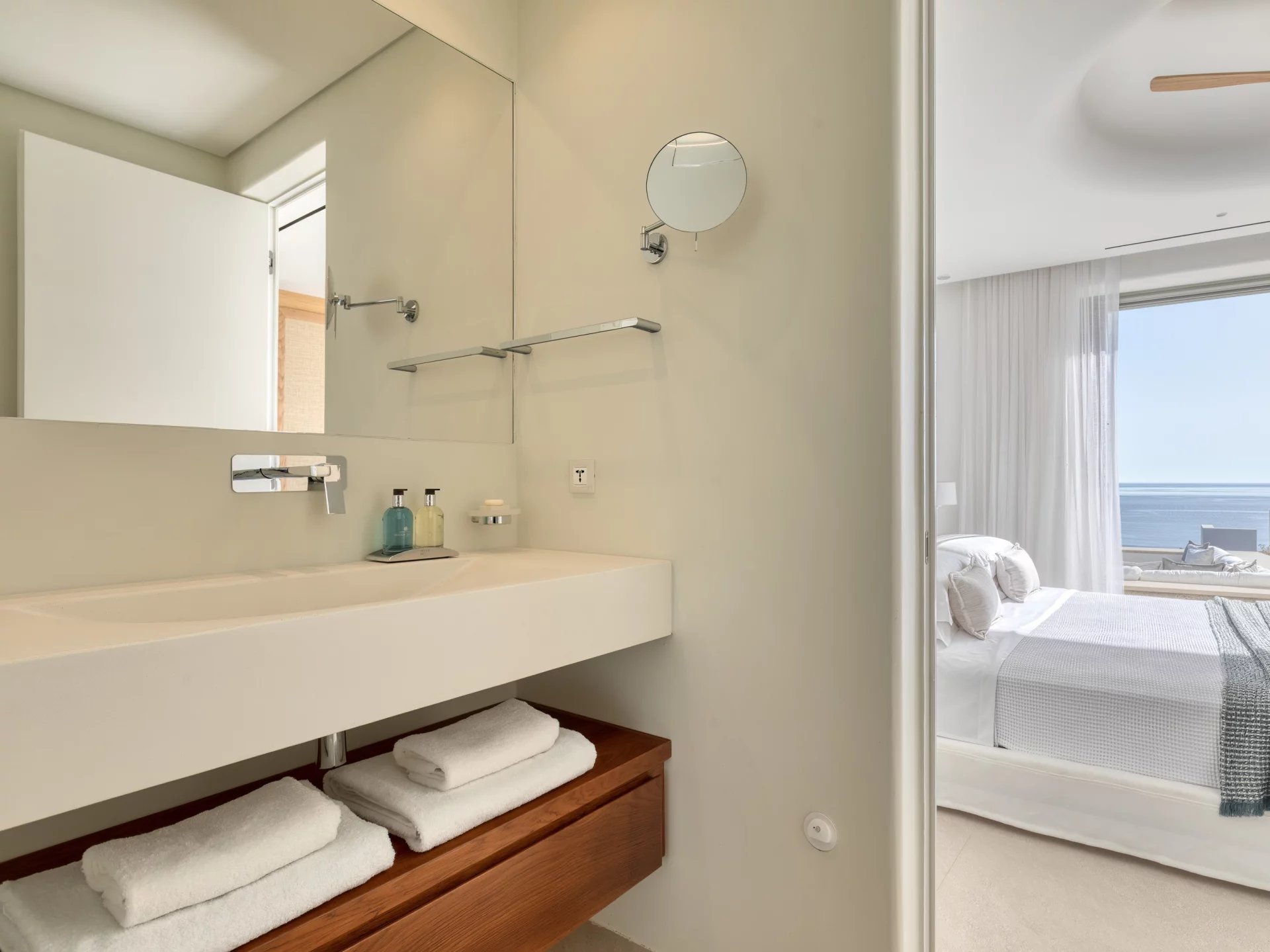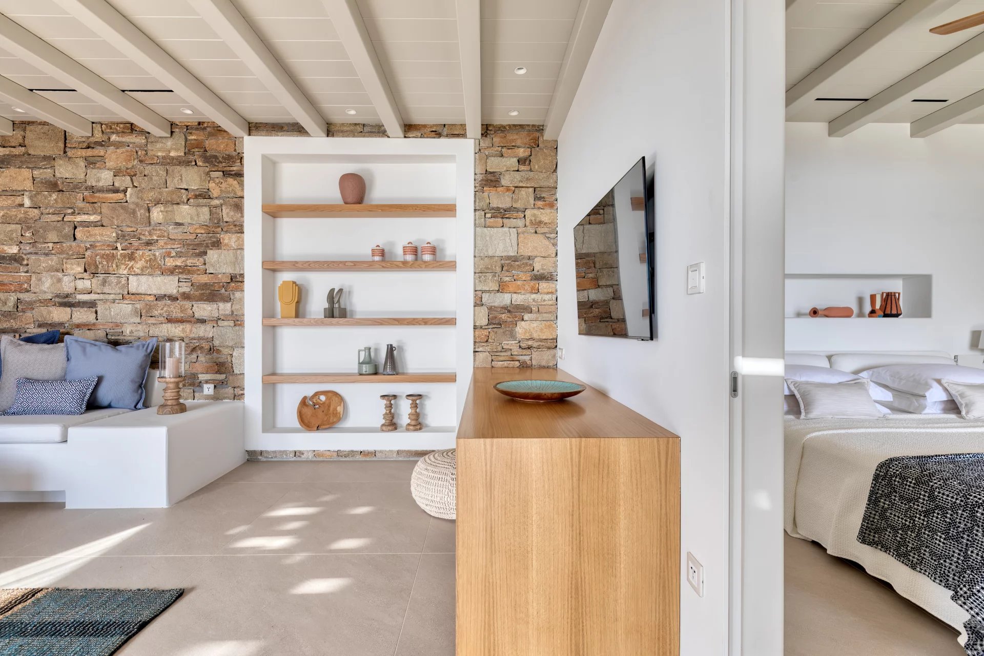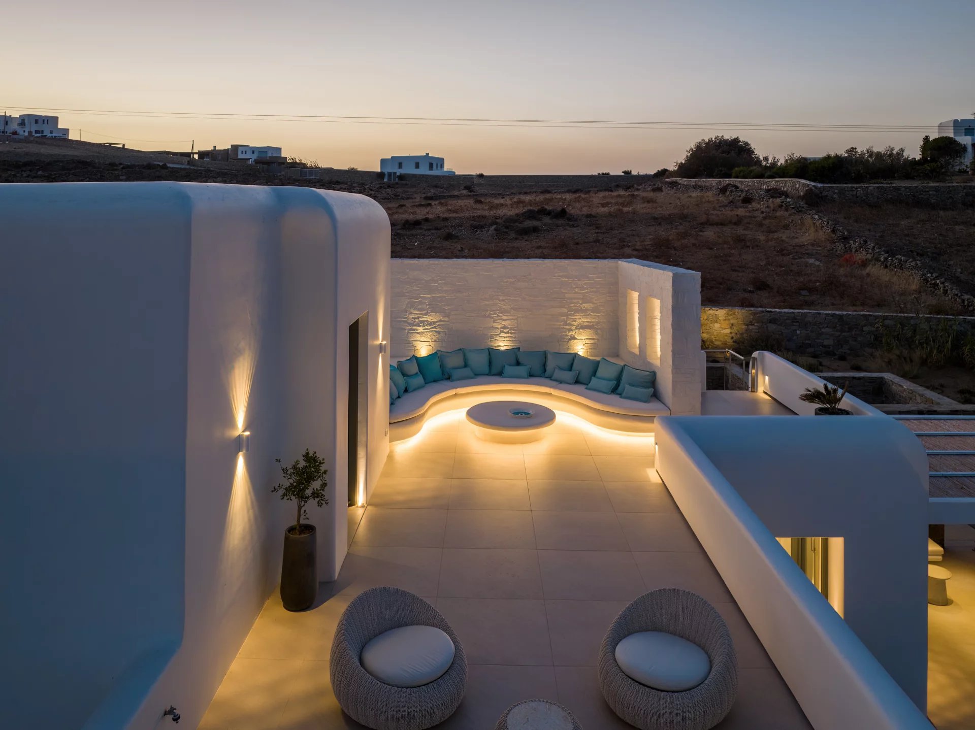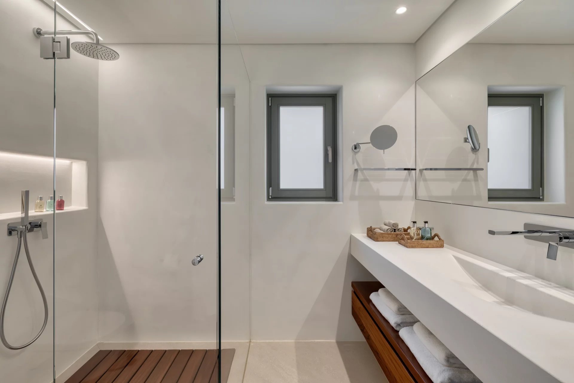 The upper level features a master bedroom with a king-size bed, A/C, a double shower, and sinks, along with access to a large private veranda and three balconies with stunning sea views. On the entrance level, you’ll find a fully equipped kitchen, open living spaces, and a dining area, along with a smart TV and A/C. This level also includes two double bedrooms, both with king-size beds, smart TVs, and en-suite bathrooms, offering access to outdoor lounges.