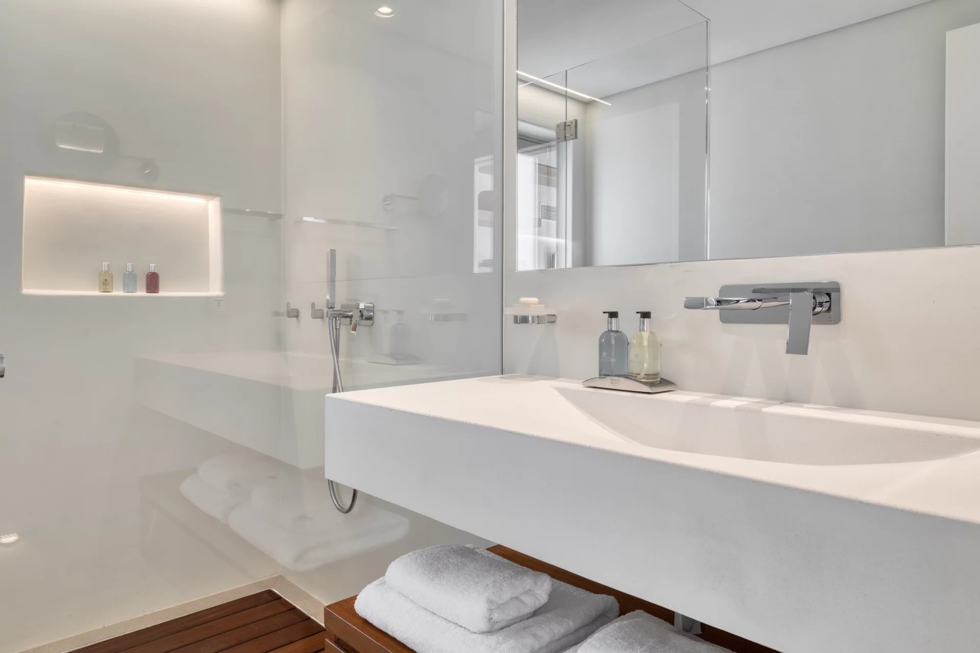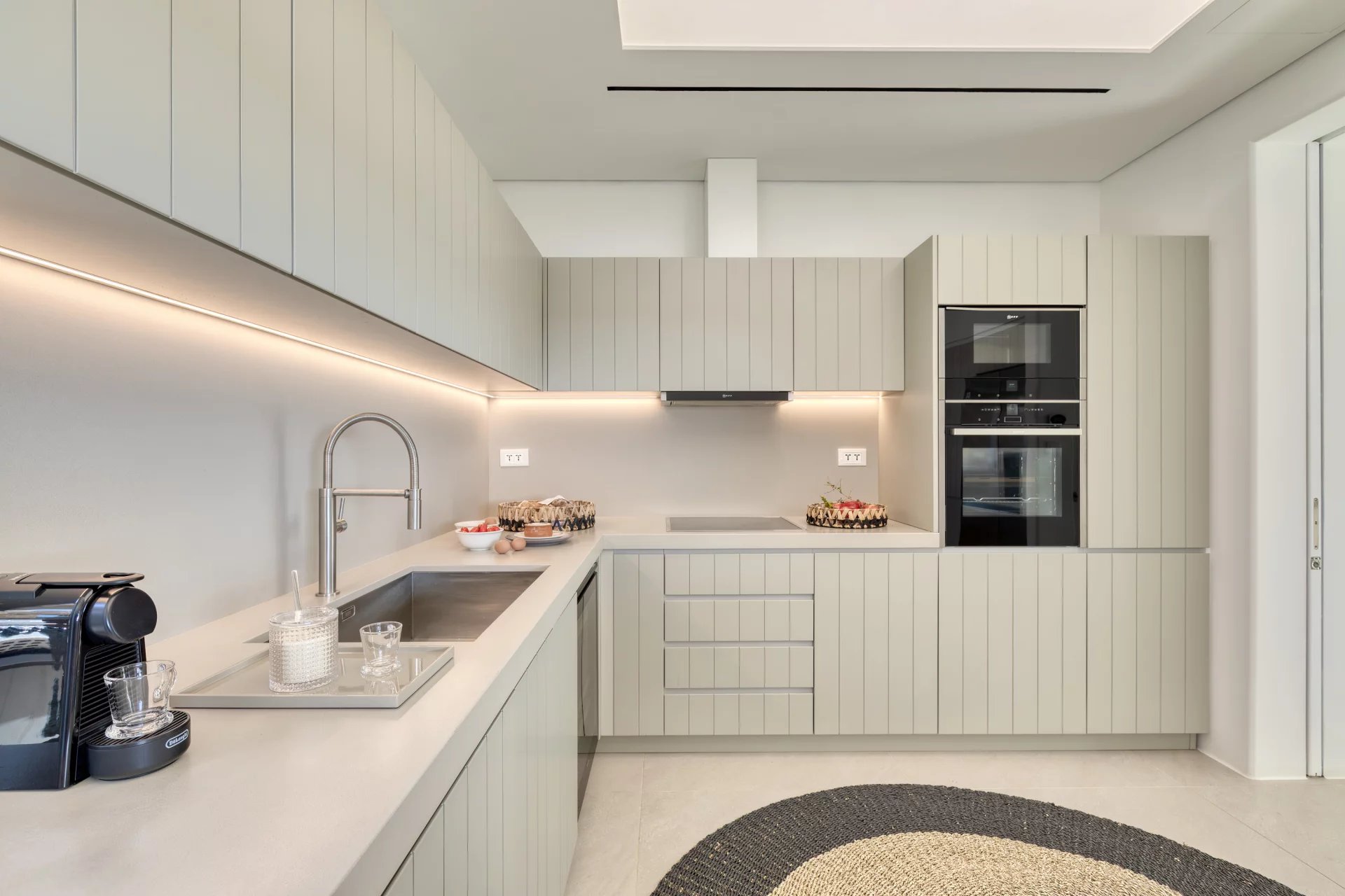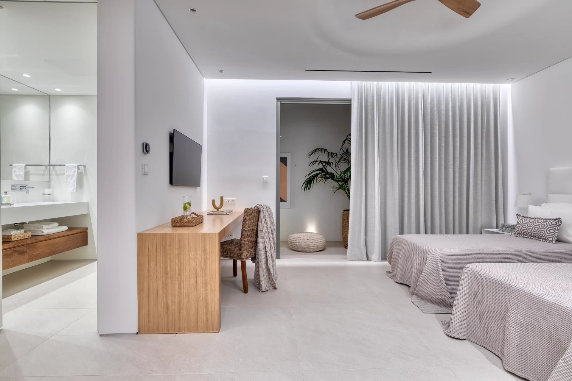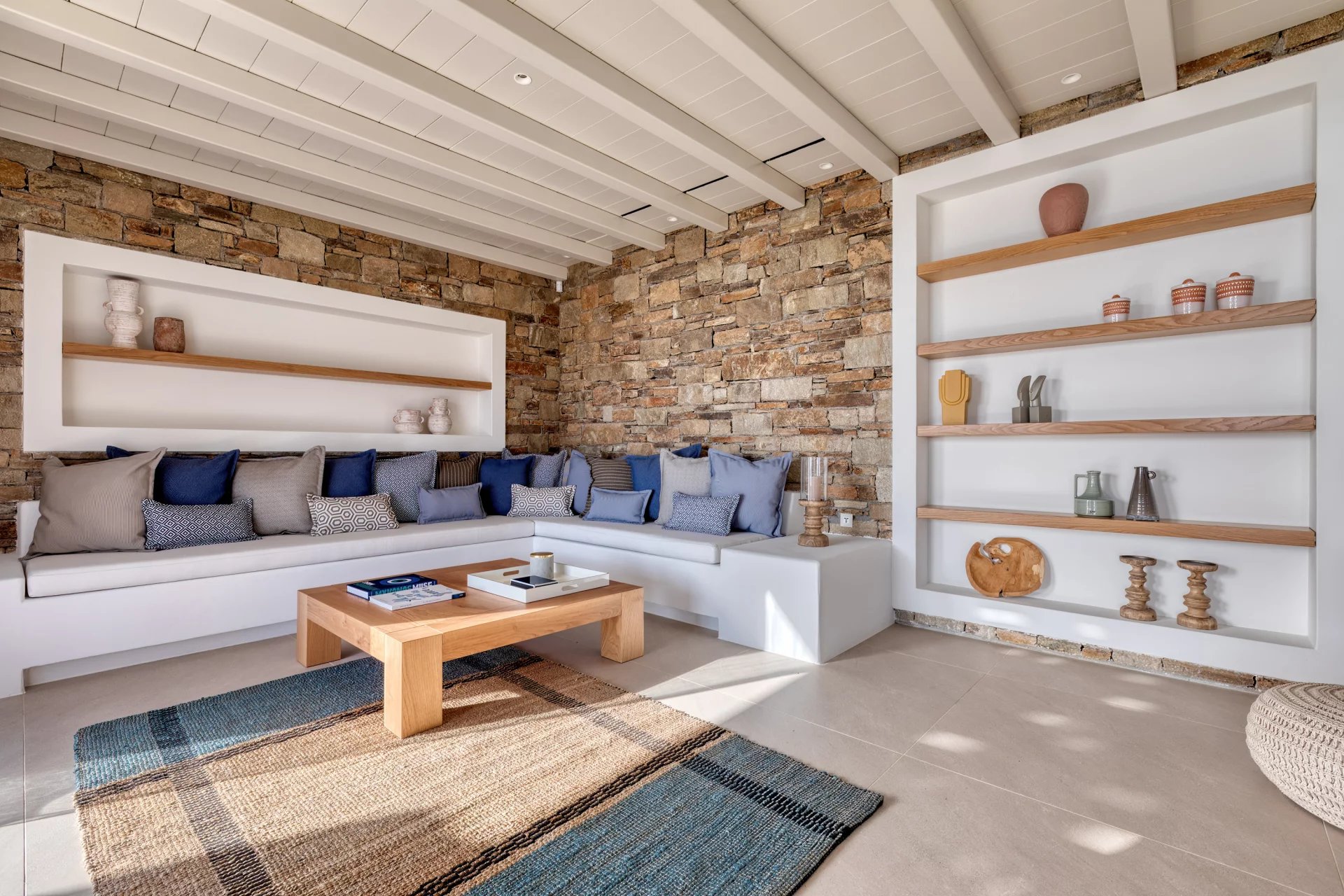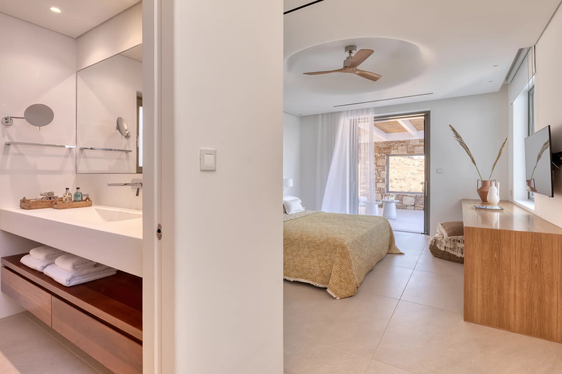 The upper level features a master bedroom with a king-size bed, A/C, a double shower, and sinks, along with access to a large private veranda and three balconies with stunning sea views. On the entrance level, you’ll find a fully equipped kitchen, open living spaces, and a dining area, along with a smart TV and A/C. This level also includes two double bedrooms, both with king-size beds, smart TVs, and en-suite bathrooms, offering access to outdoor lounges.