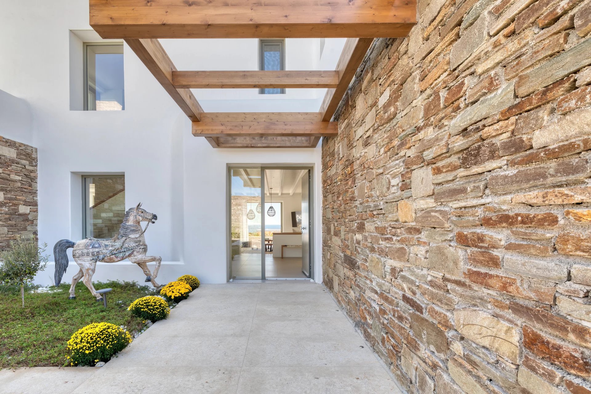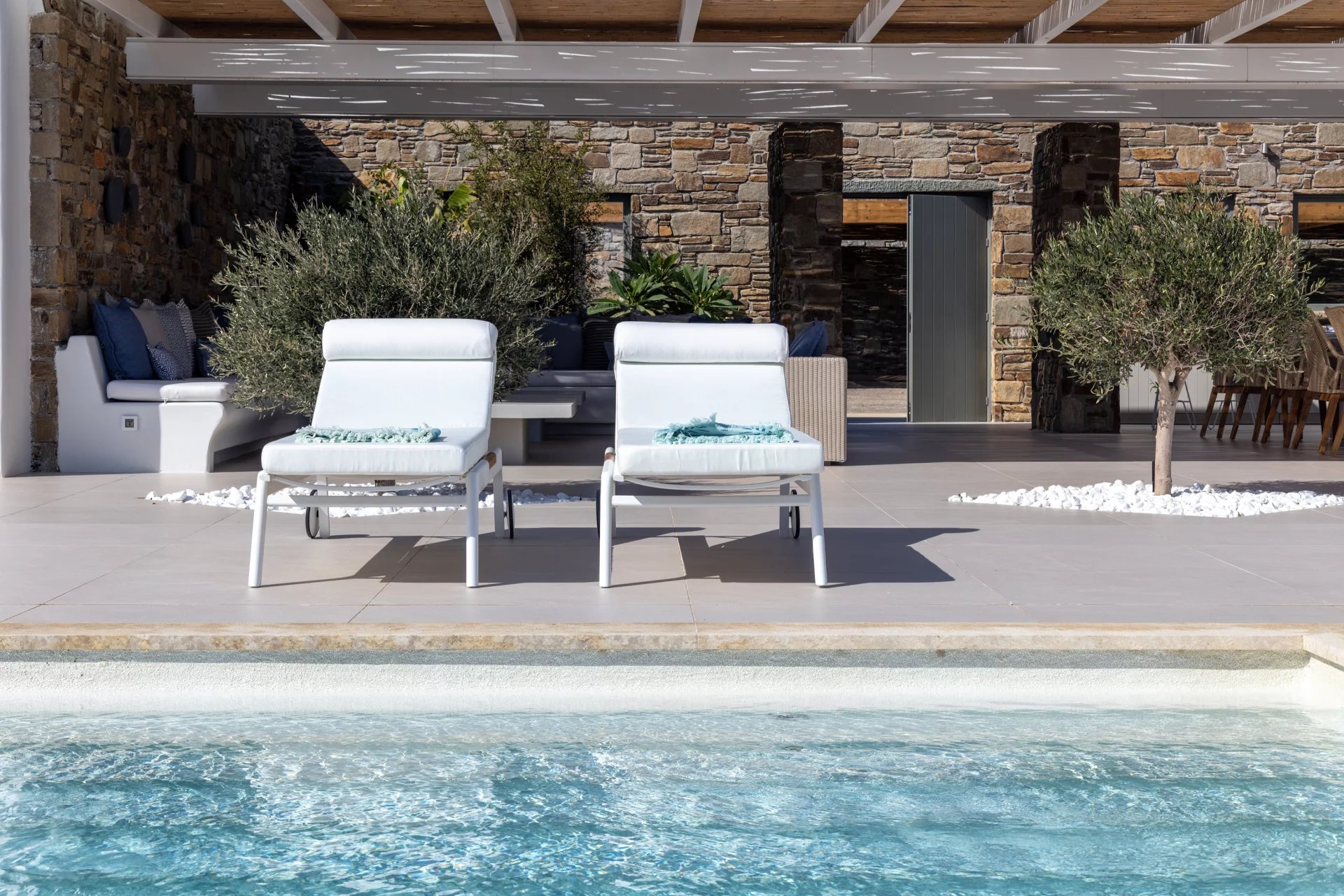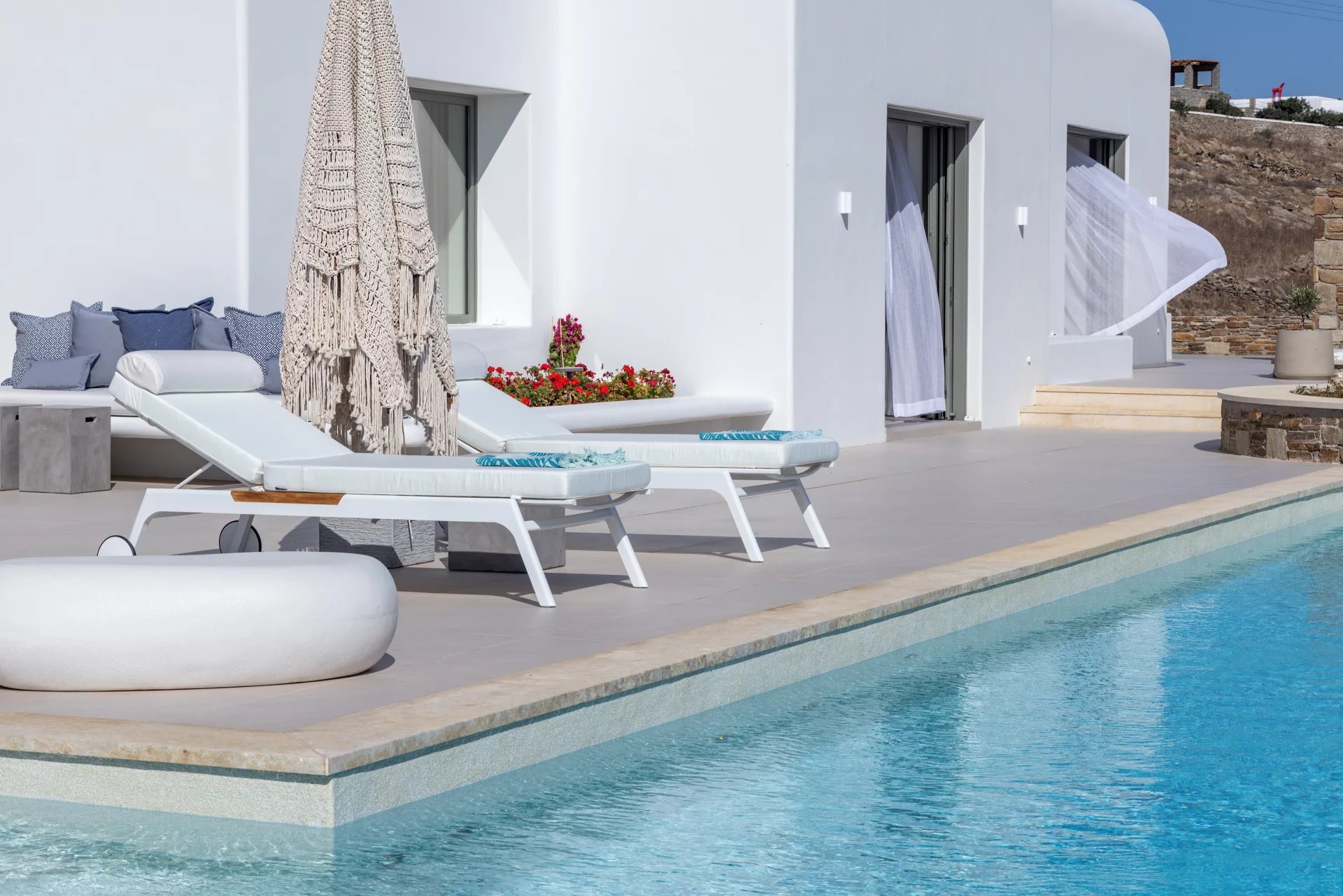Villa Amaryllis is a luxurious seaside retreat located in the Aleomandra region, within a gated community of six villas. This expansive property features eight master bedrooms and spans 1,000 square meters, just steps from Glyfadi Beach via a pedestrian-only seafront path. The villa includes a private road leading to a 40-meter sea platform, equipped with a shower, seating for three, a three-meter umbrella, and a specially designed ladder for easy access.
