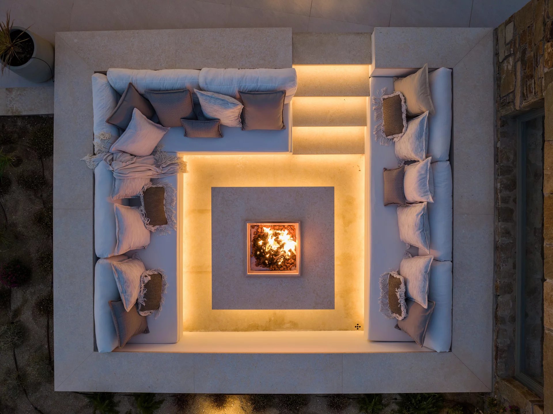 Outdoor amenities include a heated infinity pool, sun loungers, shaded lounges, an outdoor dining area under a pergola, a fire pit, an outdoor jacuzzi, and a floating sea deck. Additional charges apply for heated pool service.