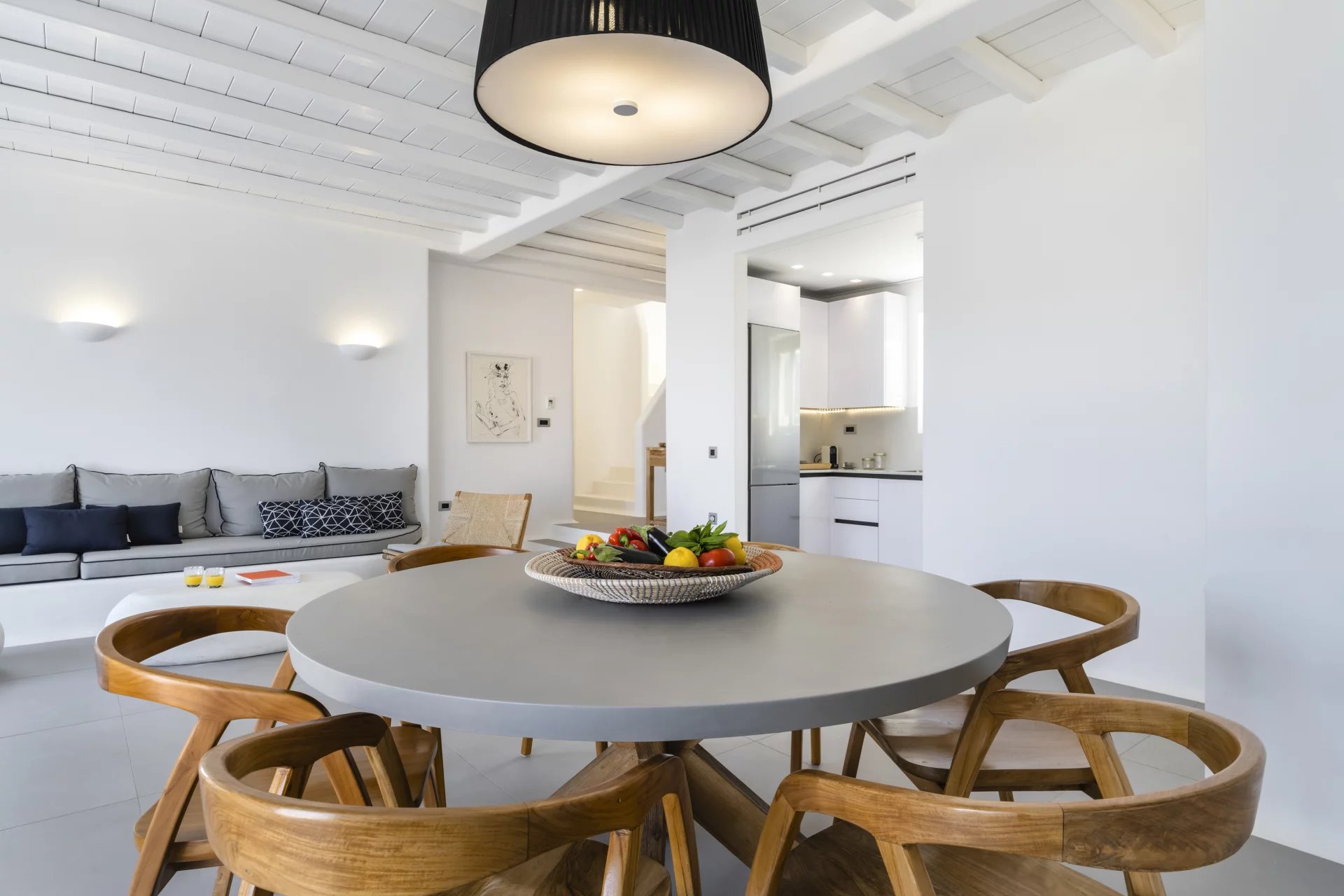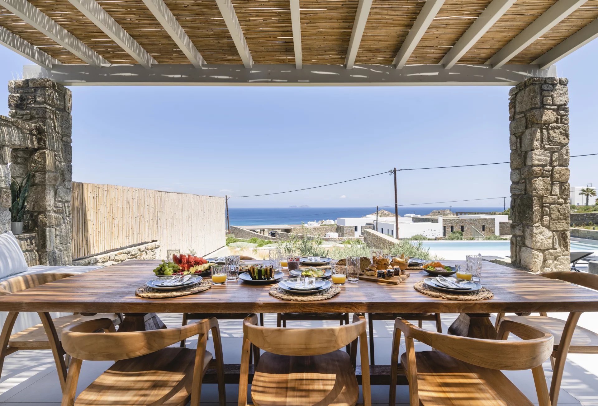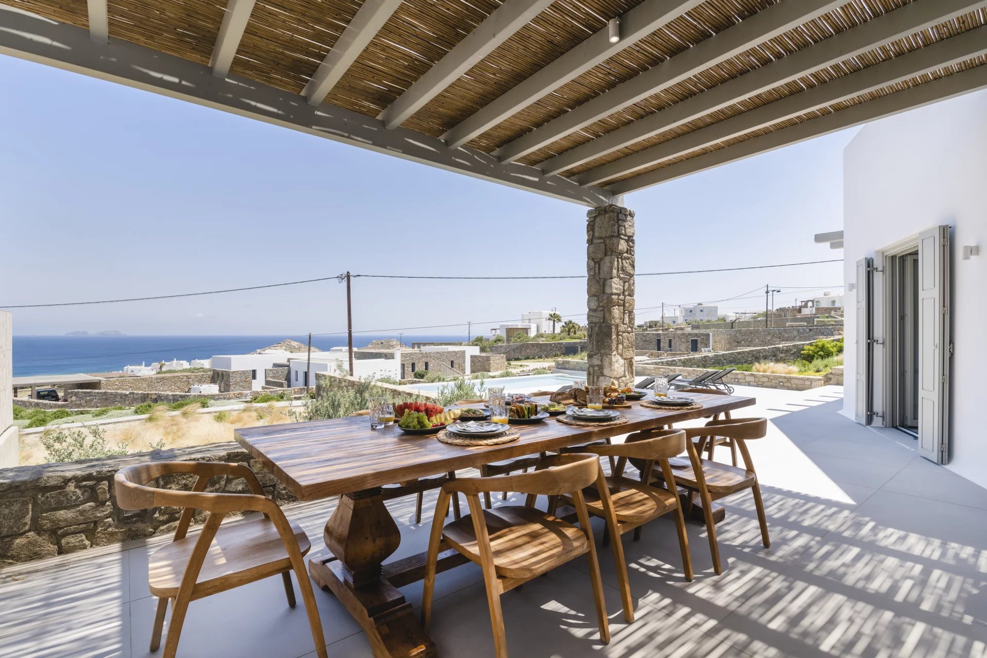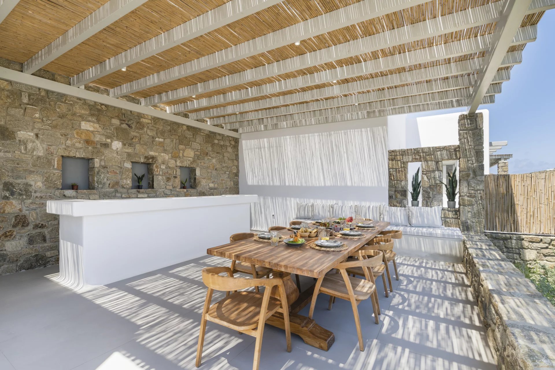 Outdoor amenities include a private swimming pool, sunbeds, outdoor showers, and a lovely lounge area complete with dining and bar spaces sheltered from the wind. Villa Astir is equipped with air conditioning, high-speed Wi-Fi, smart 4K HD TVs, security cameras, an alarm system, safe boxes, and private parking for up to four cars, ensuring a comfortable and secure stay.