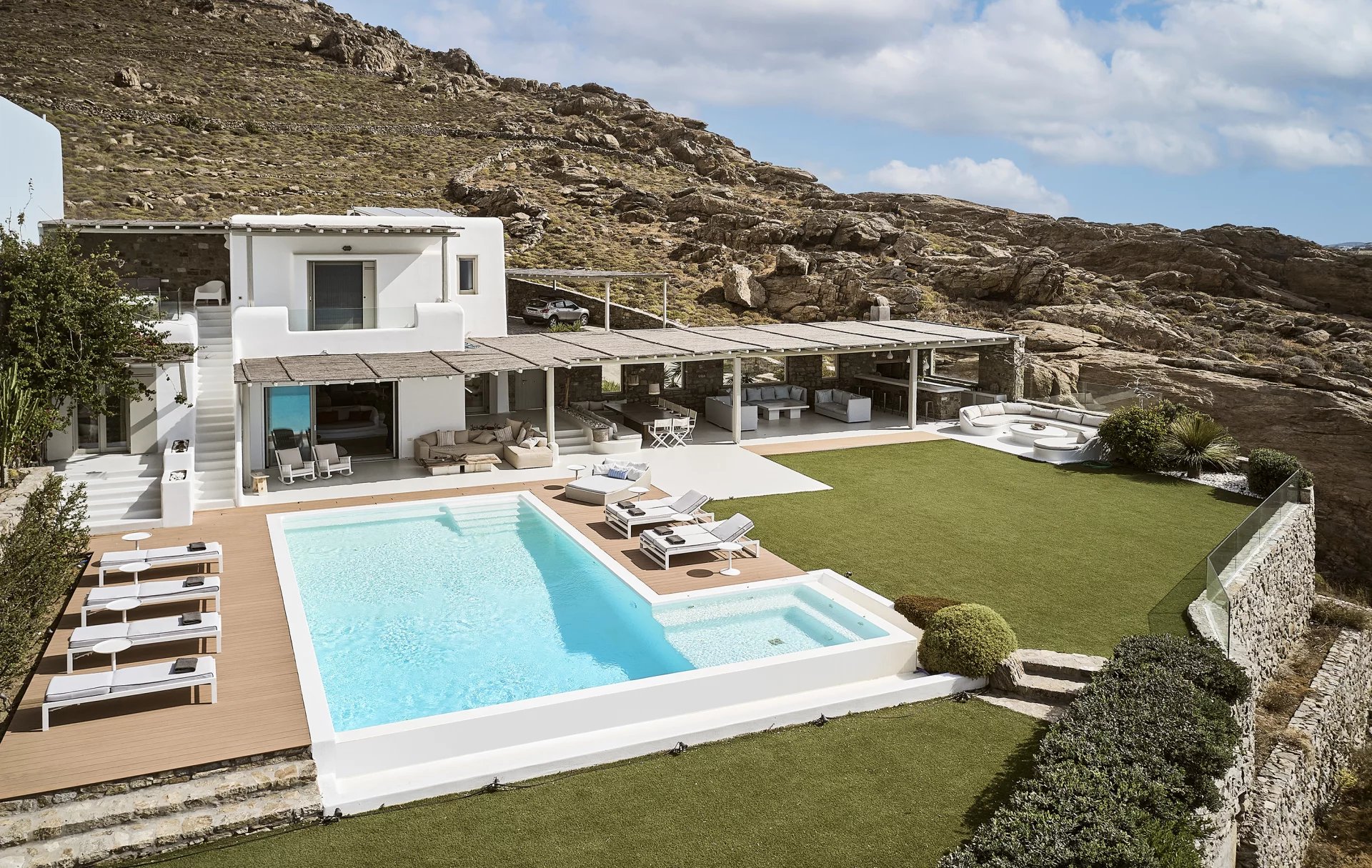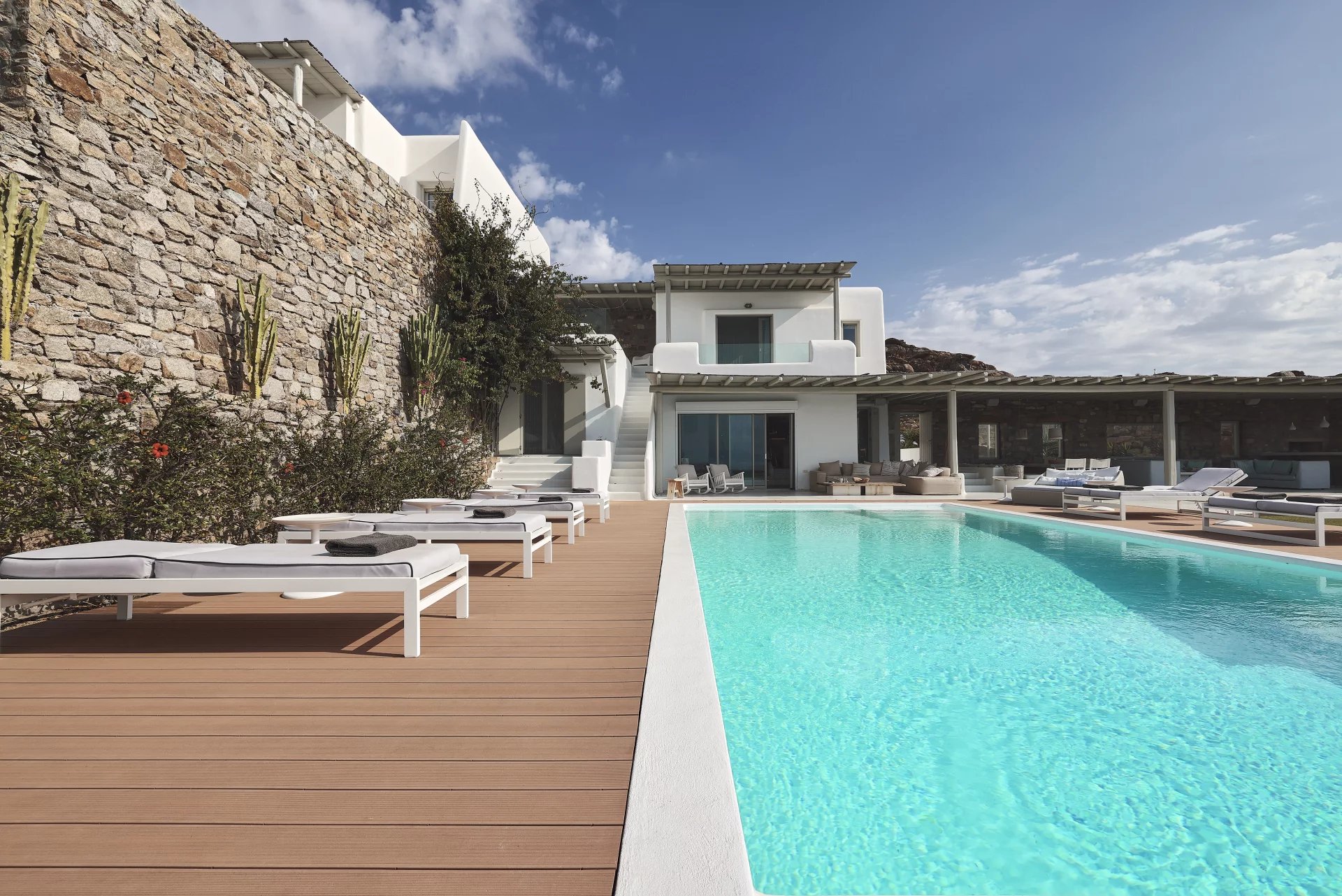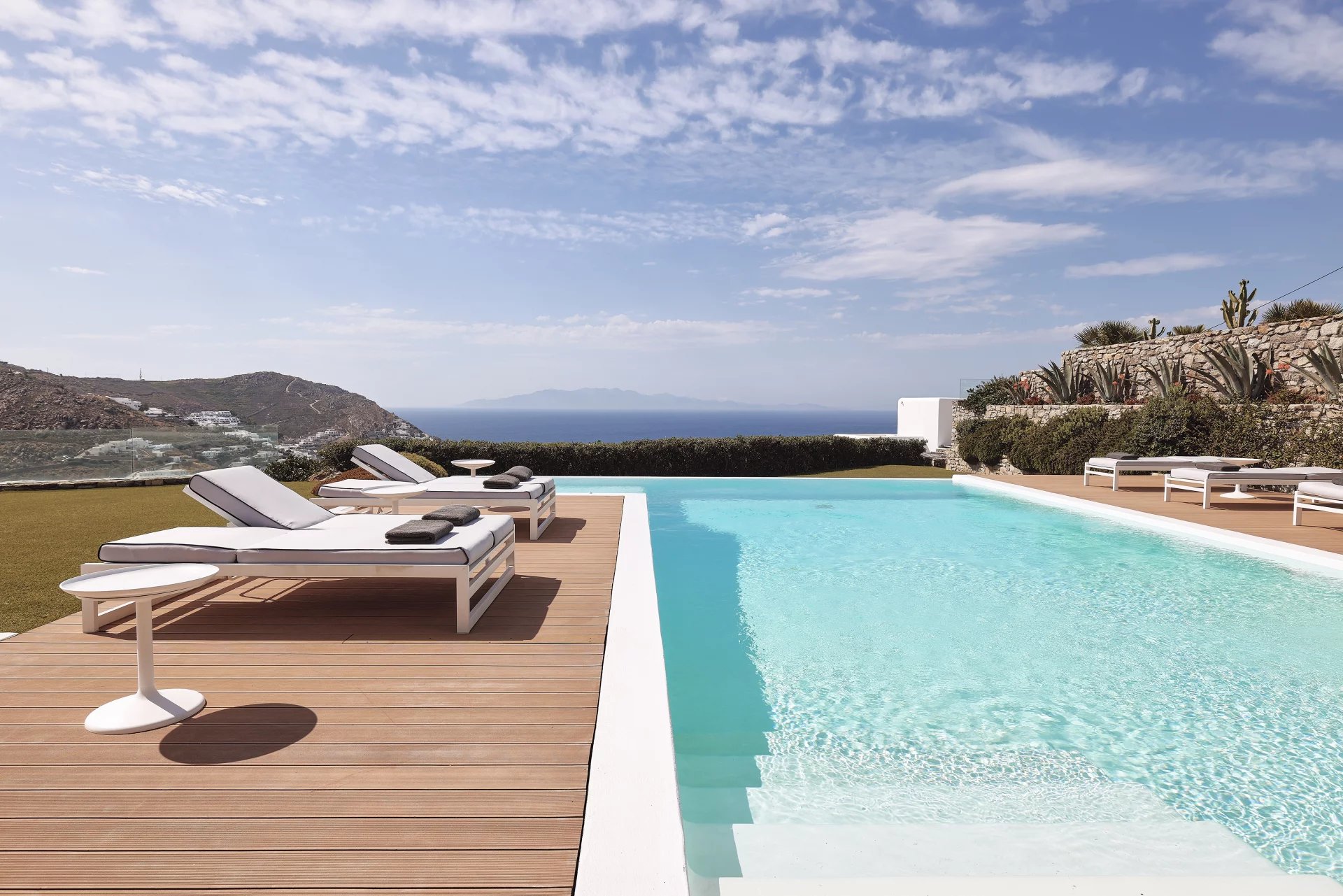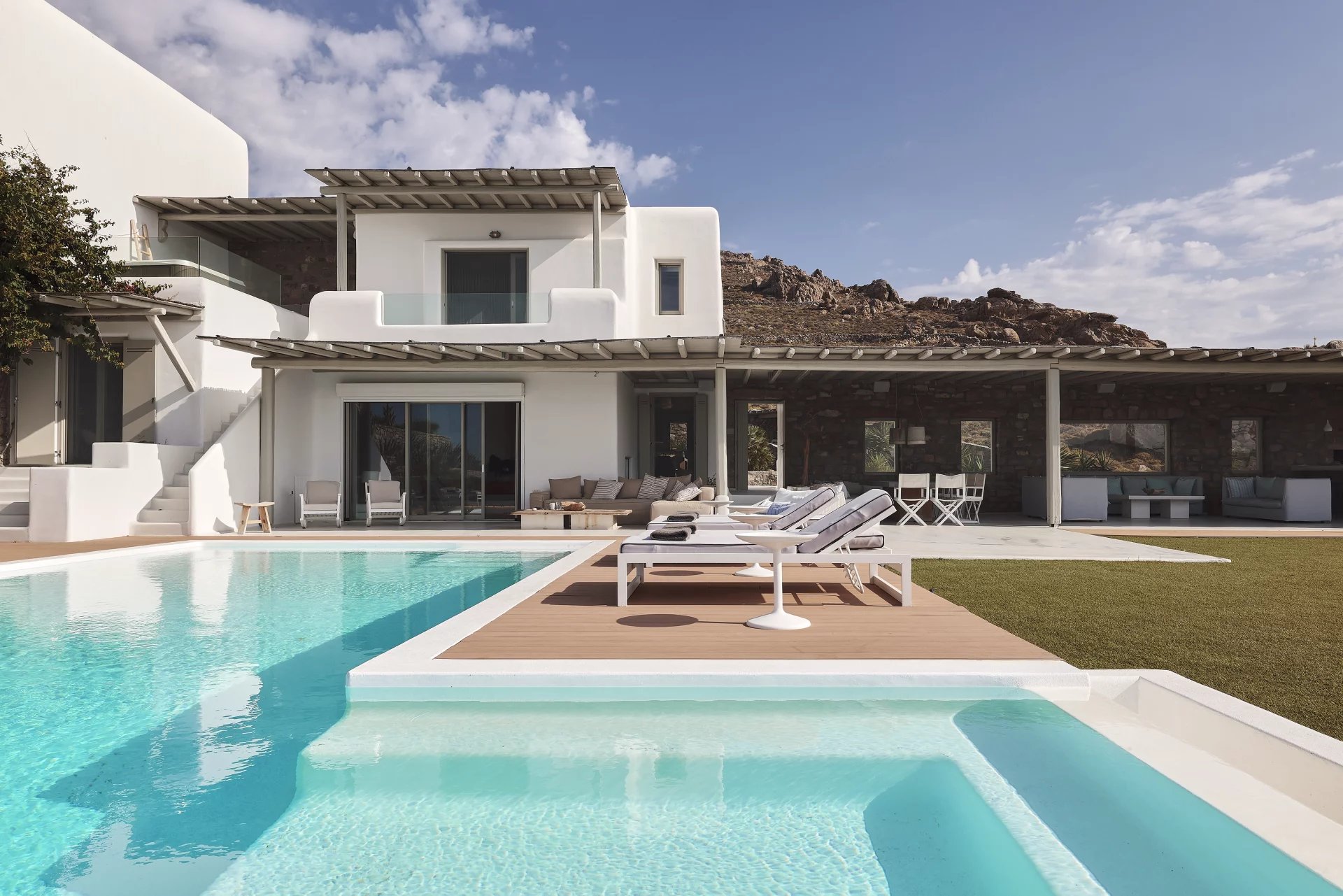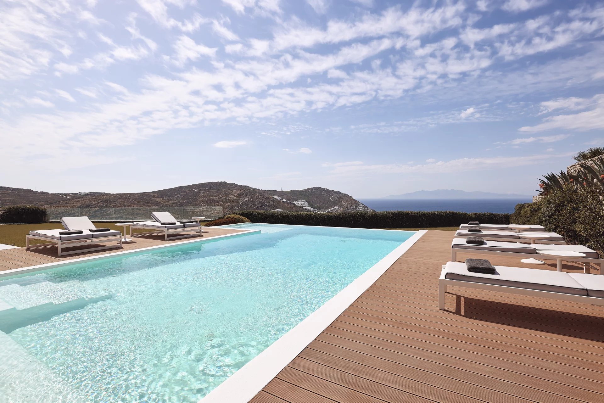 Villa Daedalus is perched on a hill with stunning views over Elia Beach, offering a spacious 6-bedroom retreat within a lush 2,000 sqm garden filled with flowers and plants. This property provides guests plenty of space to unwind, featuring an Infinity Pool, grassy areas, and several spots for lounging and dining outdoors, complete with a bar and BBQ.