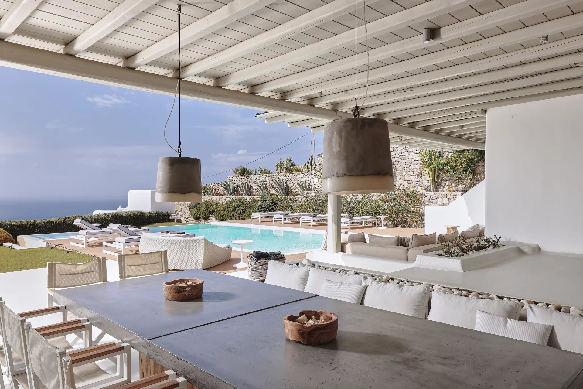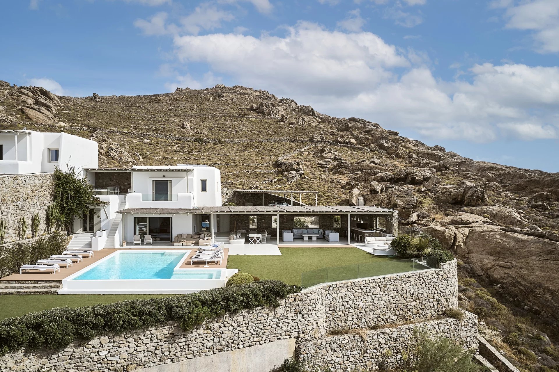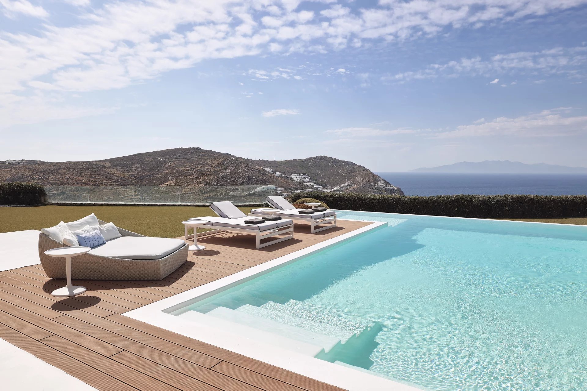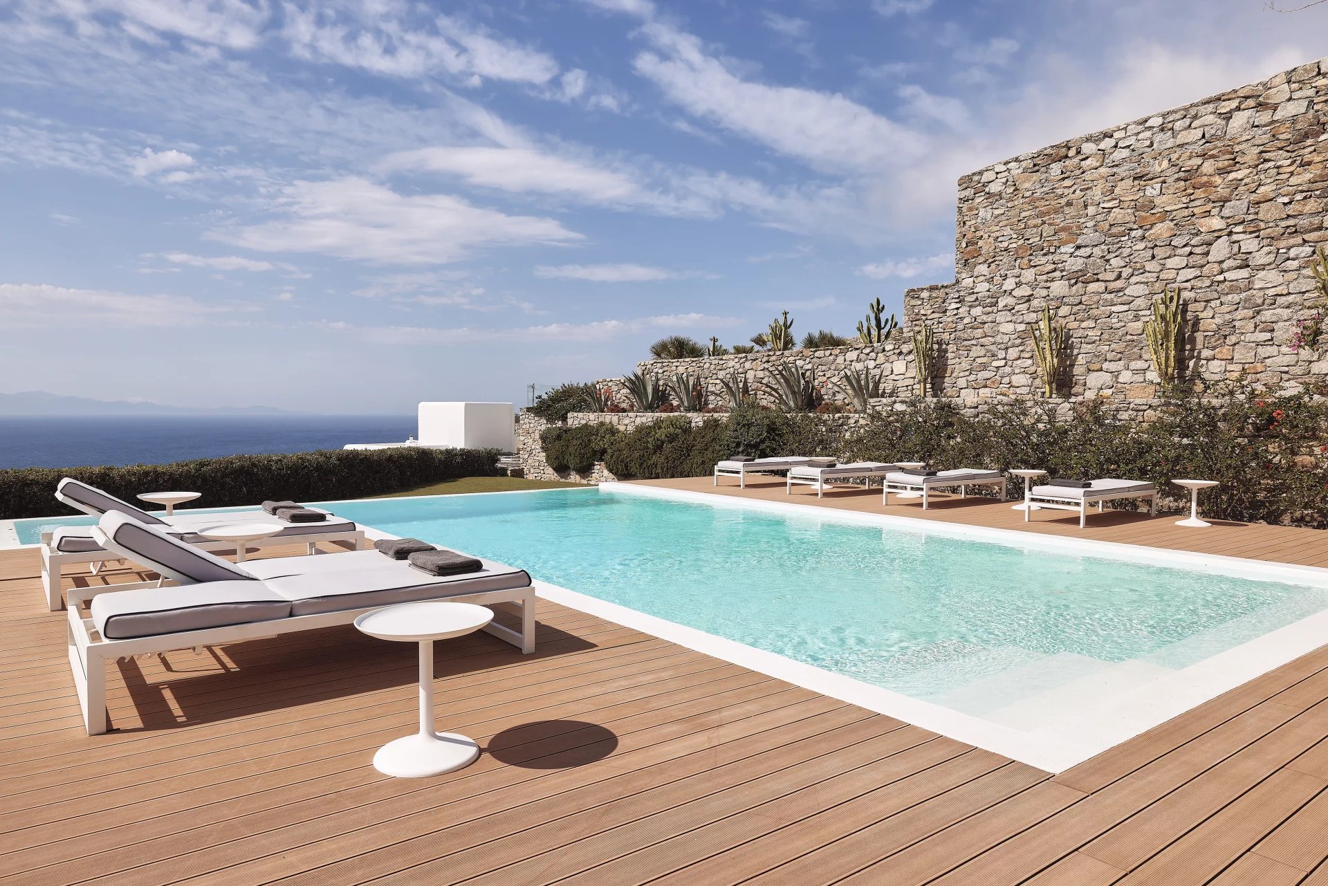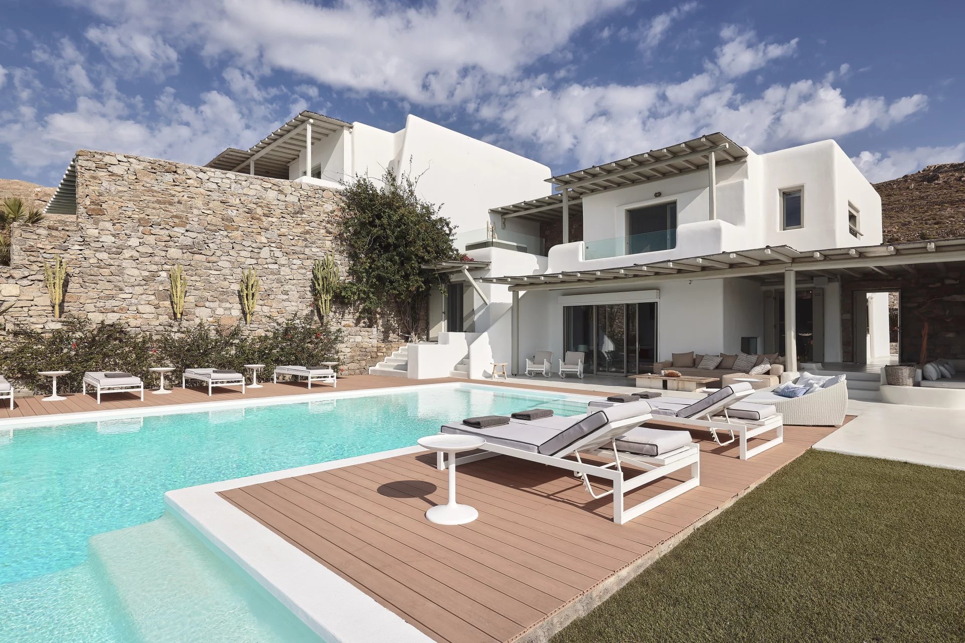 Villa Daedalus is perched on a hill with stunning views over Elia Beach, offering a spacious 6-bedroom retreat within a lush 2,000 sqm garden filled with flowers and plants. This property provides guests plenty of space to unwind, featuring an Infinity Pool, grassy areas, and several spots for lounging and dining outdoors, complete with a bar and BBQ.