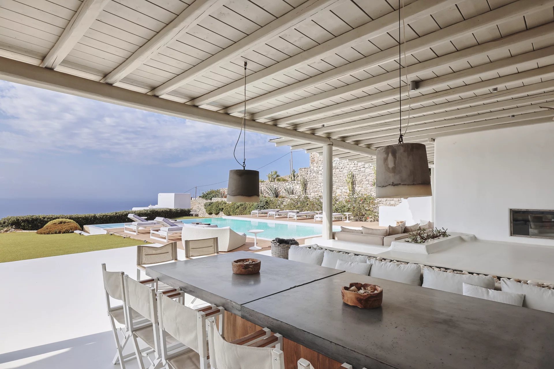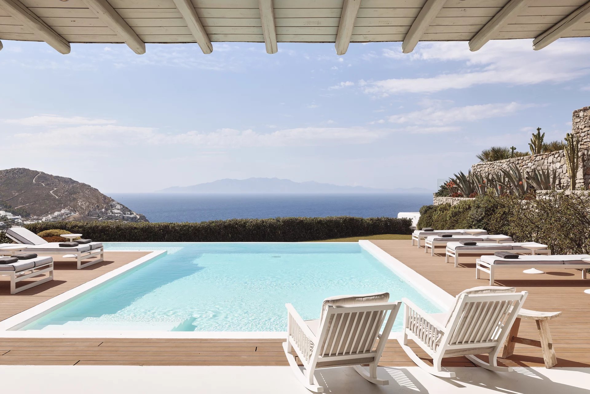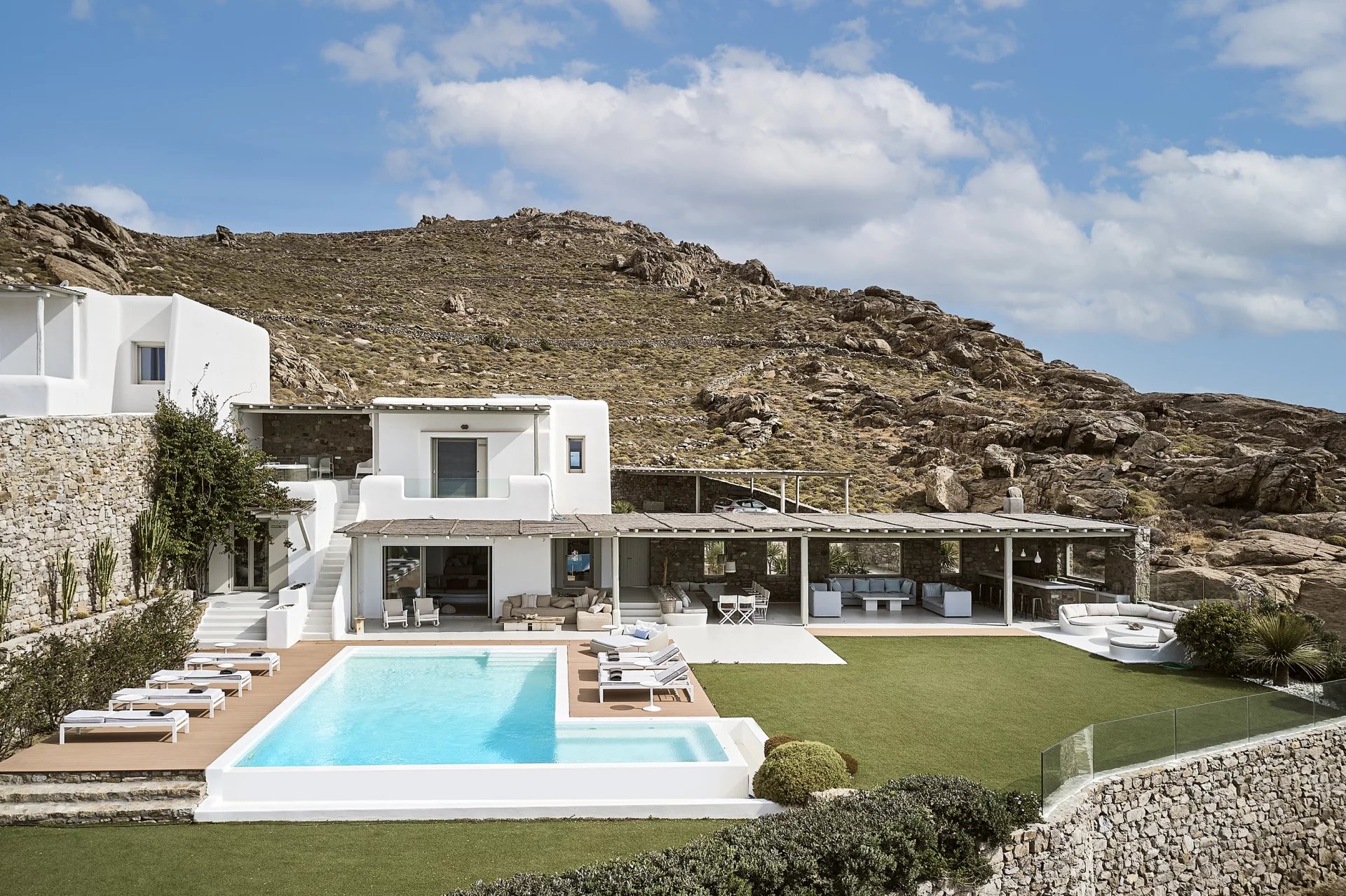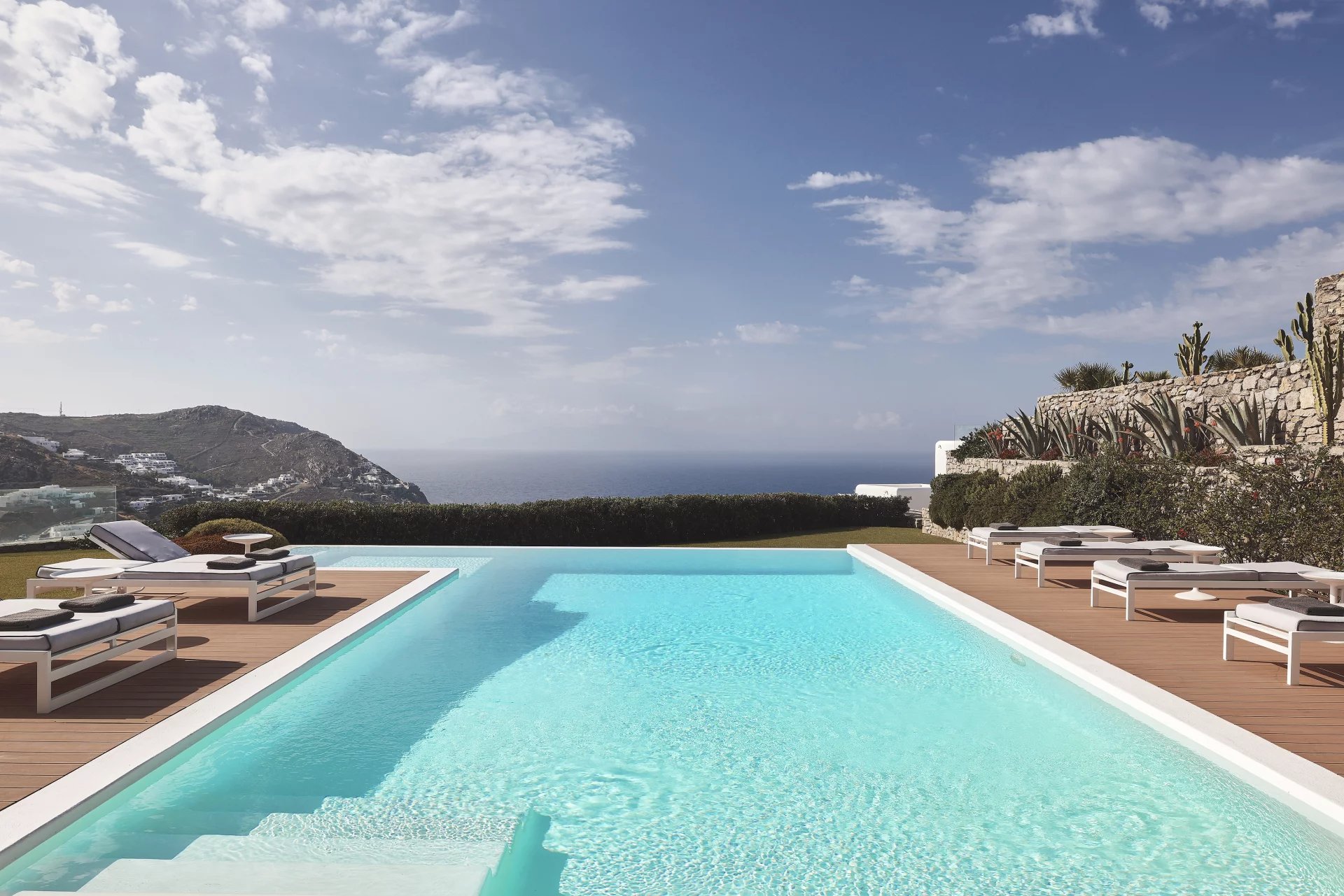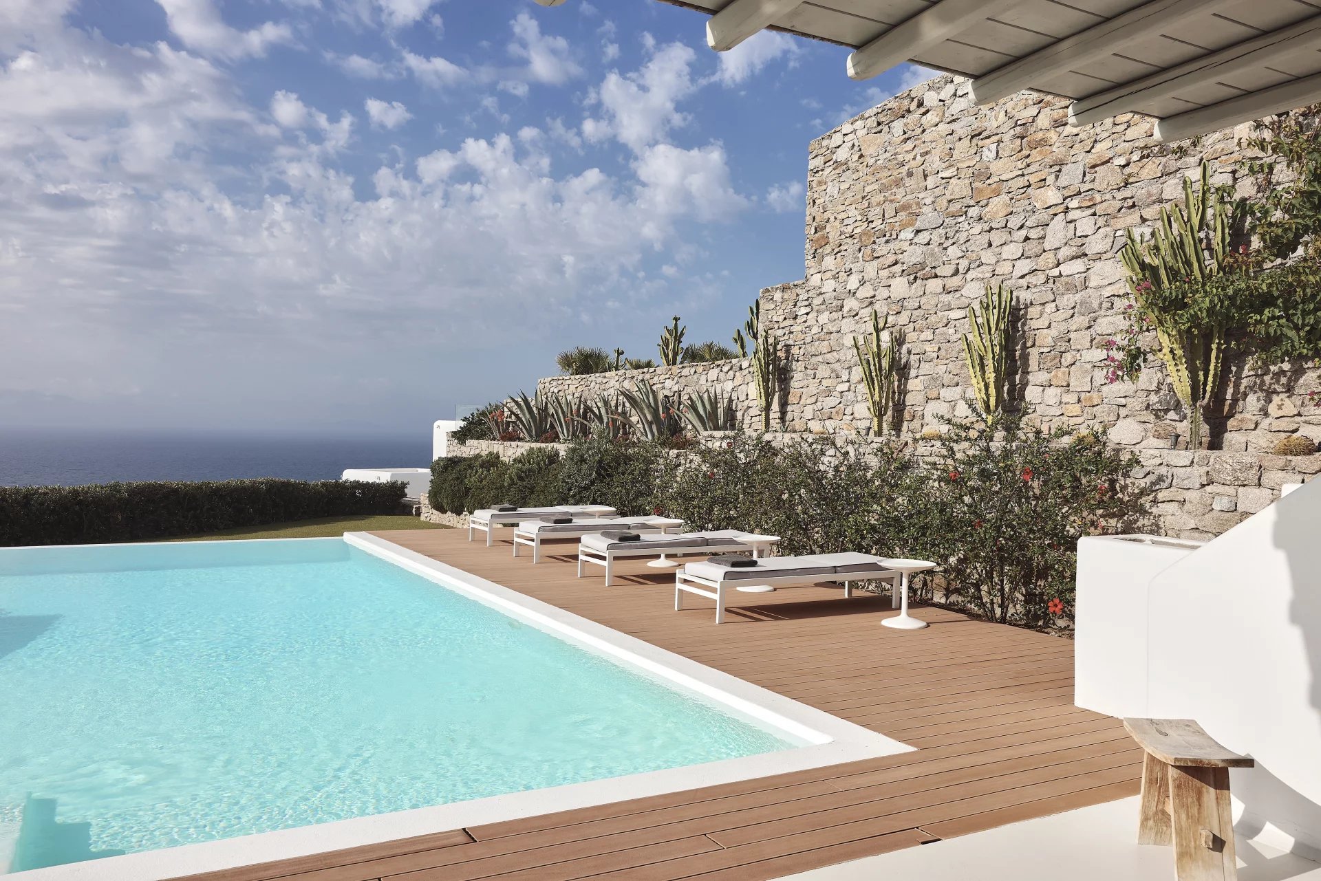 Villa Daedalus is perched on a hill with stunning views over Elia Beach, offering a spacious 6-bedroom retreat within a lush 2,000 sqm garden filled with flowers and plants. This property provides guests plenty of space to unwind, featuring an Infinity Pool, grassy areas, and several spots for lounging and dining outdoors, complete with a bar and BBQ.