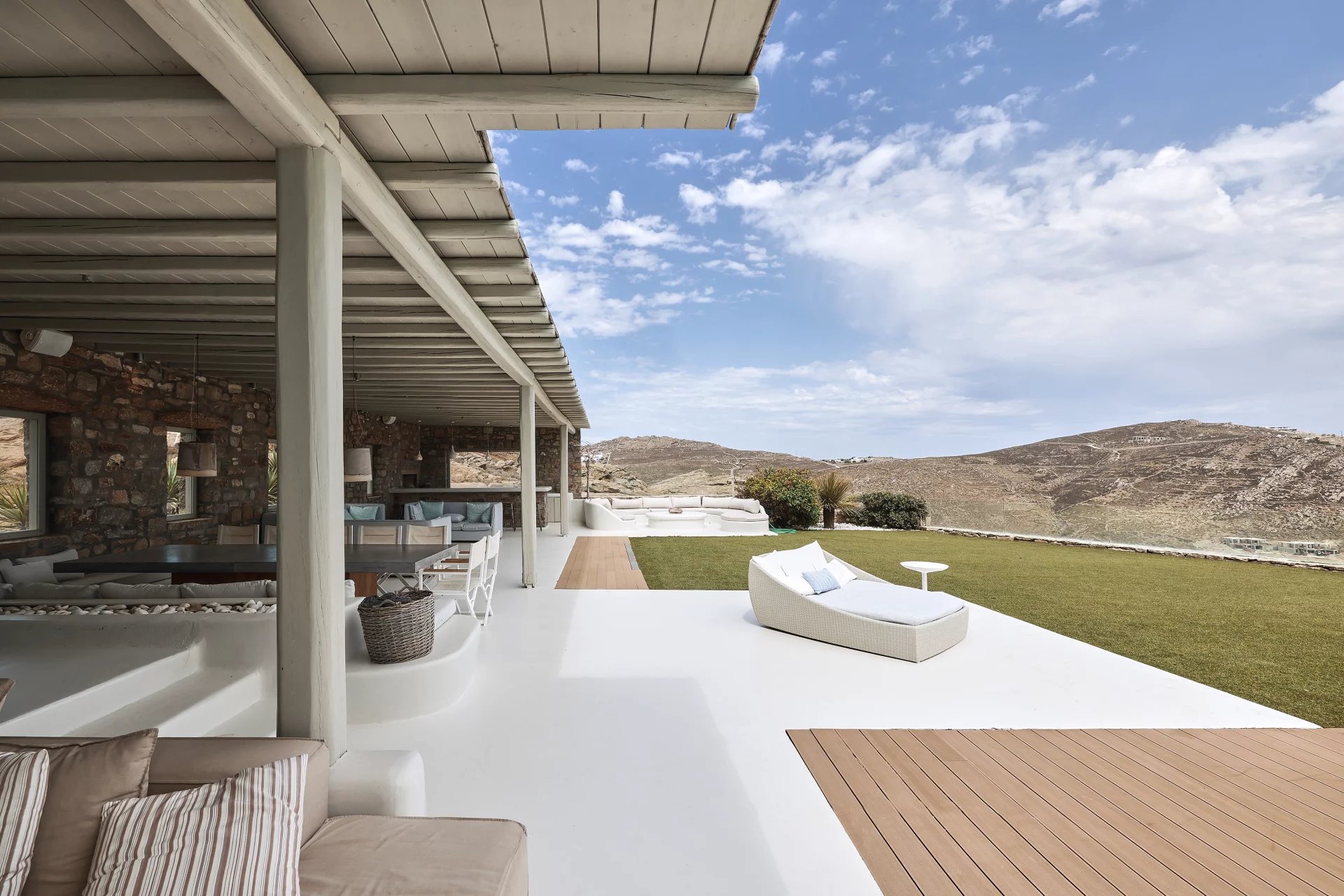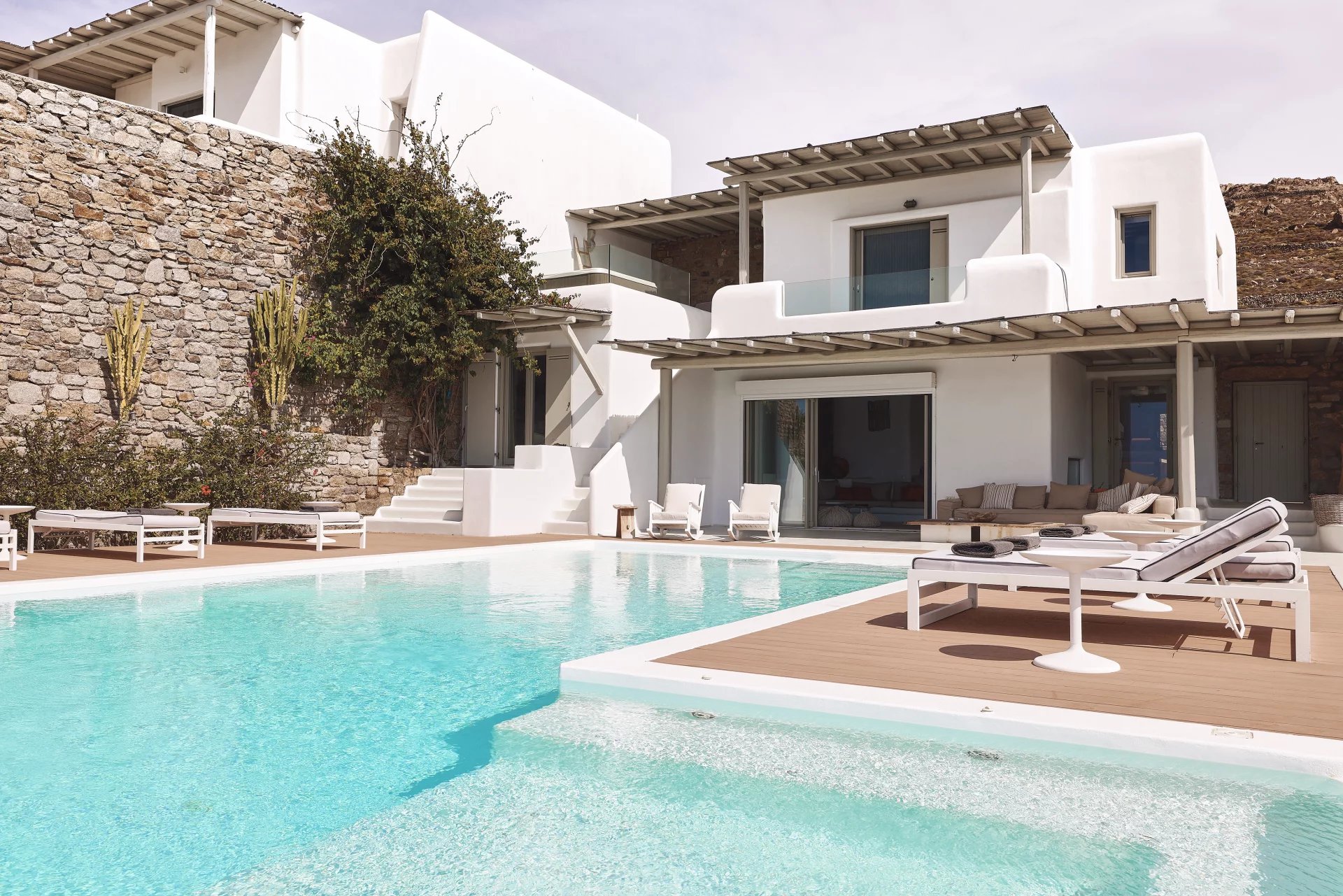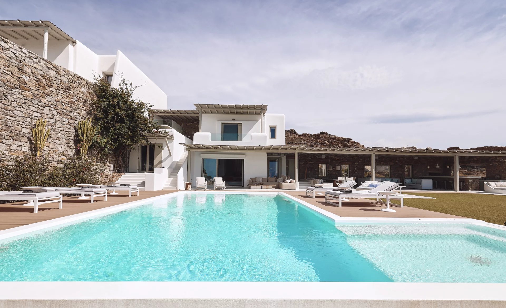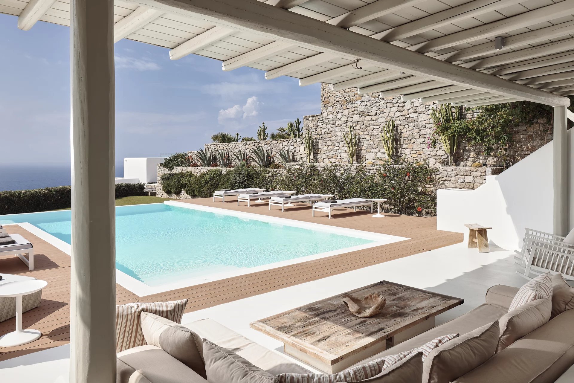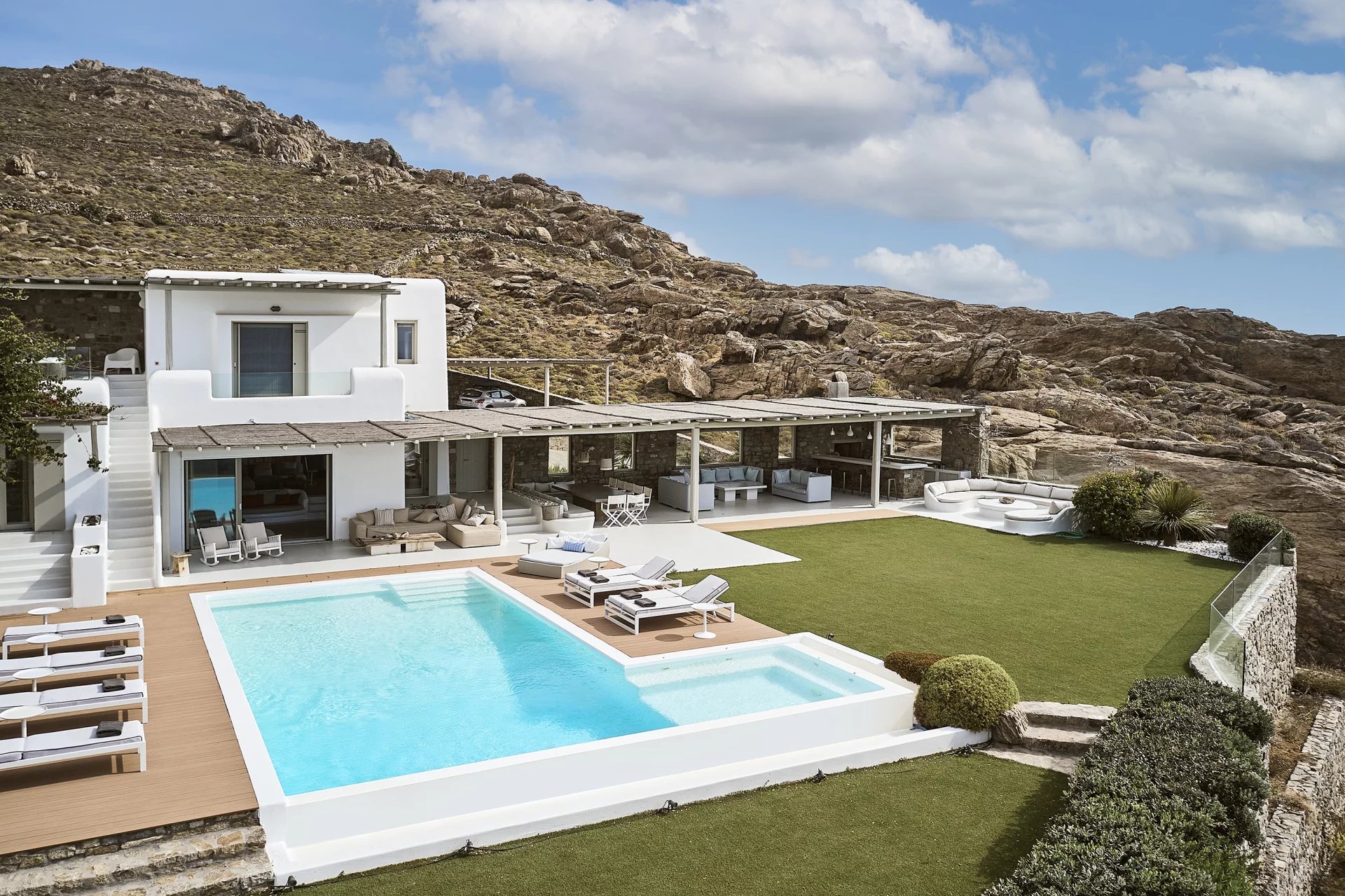 Villa Daedalus is perched on a hill with stunning views over Elia Beach, offering a spacious 6-bedroom retreat within a lush 2,000 sqm garden filled with flowers and plants. This property provides guests plenty of space to unwind, featuring an Infinity Pool, grassy areas, and several spots for lounging and dining outdoors, complete with a bar and BBQ.