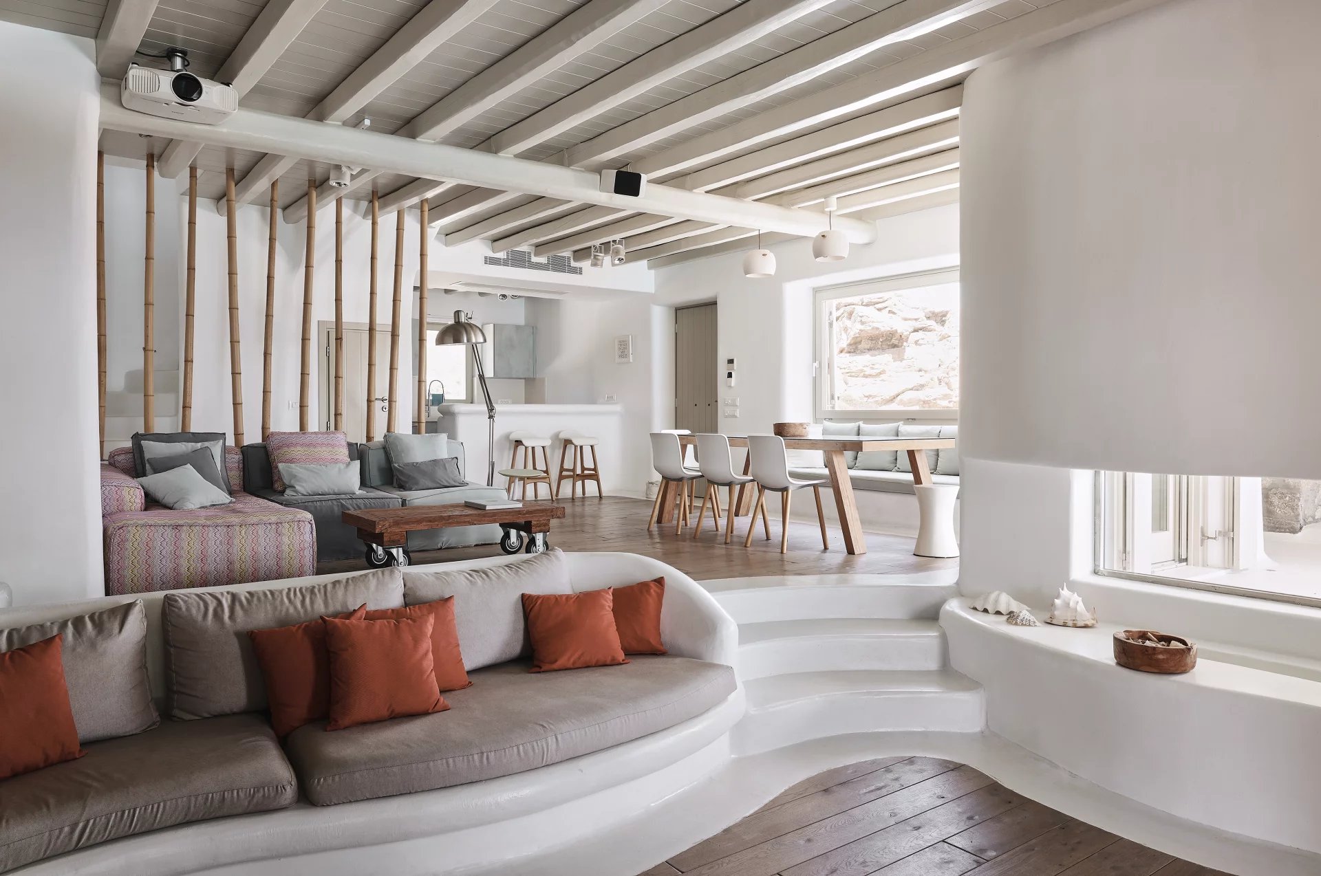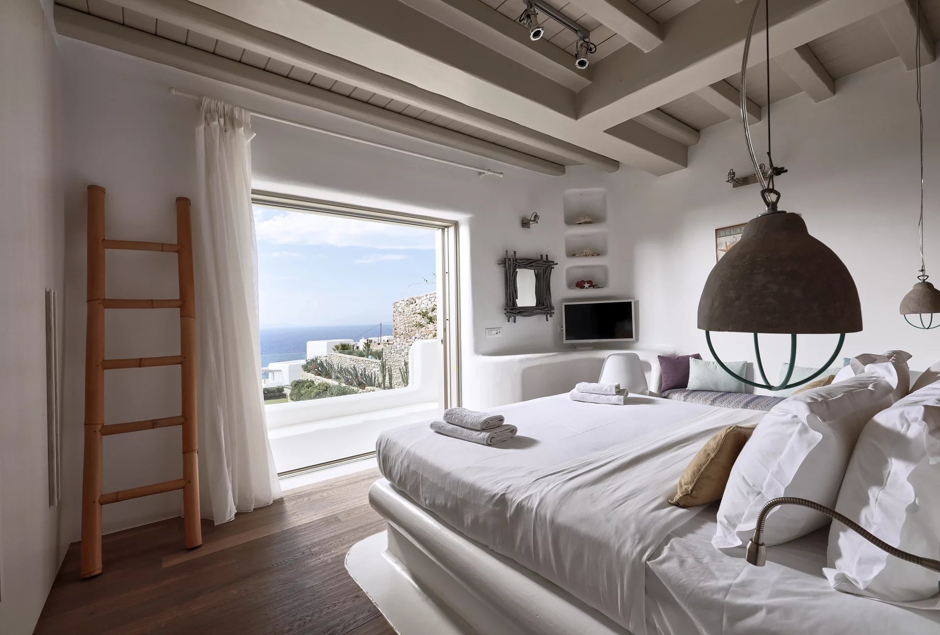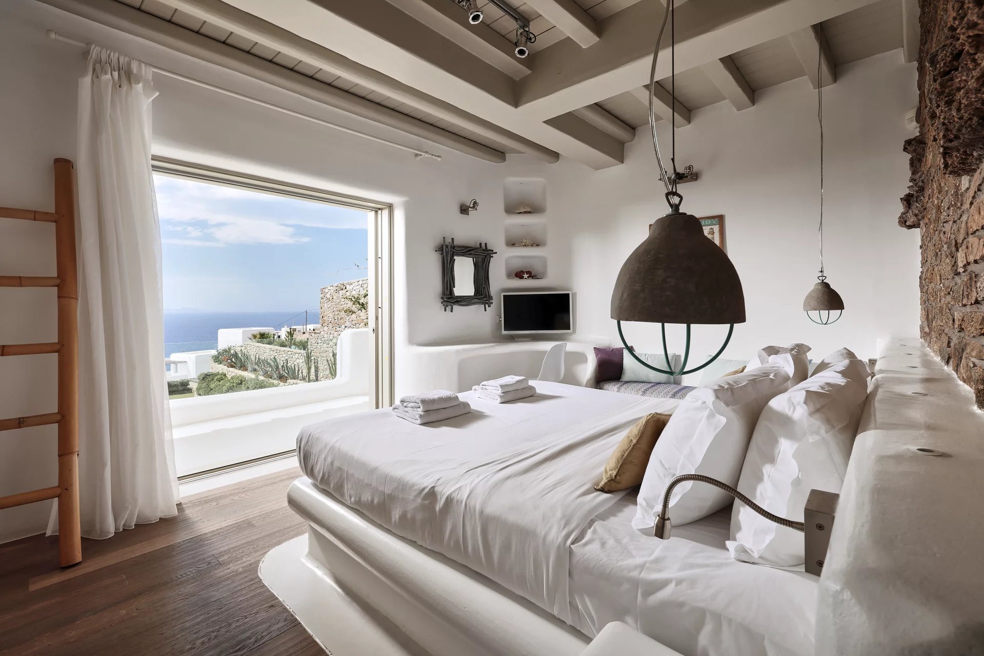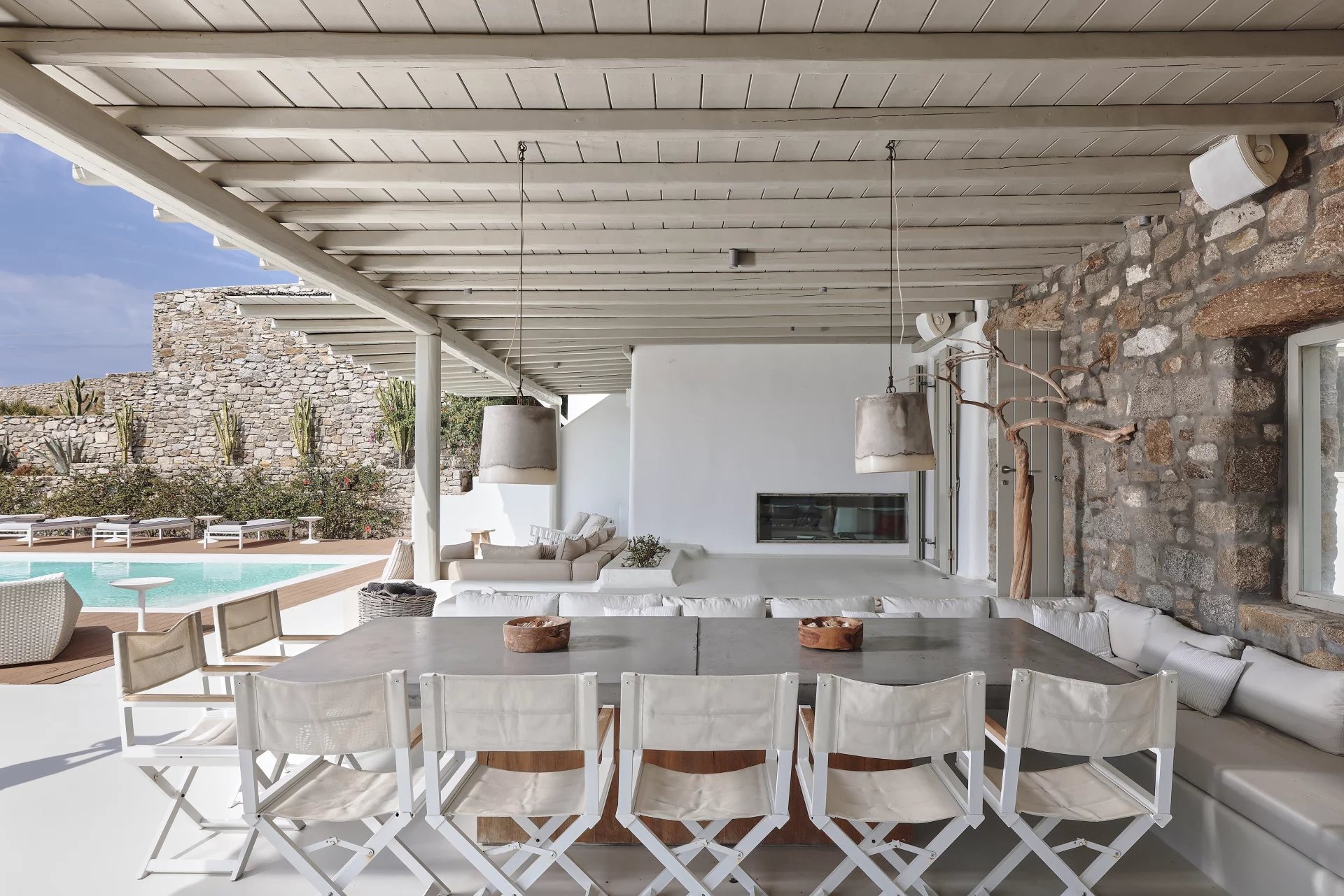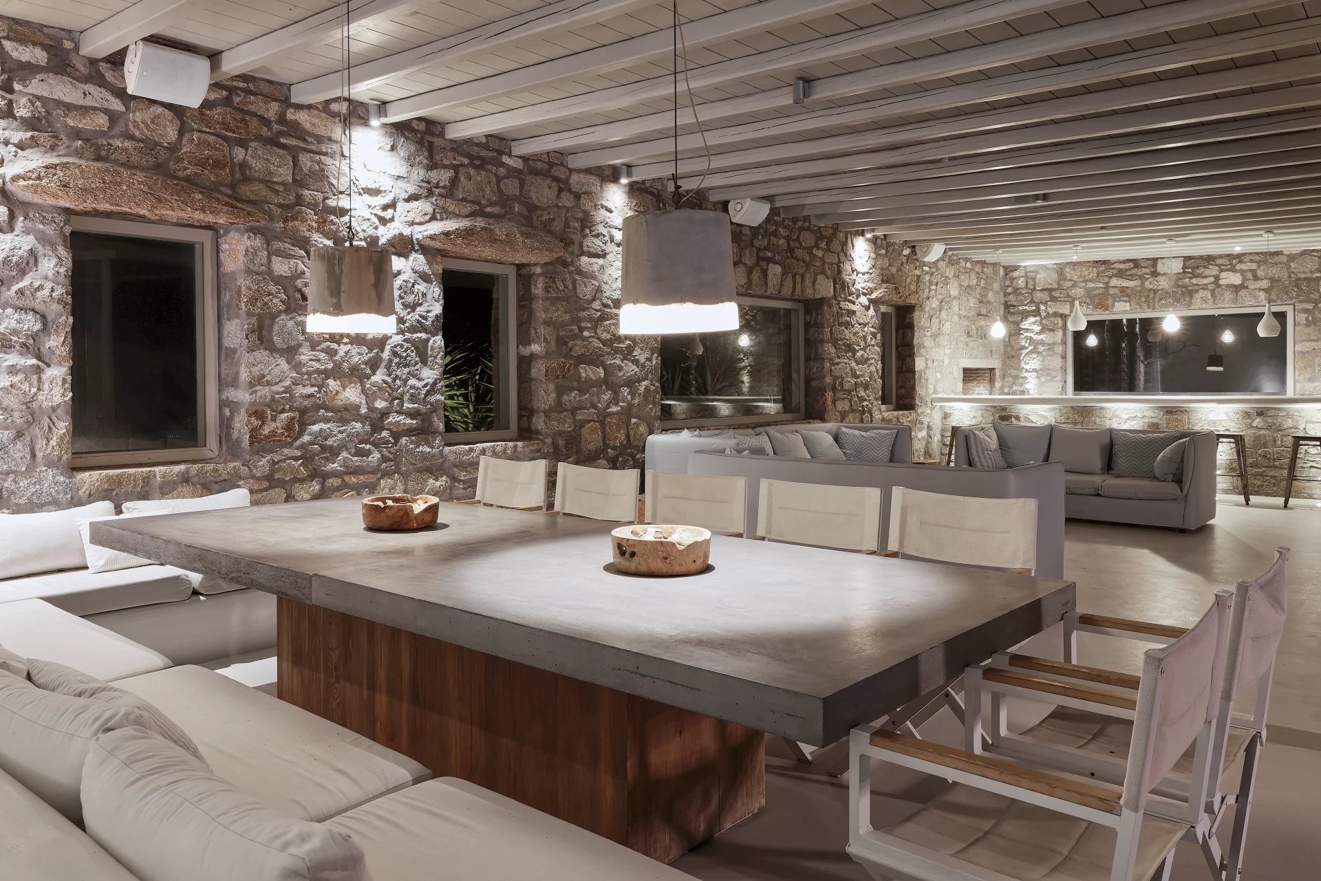 Villa Daedalus is perched on a hill with stunning views over Elia Beach, offering a spacious 6-bedroom retreat within a lush 2,000 sqm garden filled with flowers and plants. This property provides guests plenty of space to unwind, featuring an Infinity Pool, grassy areas, and several spots for lounging and dining outdoors, complete with a bar and BBQ.