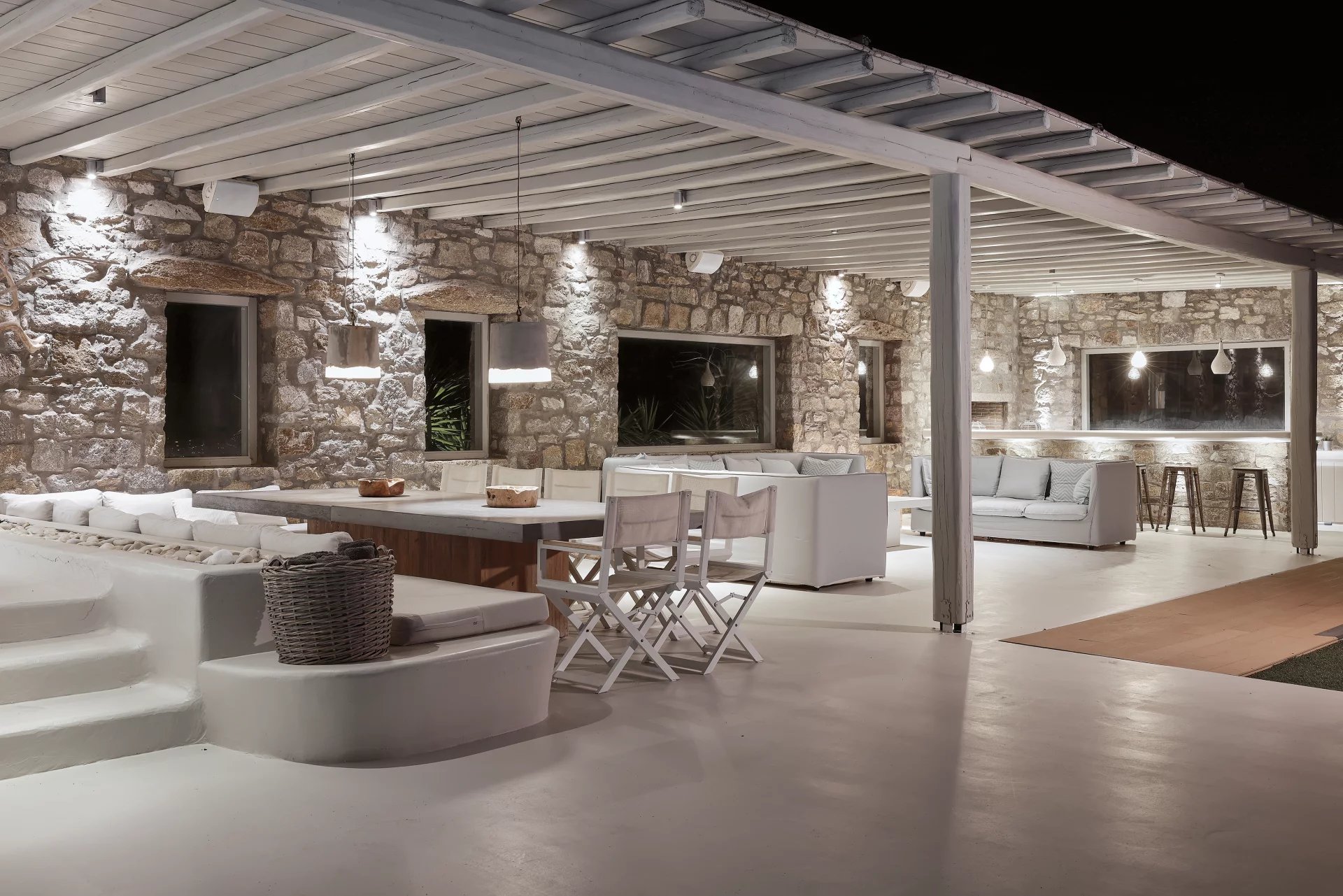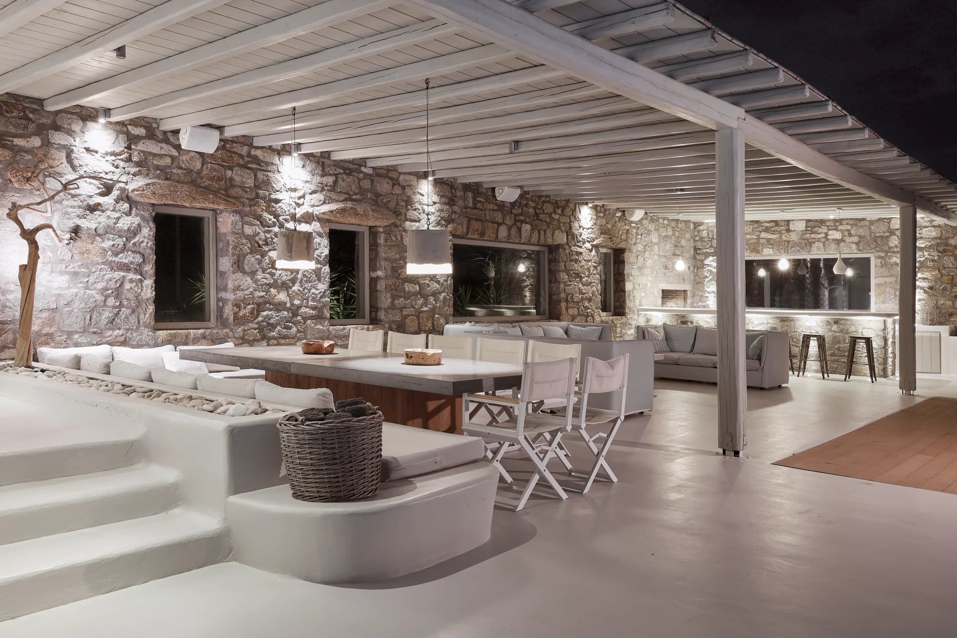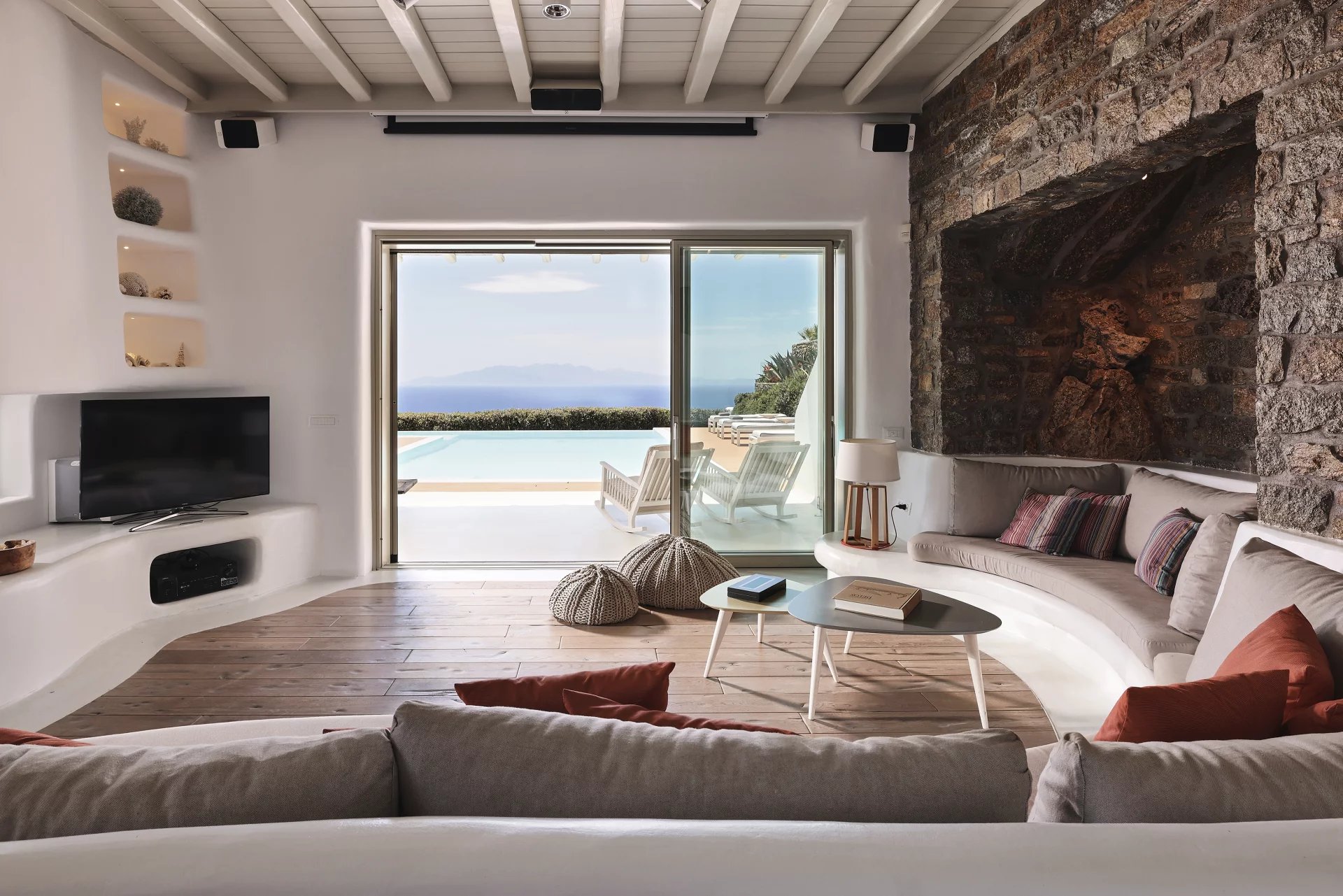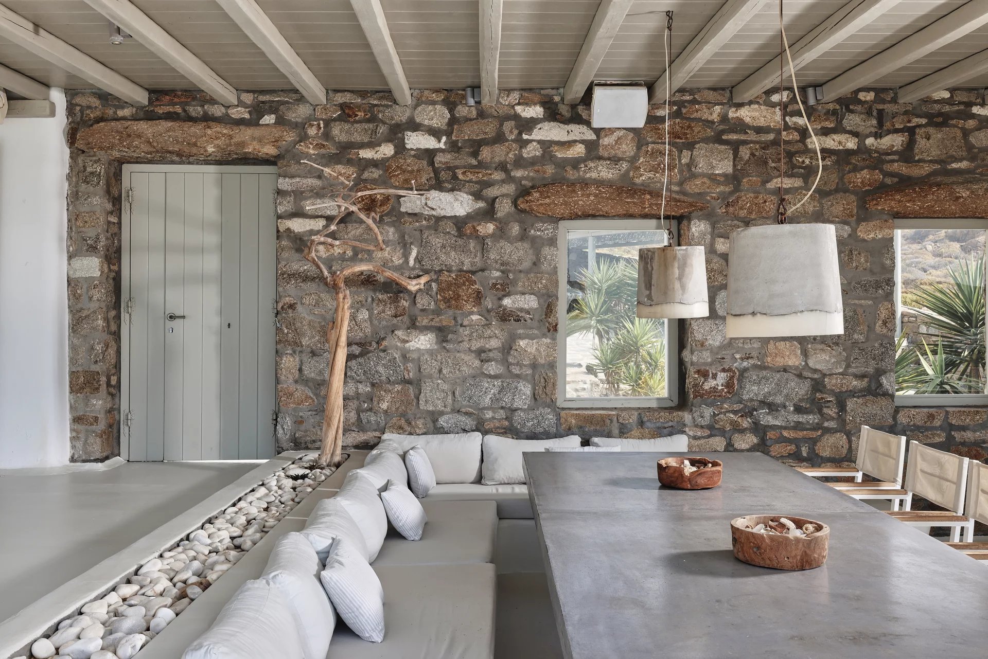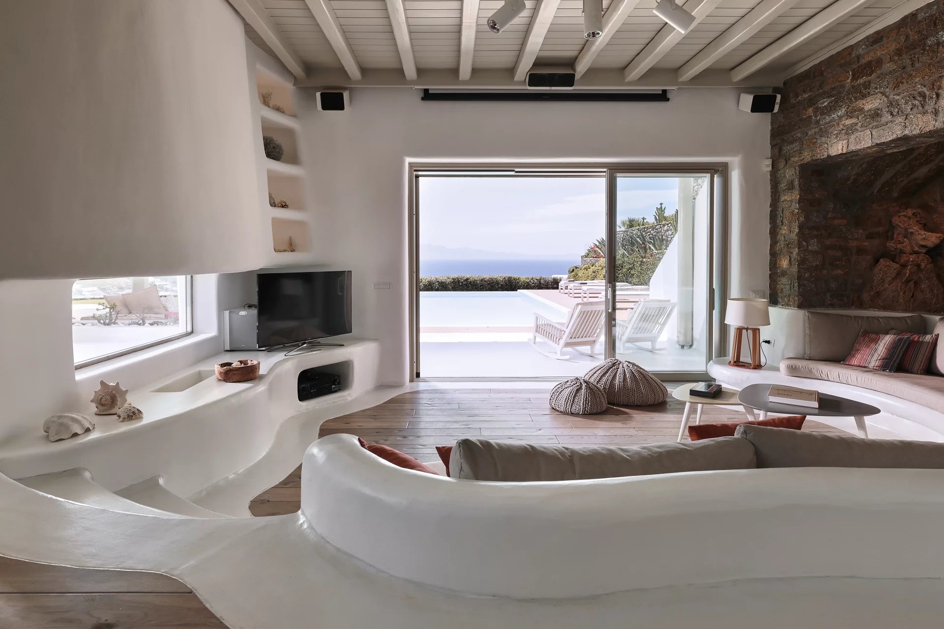 Villa Daedalus is perched on a hill with stunning views over Elia Beach, offering a spacious 6-bedroom retreat within a lush 2,000 sqm garden filled with flowers and plants. This property provides guests plenty of space to unwind, featuring an Infinity Pool, grassy areas, and several spots for lounging and dining outdoors, complete with a bar and BBQ.
