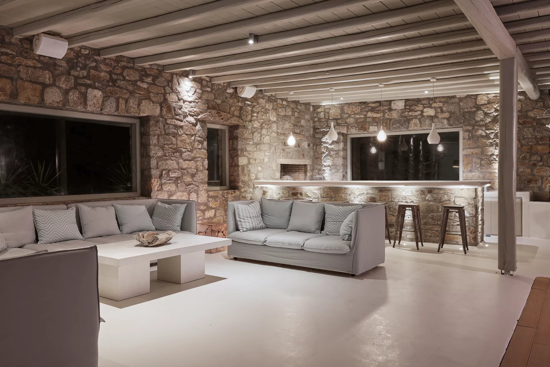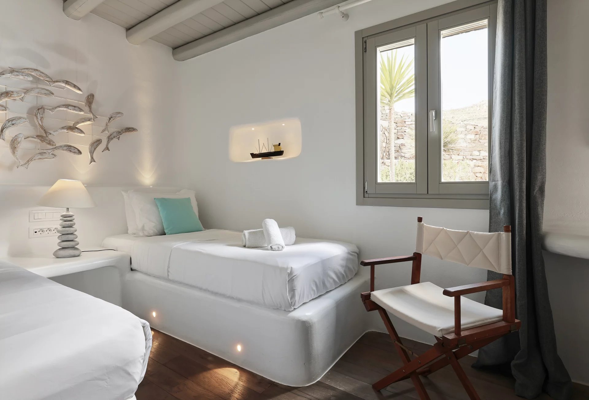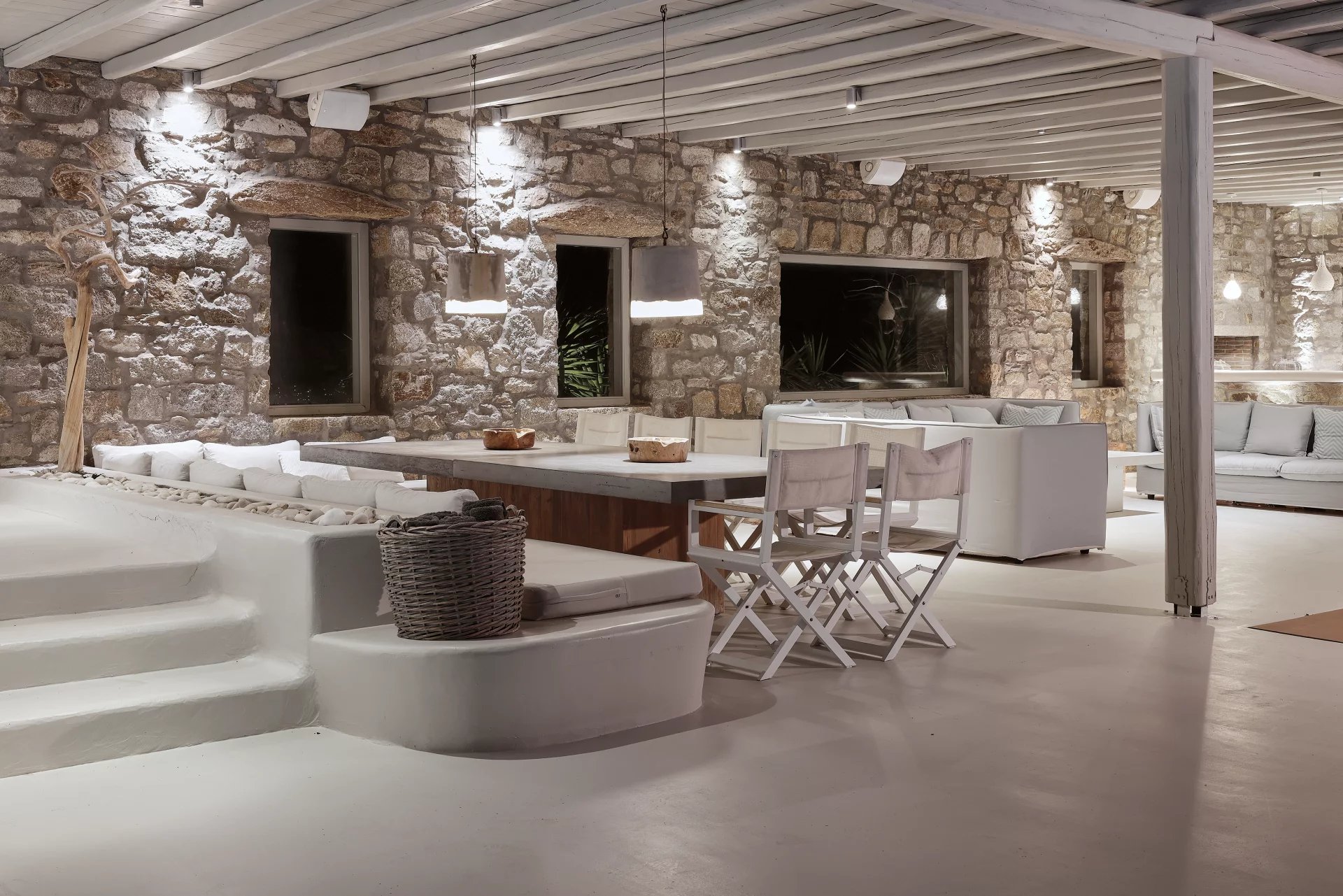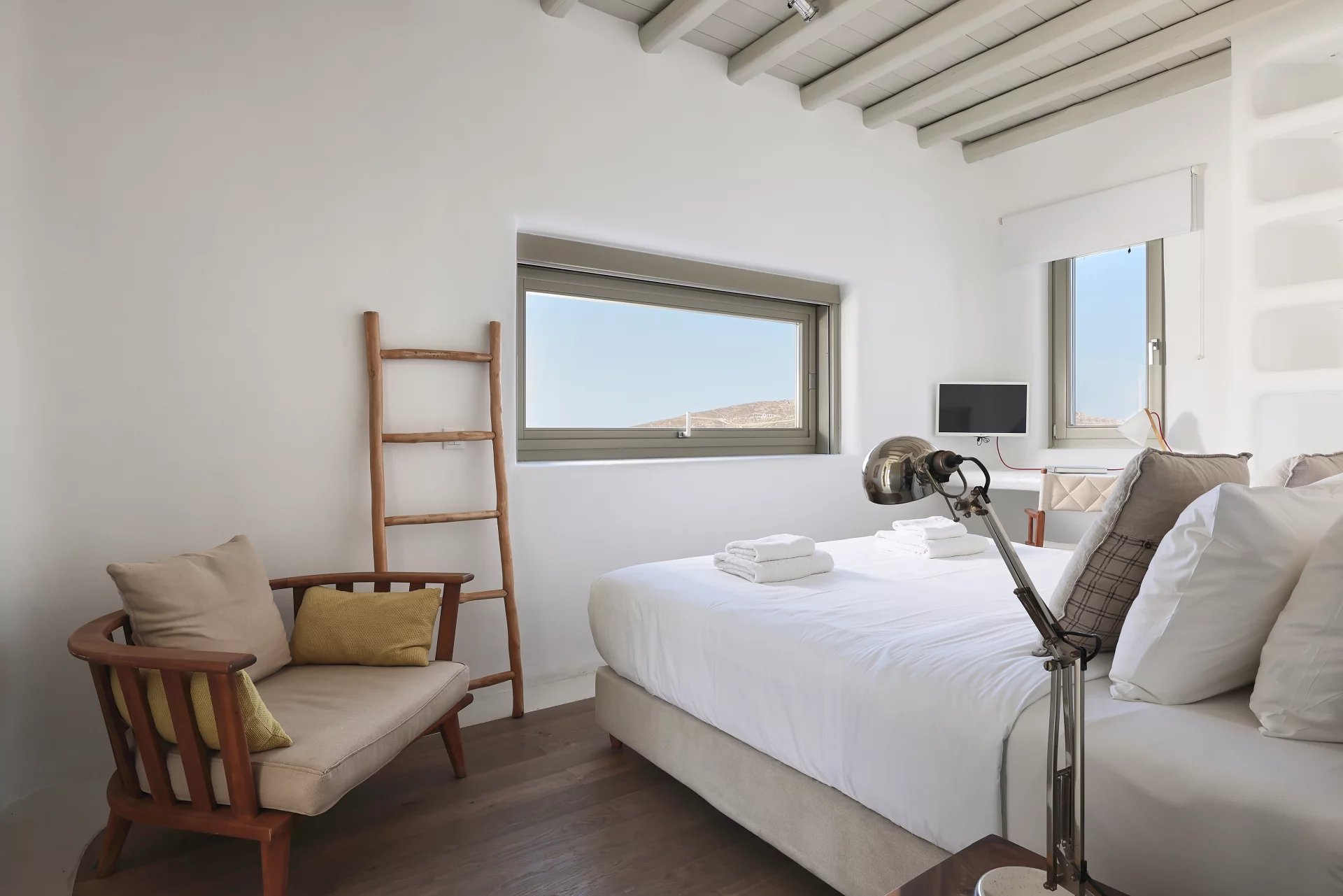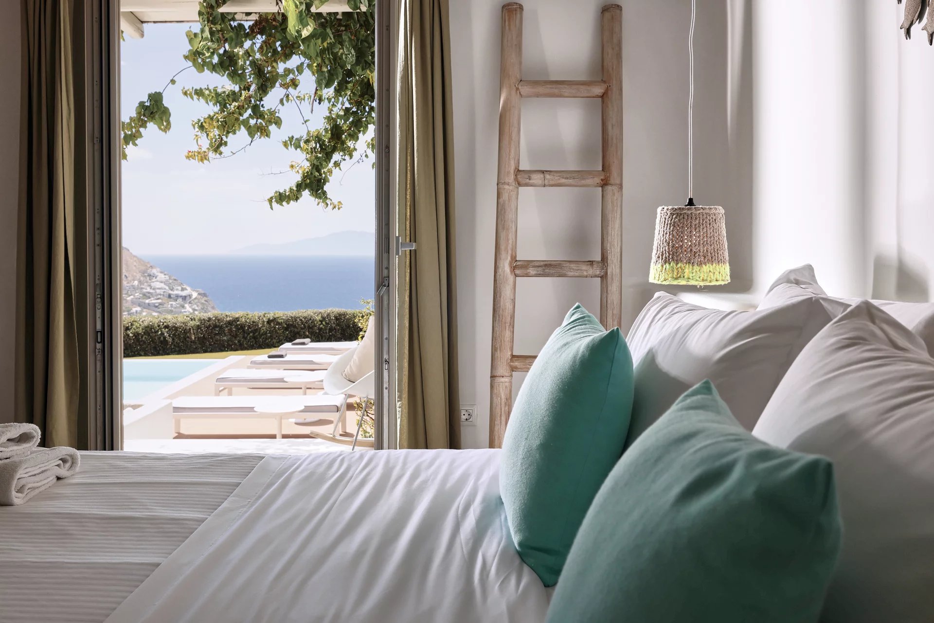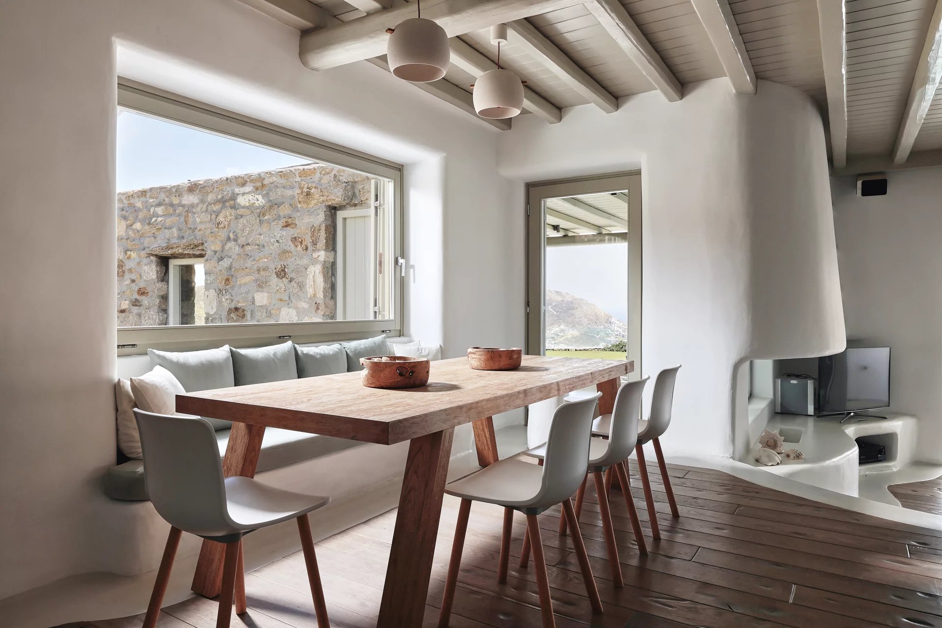 Villa Daedalus is perched on a hill with stunning views over Elia Beach, offering a spacious 6-bedroom retreat within a lush 2,000 sqm garden filled with flowers and plants. This property provides guests plenty of space to unwind, featuring an Infinity Pool, grassy areas, and several spots for lounging and dining outdoors, complete with a bar and BBQ.