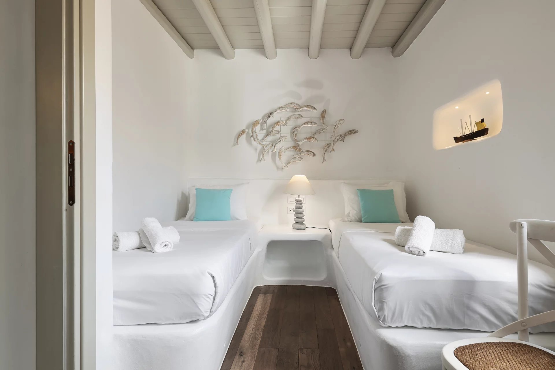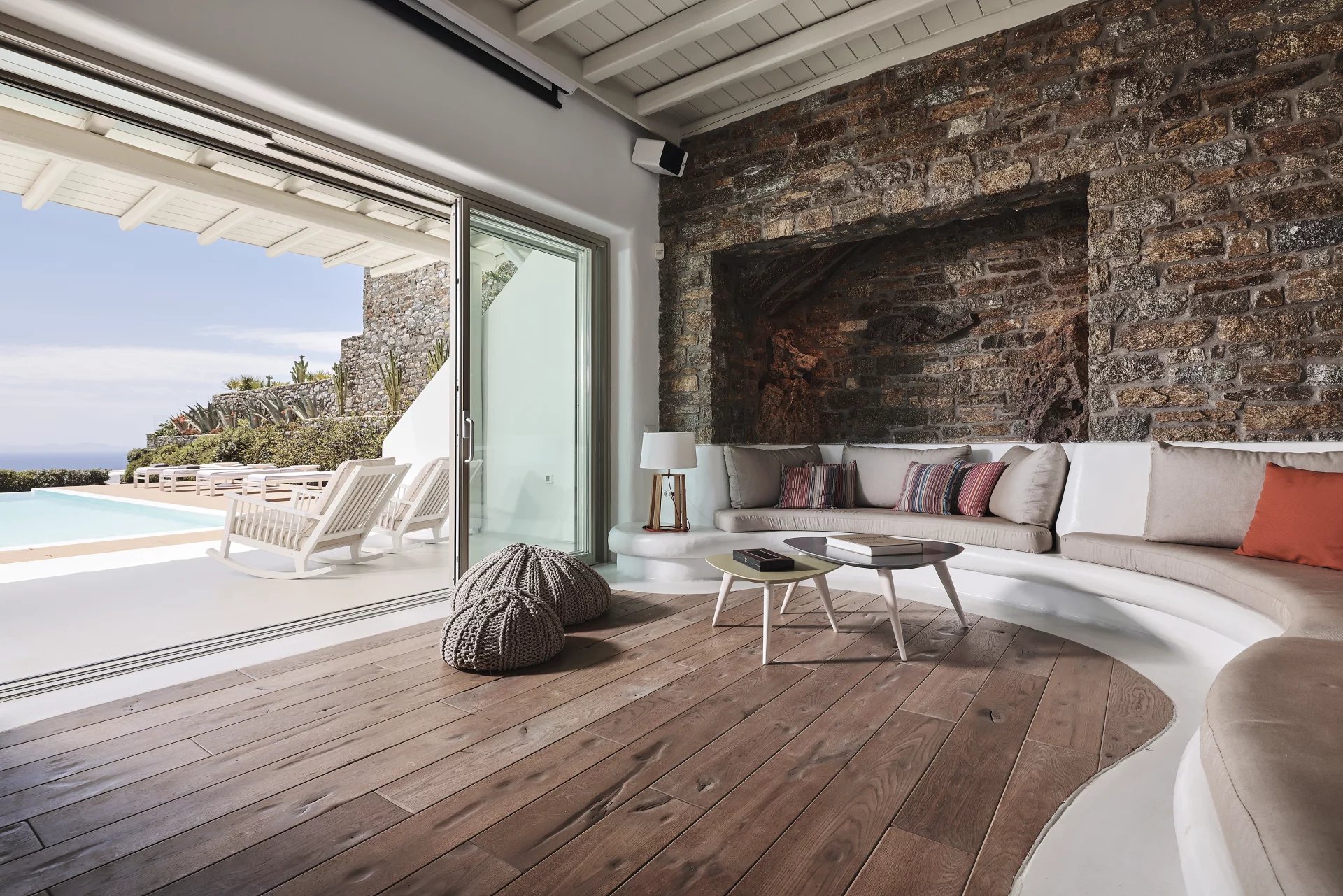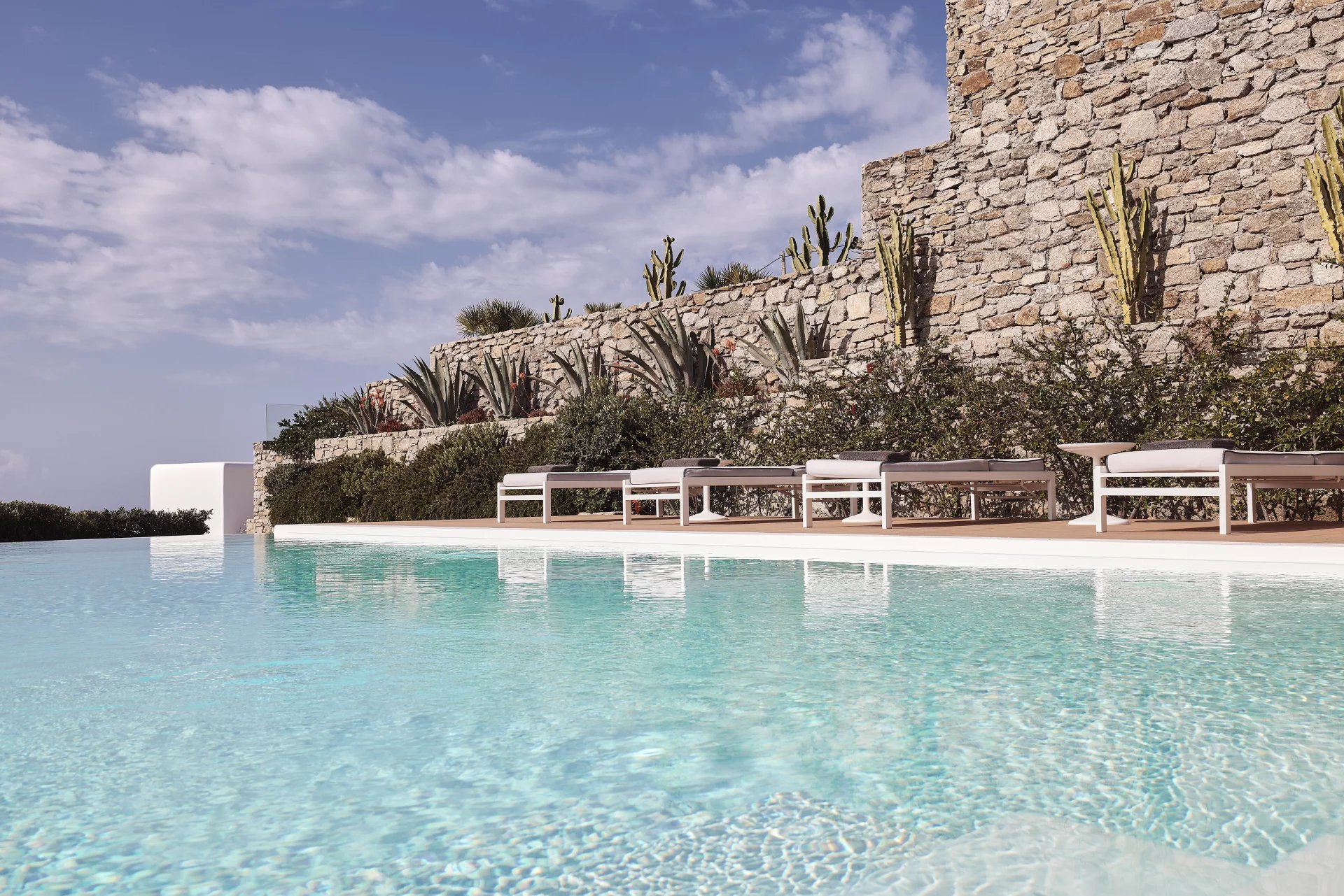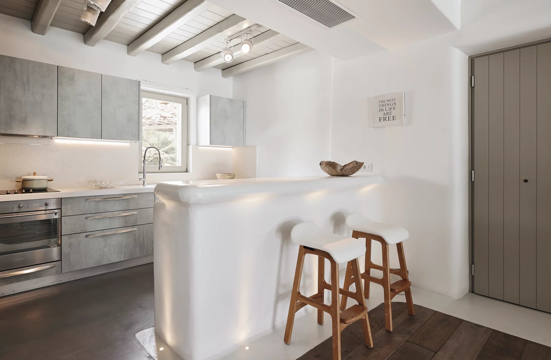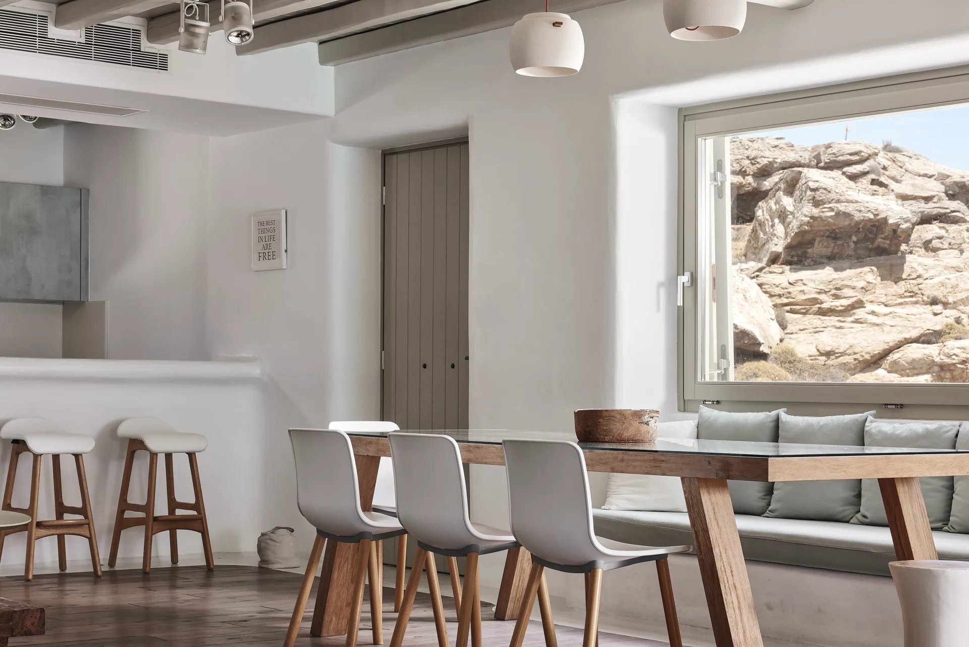 Villa Daedalus is perched on a hill with stunning views over Elia Beach, offering a spacious 6-bedroom retreat within a lush 2,000 sqm garden filled with flowers and plants. This property provides guests plenty of space to unwind, featuring an Infinity Pool, grassy areas, and several spots for lounging and dining outdoors, complete with a bar and BBQ.