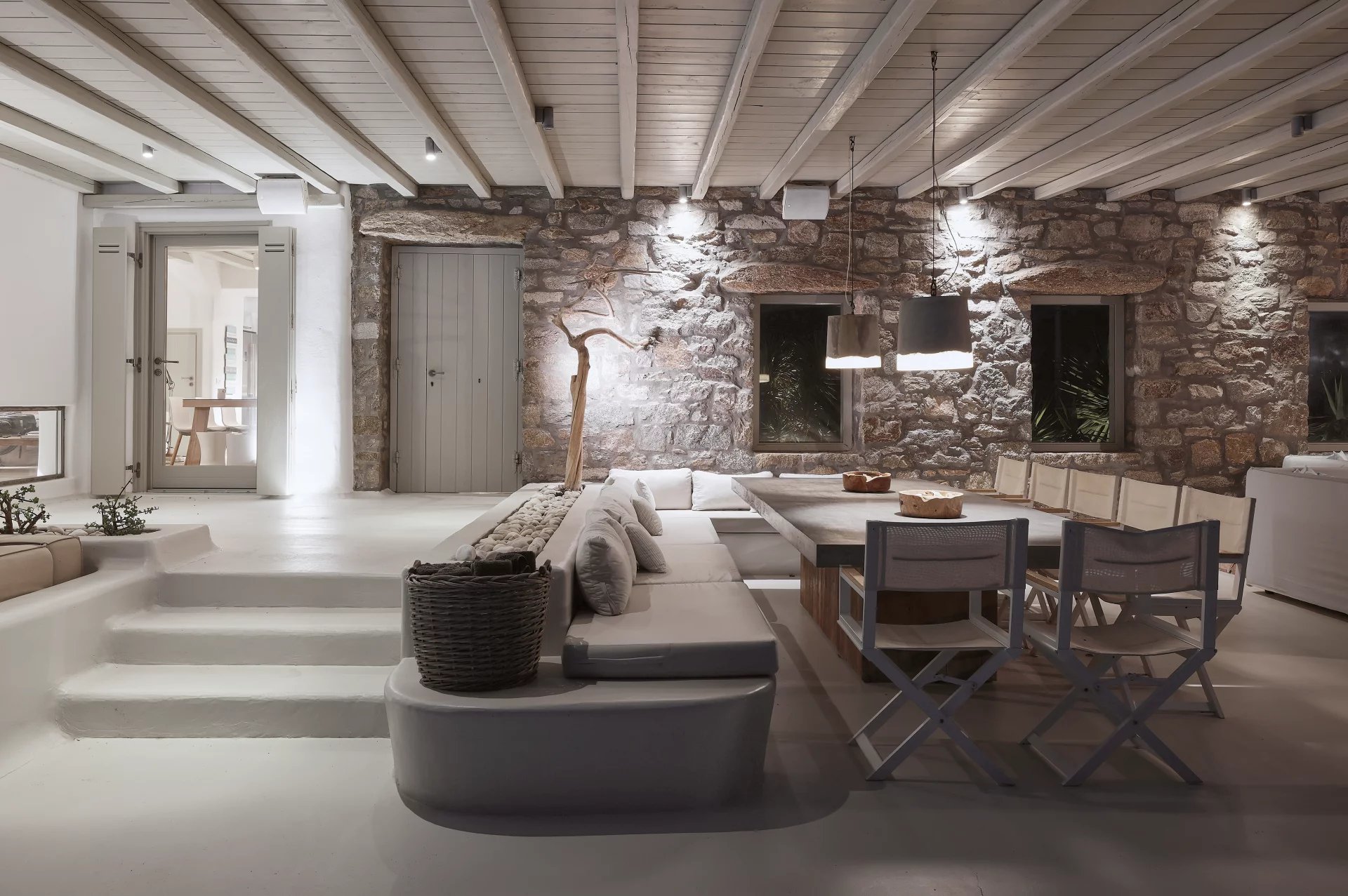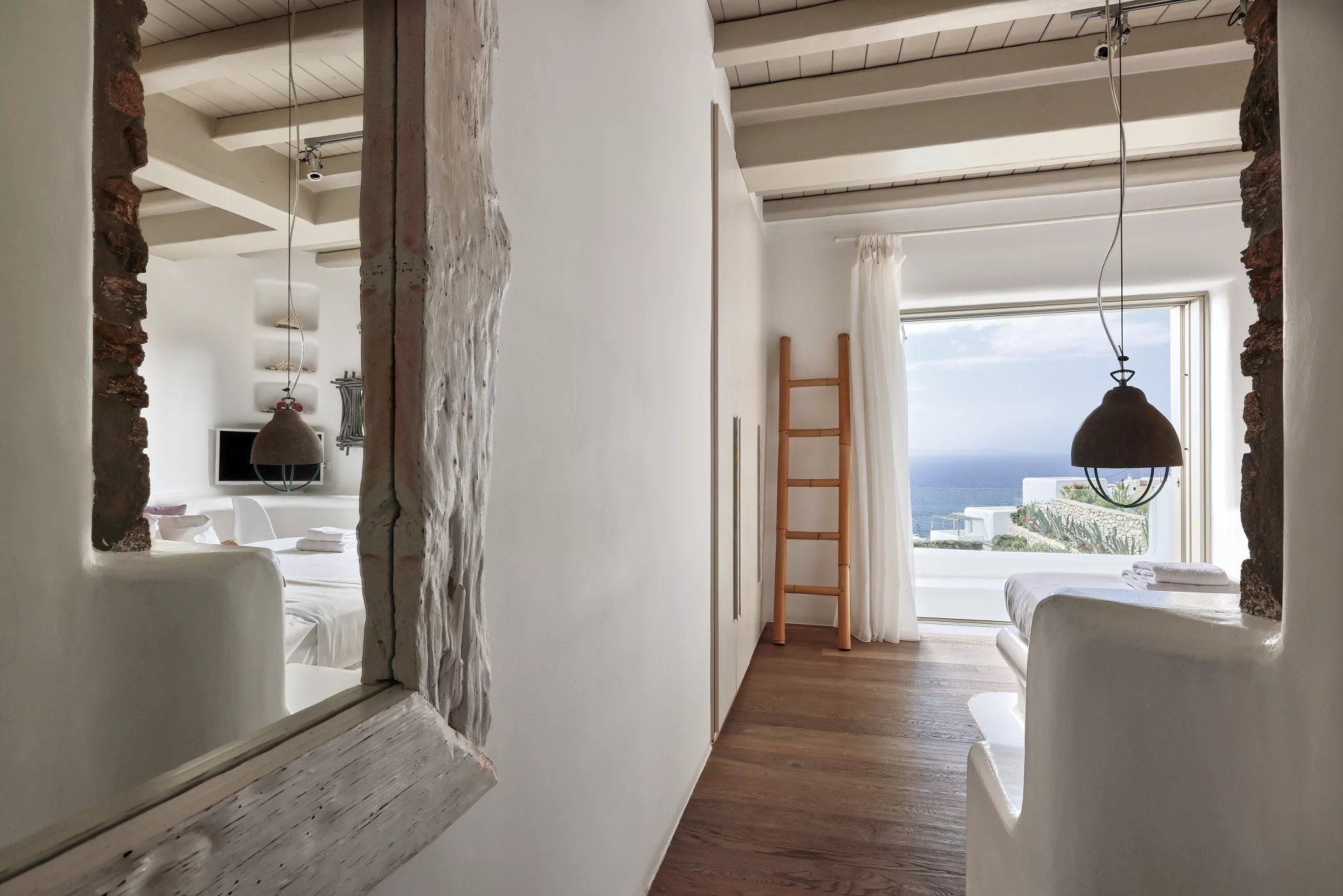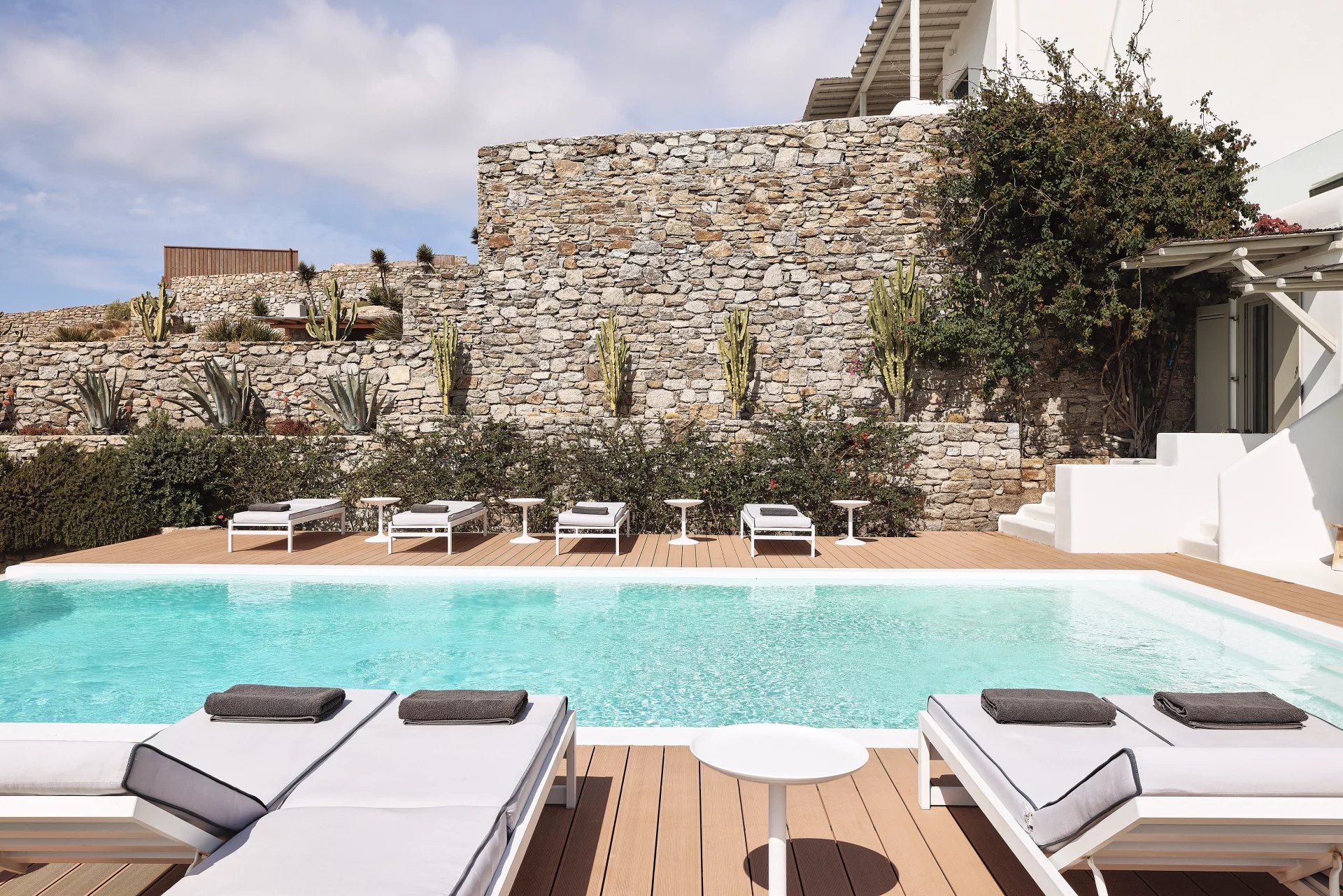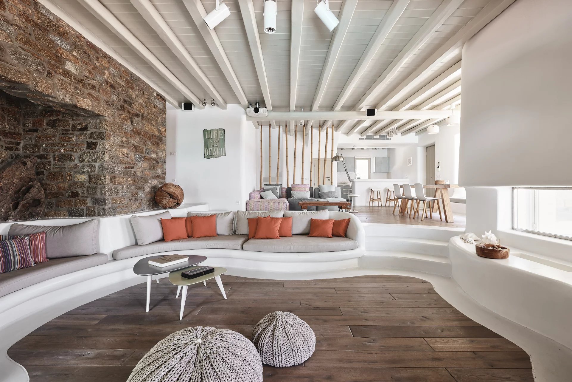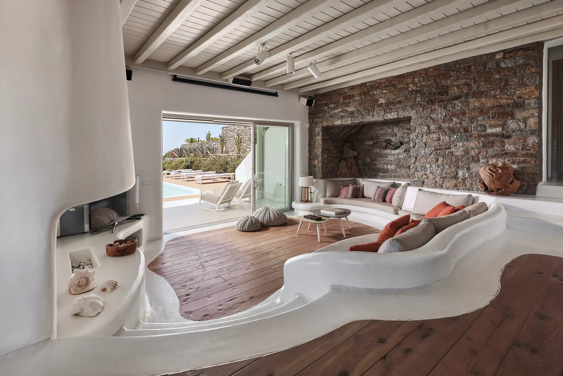 Villa Daedalus is perched on a hill with stunning views over Elia Beach, offering a spacious 6-bedroom retreat within a lush 2,000 sqm garden filled with flowers and plants. This property provides guests plenty of space to unwind, featuring an Infinity Pool, grassy areas, and several spots for lounging and dining outdoors, complete with a bar and BBQ.