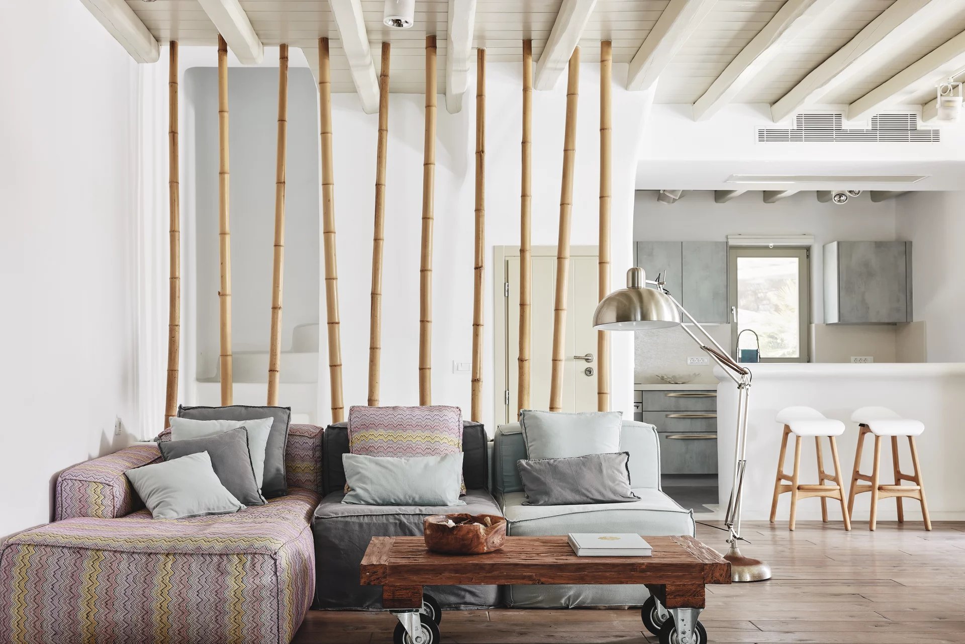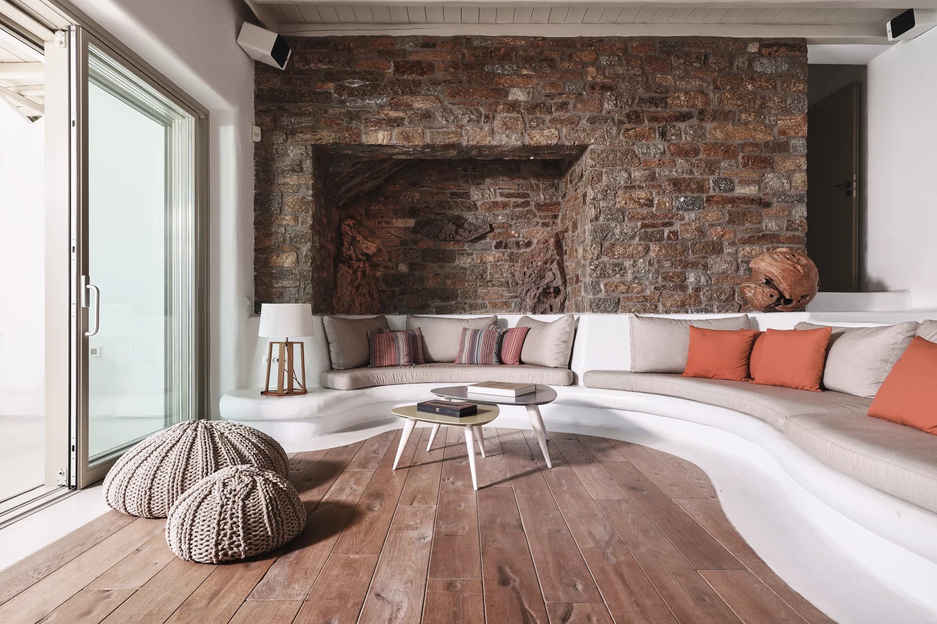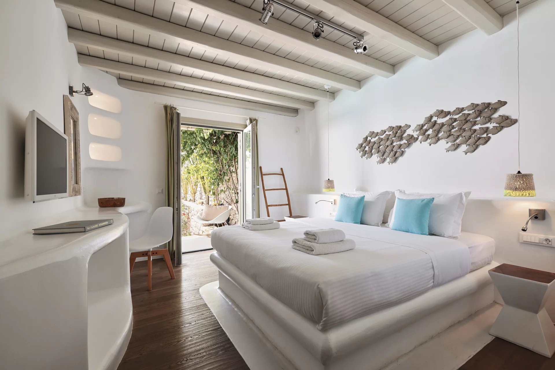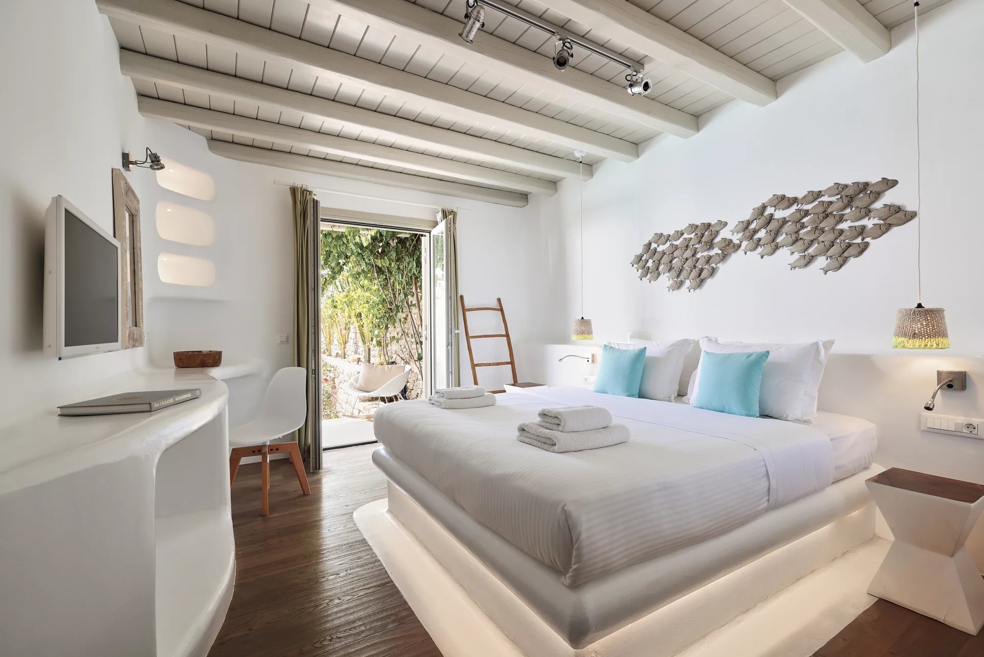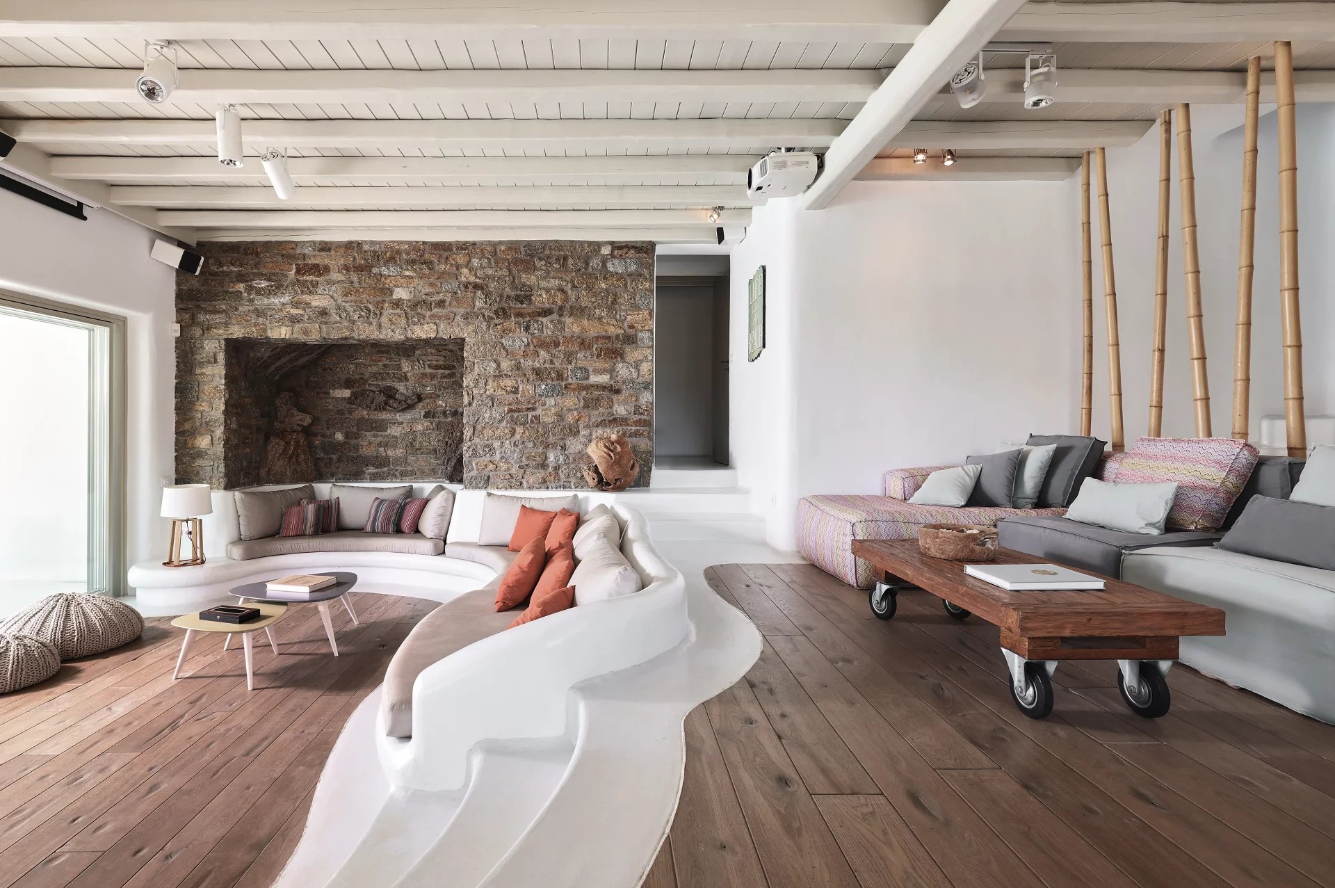 Villa Daedalus is perched on a hill with stunning views over Elia Beach, offering a spacious 6-bedroom retreat within a lush 2,000 sqm garden filled with flowers and plants. This property provides guests plenty of space to unwind, featuring an Infinity Pool, grassy areas, and several spots for lounging and dining outdoors, complete with a bar and BBQ.