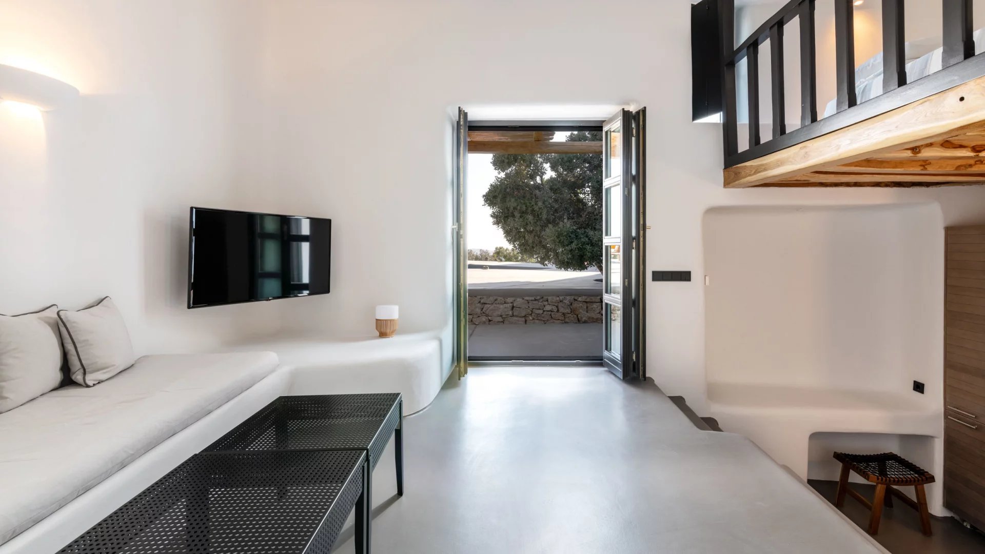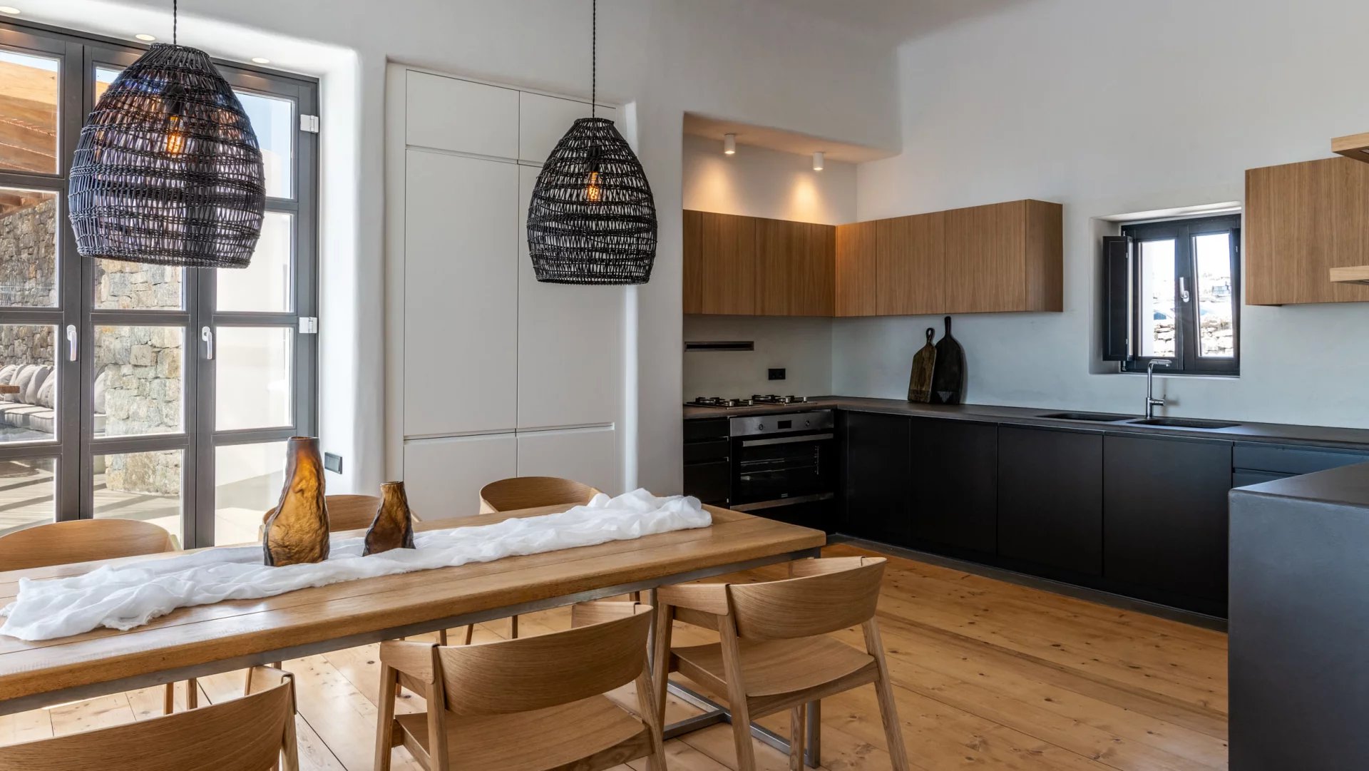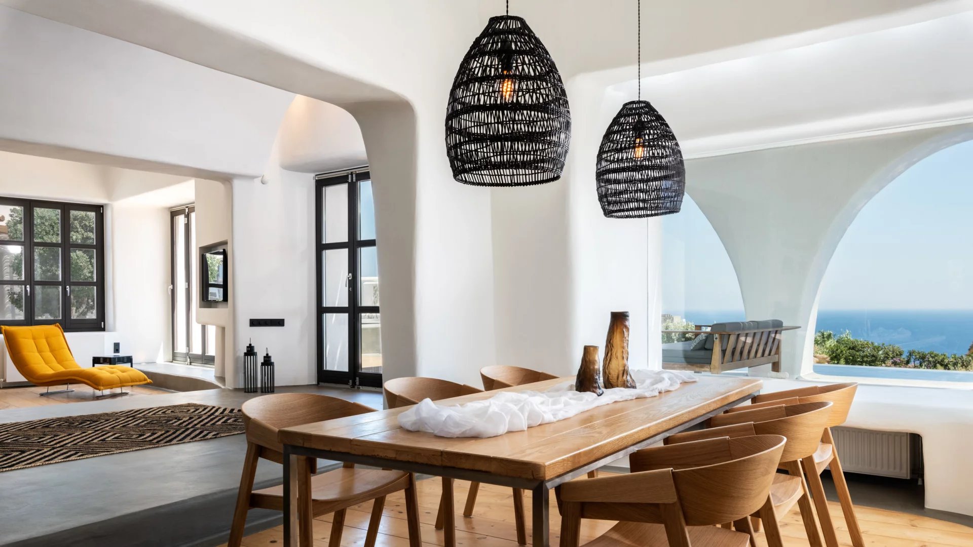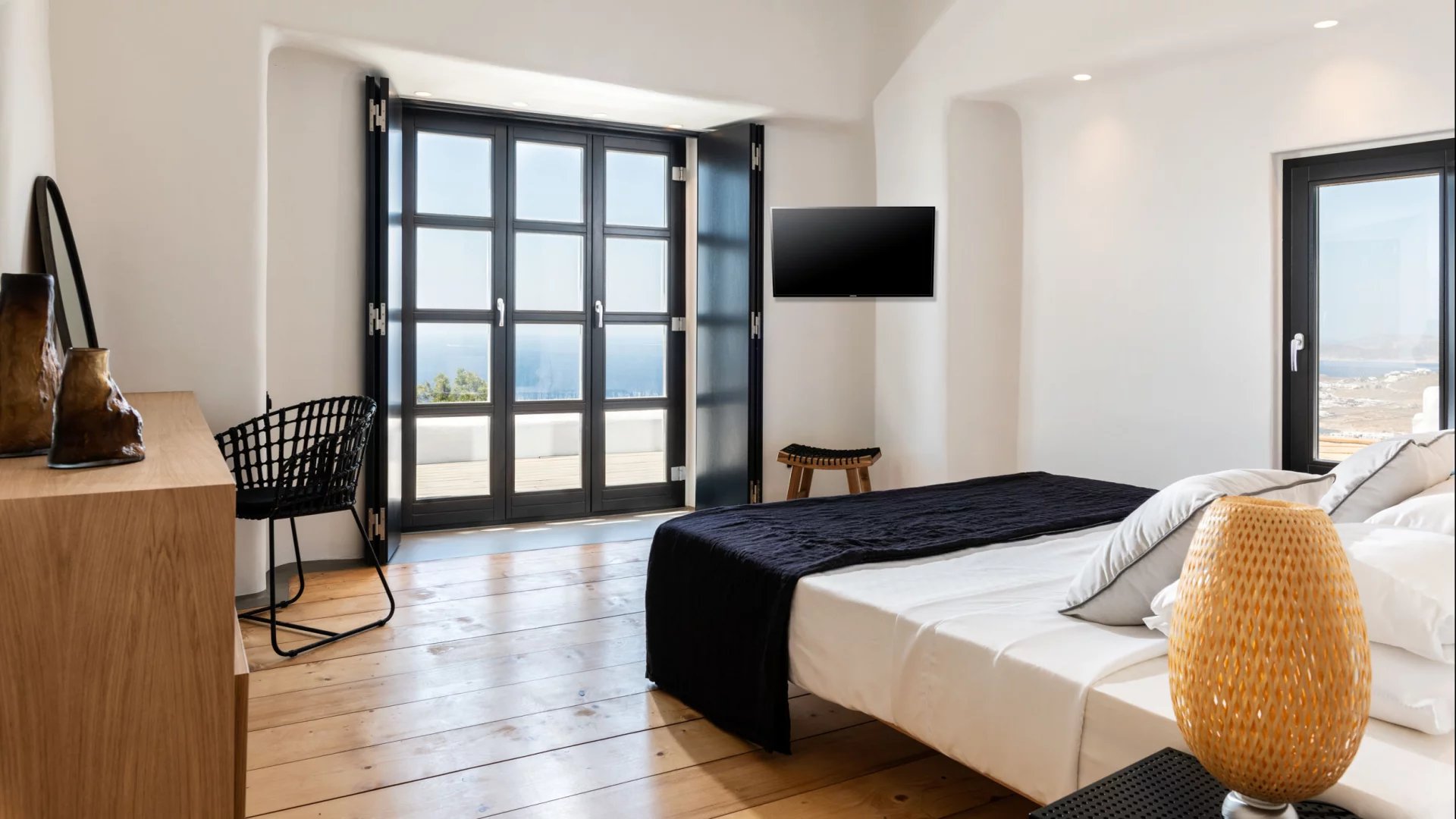 The interior design of Villa Elaia speaks volumes of understated luxury, adorned with cool palettes of white and black, complemented by contemporary furniture that seamlessly integrates elements of wood and stone. This choice of decor not only adds a touch of sophistication but also creates a warm and welcoming atmosphere for guests.