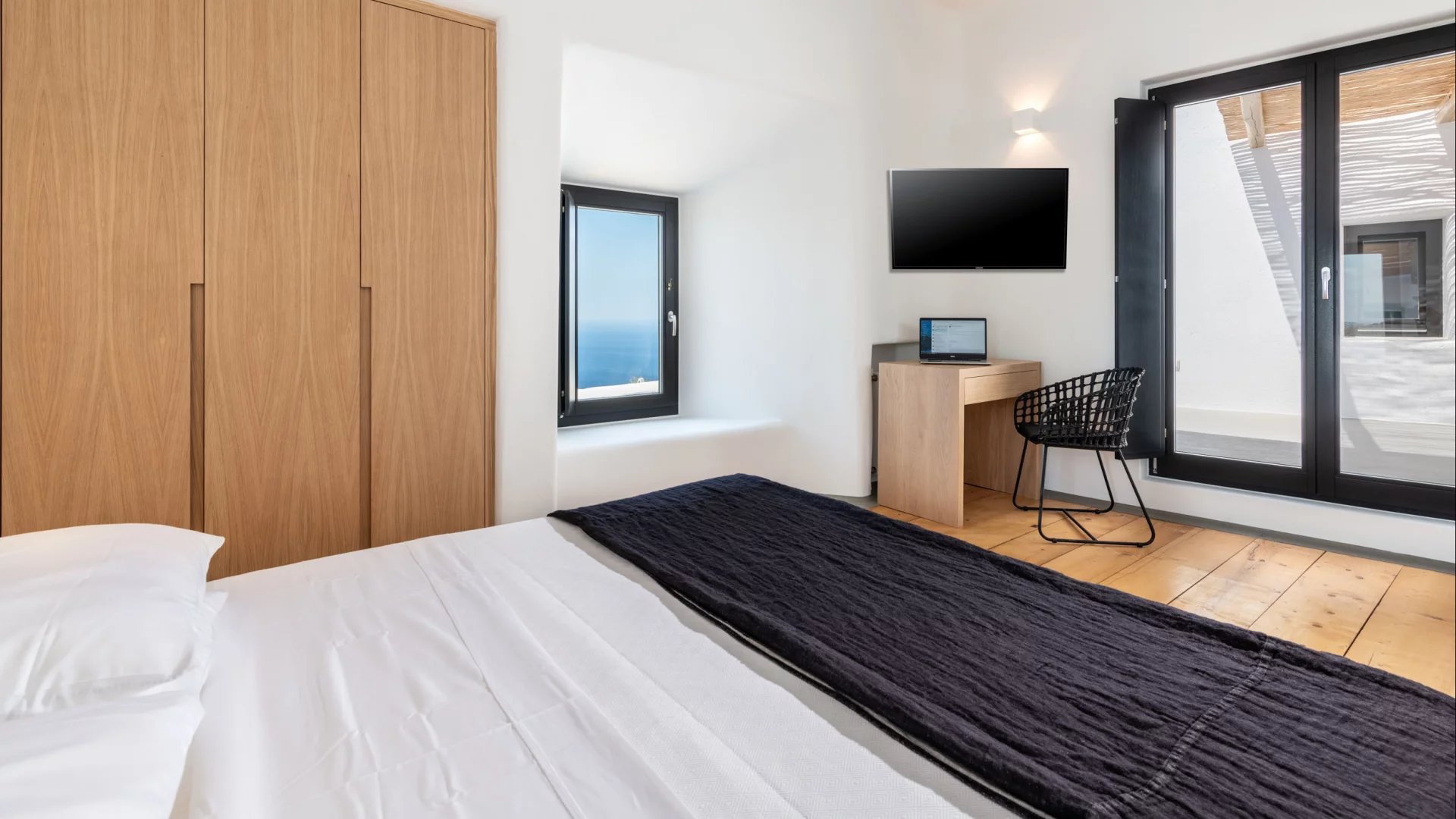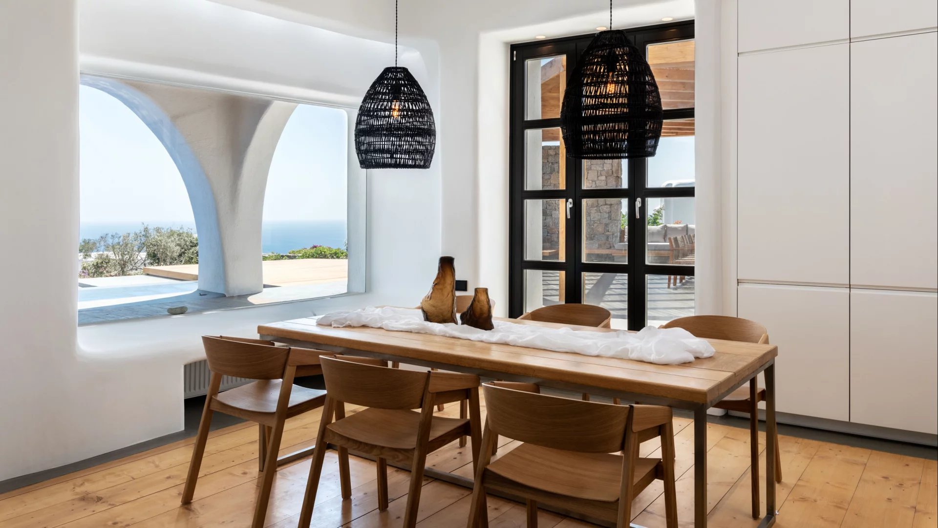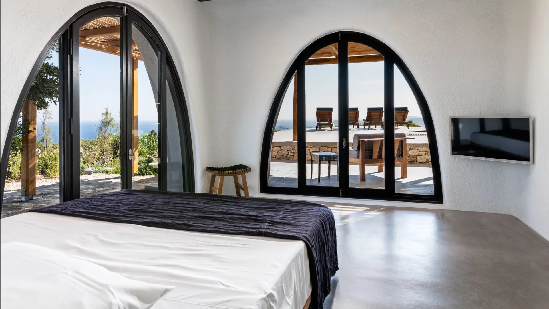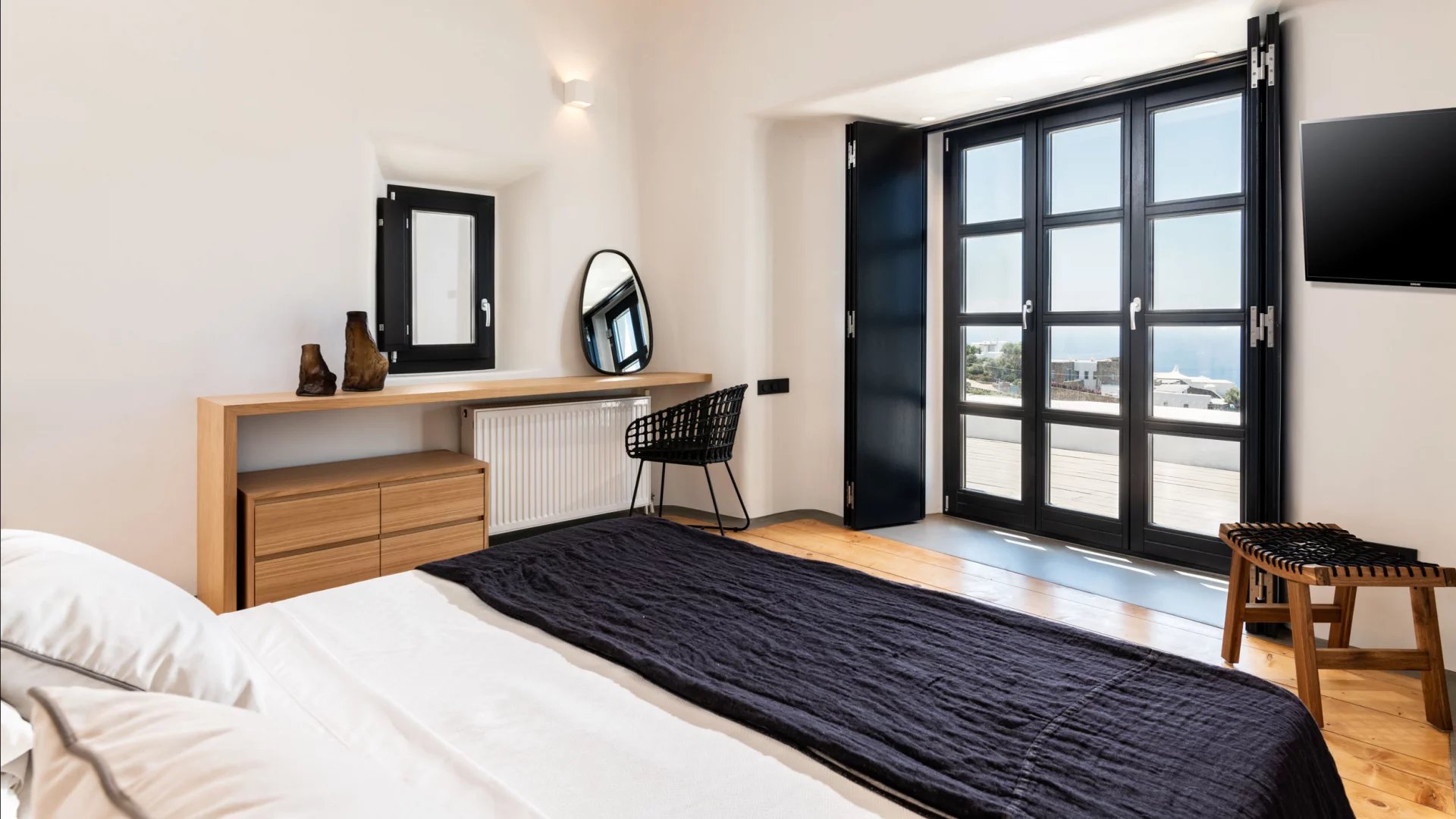 The interior design of Villa Elaia speaks volumes of understated luxury, adorned with cool palettes of white and black, complemented by contemporary furniture that seamlessly integrates elements of wood and stone. This choice of decor not only adds a touch of sophistication but also creates a warm and welcoming atmosphere for guests.