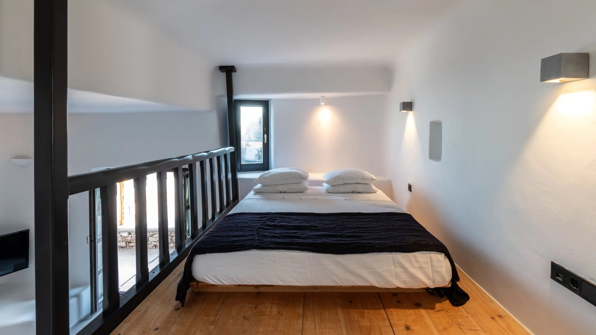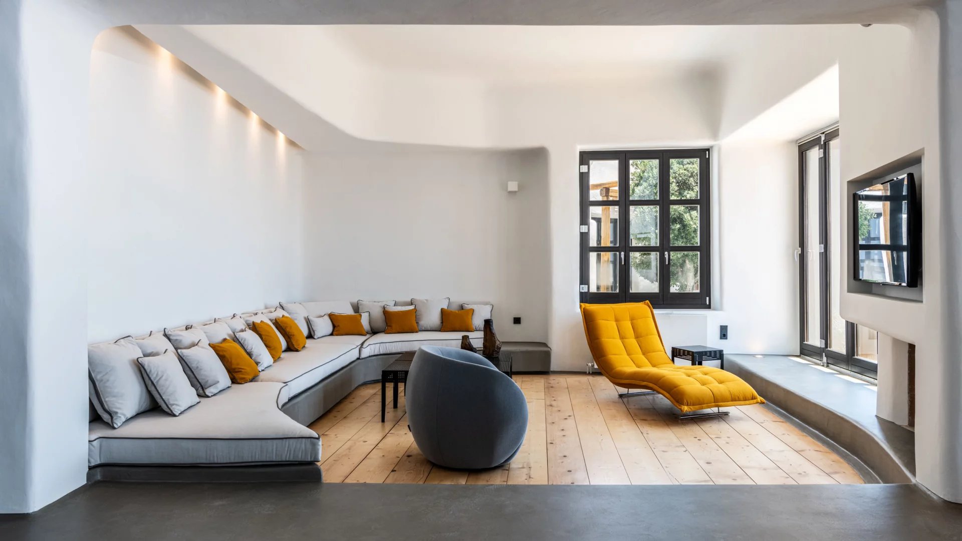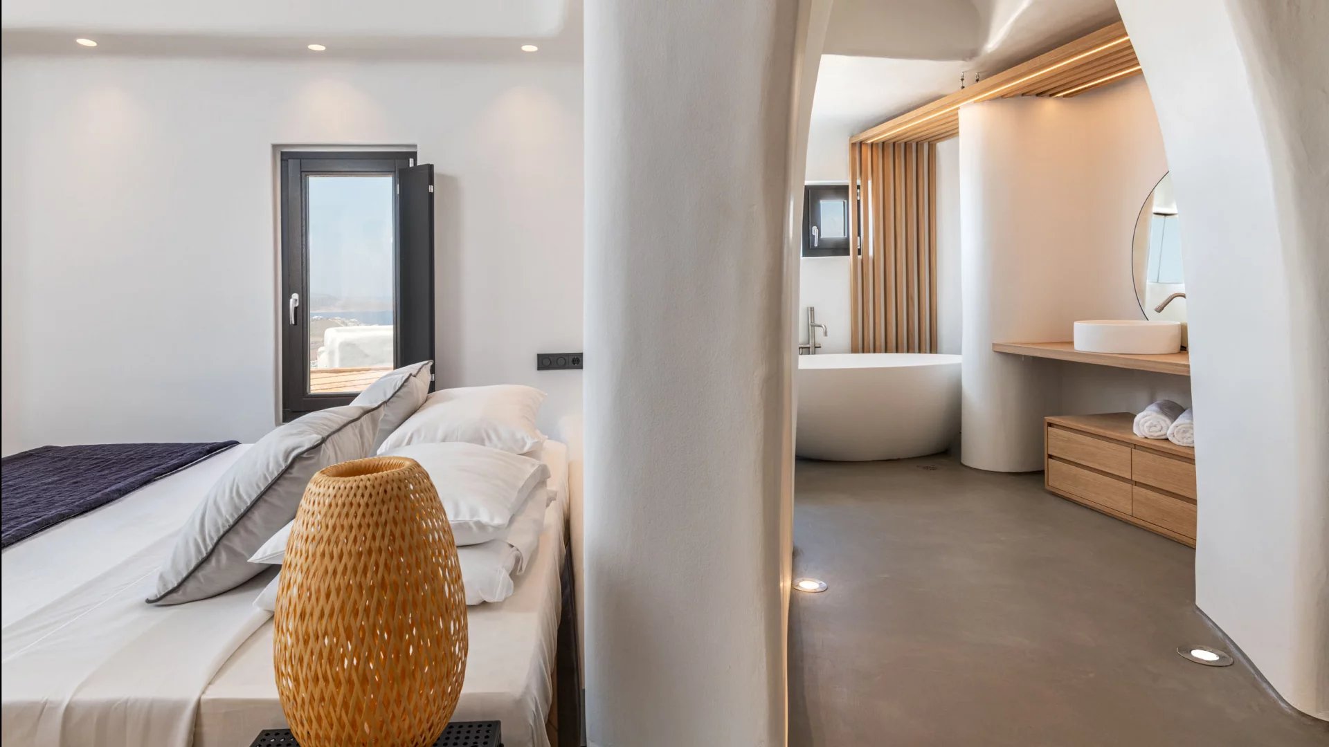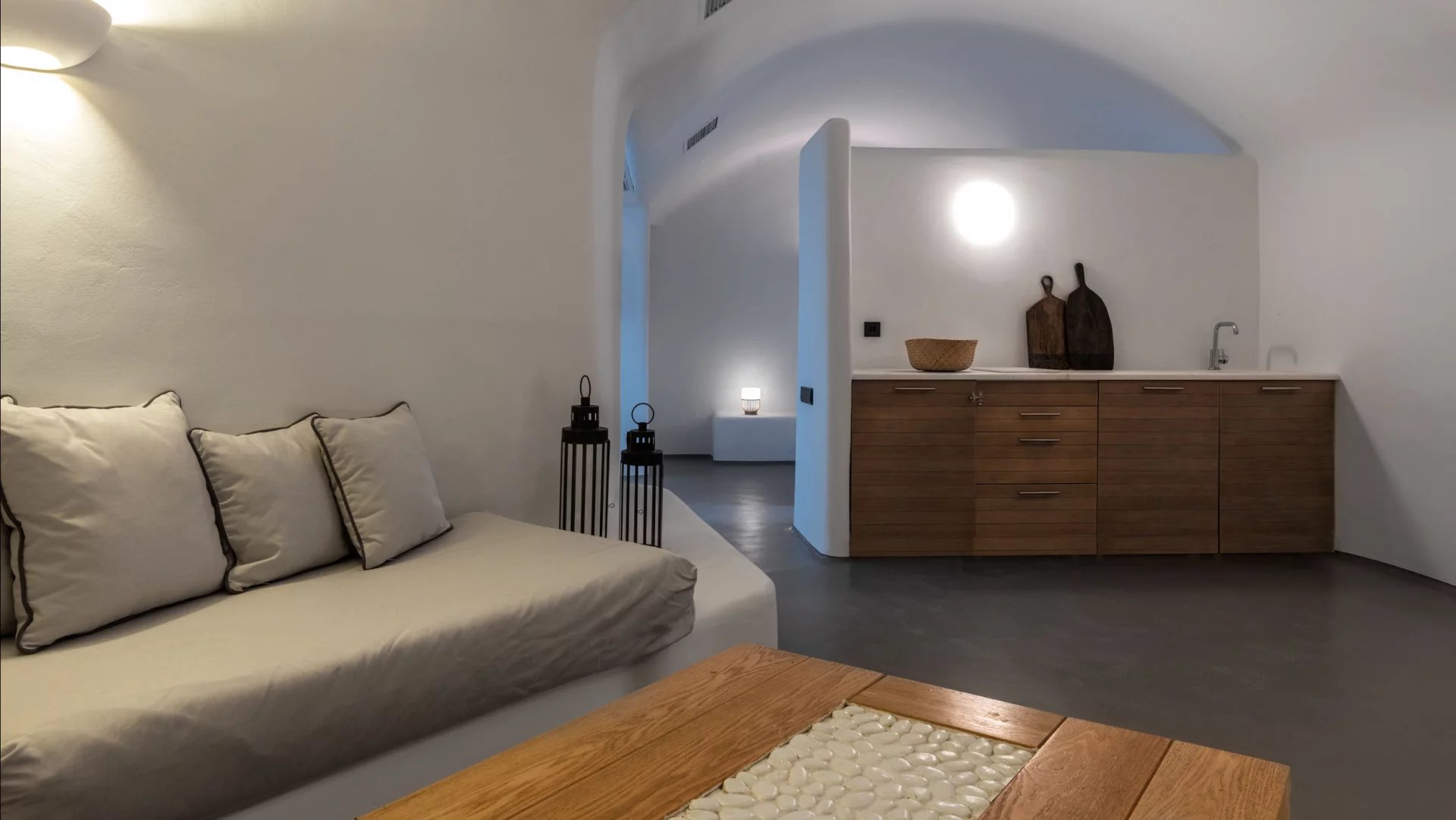 The interior design of Villa Elaia speaks volumes of understated luxury, adorned with cool palettes of white and black, complemented by contemporary furniture that seamlessly integrates elements of wood and stone. This choice of decor not only adds a touch of sophistication but also creates a warm and welcoming atmosphere for guests.