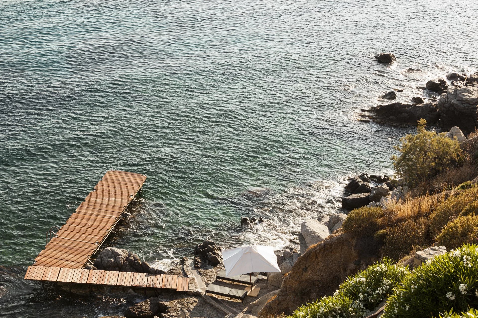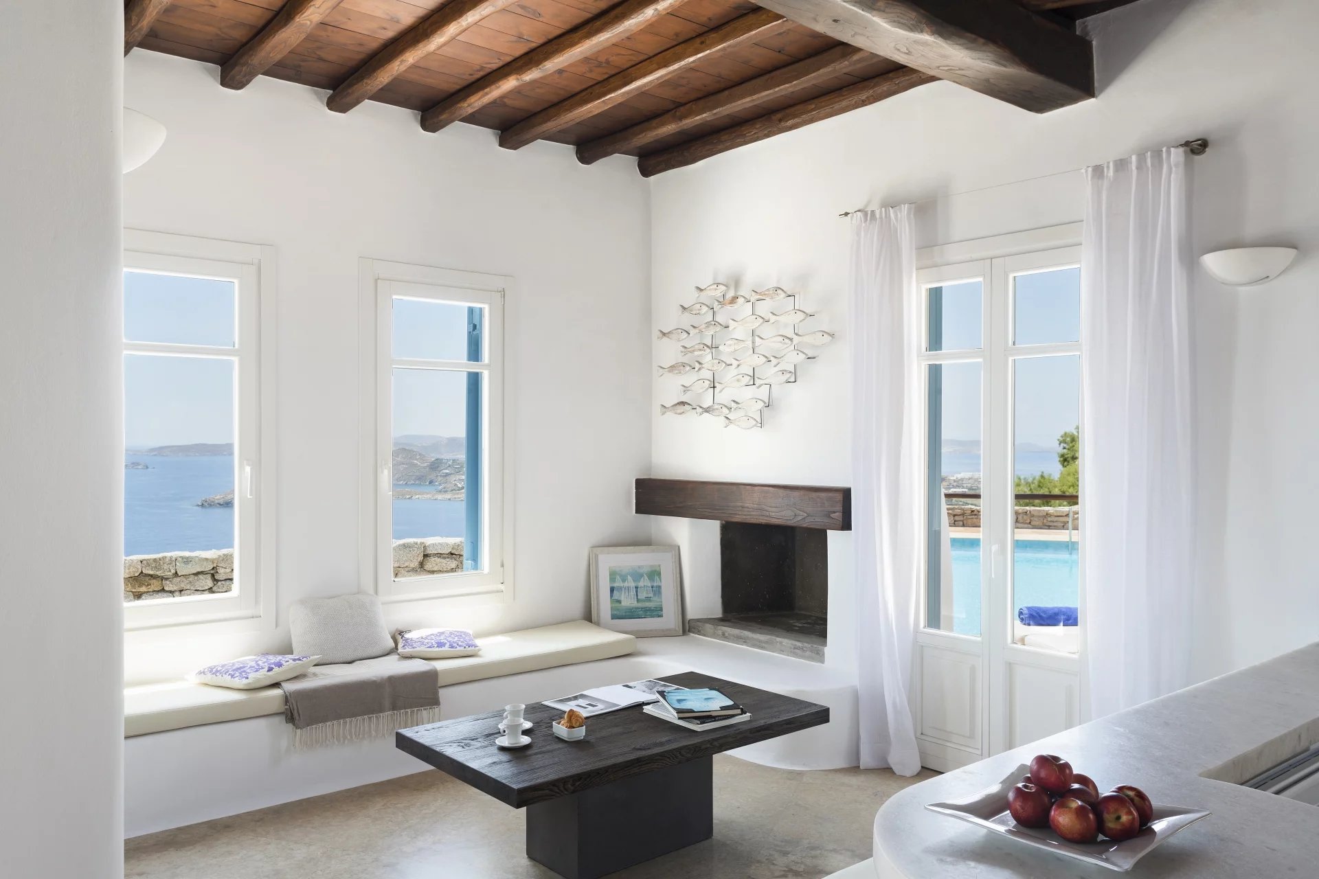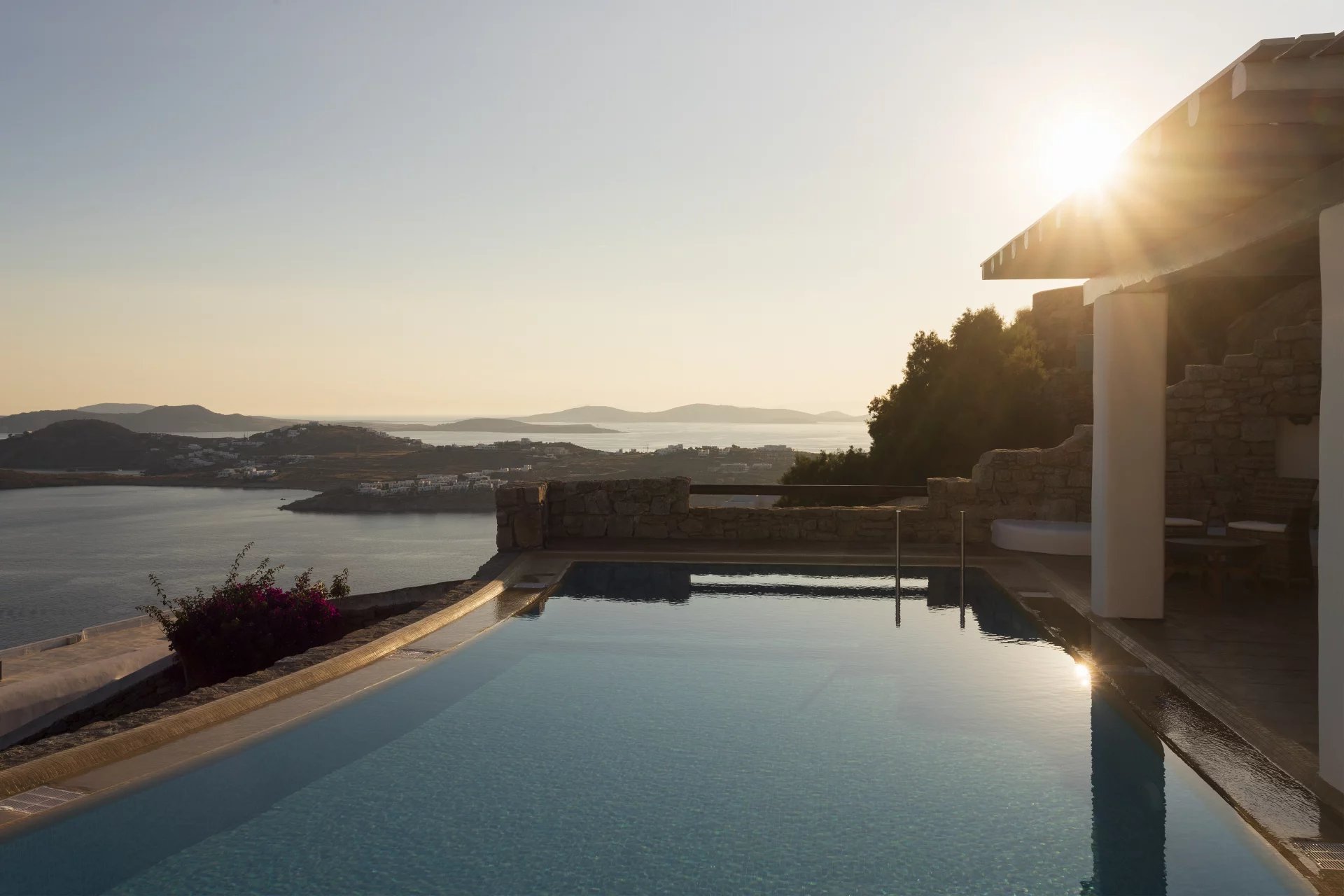 Perched high above the azure waters, Villa Elpida offers a panoramic vista encompassing the enchanting islands of Delos and Rhenia, a dramatic seascape, and the mesmerizing spectacle of Mykonos sunset.