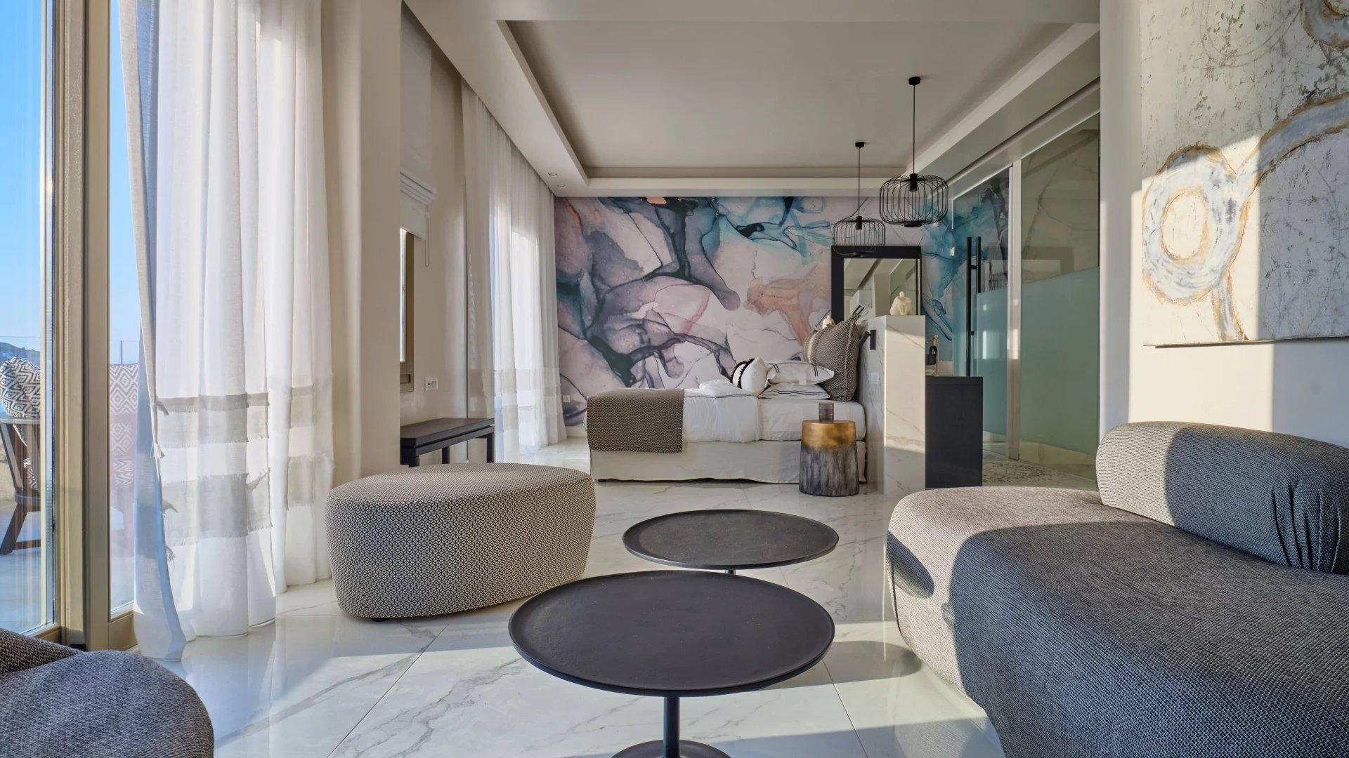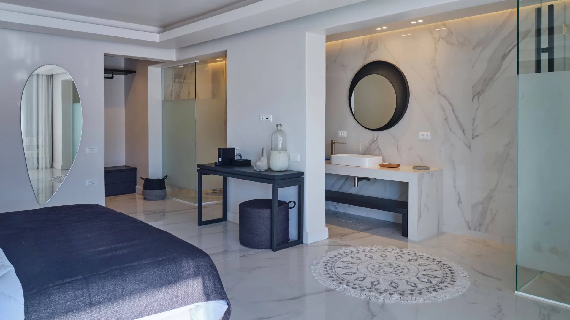 The concept of the villa Etheras is without a doubt, enjoyment and entertaining guests with style. The outdoor spaces are a true testament to this statement with the massive pool terrace stretching out in the most panoramic position of the property. The swimming pool plays a catalyst role in the design of the spaces with its central position with shallow end and unlimited views to the sea.