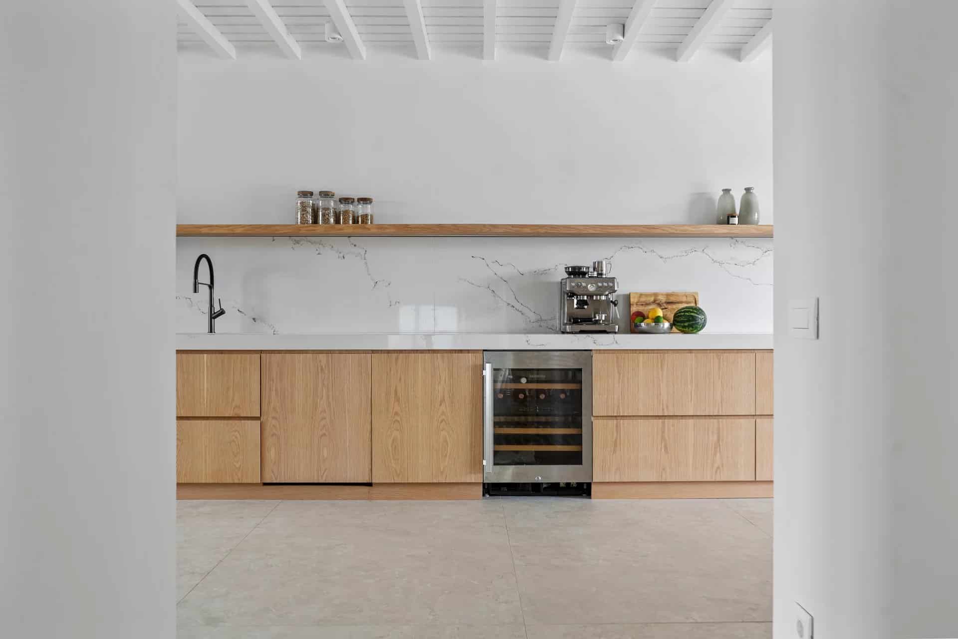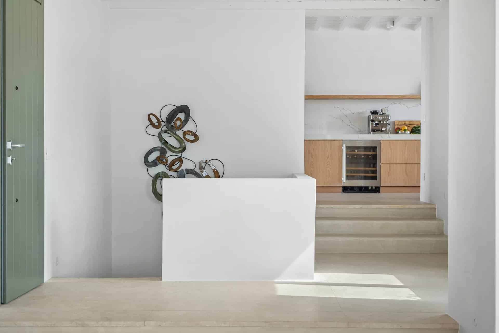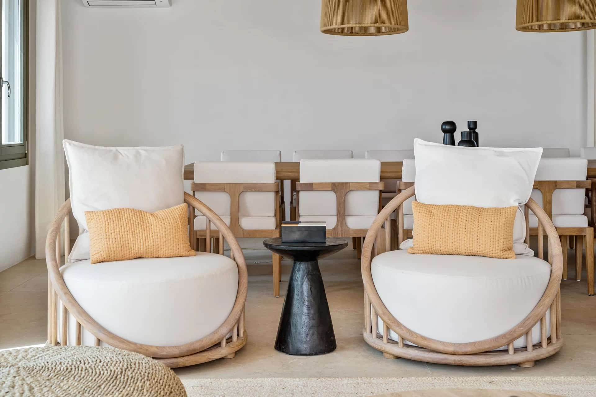 The interior showcases tasteful design in the spacious dining and lounging areas, featuring a soothing color palette of whites and beiges complemented by natural textures of wood and stone.