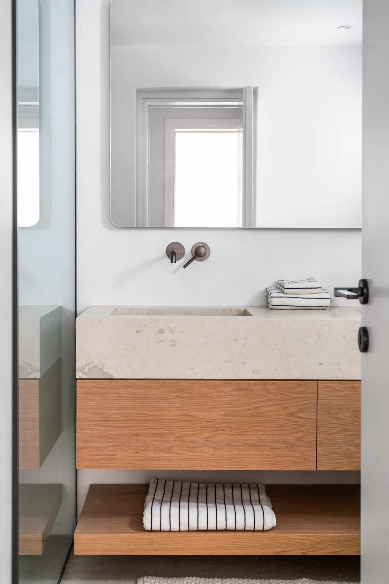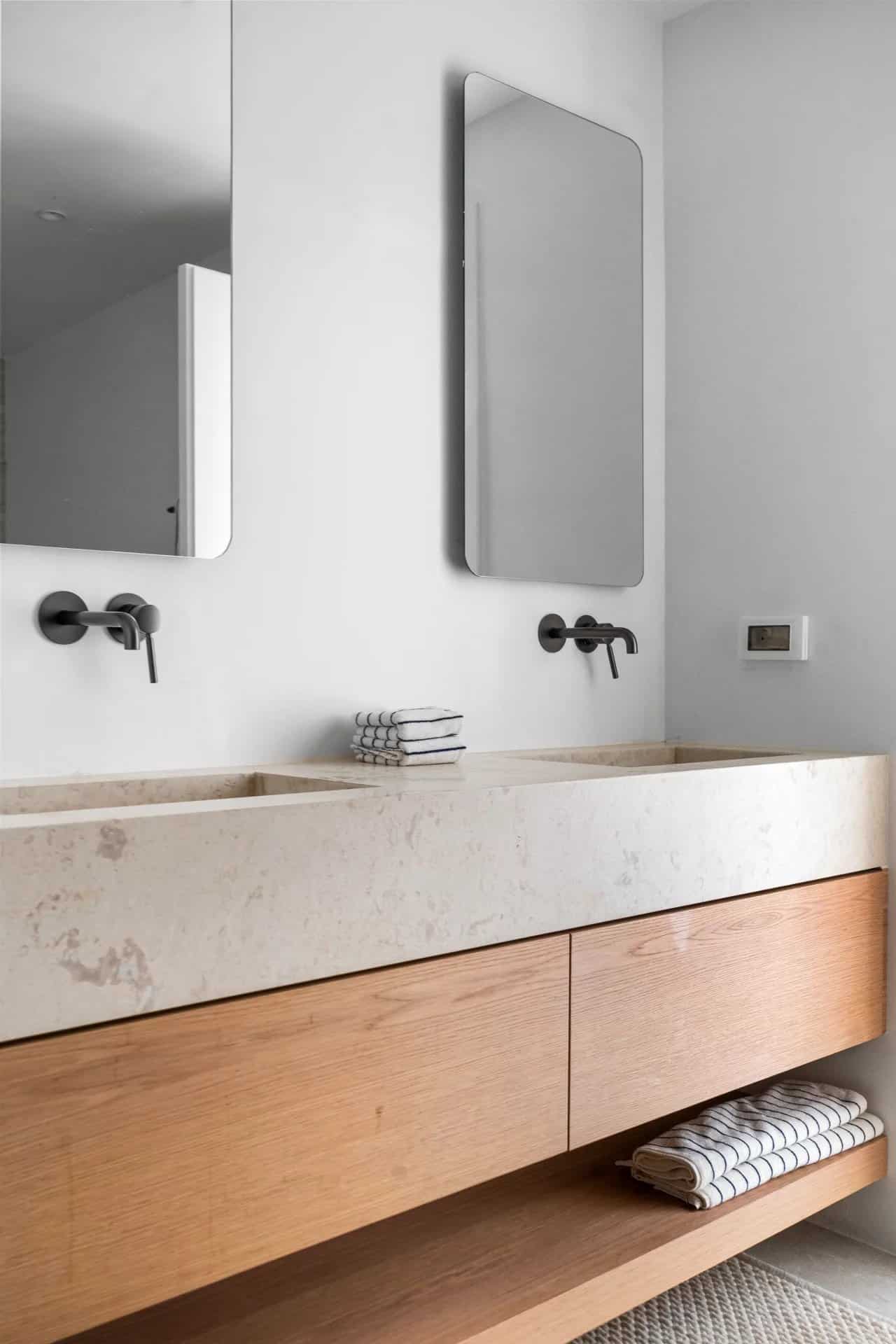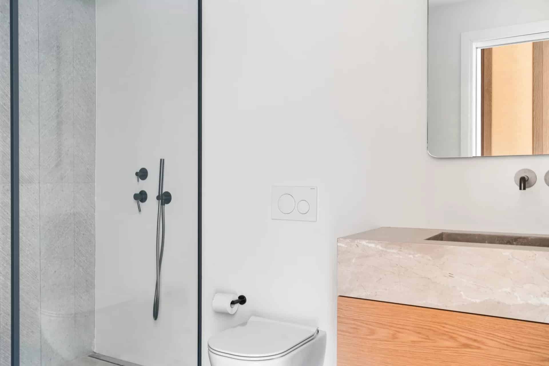 The interior showcases tasteful design in the spacious dining and lounging areas, featuring a soothing color palette of whites and beiges complemented by natural textures of wood and stone.