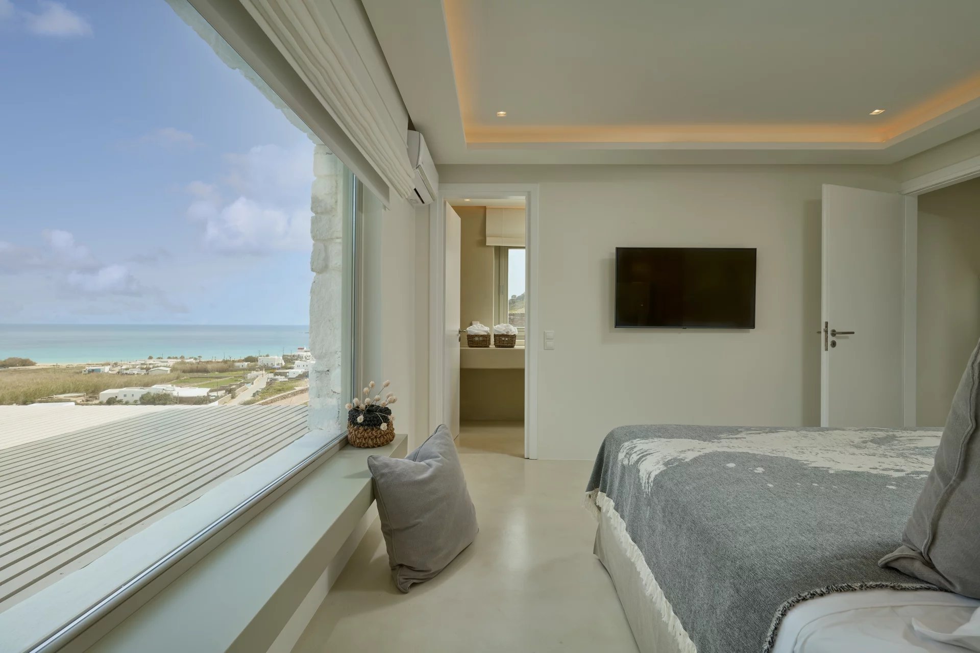 Room 3: master bedroom with queen-size bed, closet, [A/C], and ensuite bathroom with shower, and big window with sea view