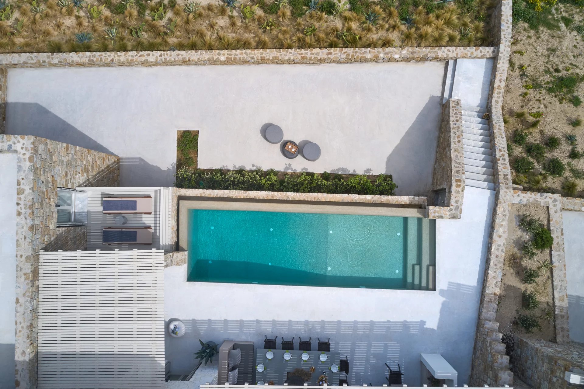 Entrance floor: Infinity pool (30 m2), loungers, pergola, outdoor dining area [12 seats], amazing sea view, parking areas