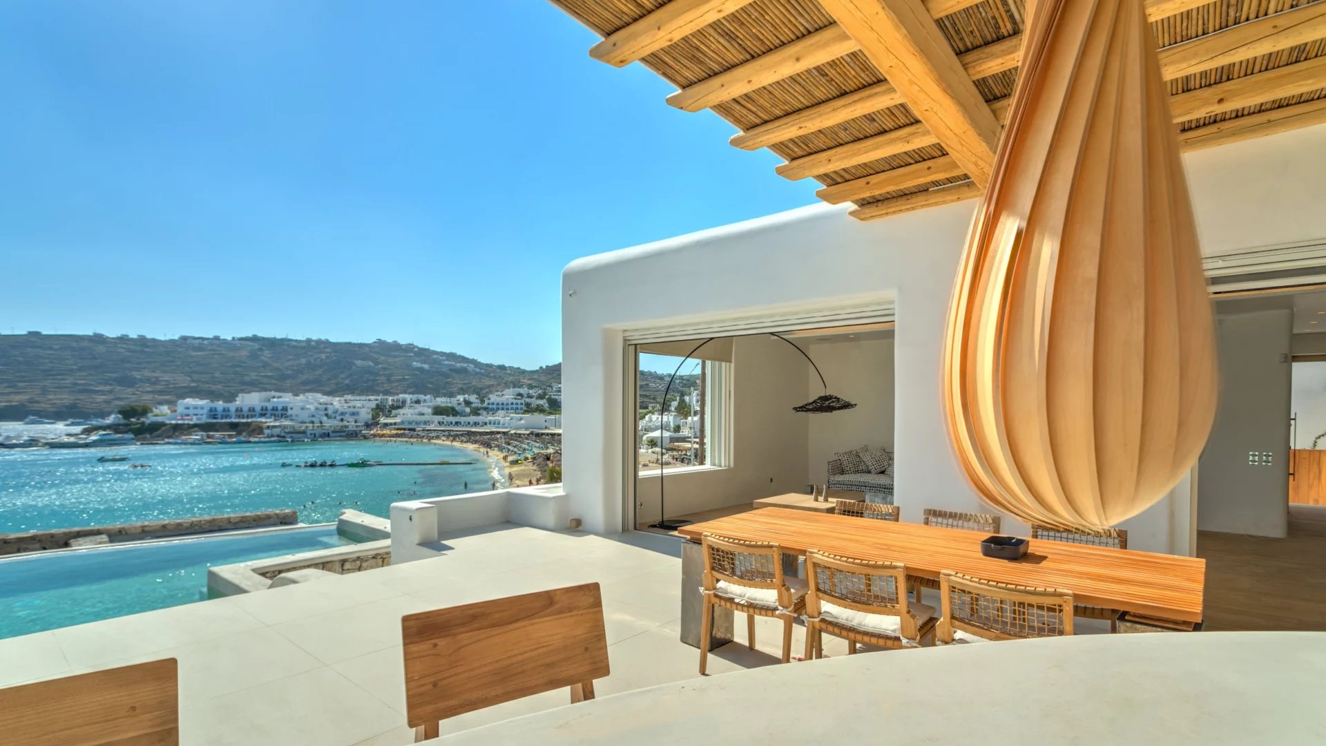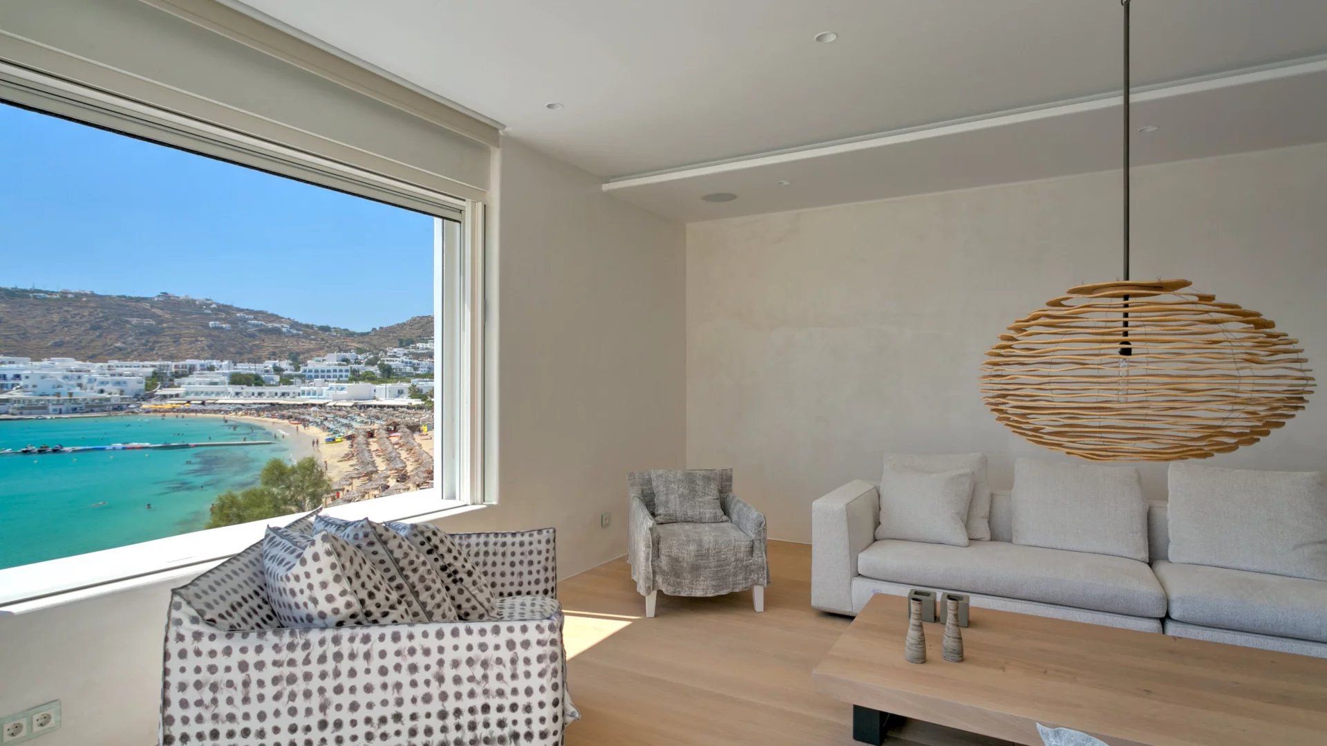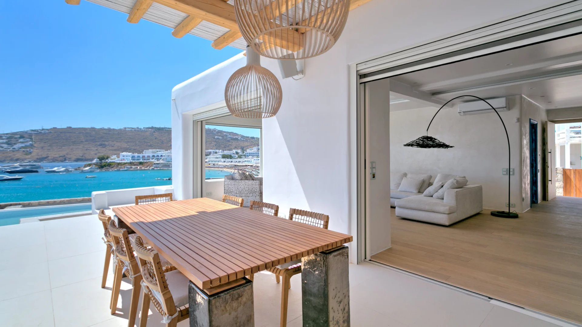 Villa Olivia is just above Platis Gyalos combining some of the most sought-after features for a holiday getaway. The property is reached by a narrow street and perched just above the beach of Platis Gyalos which literally is a few steps away from the front door.