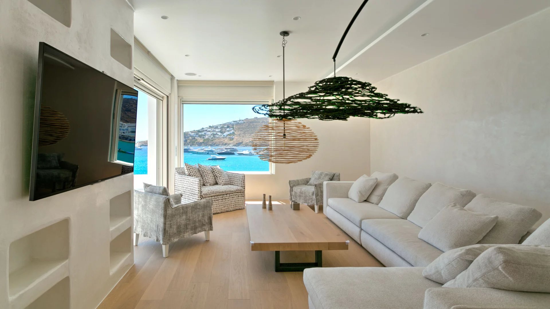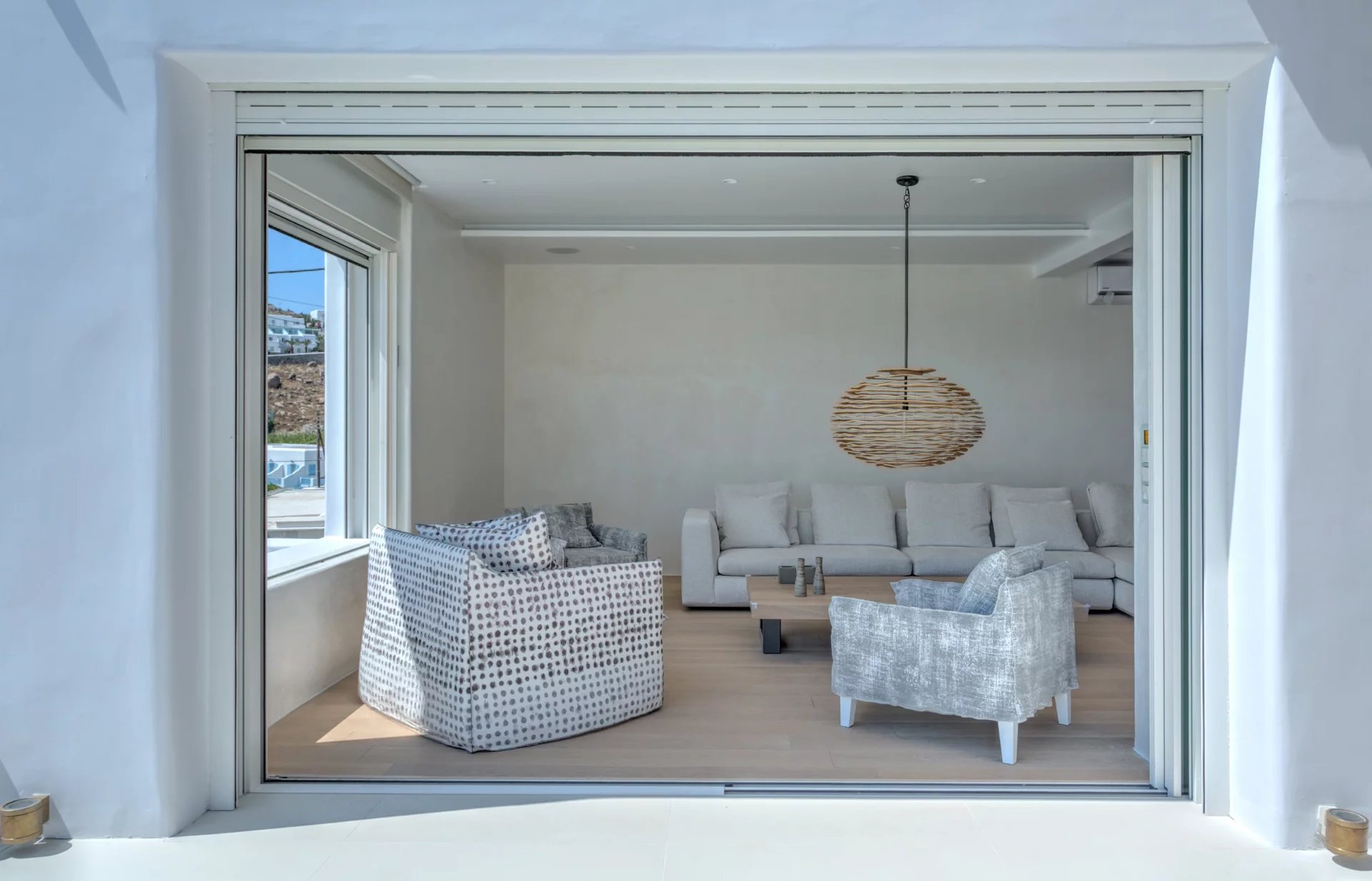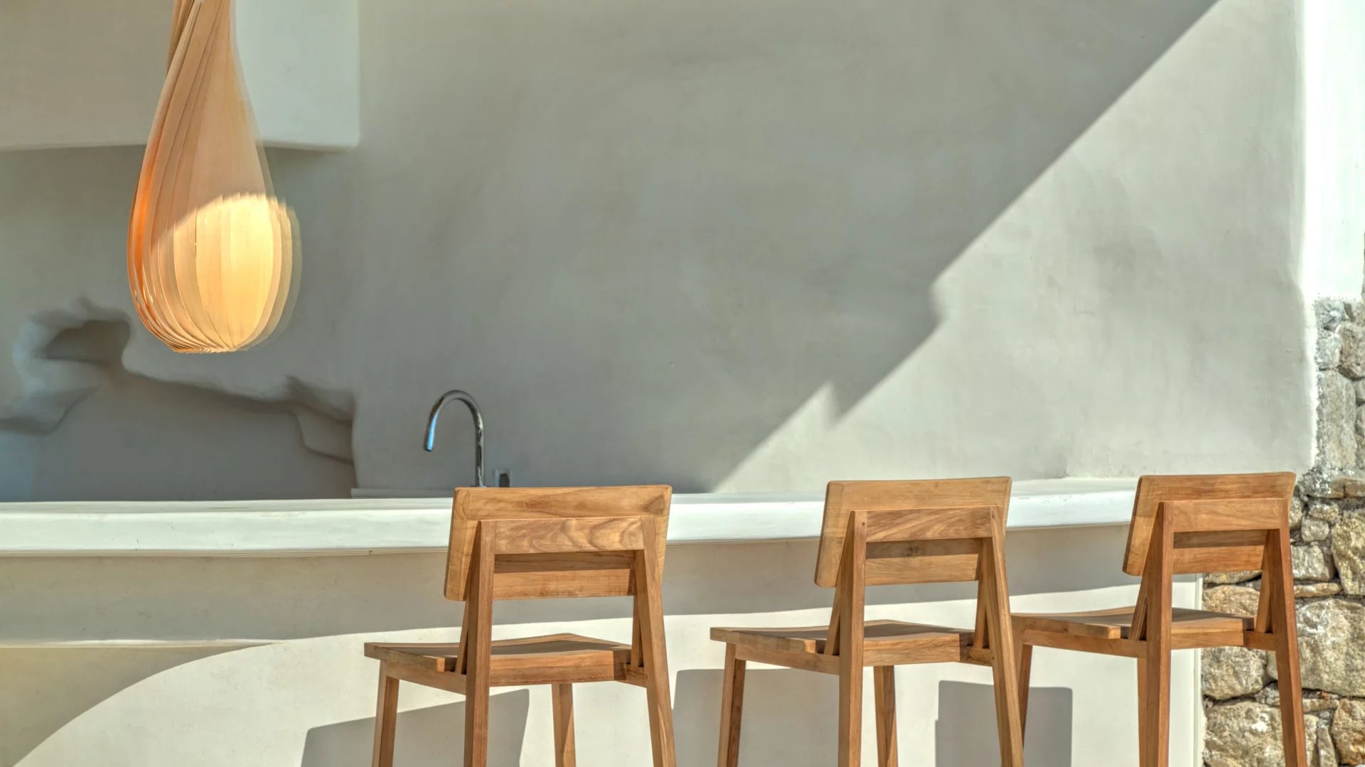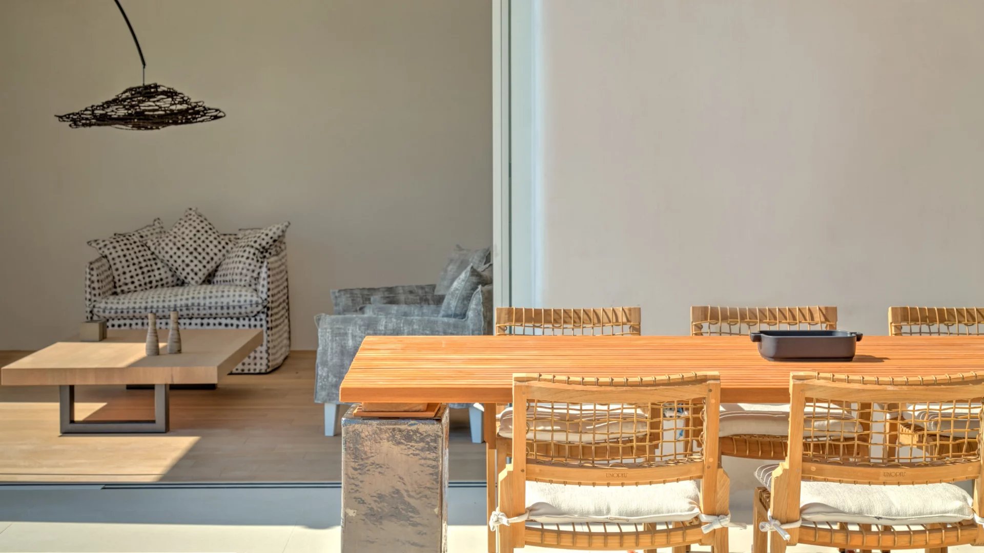 Indoors the same quality expressed in the outdoor spaces is immediately evident. The living areas all make the best out of the view and spill directly onto the terrace, providing all modern comforts in a discrete and airy atmosphere. A grand use of wood mixed with light-colored cement surfaces is featured throughout in addition to a minimal approach thrown in the mix when it comes to furnishing.