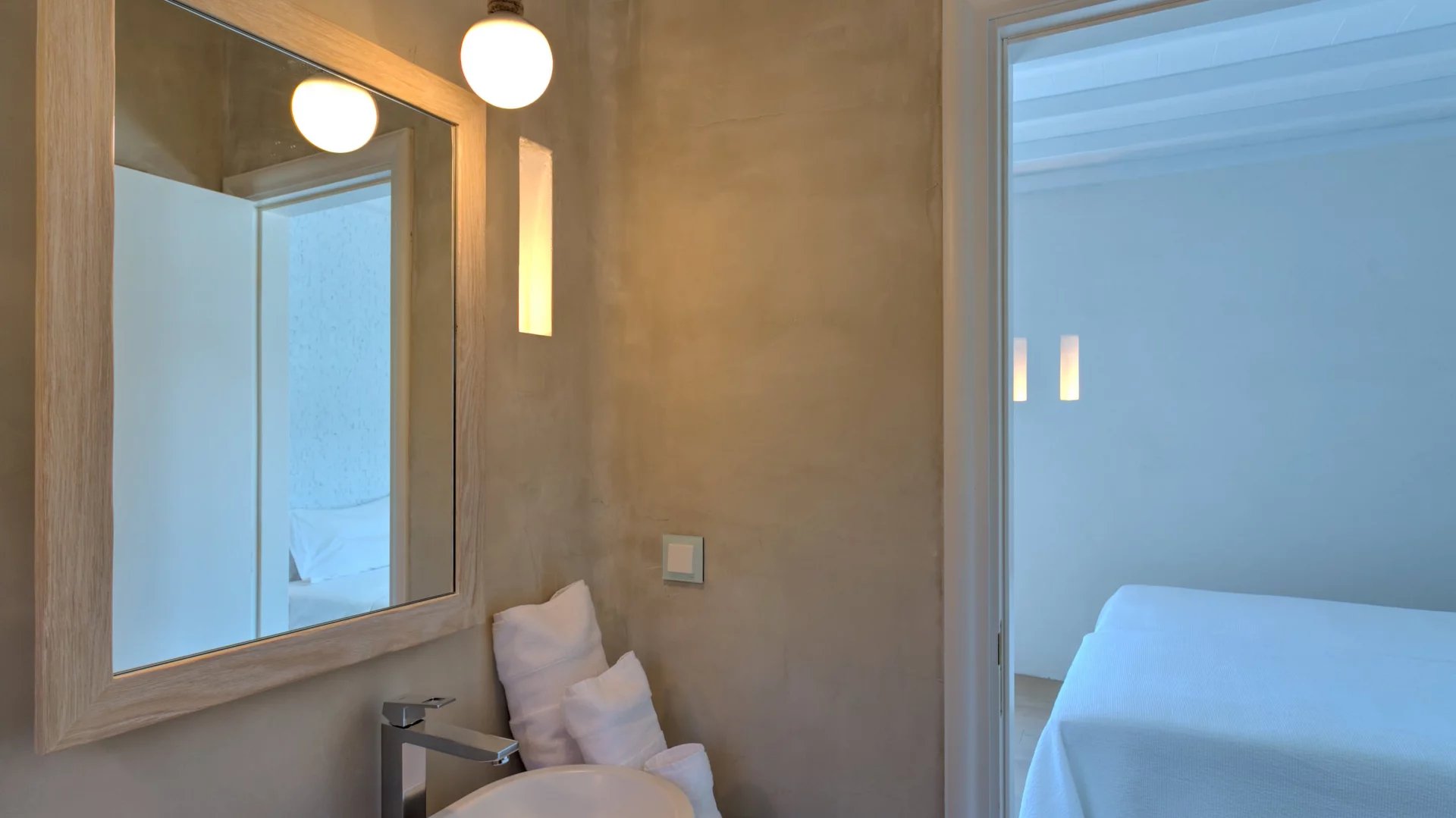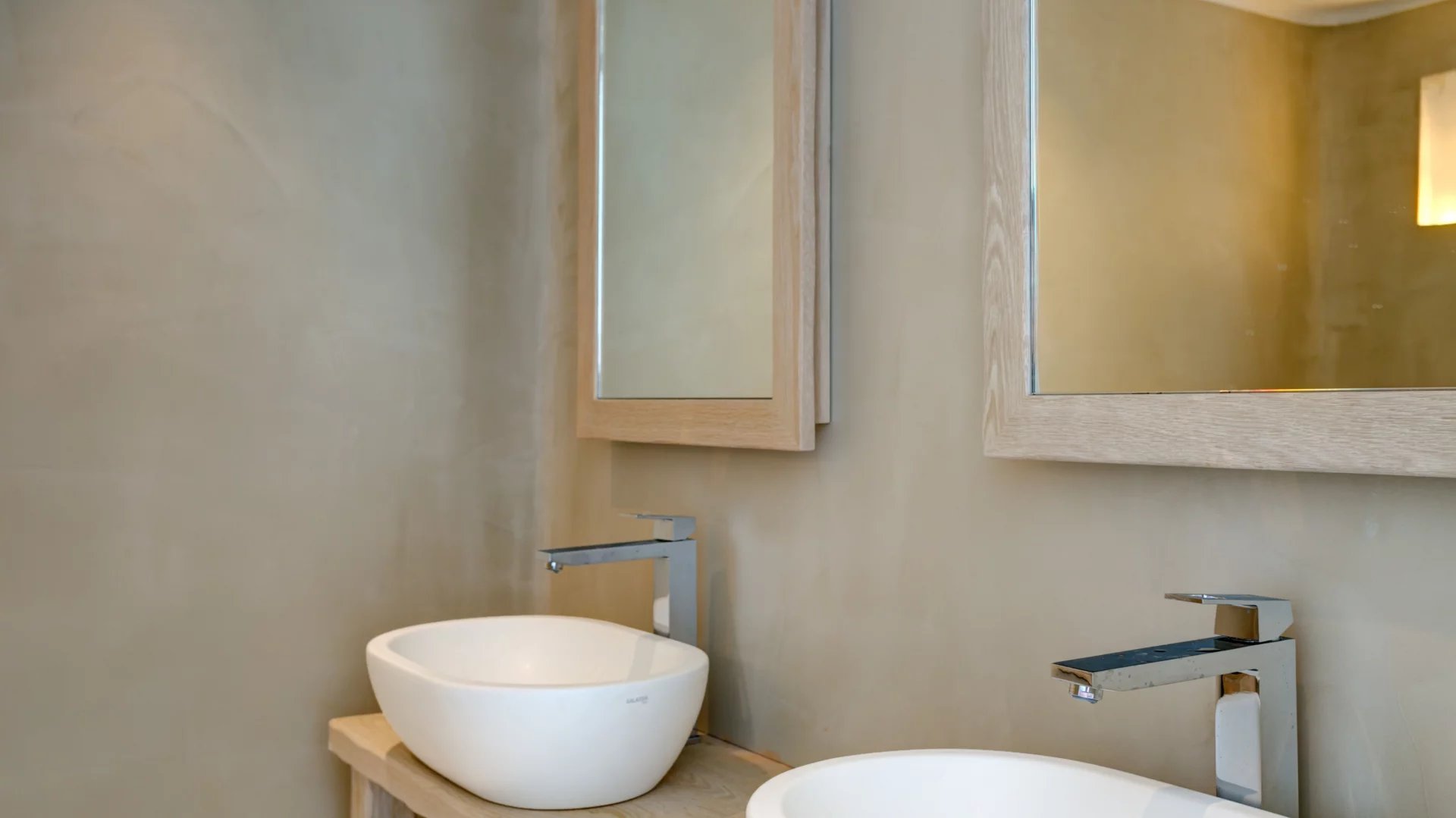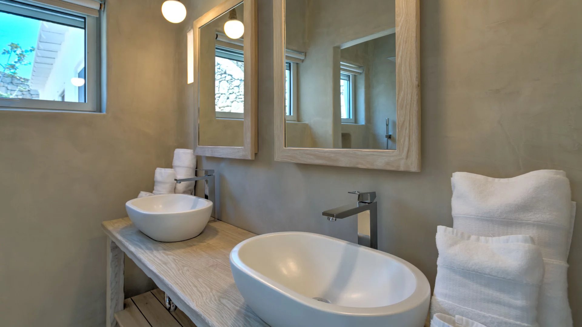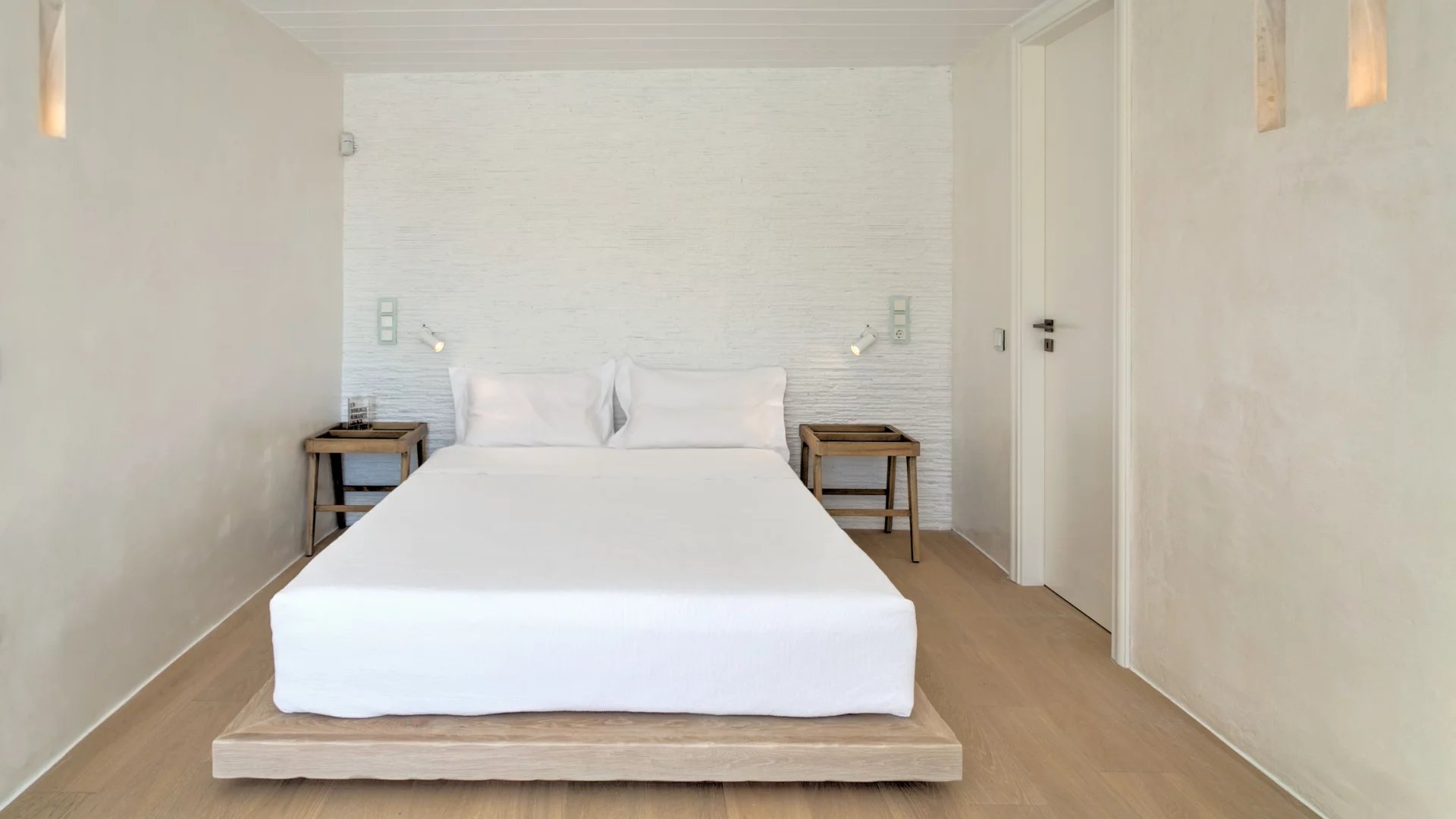 Indoors the same quality expressed in the outdoor spaces is immediately evident. The living areas all make the best out of the view and spill directly onto the terrace, providing all modern comforts in a discrete and airy atmosphere. A grand use of wood mixed with light-colored cement surfaces is featured throughout in addition to a minimal approach thrown in the mix when it comes to furnishing.