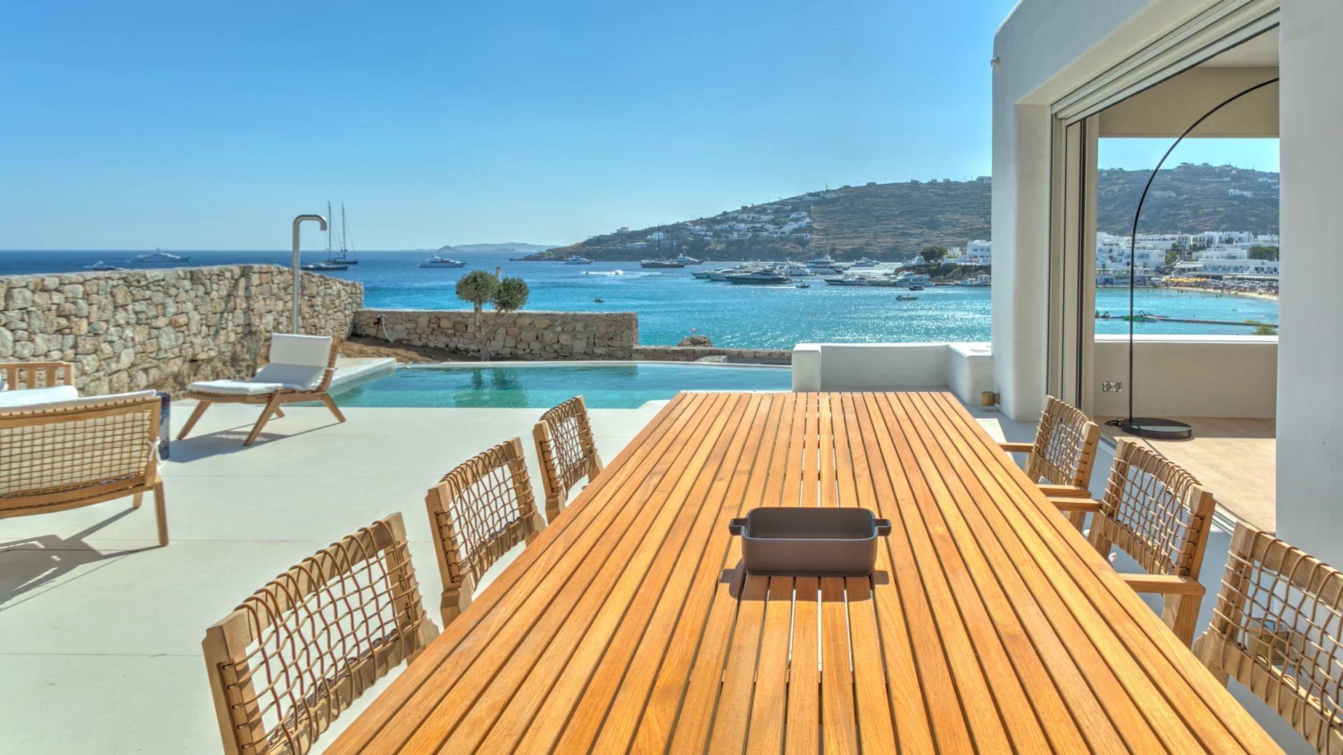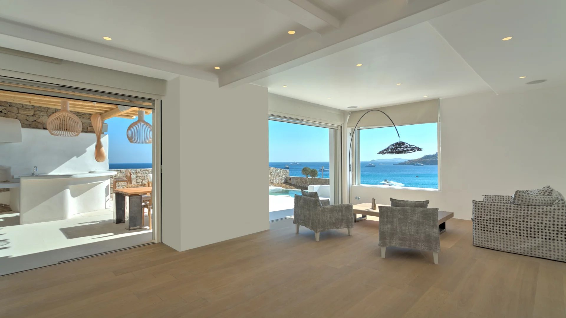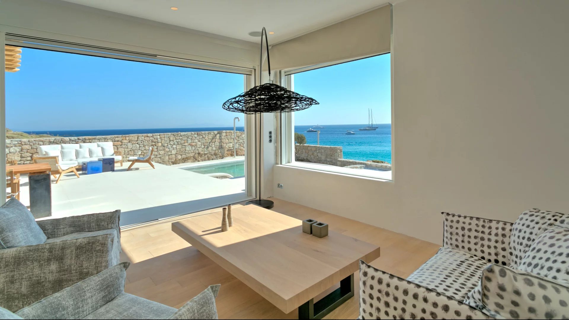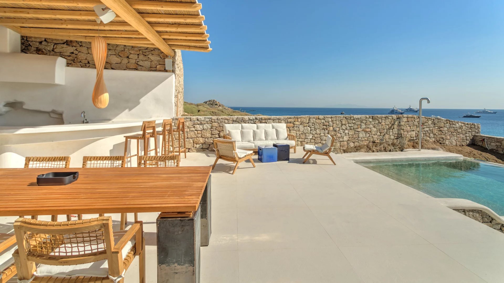 The outdoor spaces enjoy unparalleled view towards the sea, making the most of the location and allowing guests to enjoy their holidays in all comfort. The stylish terrace gradually descends into the villa’s private pool, positioned to the front of the property.