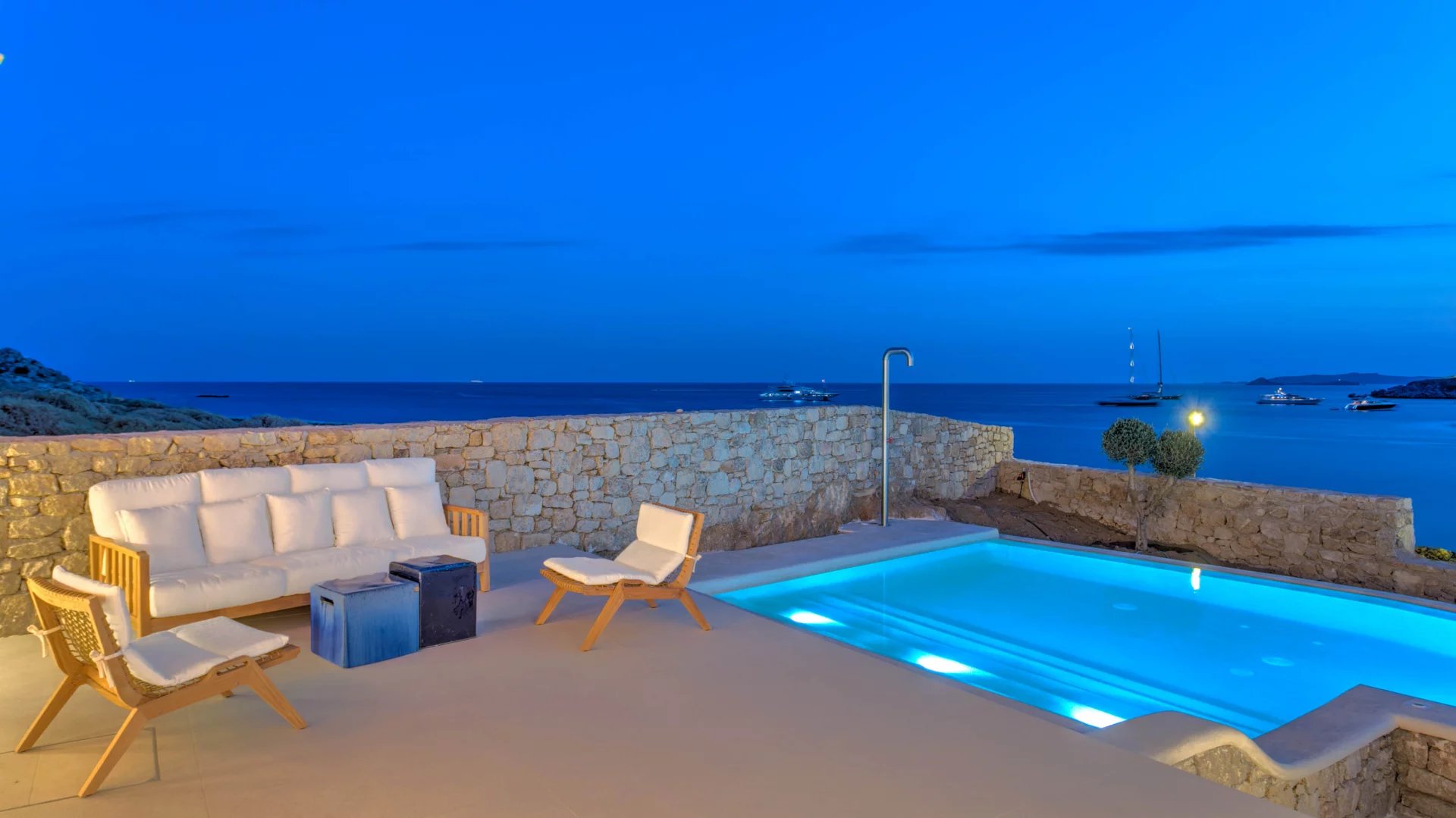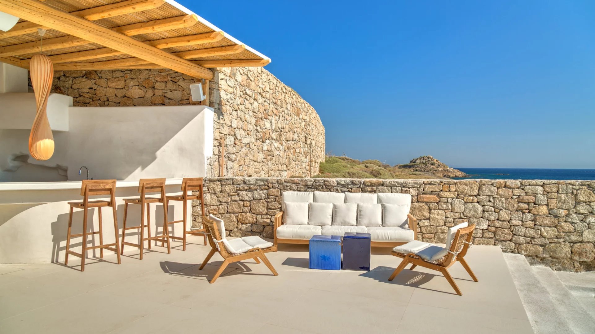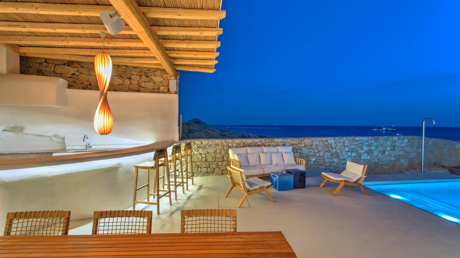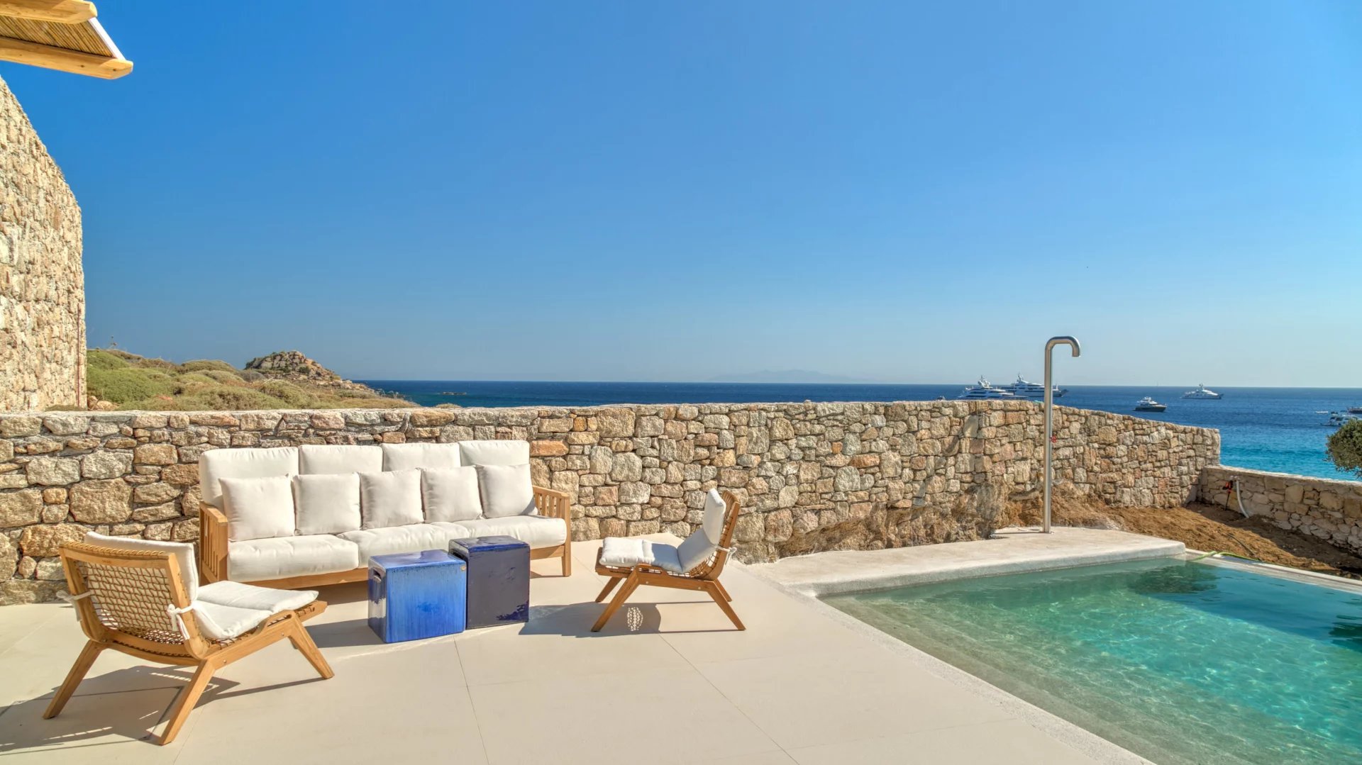 The outdoor spaces enjoy unparalleled view towards the sea, making the most of the location and allowing guests to enjoy their holidays in all comfort. The stylish terrace gradually descends into the villa’s private pool, positioned to the front of the property.