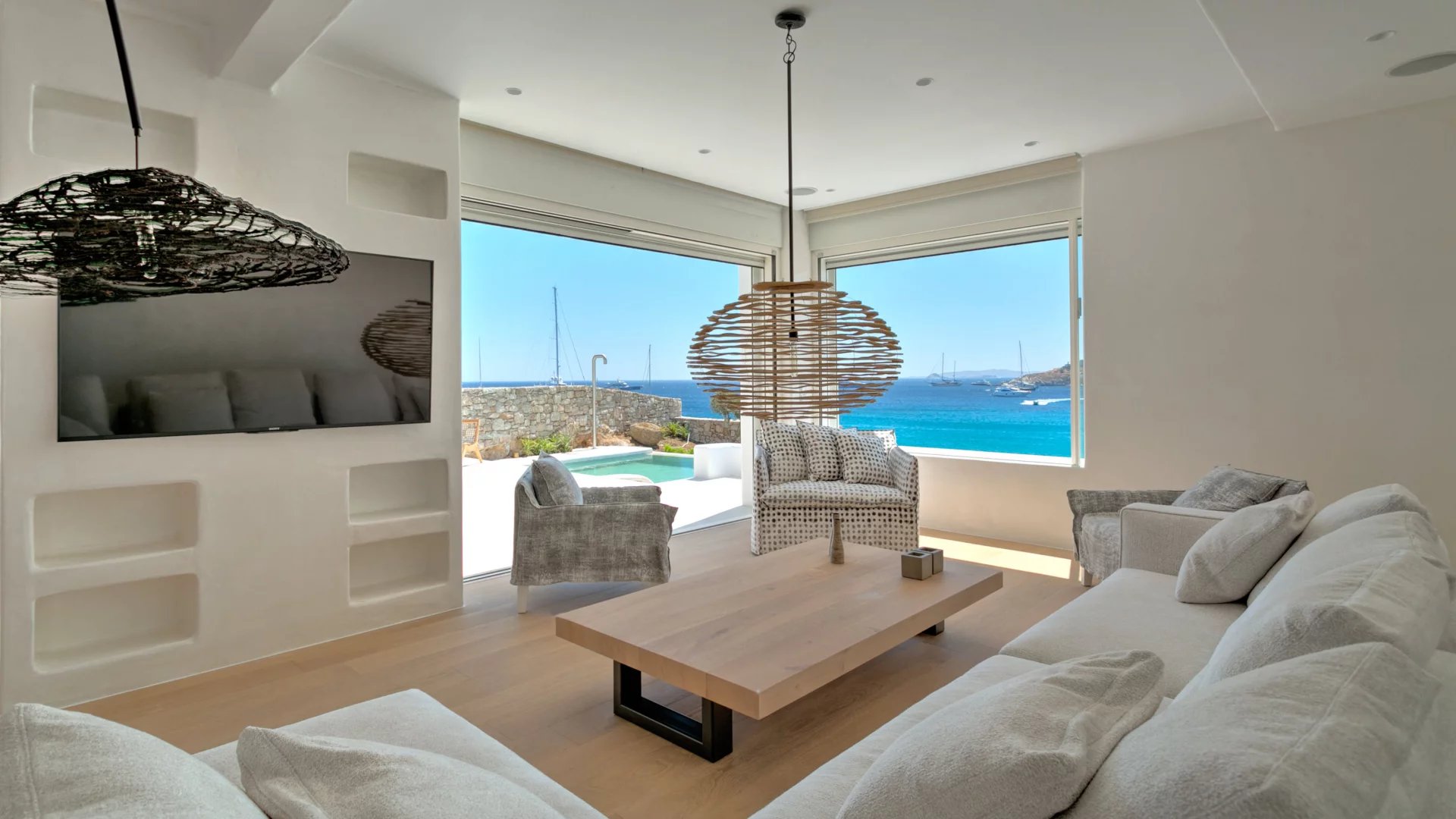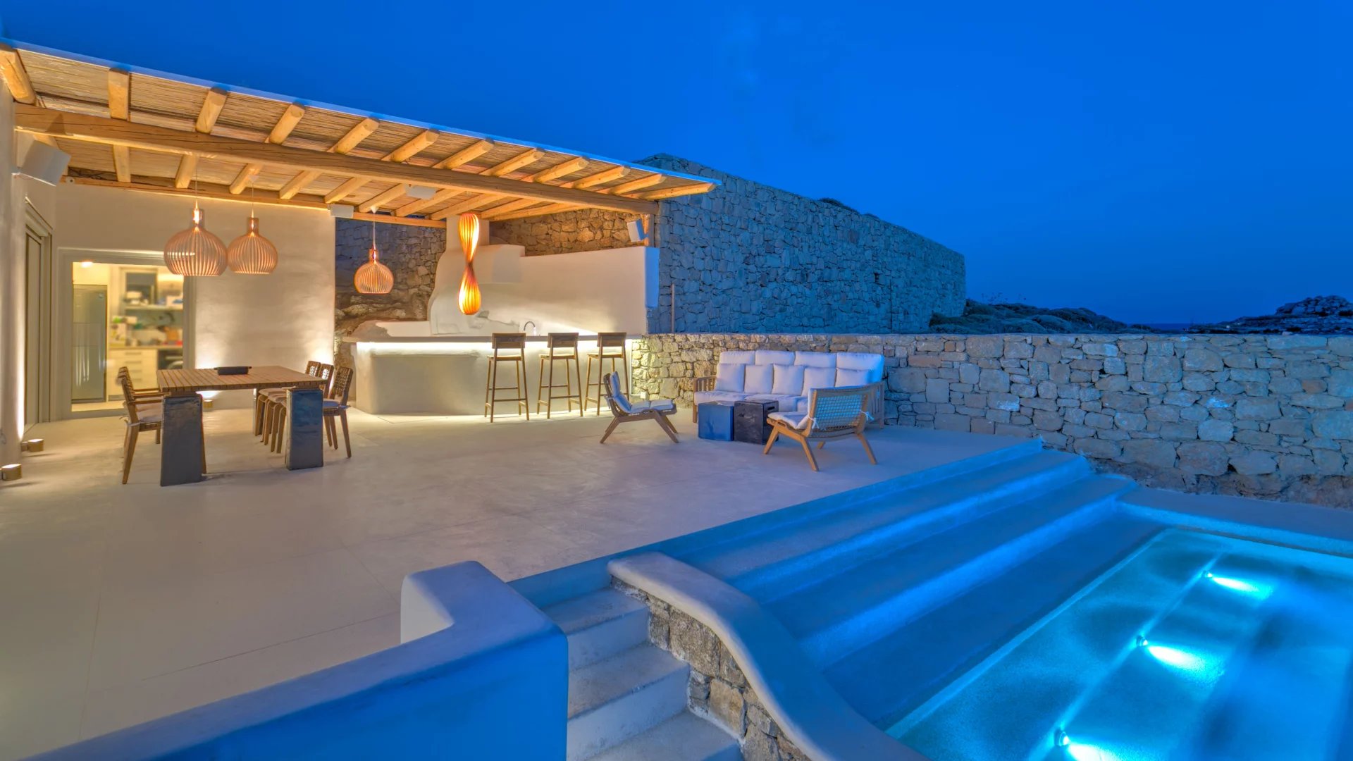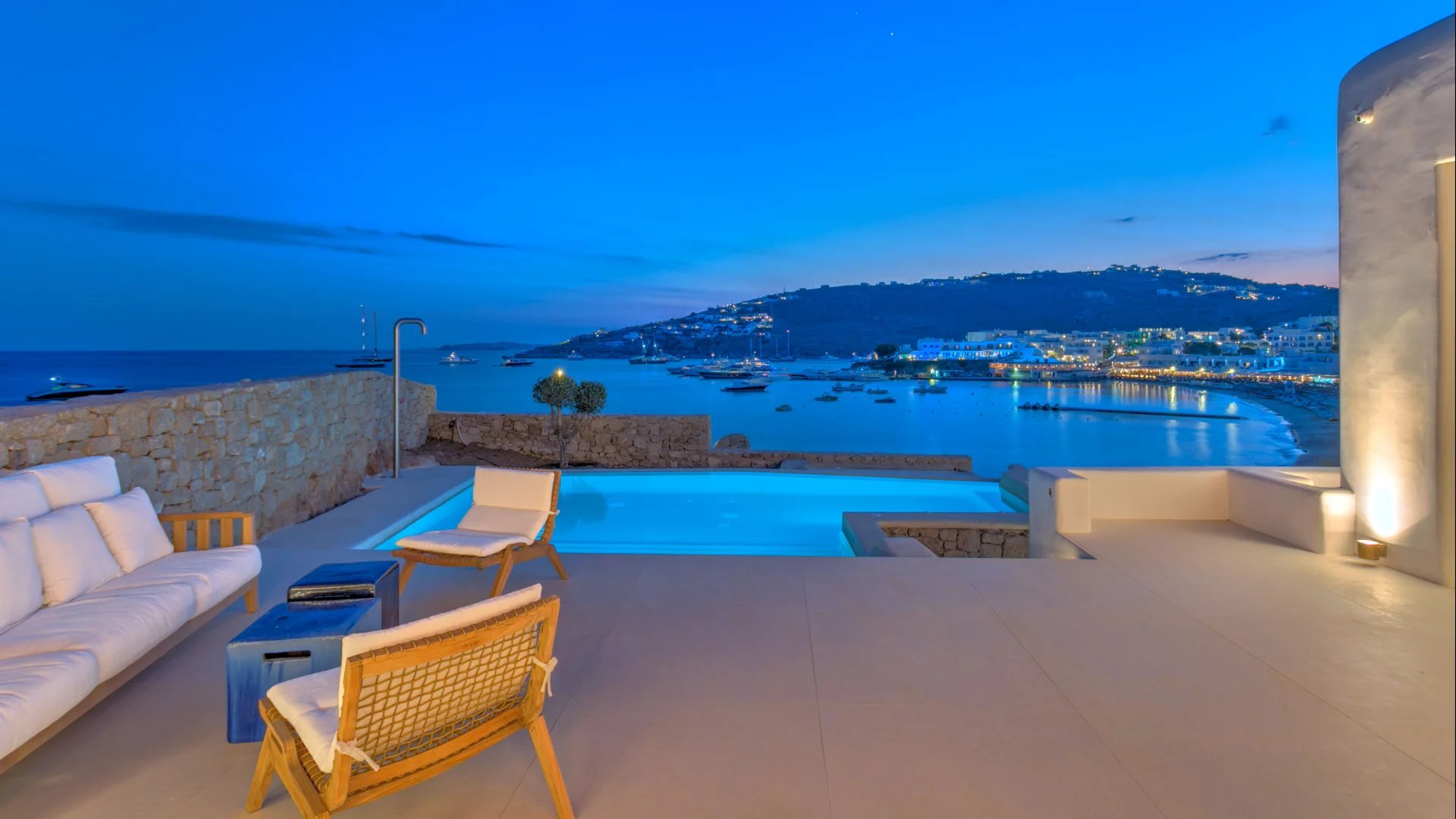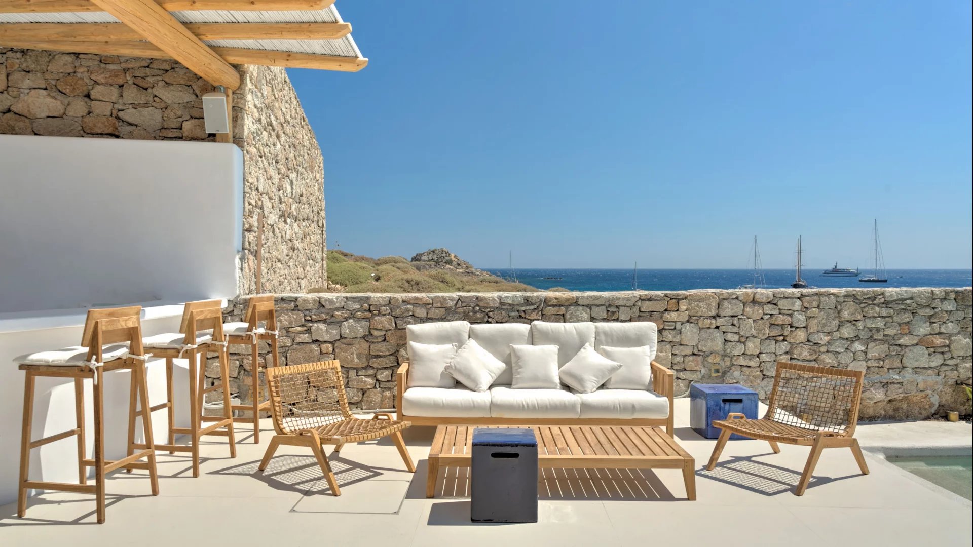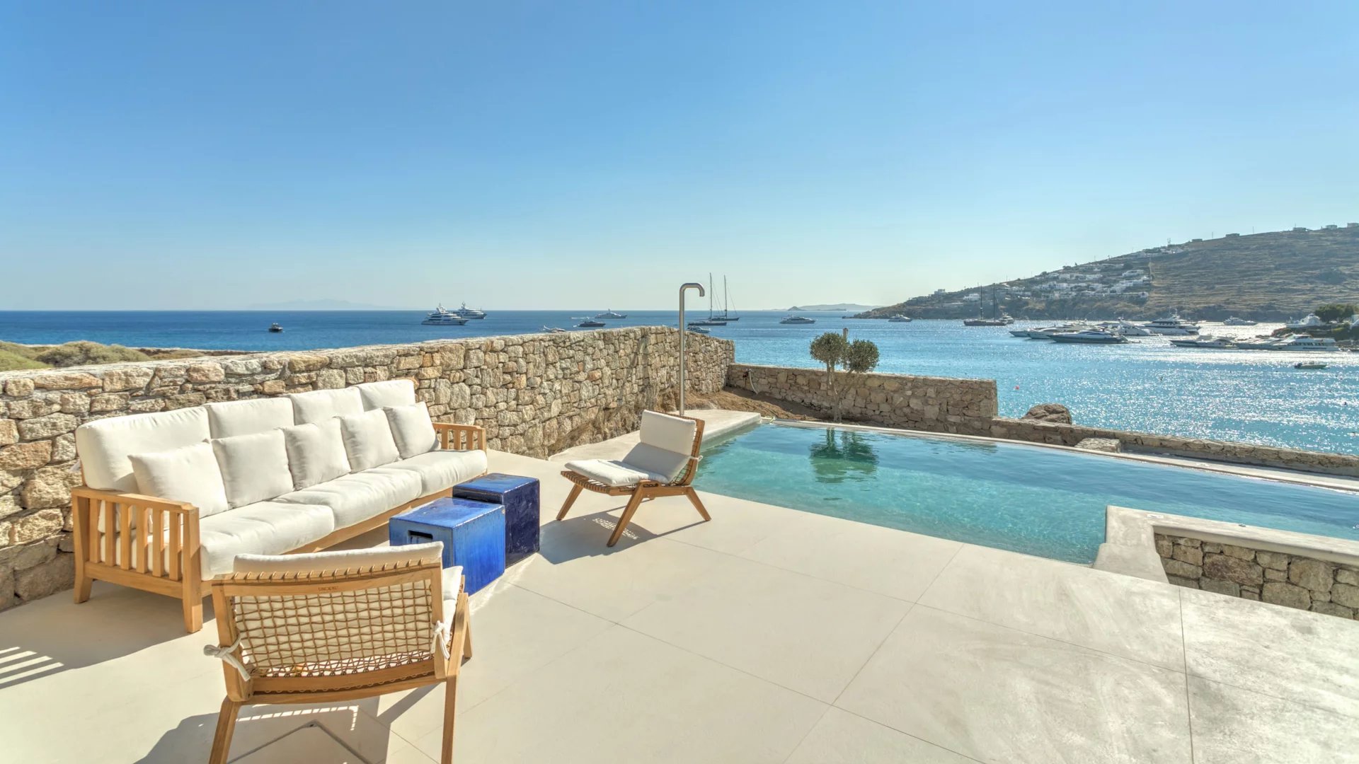 The outdoor spaces enjoy unparalleled view towards the sea, making the most of the location and allowing guests to enjoy their holidays in all comfort. The stylish terrace gradually descends into the villa’s private pool, positioned to the front of the property.