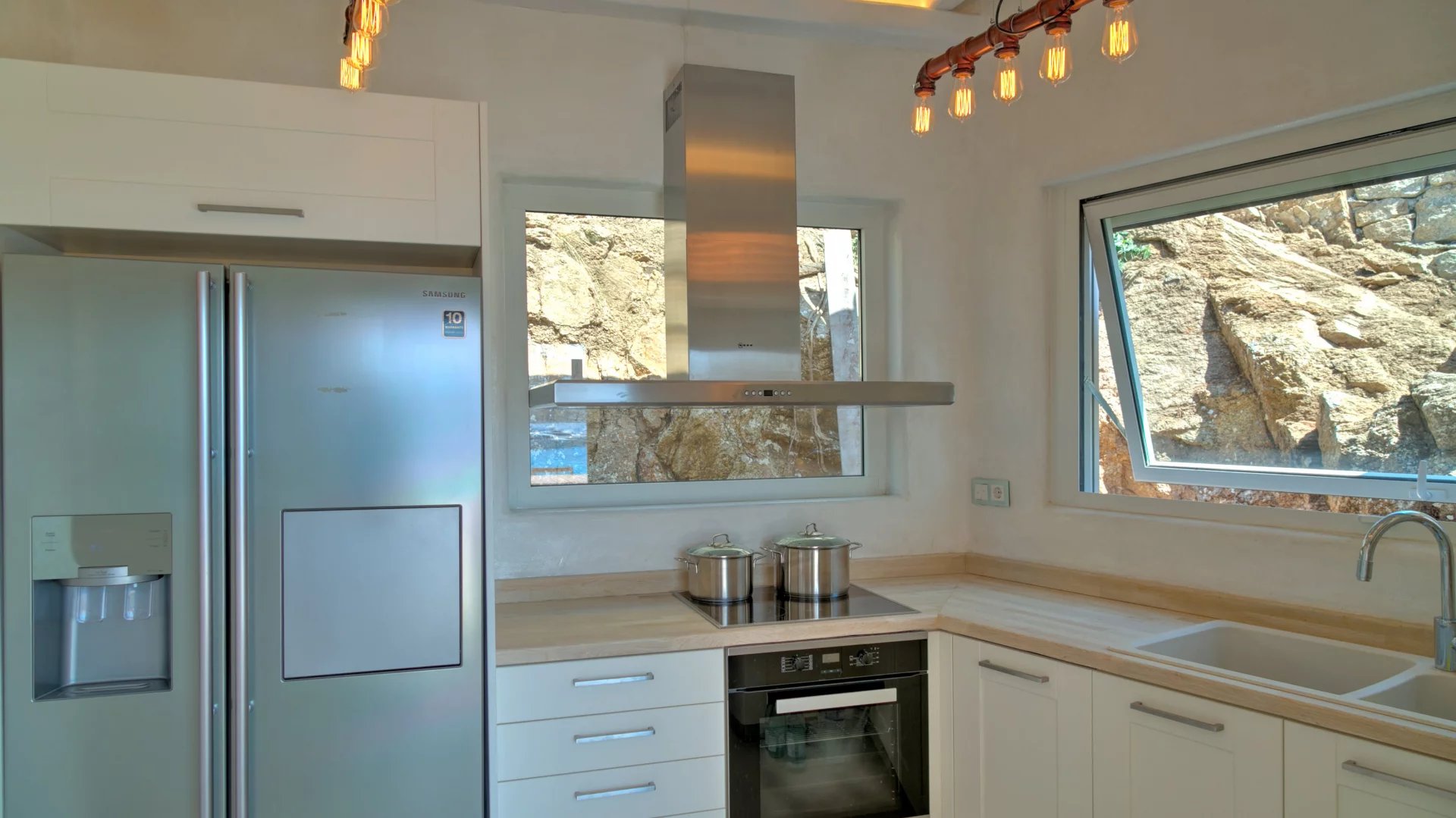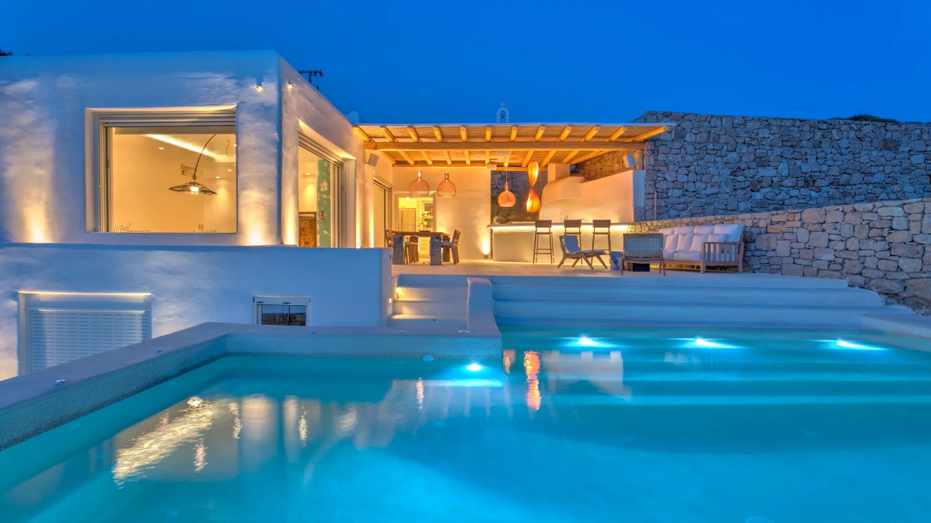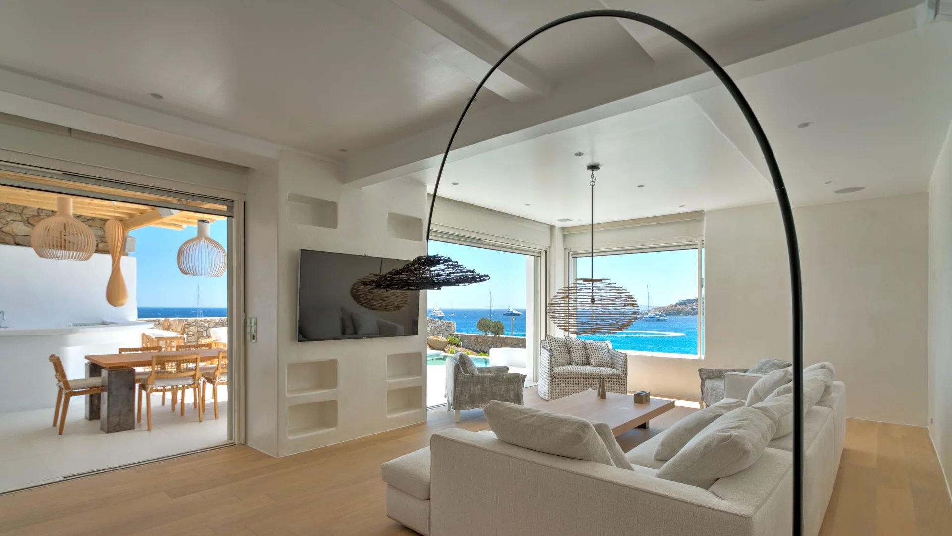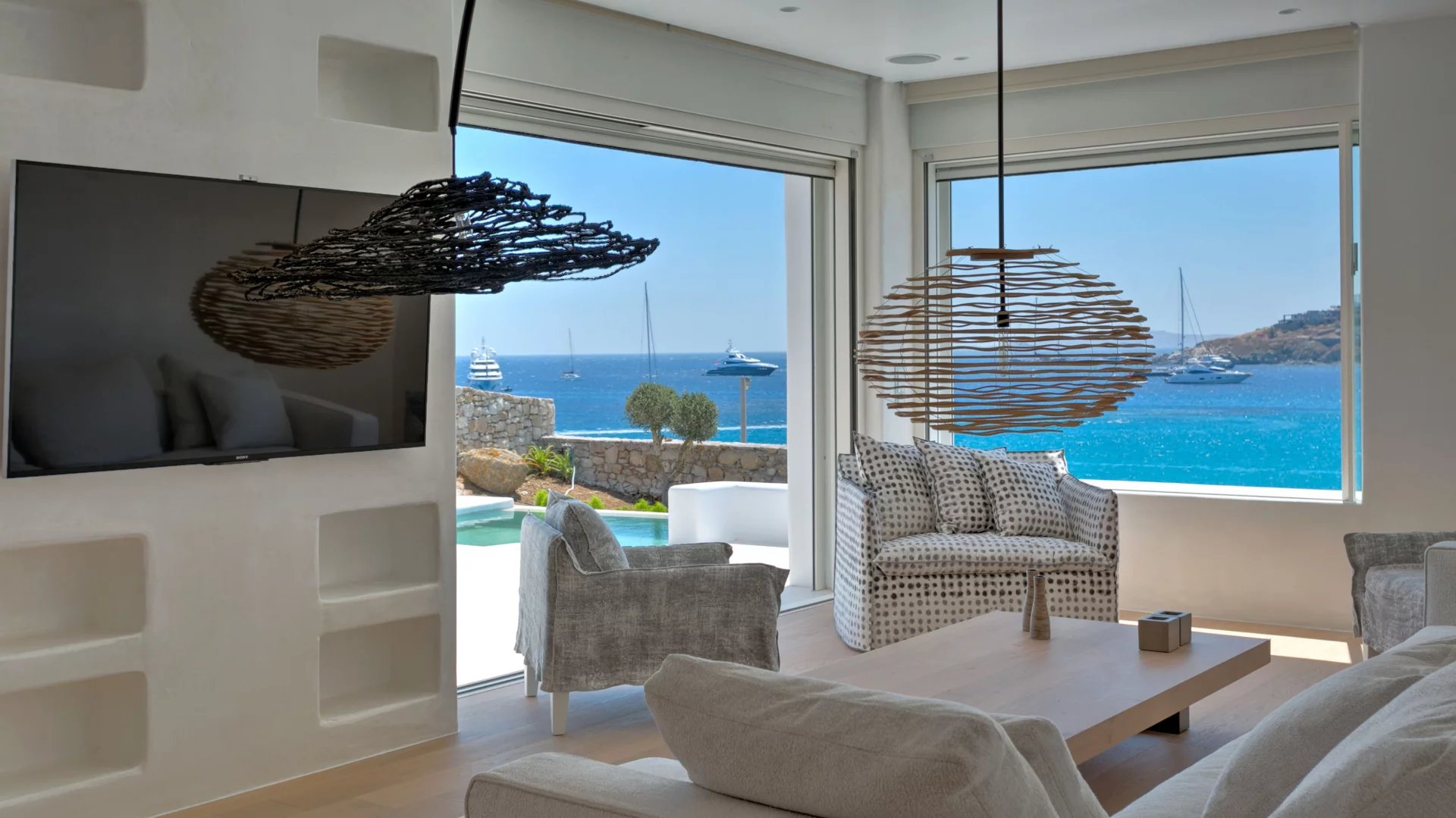 The outdoor spaces enjoy unparalleled view towards the sea, making the most of the location and allowing guests to enjoy their holidays in all comfort. The stylish terrace gradually descends into the villa’s private pool, positioned to the front of the property.