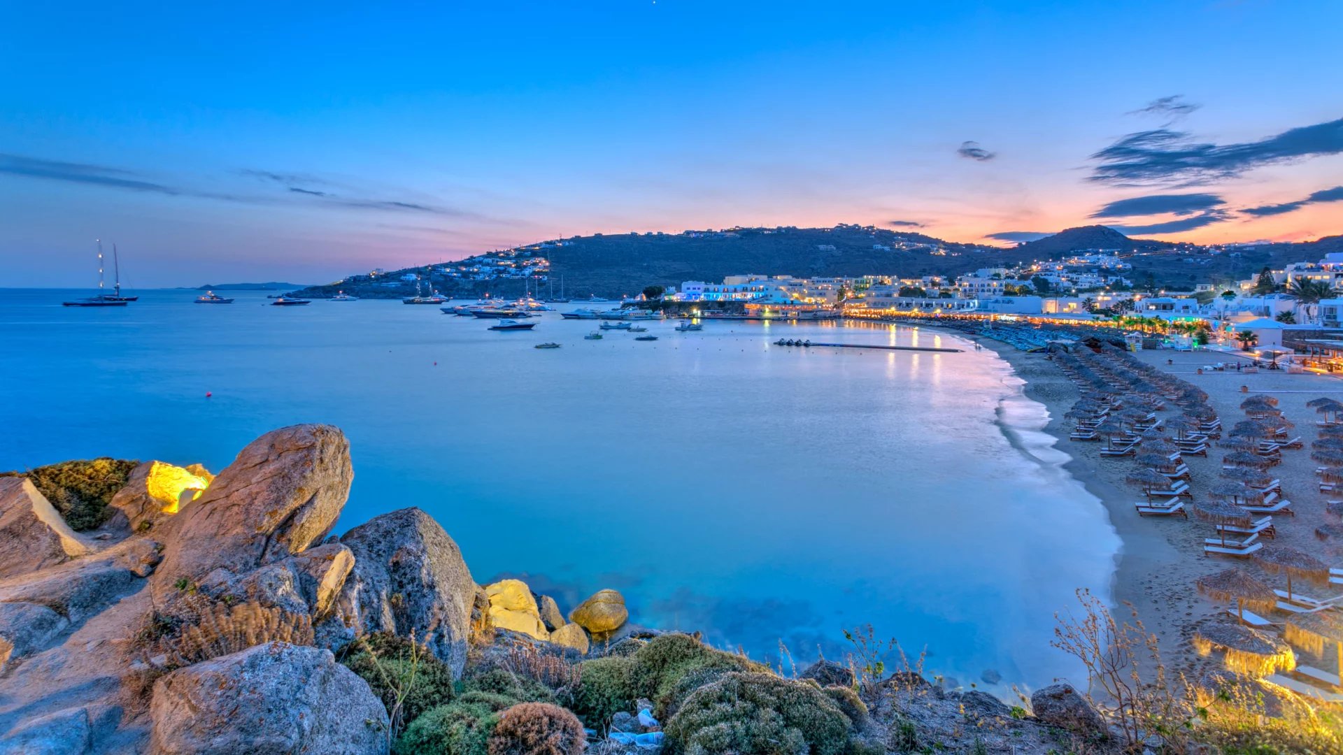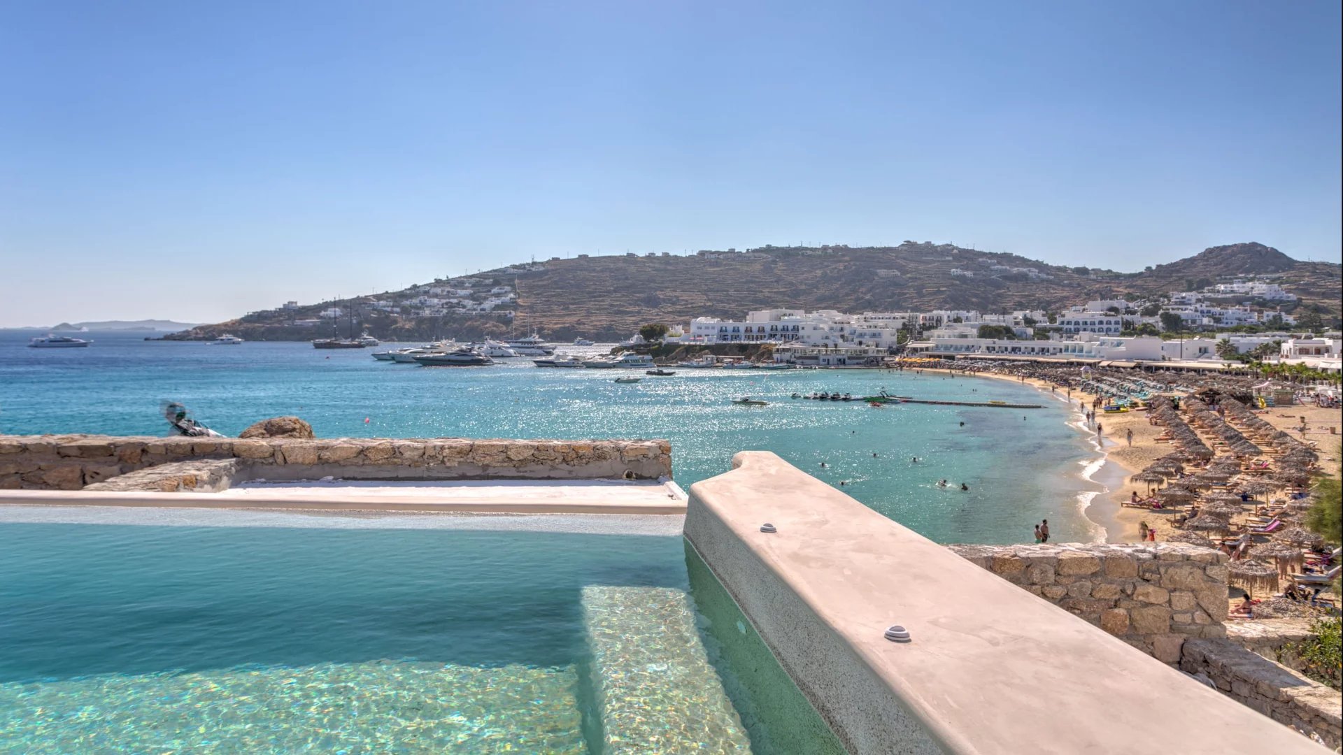 Also within walking distance is the beach of Agia Anna/Paranga, reachable via an unpaved path. The view is stretching out over the bay of Platis Gyalos with all the colorful beach umbrellas and moored yachts in the background.