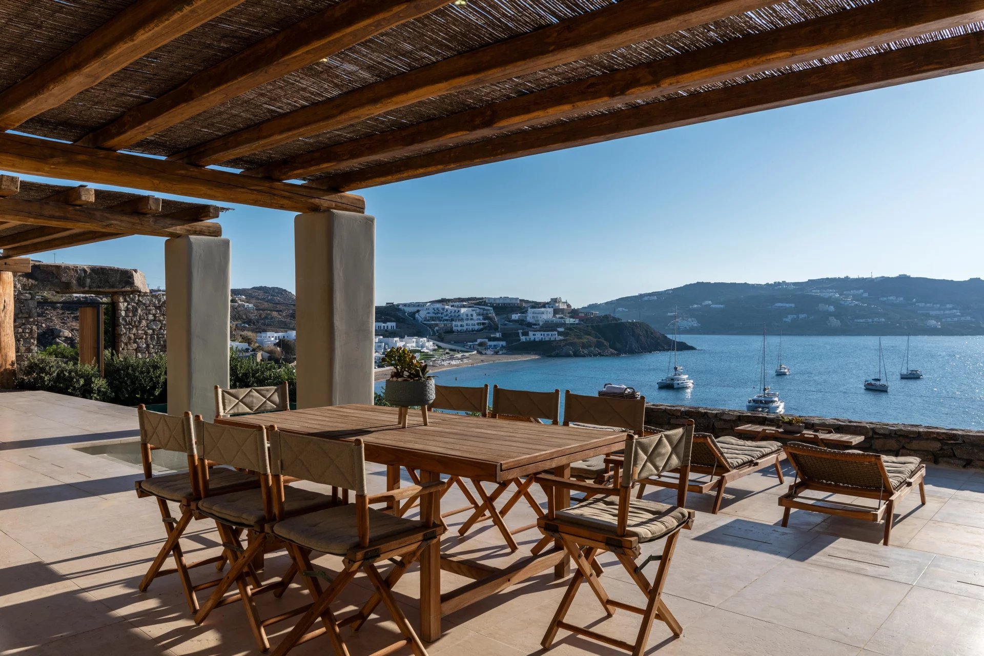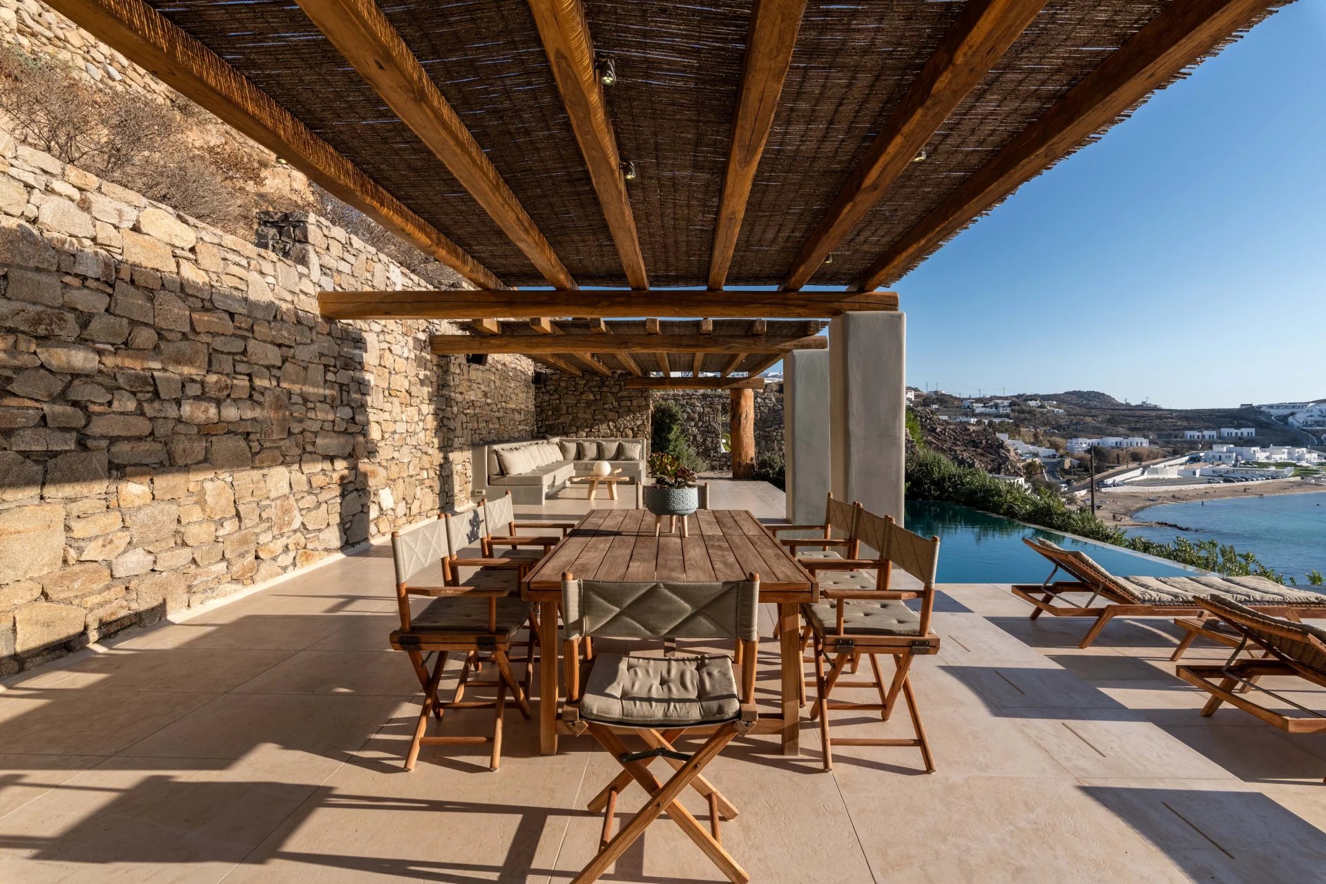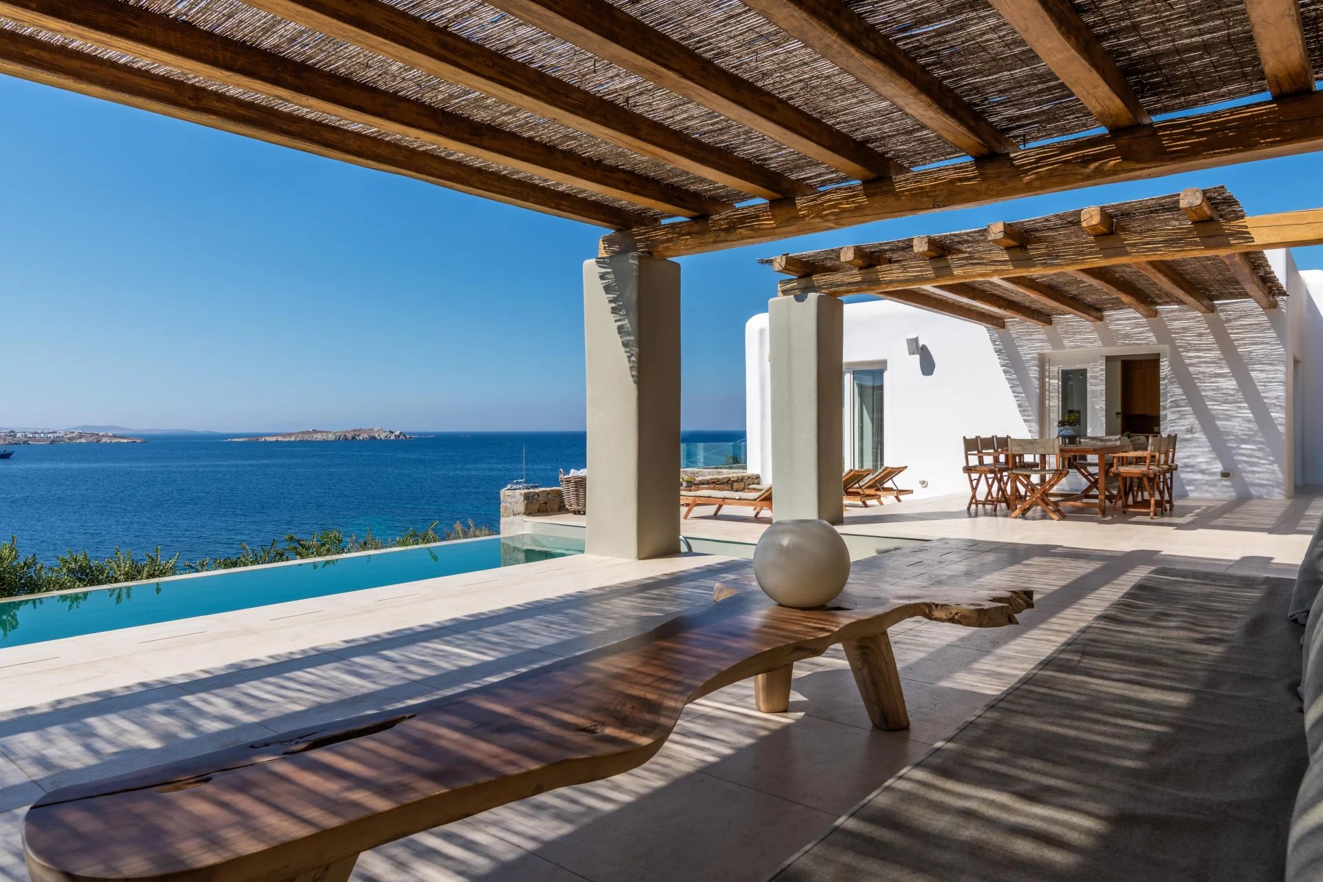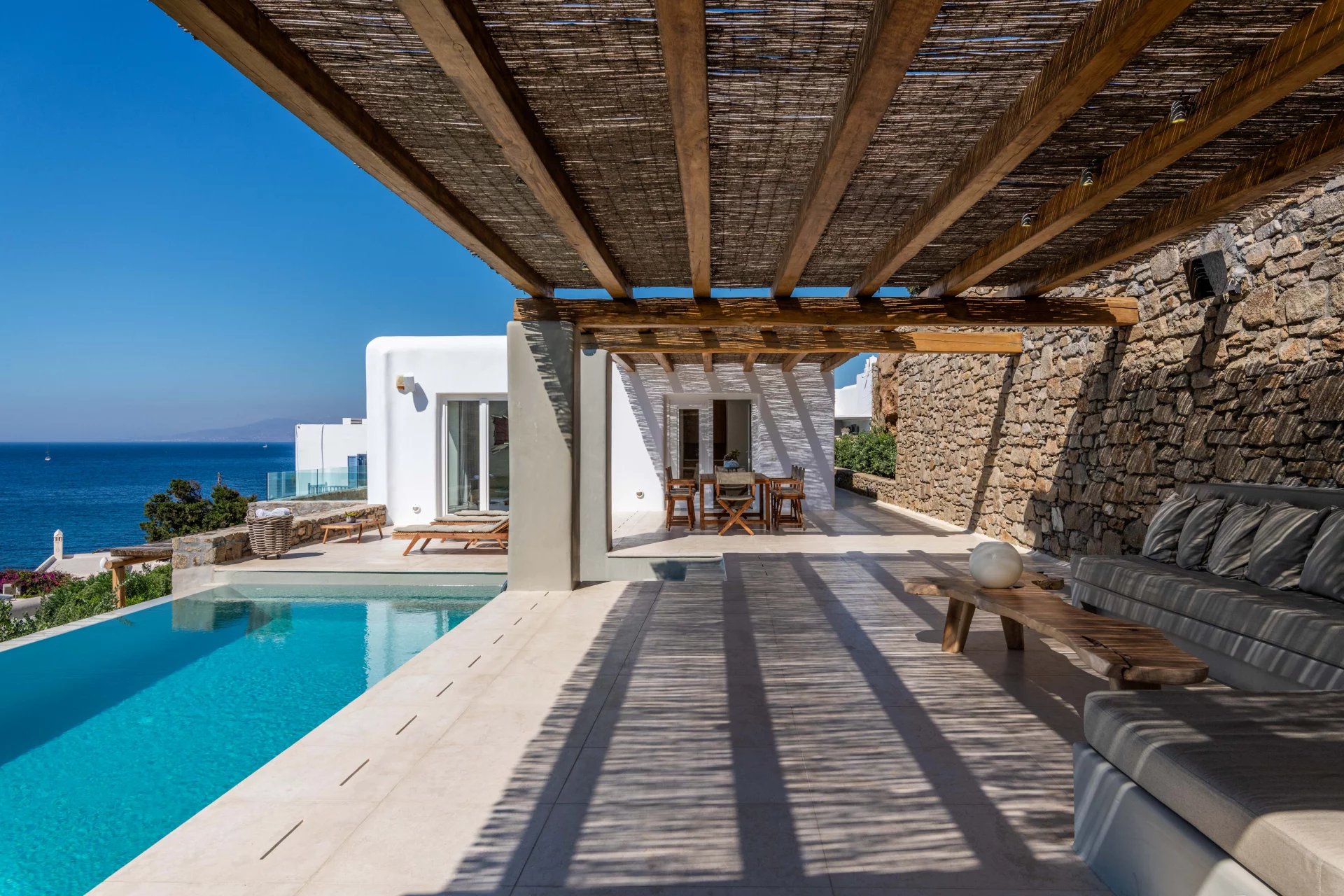 The 2nd Villa is slightly larger in scale, complete with a full size Boffi kitchen and outdoor shower. The main level contains 2 suites and a third is located just below the main patio area. The patio area encompasses a large built in seating area that is shaded by a pergola, sun loungers and an infinity pool. The patio wraps around the side of the villa where an outdoor eating area has easy access to the kitchen with a full view of Megali Ammos beach and Canalia in the distance. The dining room table accommodates 6 people in comfort, as does the salon area.