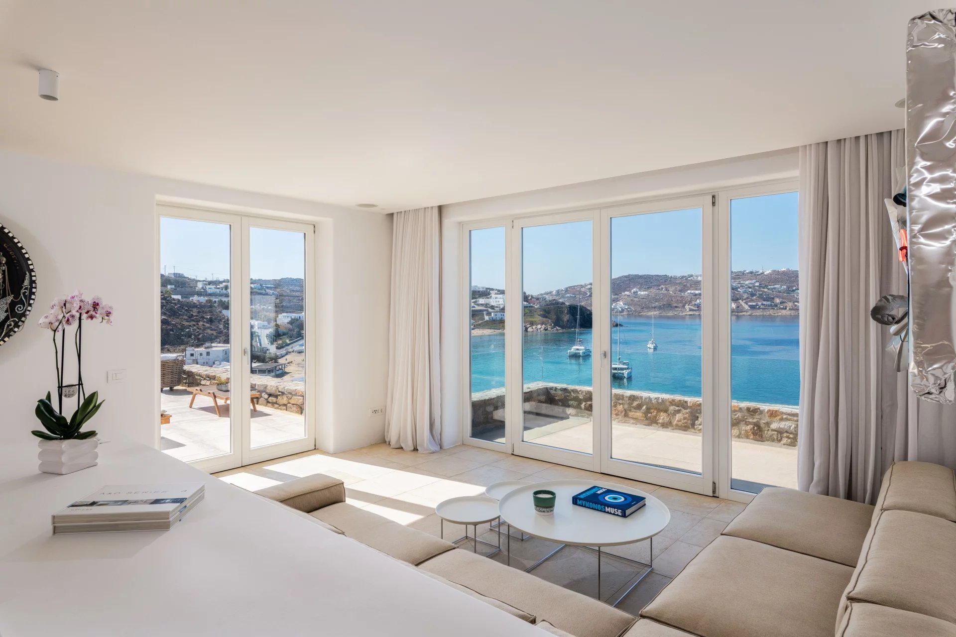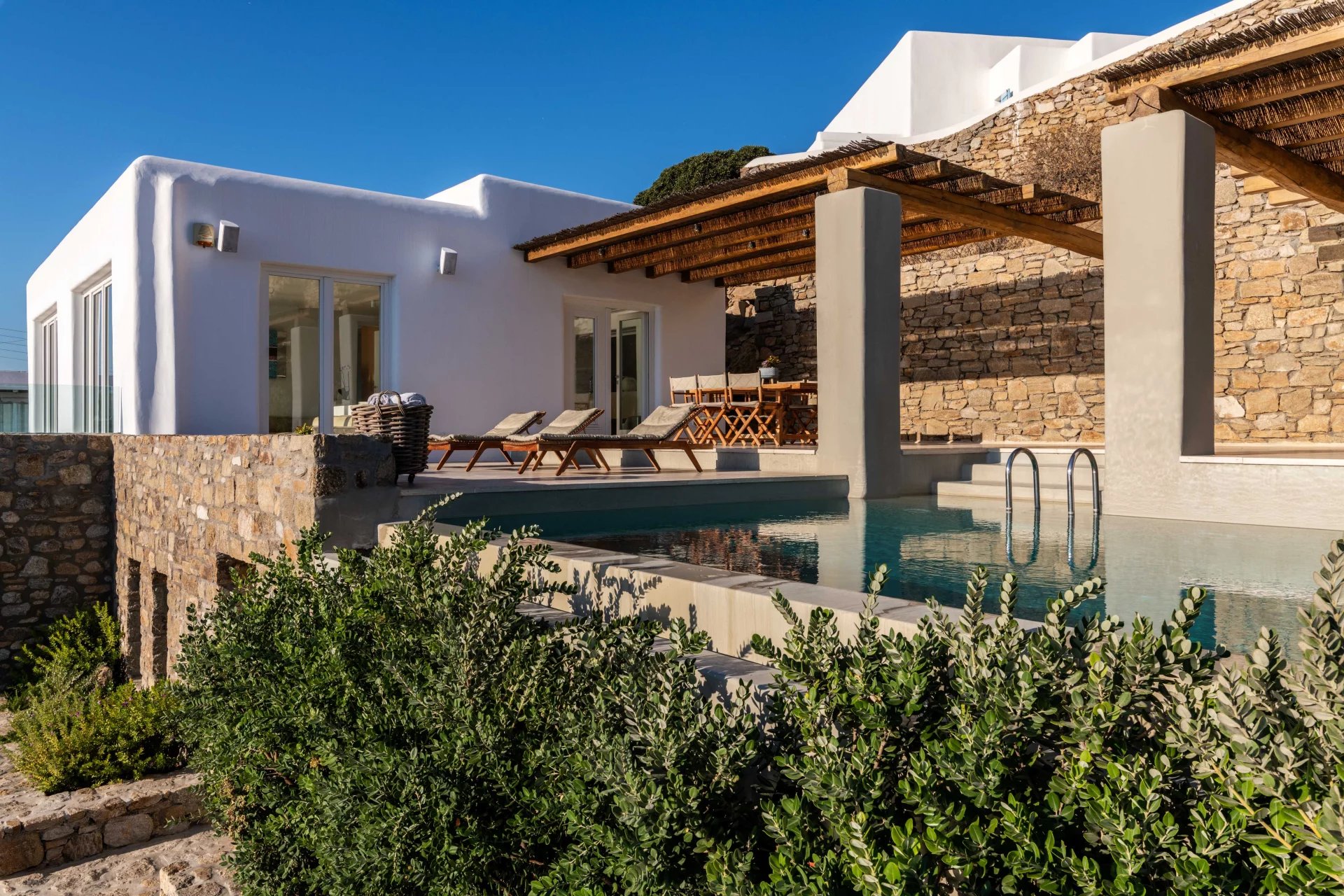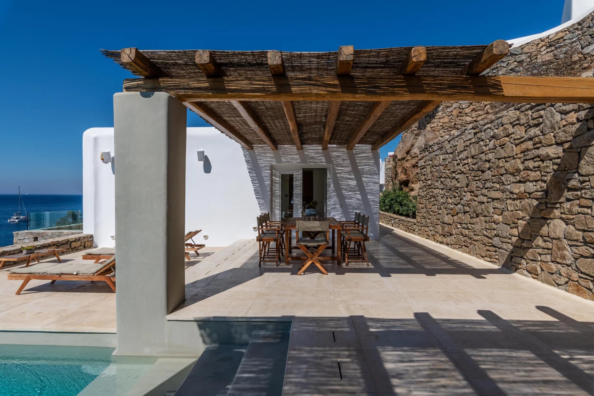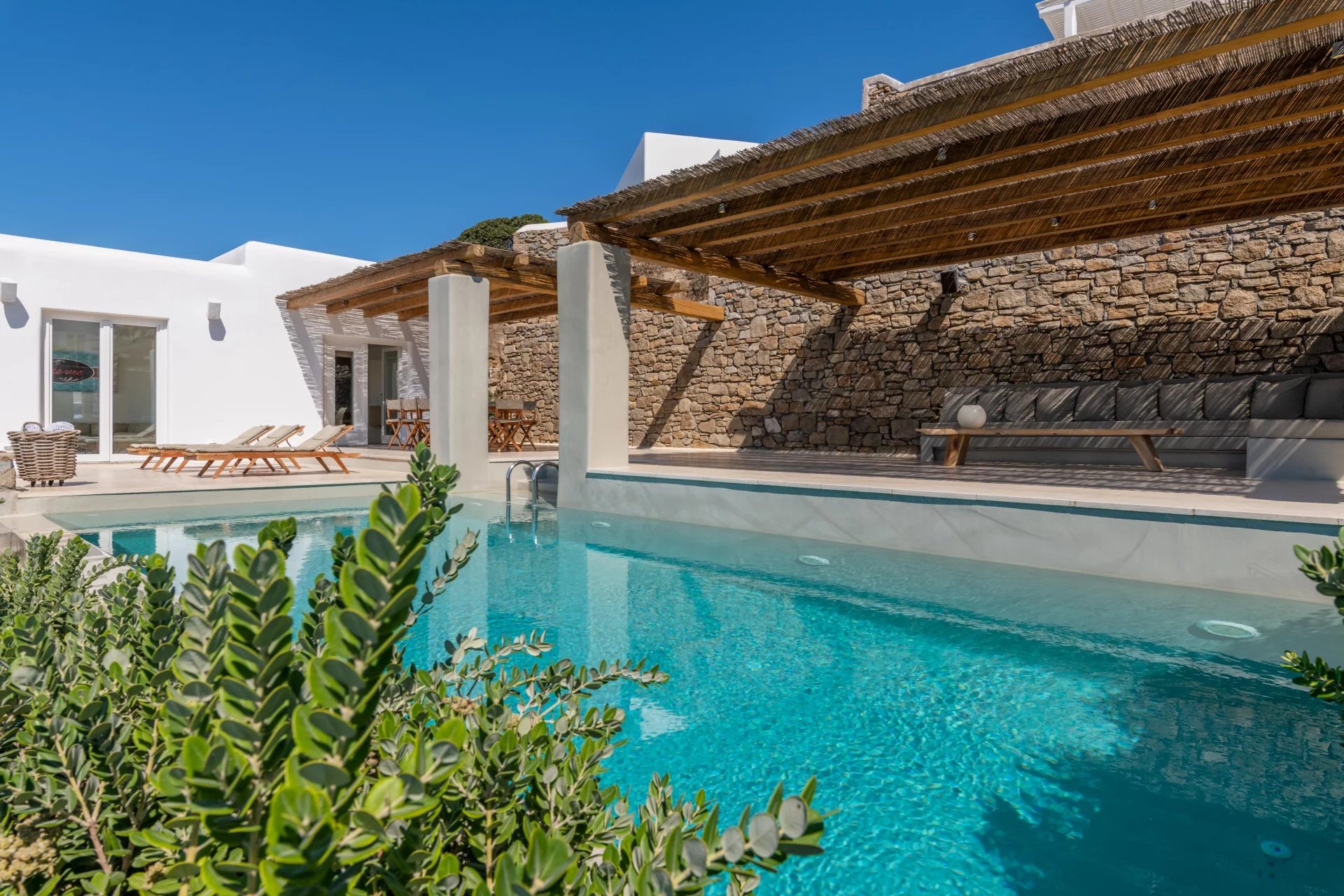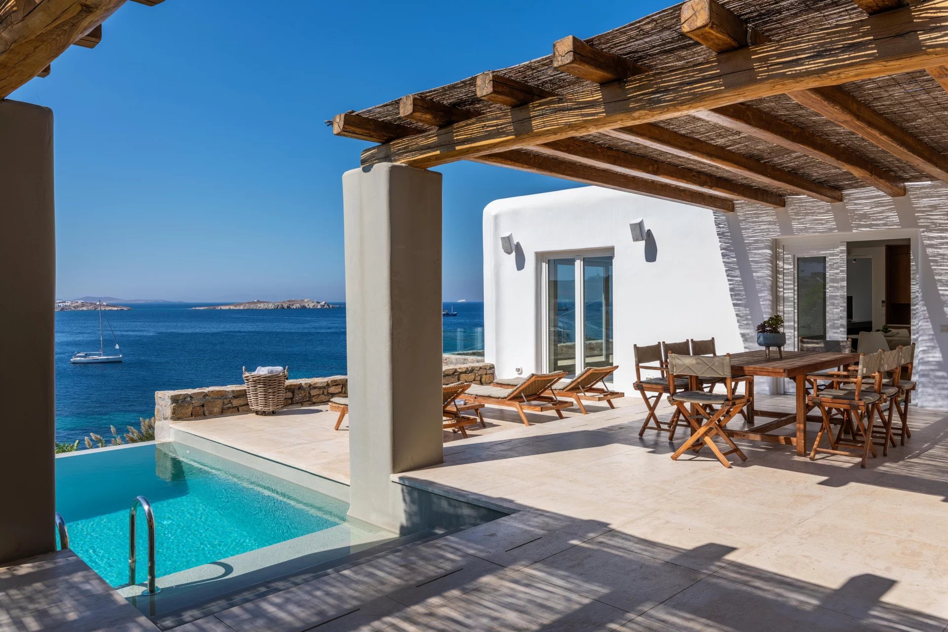 The 2nd Villa is slightly larger in scale, complete with a full size Boffi kitchen and outdoor shower. The main level contains 2 suites and a third is located just below the main patio area. The patio area encompasses a large built in seating area that is shaded by a pergola, sun loungers and an infinity pool. The patio wraps around the side of the villa where an outdoor eating area has easy access to the kitchen with a full view of Megali Ammos beach and Canalia in the distance. The dining room table accommodates 6 people in comfort, as does the salon area.