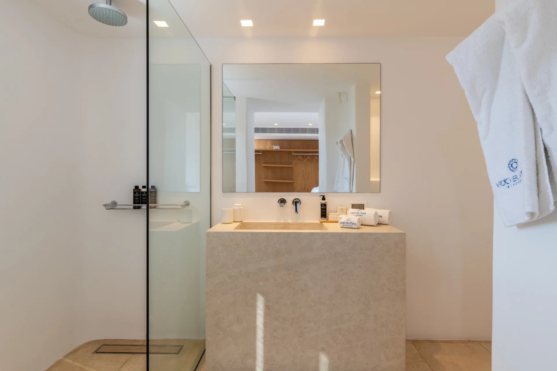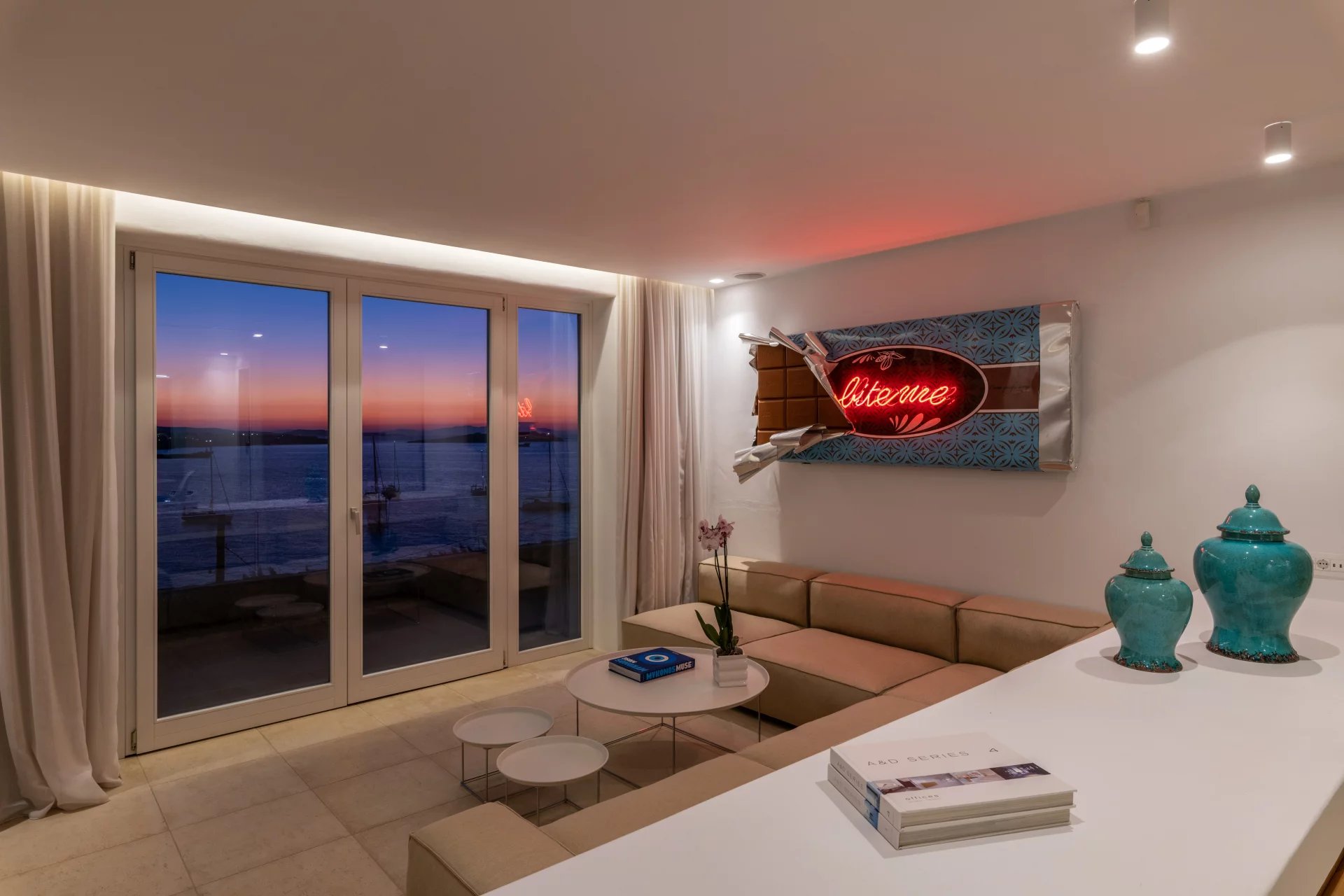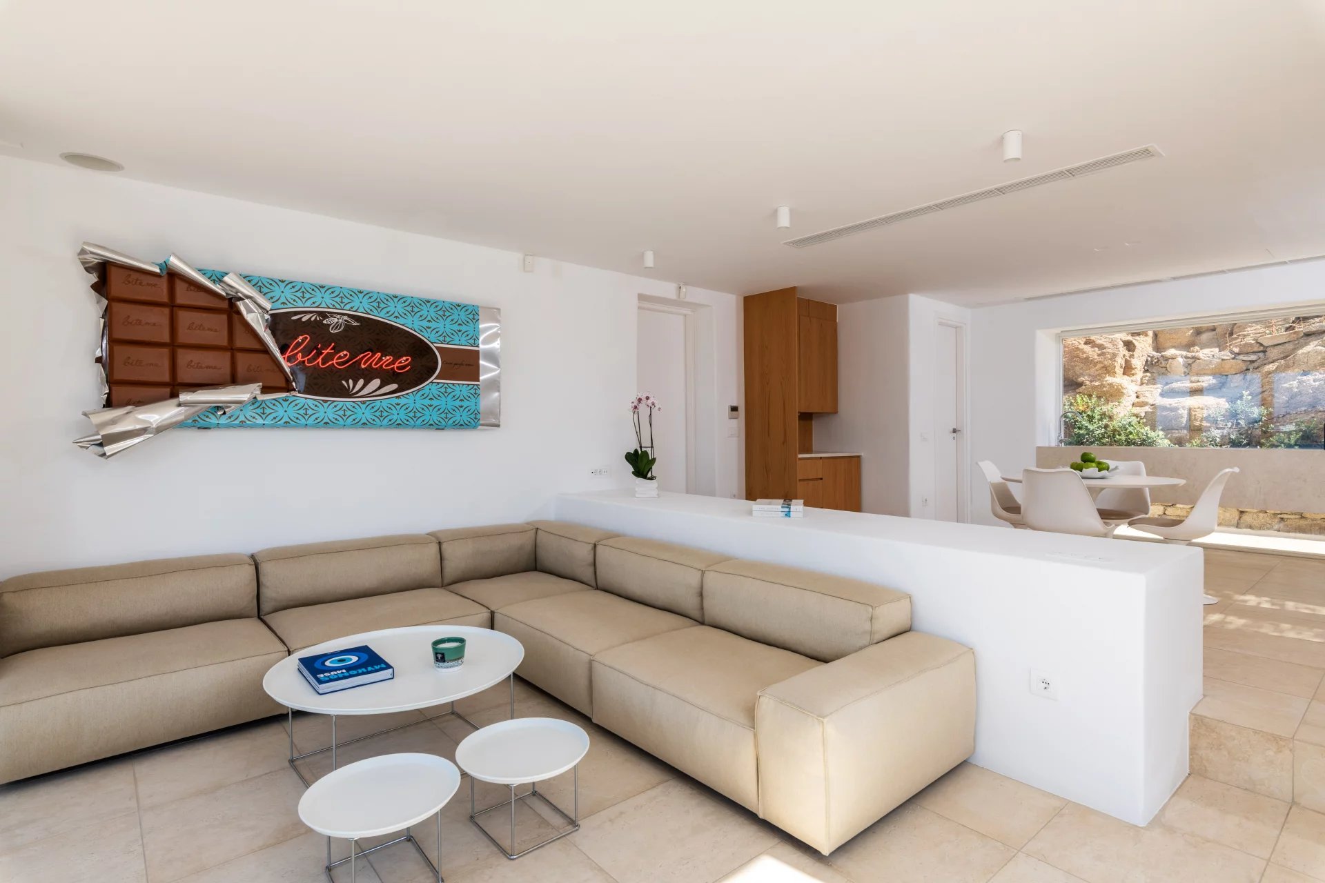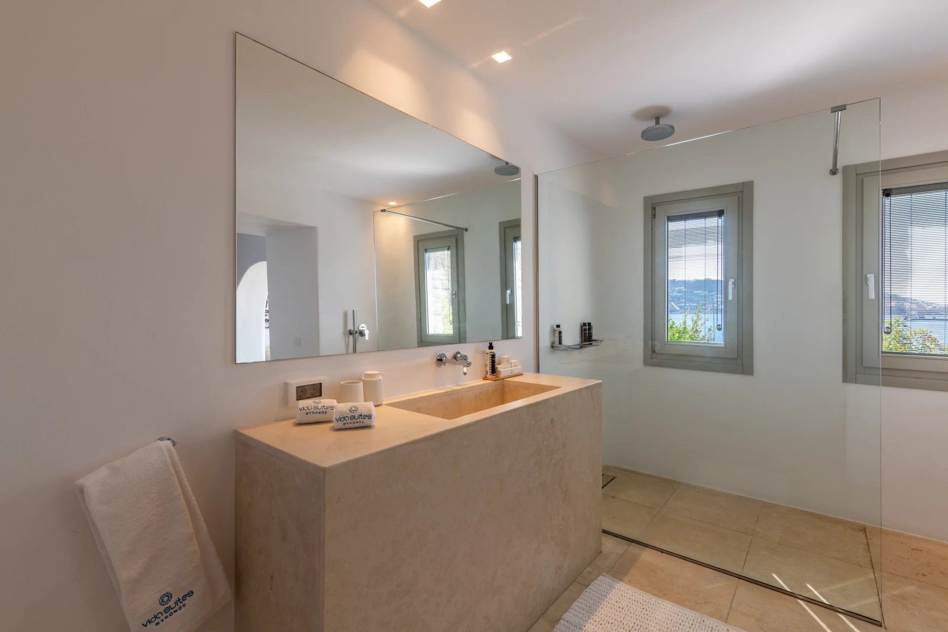 The 2nd Villa is slightly larger in scale, complete with a full size Boffi kitchen and outdoor shower. The main level contains 2 suites and a third is located just below the main patio area. The patio area encompasses a large built in seating area that is shaded by a pergola, sun loungers and an infinity pool. The patio wraps around the side of the villa where an outdoor eating area has easy access to the kitchen with a full view of Megali Ammos beach and Canalia in the distance. The dining room table accommodates 6 people in comfort, as does the salon area.