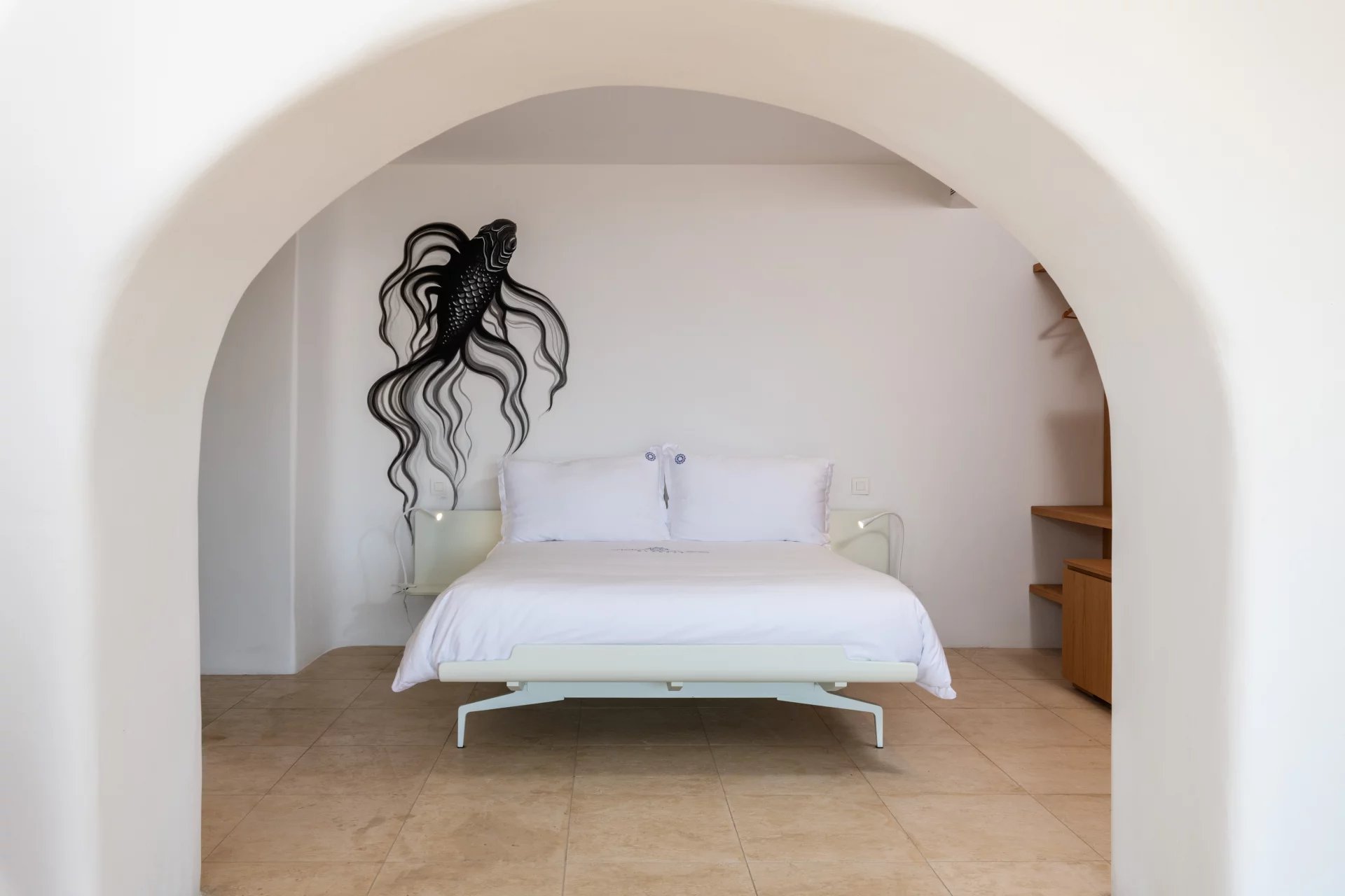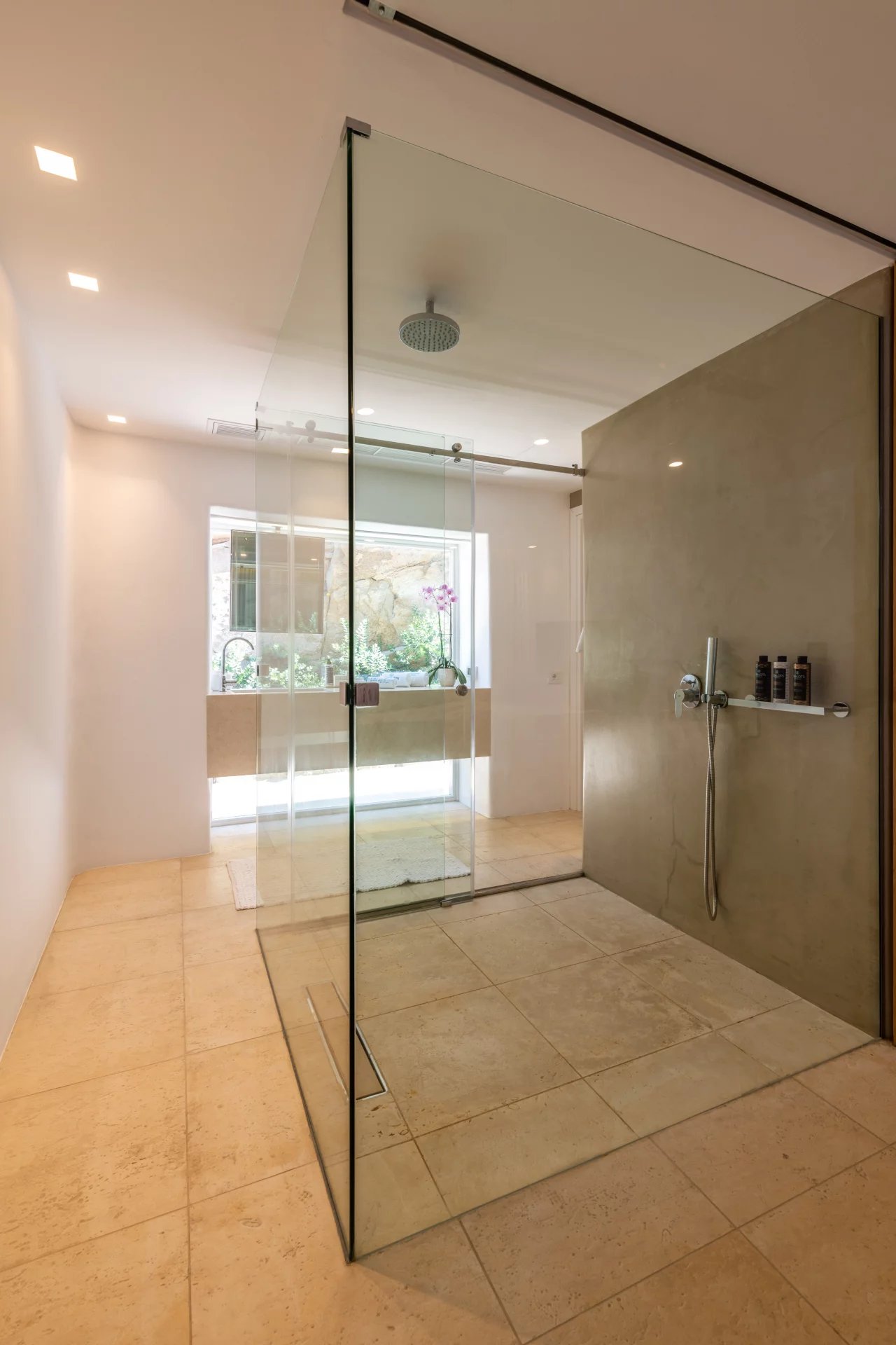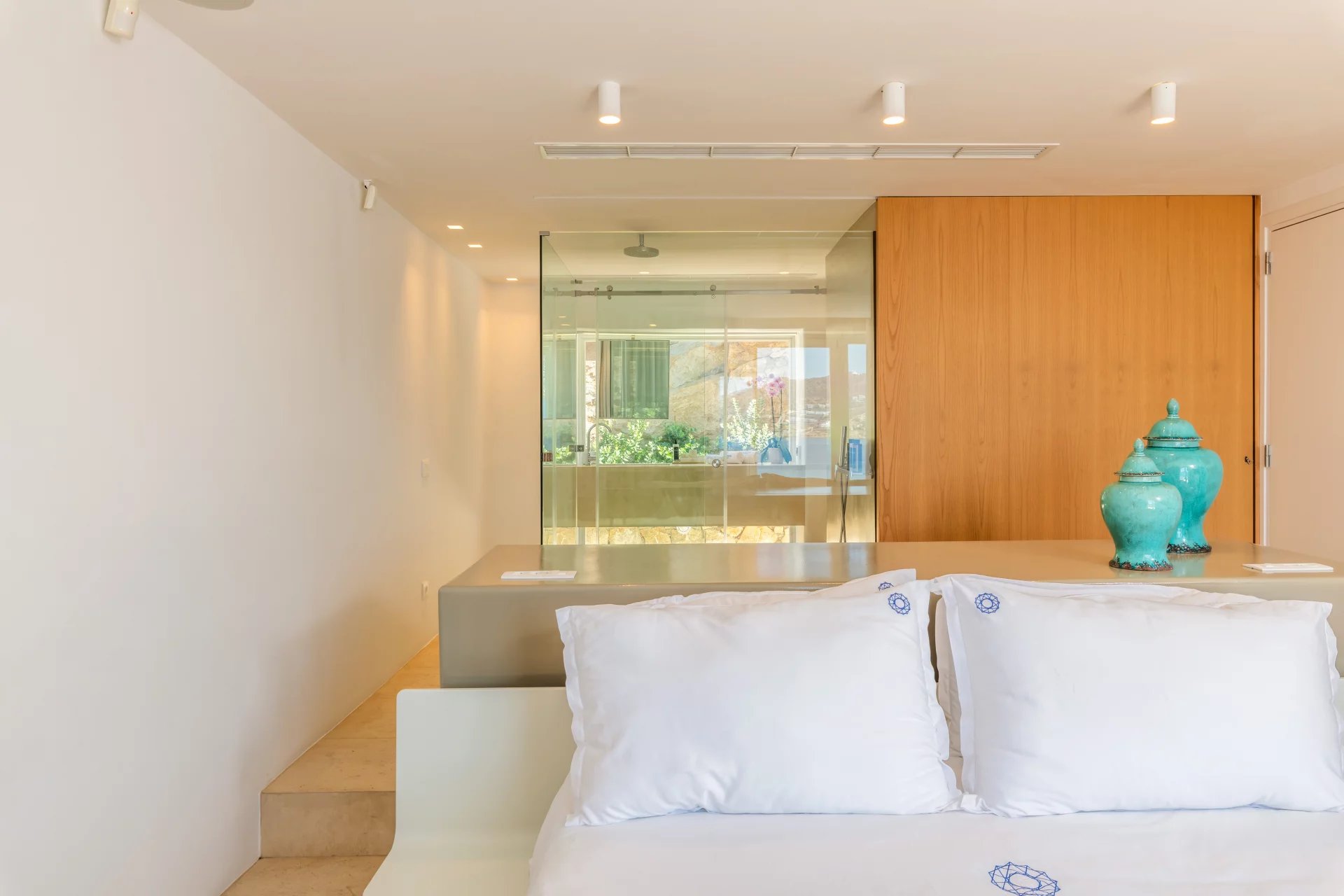 The master bedroom faces Megali Ammos beach through 3 picture windows. It is accessed off of the main hallway in the Upper Villa but located behind a lockable pivot door for privacy. For guest comfort the toilet and large shower room are separate to both the bedroom and each other. The second bedroom is often mistaken for the master. It is located off of the main hallway and the bed faces outwards to the patio with sea views. The bathroom and dressing room are integral to this room but concealed behind the bed. The occupants of this room also enjoy a private outdoor shower area.