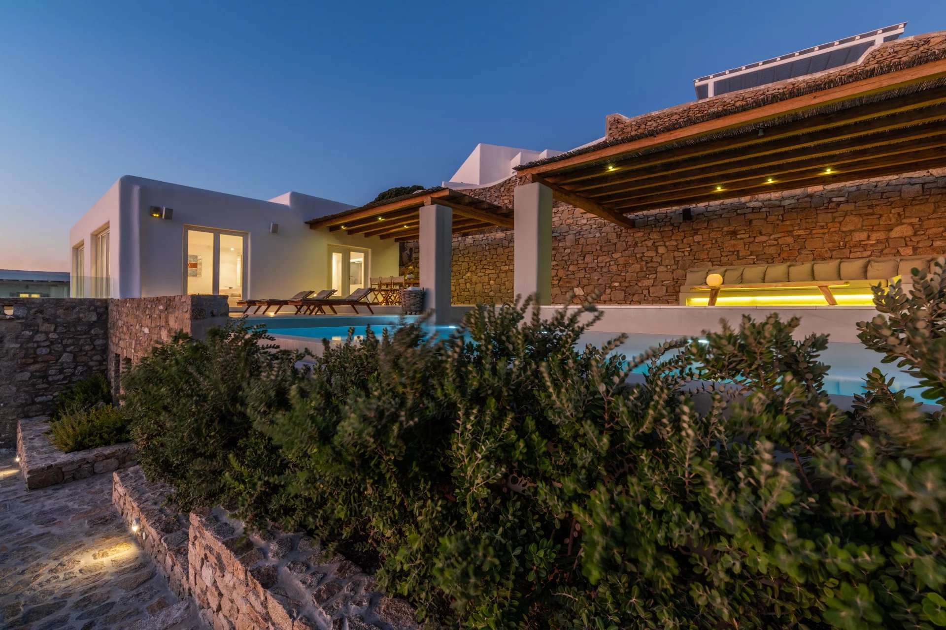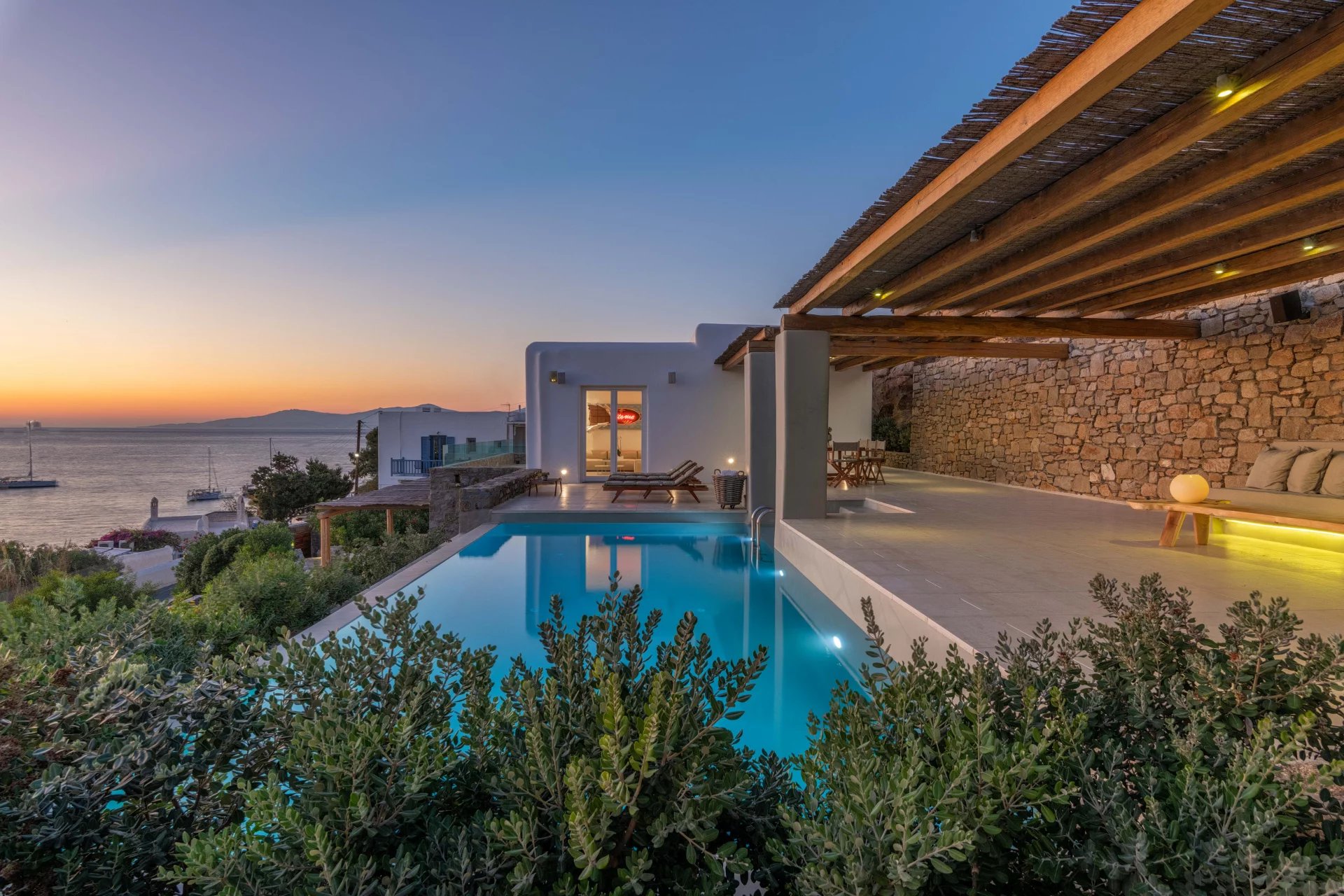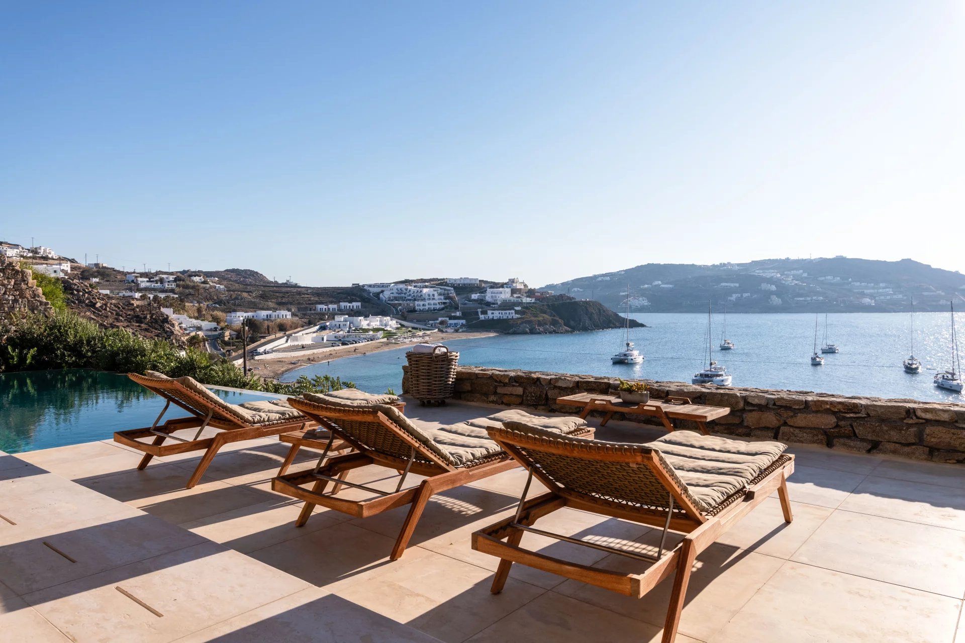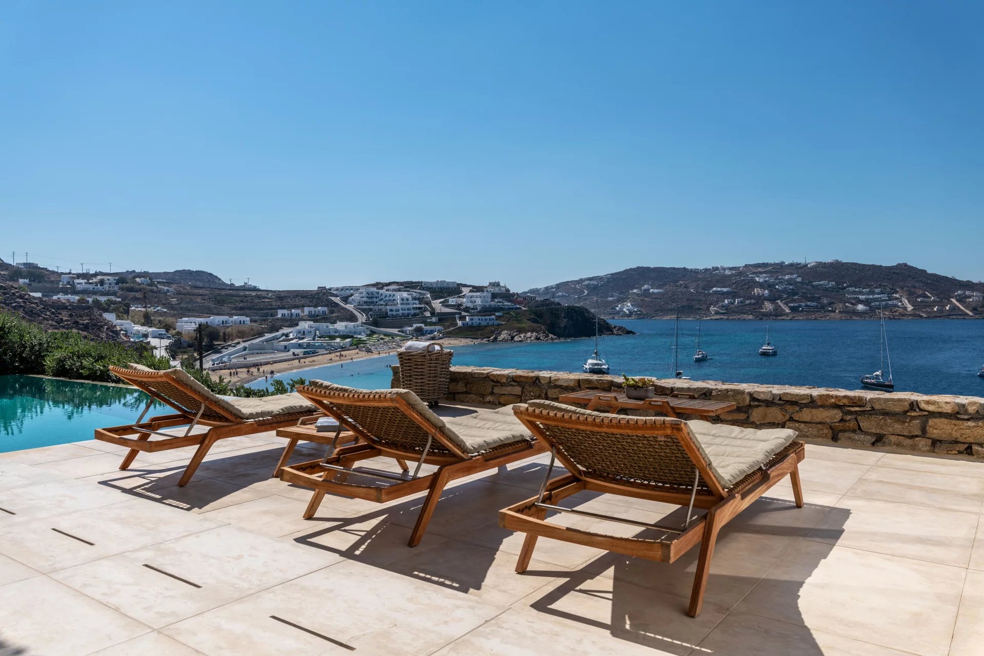 The lower level is comprised of 2 separate suites with salons and patios. The main level patio area encompasses a large built in seating area that is shaded by a pergola, sun loungers and an infinity pool. The patio wraps around the rear of the villa leading to a stairway directly down to the pedestrian gate to town. All of the patio areas have a full view of Megali Ammos and Canalia in the distance.